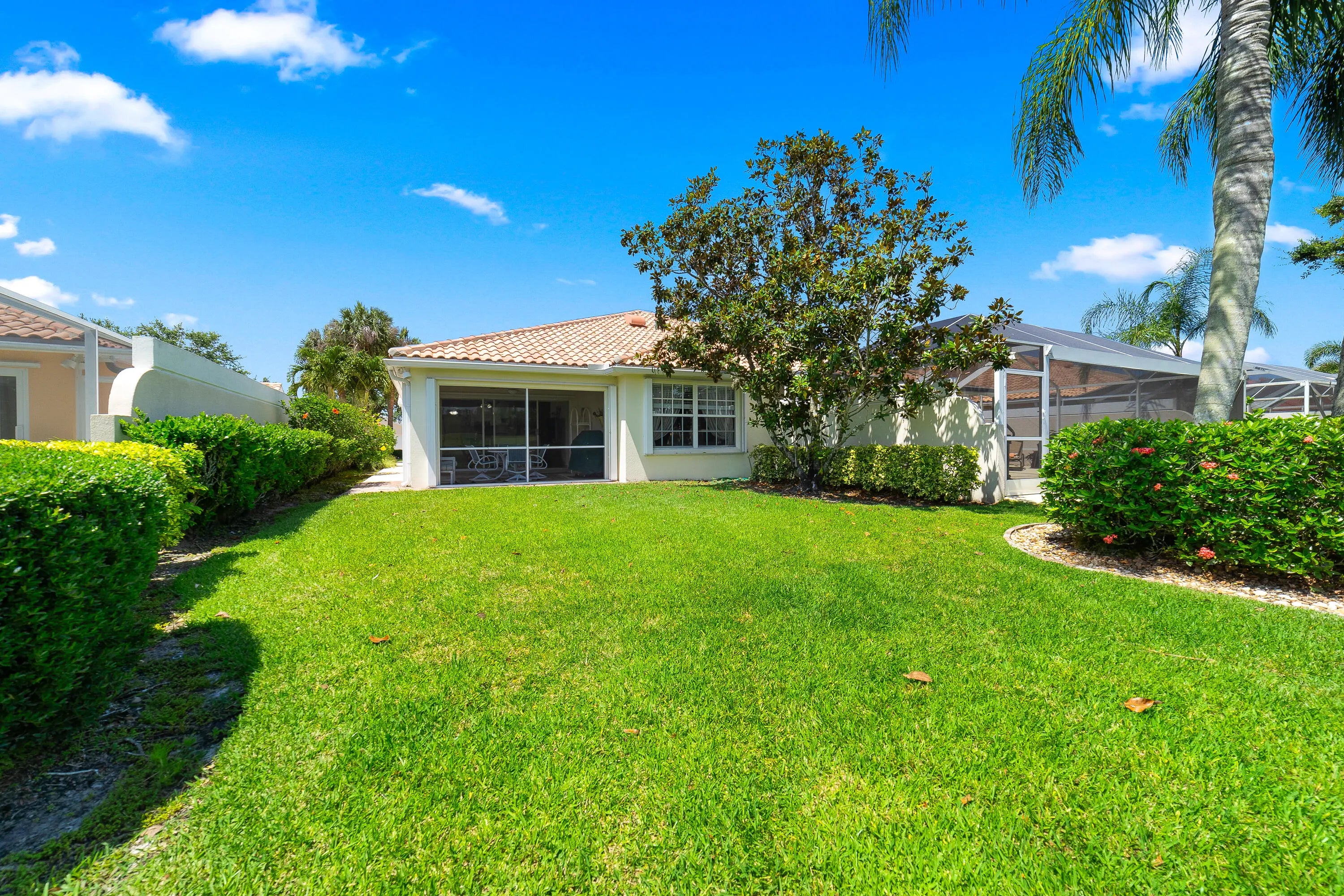 Welcome to this beautifully maintained villa in The Florida Club, featuring the sought-after Capri floorplan. Light-filled and inviting, the interior boasts a spacious layout with updated A/C and water heater, a central vacuum system, and a split-bedroom design for privacy. The kitchen offers abundant white cabinetry, granite countertops, and stainless steel appliances. The primary suite includes a walk-in closet, dual sinks, and a spa-like atmosphere. A generously sized guest bedroom sits at the front of the home with its own walk-in closet. Outside you'll enjoy the screened lanai with serene views of the 11th fairway and a tranquil lake--perfect for relaxing or entertaining. The attached 2-car garage adds convenience and storage. The Florida Club is an active,