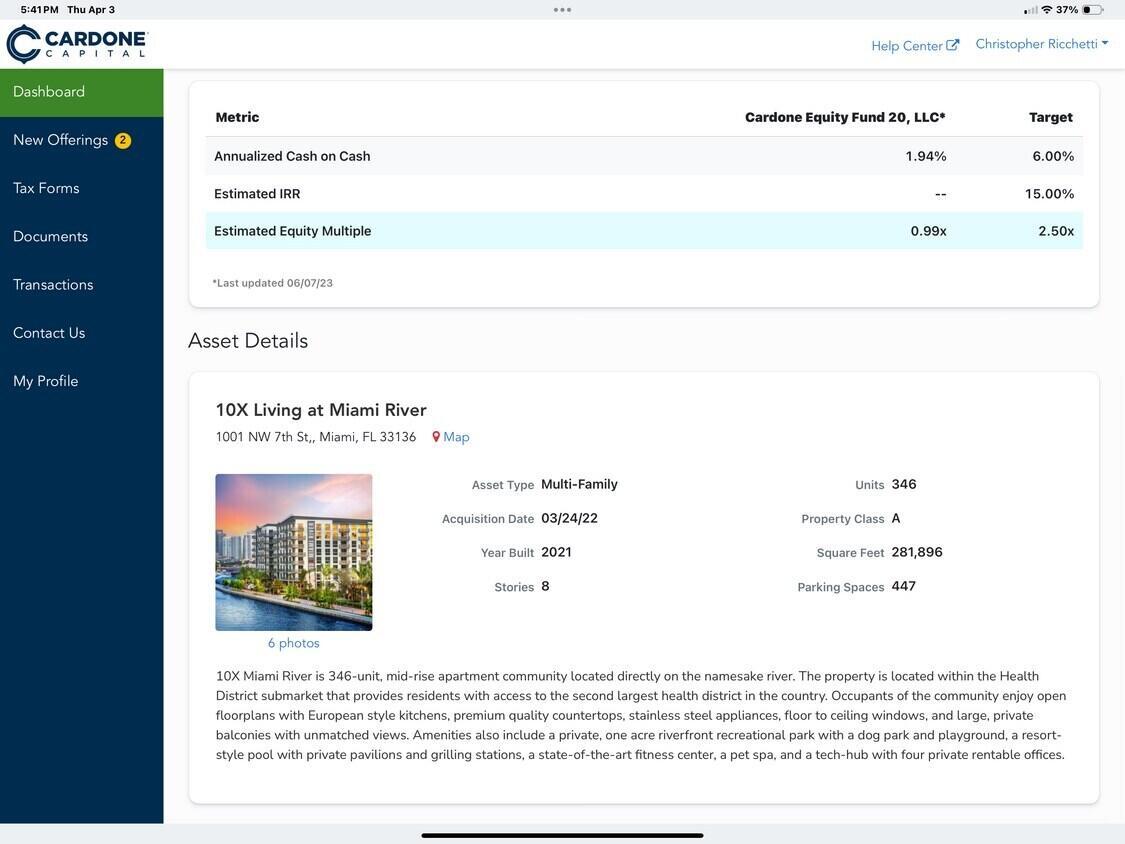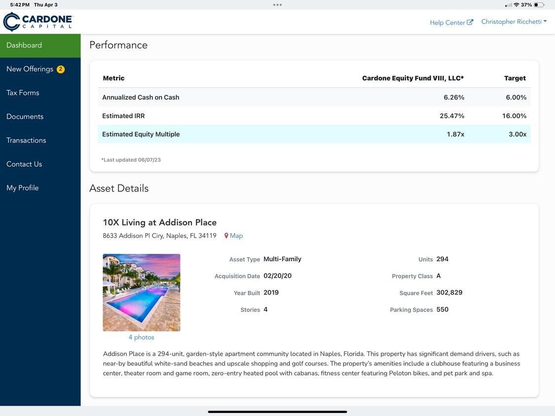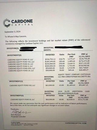 What you are buying is the fund with all the upside plus monthly distributions this portfolio has 8 funds and 18 class A multifamily properties. fractional share distributions. All funds throw-off different amounts and they all have different cap rates. Please reach out for more details. We are selling our equity shares. Take advantage of an already proven and secure investment.The fund is co-invested in the property with Cardone REIT.Call for information on the rest of the properties and see attached photos with summaries. The big deal here is the monies have been invested on average 6-7 years. All investments in the funds that are owned have a target multiple of 2.5 or greater. Cardone Capital has a potential up to a 10 year Hold on each individual fund With the sweet spot of usually a 7-8 year sale possible. 94%, which is roughly $1.2 million the portfolio Has an acquisition date that is in or past that half point of the 10 year target hold. That means 94% or $1.2 million is at or past that five year mark already. Seller has received over $350,000 in distributions in the portfolio so far. You get paid every 15th of the month and not once was one payment ever late or missed not even during Covid. Here are 2 scenarios for the near future of Cardone Capital portfolio. Scenario A, If you simply go off the 7 to 8 year model Of which more than 94% or $1.2 million of my portfolio falls into a 1 to 3 year remaining time frame for a sale. When you take into Cardone Capitals Target Multiple of 2.5X This means that an individual acquiring my portfolio would receive a gross sum of 3,000,000 dollars Upon the sale of these properties. $3,000,000 $1,200,000 ( Return of investment) = $ 1,800,000 dollars PROFIT THE INVESTOR WILL BE RECEIVING ALL OF THEIR CAPITAL BACK PLUS AN ADDITIONAL ONE AND A HALF TIMES WITHIN 3 YEARS! Scenario B, If you simply take the longer of the 9 to 10 year model 94% Or $1.2 million of my Cardone Capital portfolio still falls under that model of 9-10 years Because acquisition of those funds started back in 2019. Using the same target multiple of 2 1/2 times The individual investor would receive the gross amount of $300,000,000 Dollars upon the sale of these Funds. Same $3,000,000 $1,200,000 (return of investment) = $1,800,000 dollars profit Within a 4-5 year time frame. The investor is getting the benefit of the five years plus that the owner has held Cardone Capital. Owner has two fair market value letters over the last few years with the main average price value of the portfolio of $2.3 million. Which is an Appreciation from the initial investment of $1,273,000. Cardone Capital also released that they're looking to take their real estate empire public within the next 1-2 years. They have articulated that when they will go, public shares would be able to be sold at whichever price they were set at if an individual wanted to liquidate out of Cardone Capital.