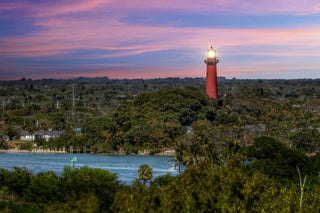 To mark the reef lying off the Jupiter Inlet, Congress in 1853 appropriated $35,000 to construct a lighthouse. At the top of the Jupiter Lighthouse, you can see the Loxahatchee River.