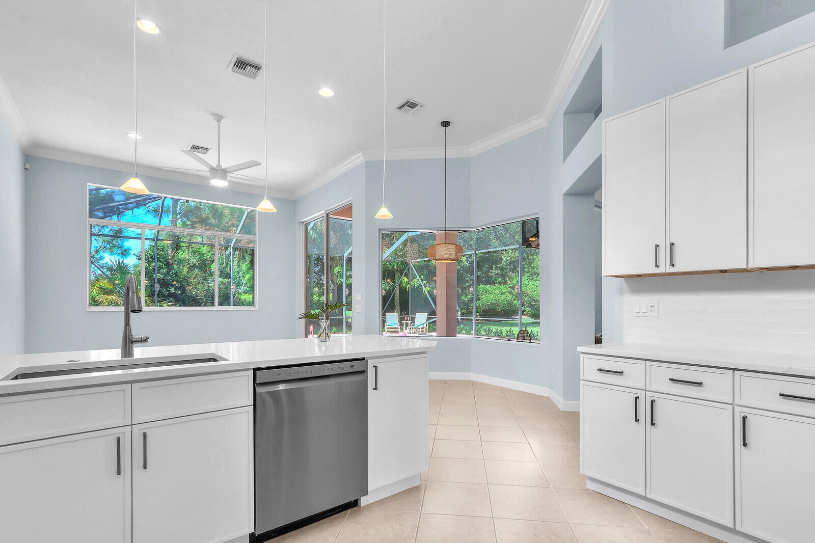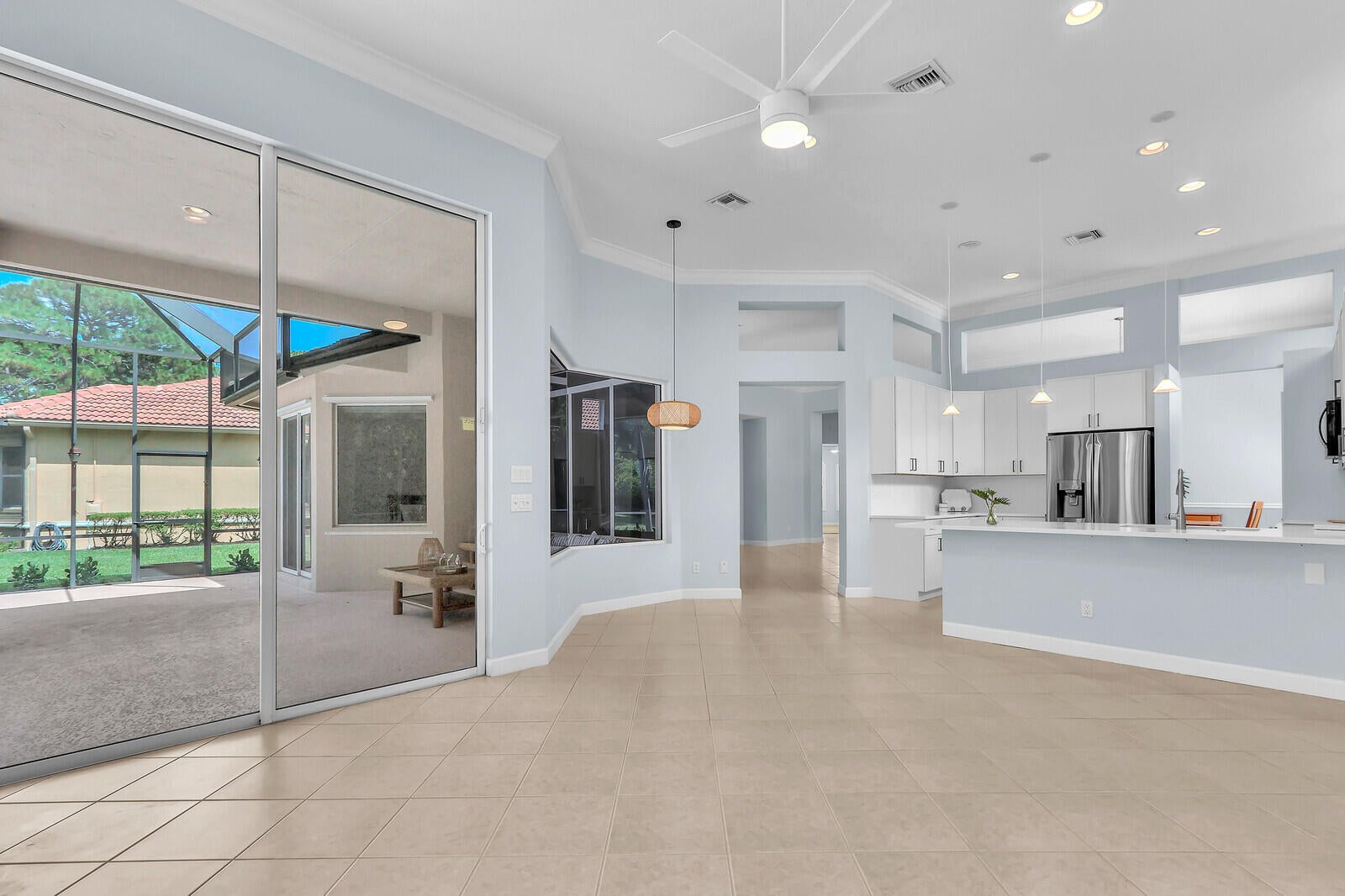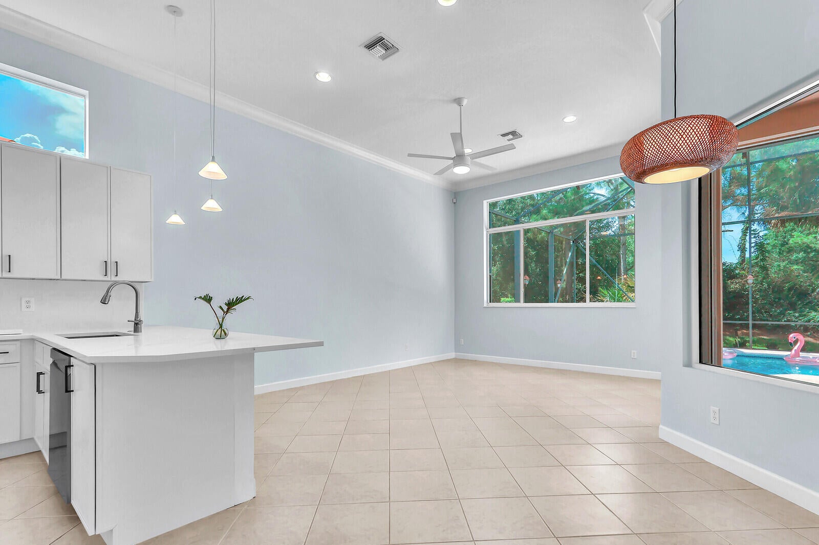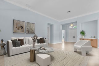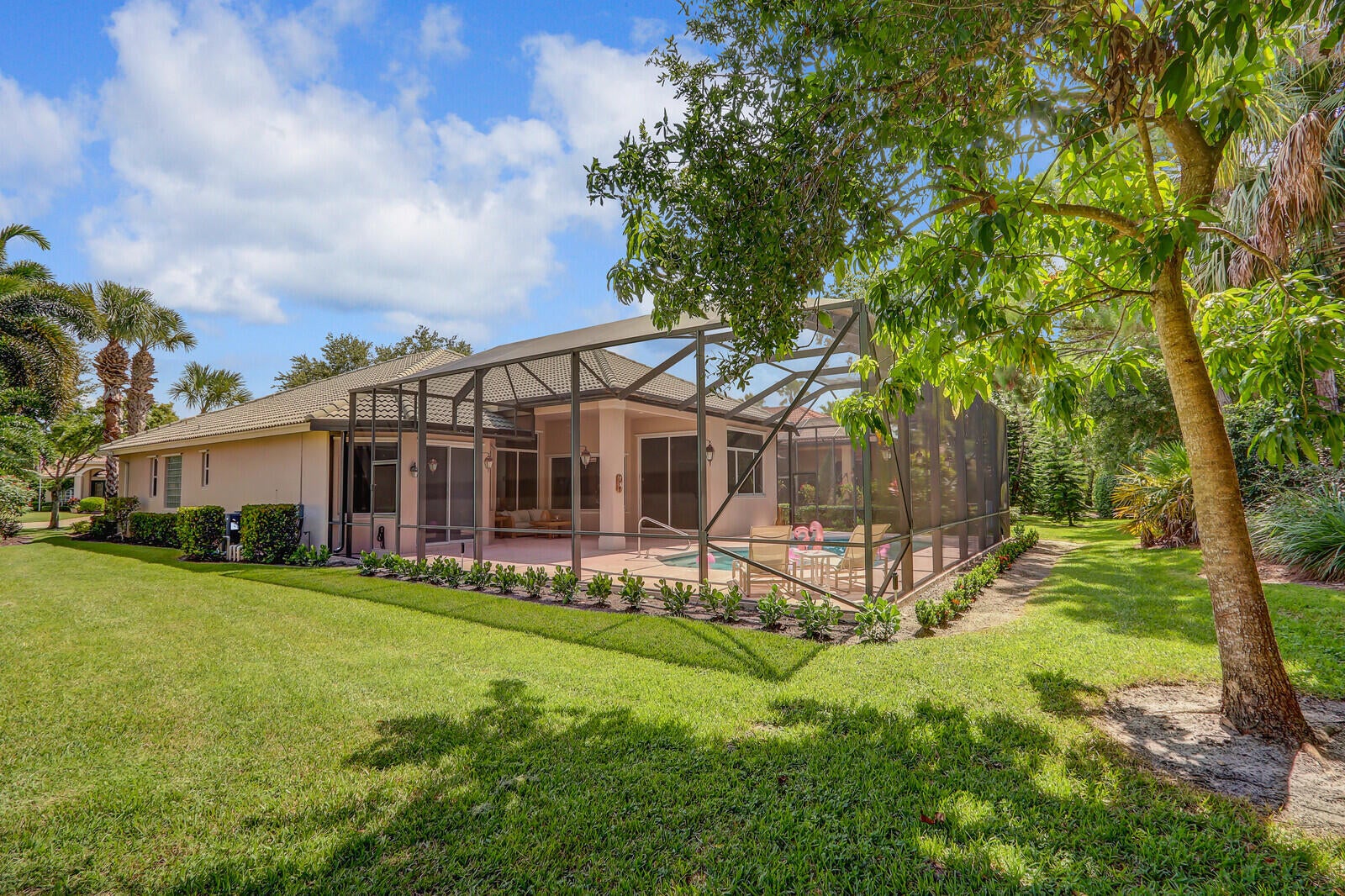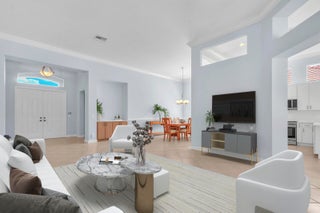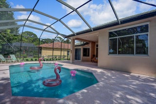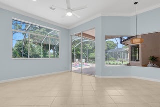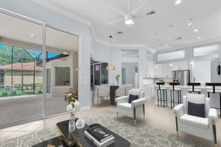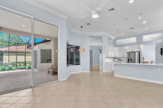 Tastefully updated 2BR + Den home located in the highly desirable Greenbrier neighborhood of PGA Village. This move-in-ready residence features a bright, light-filled kitchen with crisp white cabinetry, sleek stainless-steel appliances, and stunning quartz countertops highlighted by a stylish tile backsplash. A convenient breakfast bar opens seamlessly to the spacious family room, creating the perfect setting for everyday living and casual entertaining.The expansive living and dining areas are ideal for hosting, while sliding doors from the family room lead to a large screened lanai overlooking a sparkling private pool--your own peaceful retreat for outdoor relaxation and gatherings. The generous primary suite offers two walk-in closets with built ins and plush new carpet.The luxurious ensuite bath showcases white cabinetry, new quartz countertops, and a fresh, refined design. A split floor plan ensures privacy, with a beautifully updated guest suite featuring new carpet and its own upgraded ensuite bath. The versatile den, accented by bay windows and plantation shutters, provides the perfect space for a home office, media room, or cozy reading nook.