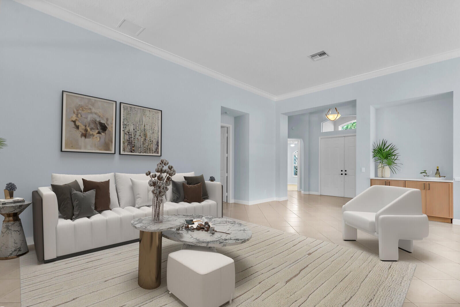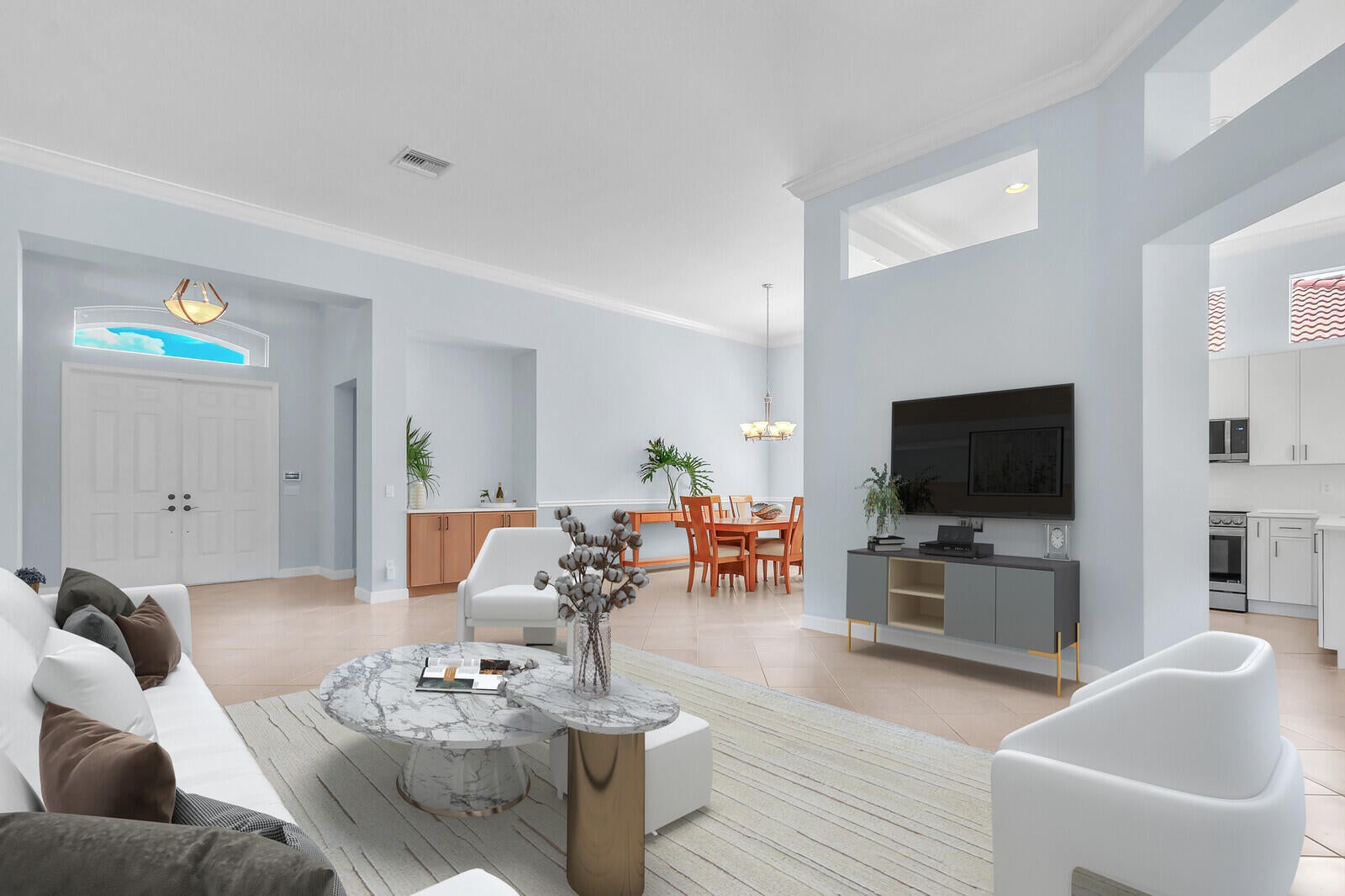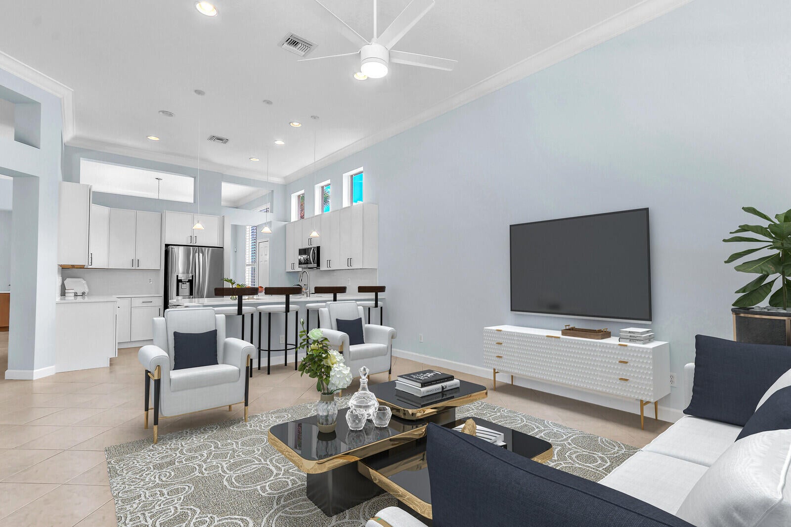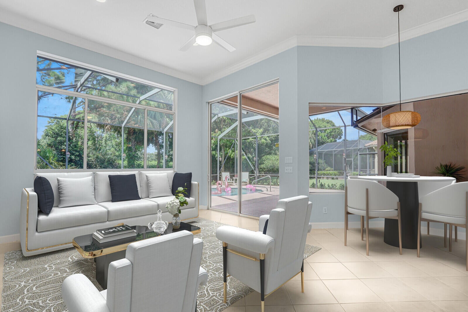 Tastefully updated 2BR + Den home located in the highly desirable Greenbrier neighborhood of PGA Village. This move-in-ready residence features a bright, light-filled kitchen with crisp white cabinetry, sleek stainless-steel appliances, and stunning quartz countertops highlighted by a stylish tile backsplash. A convenient breakfast bar opens seamlessly to the spacious family room, creating the perfect setting for everyday living and casual entertaining.The expansive living and dining areas are ideal for hosting, while sliding doors from the family room lead to a large screened lanai overlooking a sparkling private pool--your own peaceful retreat for outdoor relaxation and gatherings. The generous primary suite offers two walk-in closets with built ins and plush new carpet.The luxurious ensuite bath showcases white cabinetry, new quartz countertops, and a fresh, refined design. A split floor plan ensures privacy, with a beautifully updated guest suite featuring new carpet and its own upgraded ensuite bath. The versatile den, accented by bay windows and plantation shutters, provides the perfect space for a home office, media room, or cozy reading nook.