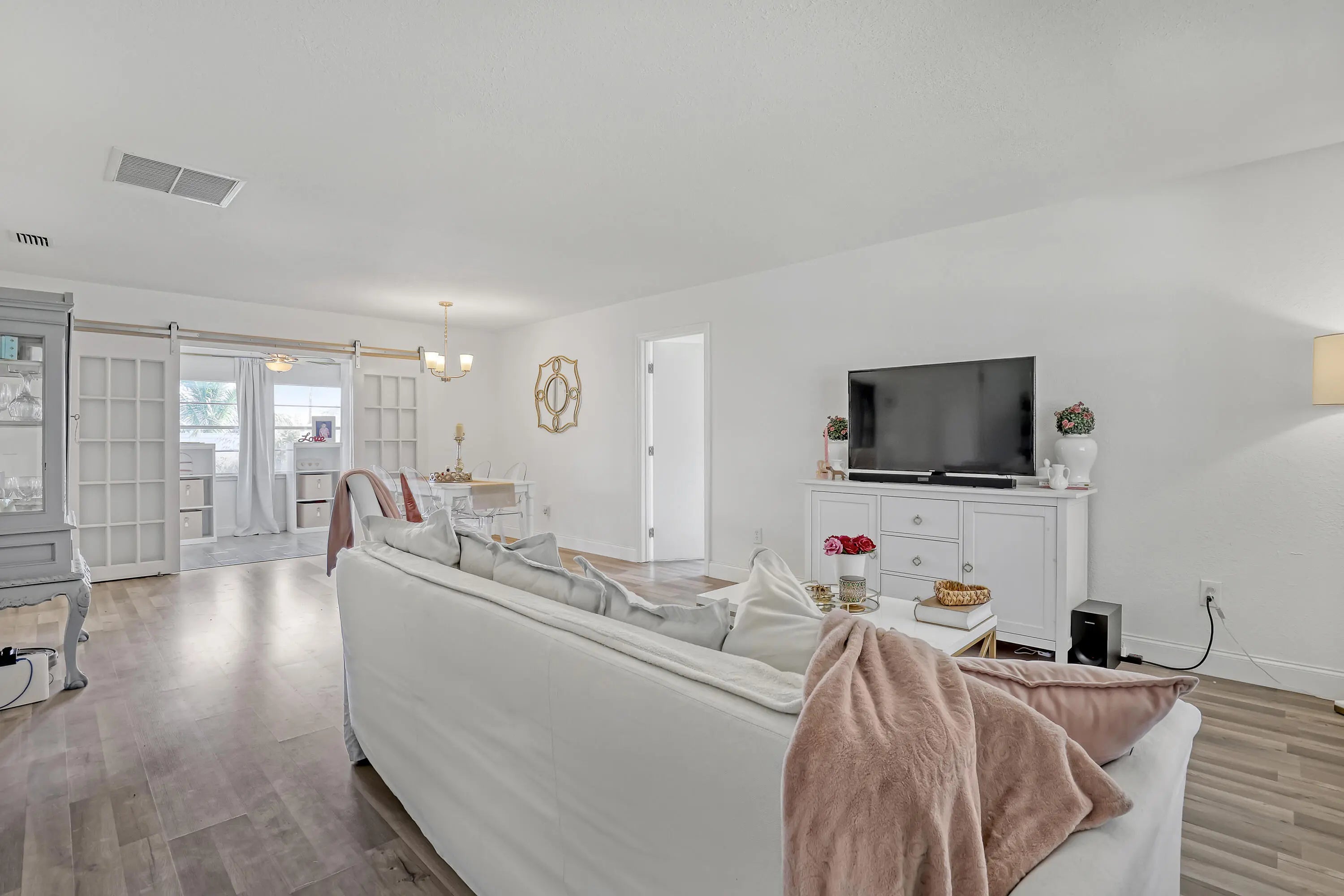 2 BD 2 BA Plus Florida Room & 2 Car Garage. New Roof (2024). Updates completed in 2023 include: A/C; Garage Door; Kitchen (granite countertops, cabinets, & SS appliances); Bathrooms (Complete); New Flooring throughout. Easy to Close Accordion Shutters. All sizes are approximate. **Draperies Are Not Included**