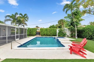 Welcome home! This turnkey and recently renovated 3 bedroom, 2 bathroom home with a heated swimming pool and spa is move-in-ready. Focused on space planning while renovating, the home now features a newly expanded kitchen and layout, new kitchen cabinets, appliances and laundry room. This charming home feels much larger than its 1,971 square footage and boasts full impact rated windows and doors as well as a 2019 roof, checking off all the insurance boxes. Walking in the front door, you will notice the cohesive tile floors throughout that lead you to the covered and screened in porch overlooking the large private backyard with mature Clusia hedges. Located in the Palm Beach Public elementary school district and close to area beaches, Flagler Drive bike path, City Place, fabulous dining