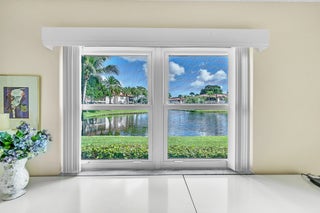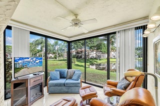 Clean & furnished first floor unit with magnificent views. Corner unit offers a lot of natural light w/ enclosed back offering serenity of greenery & lake view. Stackable clothes washer & dryer in unit & close assigned parking spot (1) offers convenience. Both walk-in shower & shower/tub in home. Ample, close parking for guests. Subdivision is gated w/ community pool. Desirable Boca Raton location convenient to shopping, I-95, Florida Turnpike, restaurants, Town Center Mall & main roads. Community is age-restricted to 55+. No pets & No smoking. Annual lease only.