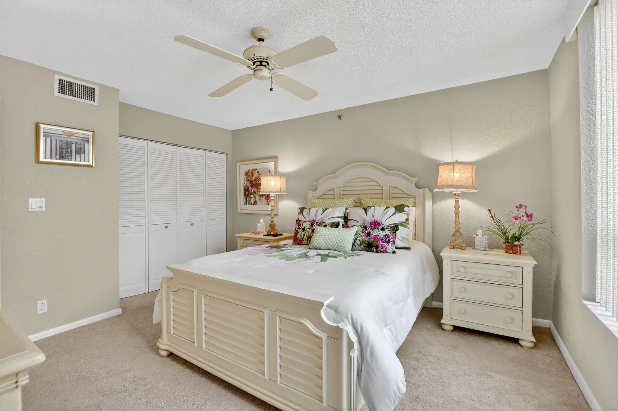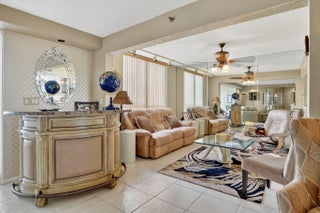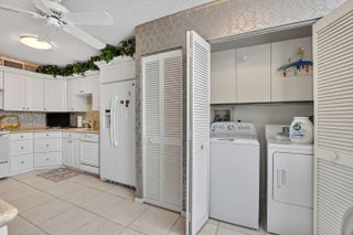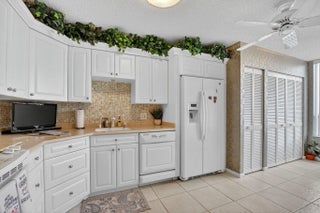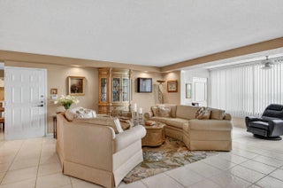 Spacious 3 bedroom, 2.5 bath condo fully expanded to include both patios under air, offering additional living space. Enjoy beautiful golf and water views from this desirable model. Kitchen features white cabinets, Corian counters, replaced appliances including refrigerator, and added cabinetry for extra storage. Washer and dryer also replaced. Large tile flooring in main living areas, with carpet in the master and second bedrooms. Master suite offers a king bed with matching furniture, large closet plus a second closet. Third bedroom/den includes built-in and sofa with tables. Half bath features linen closet and updated faucets. Unit includes storage closet on enclosed patio. Being sold partially furnished. Community pool close by and one assigned covered parking space.