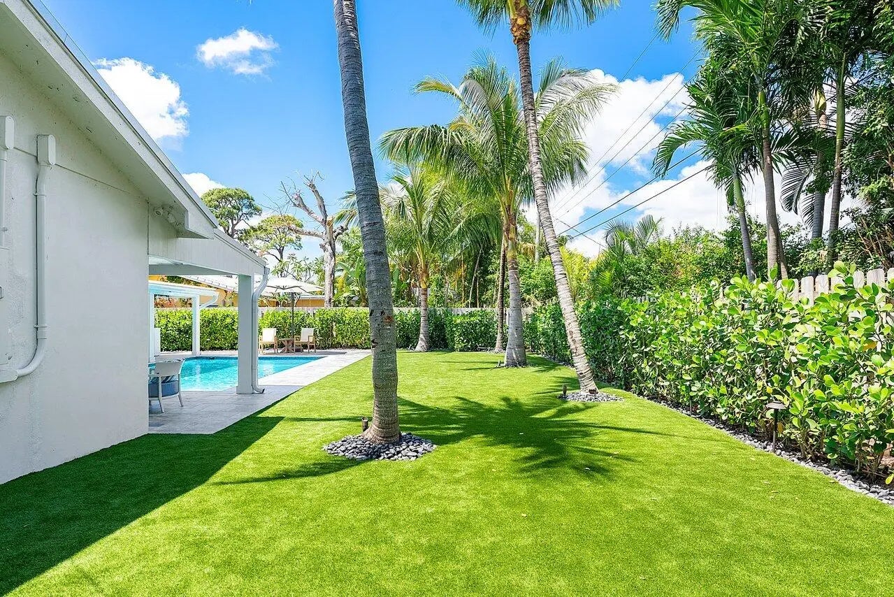 Step into luxury living at its finest with this completely renovated home in the heart of Boynton Beach. No detail has been overlooked in the transformation of this home, where modern amenities blend seamlessly with timeless elegance. From the moment you enter, you'll be greeted by the impeccable craftsmanship and attention to detail evident throughout. New electrical and plumbing (no cast iron pipes)! Step outside to discover an expansive pool area with covered loggia and summer kitchen/bar, perfect for outdoor entertaining. Custom landscaping, complete with landscape lighting and security cameras, enhances the curb appeal and security of the property. Practice your putting skills on the backyard putting green.