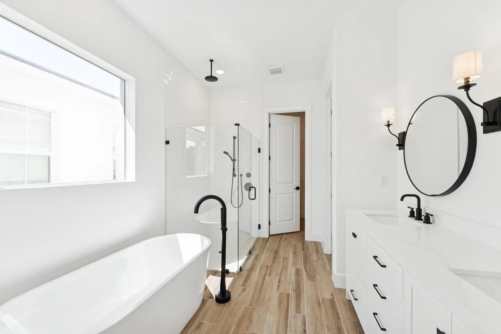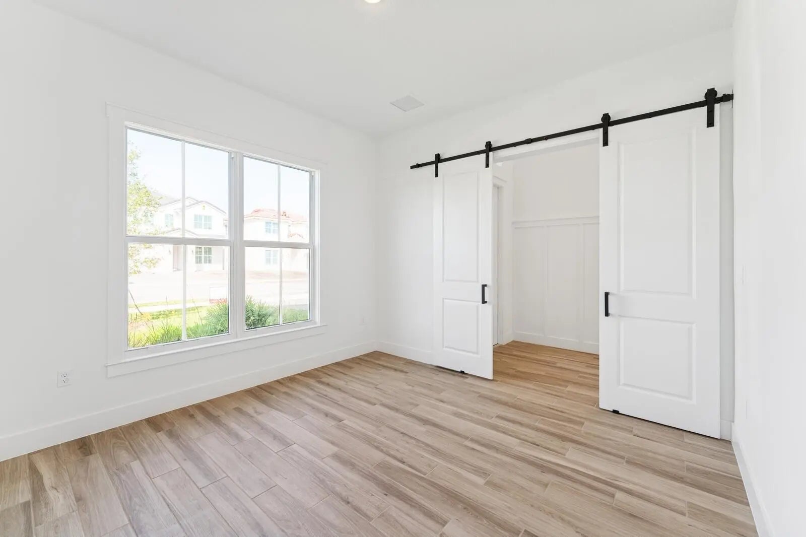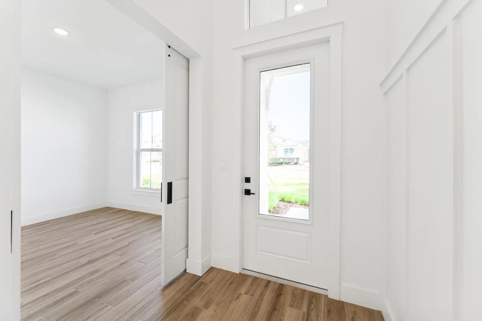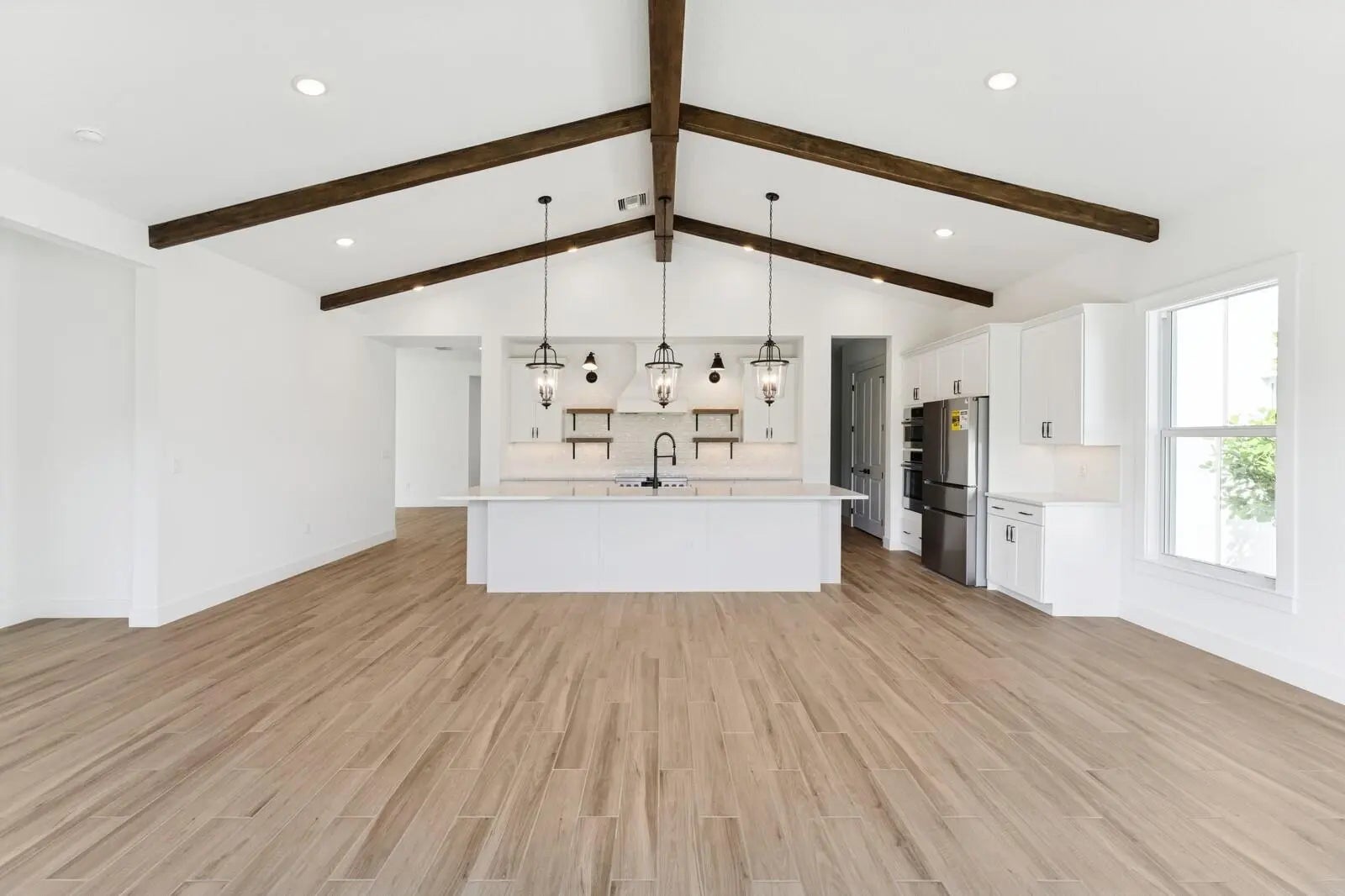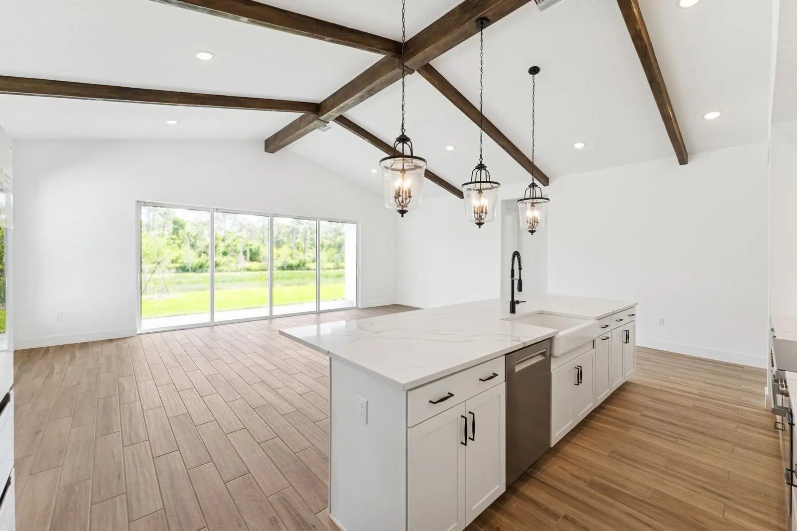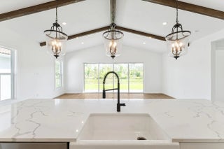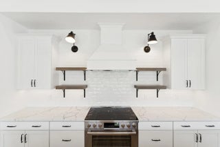 Enjoy picturesque lake views from this stunning farmhouse-style Santa Fe home, where comfort and character come together beautifully. The stunning kitchen showcases Brellin White cabinets and elegant Statuary Classique quartz countertops, opening to connected living spaces with a vaulted ceiling and stained ceiling beams for added warmth and charm. The peaceful primary suite offers the perfect retreat, complemented by a refreshing bath with a barn door and freestanding tub. A functional home office and formal dining room off the foyer add flexibility, while the inviting covered patio with a 16-foot multi-slide door creates seamless indoor-outdoor living. For added comfort and efficiency, the Home Technology Suite comes standard, delivering smart home features designed for today's
