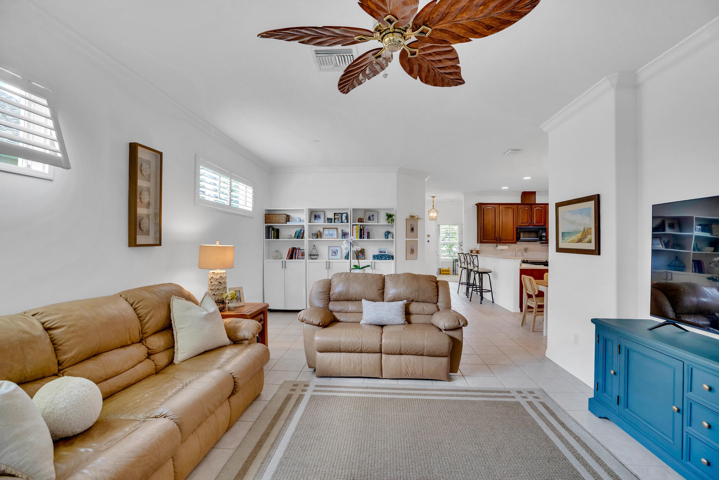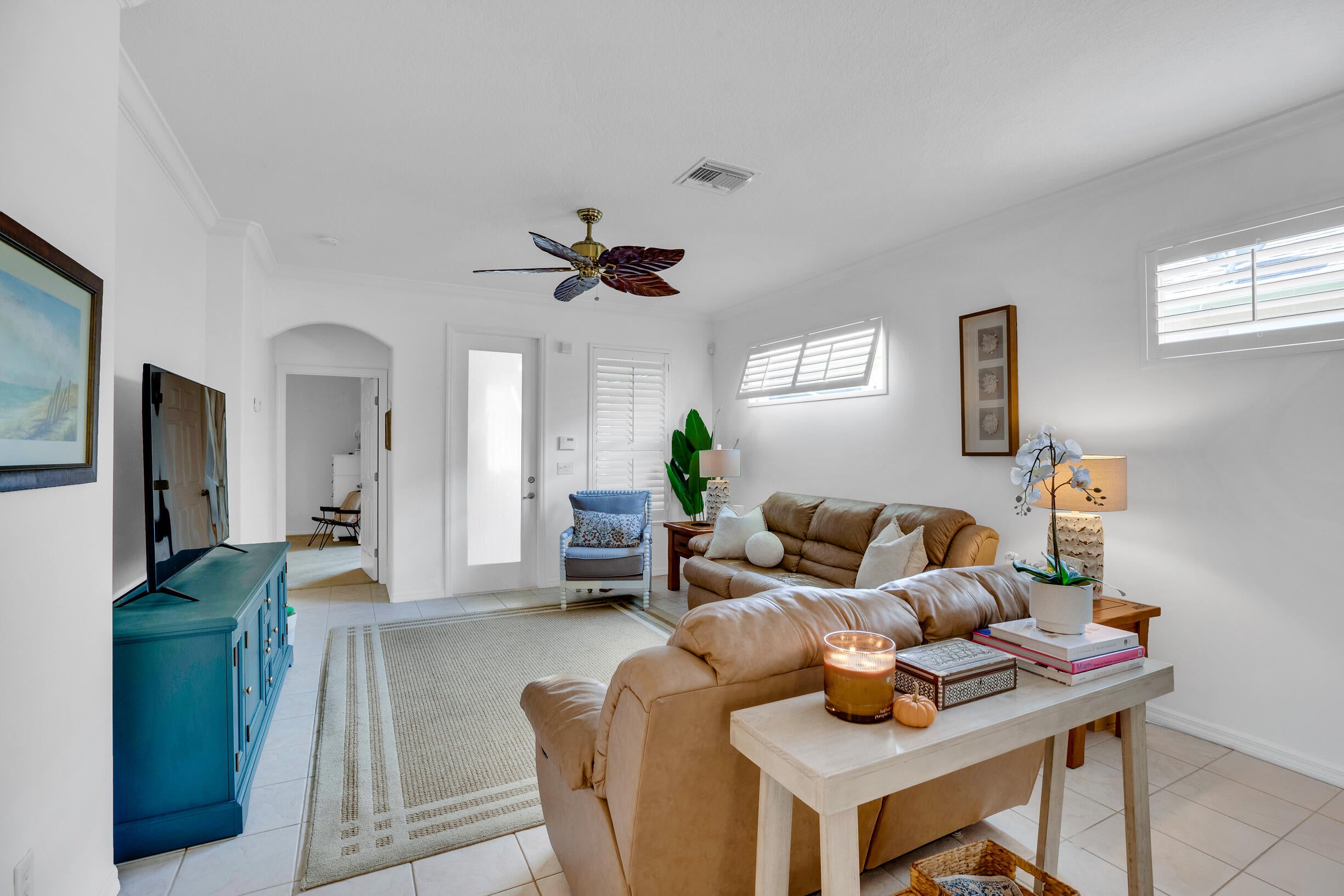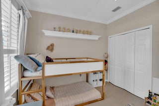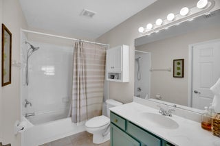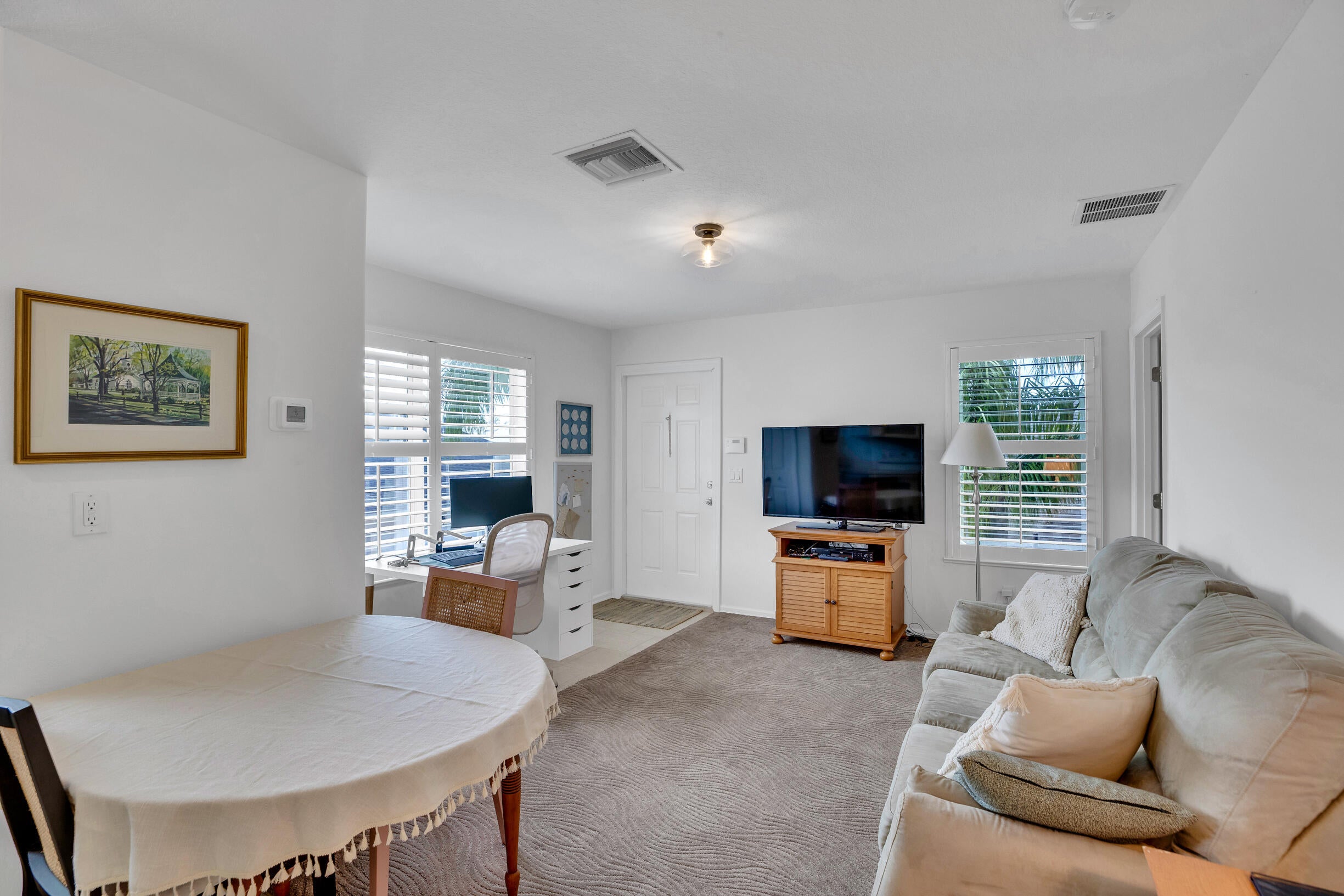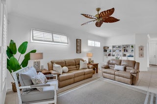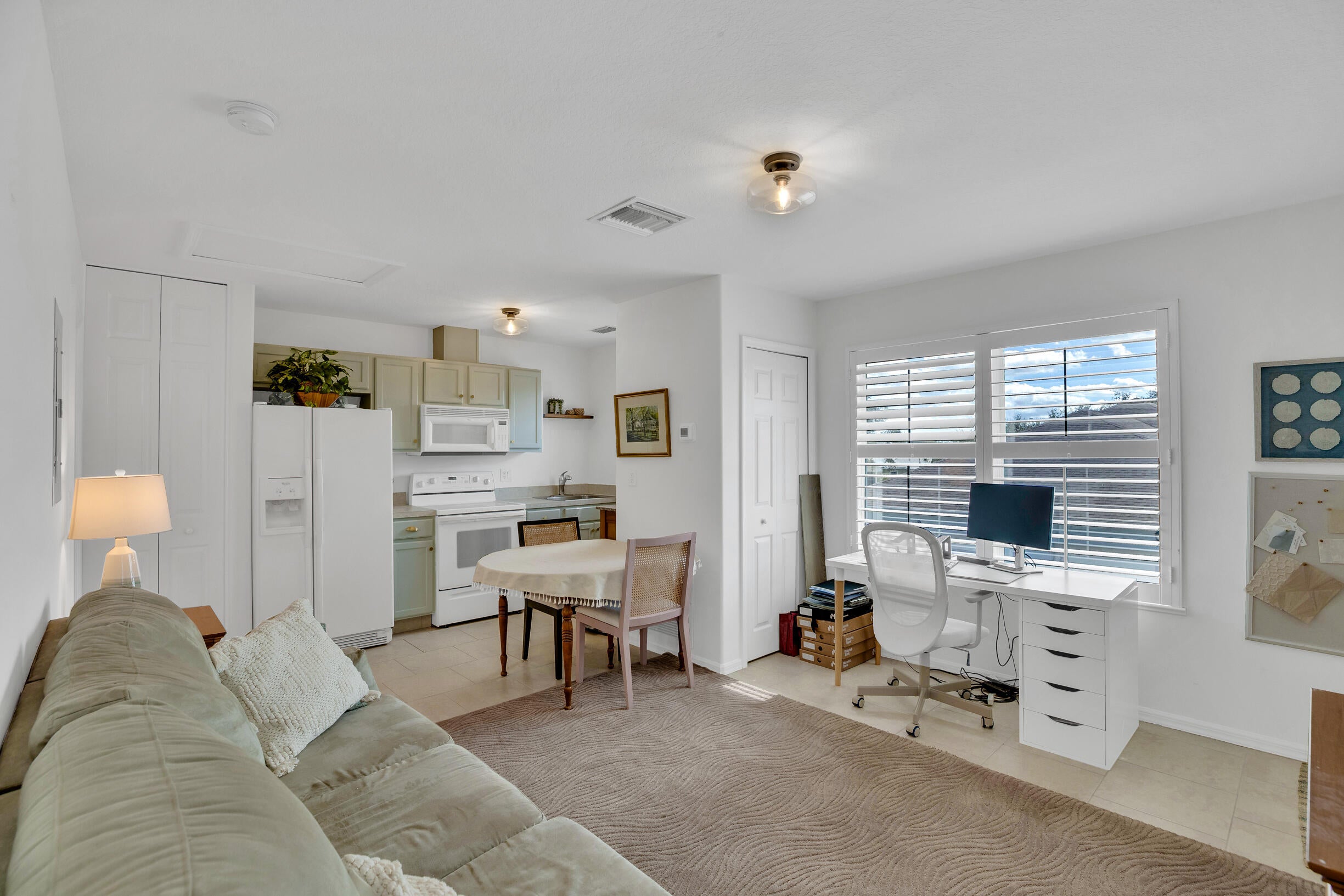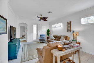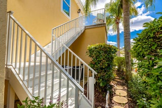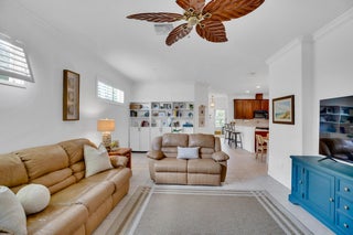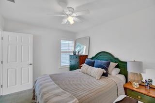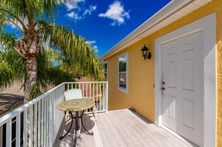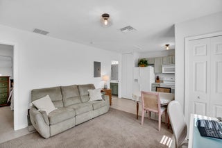 This extremely rare 2/2/2.5 + den Plus a detached 1/1 Apartment with separate entrance is 1 of only 10 in the community! Located less than 1 block from the community pool, park and playground. This spectacular unit has a 23' roof and HWH. Main house features crown molding, upgraded 42'' kitchen cabinets, granite counter tops, plantation shutters and so much more! Tiled common areas with carpeted bedrooms and open Den/office space. Primary bathroom remodel features make-up area, vanity with new faucets & mirrors. Separate full apartment with spacious balcony and street parking allowed for guests