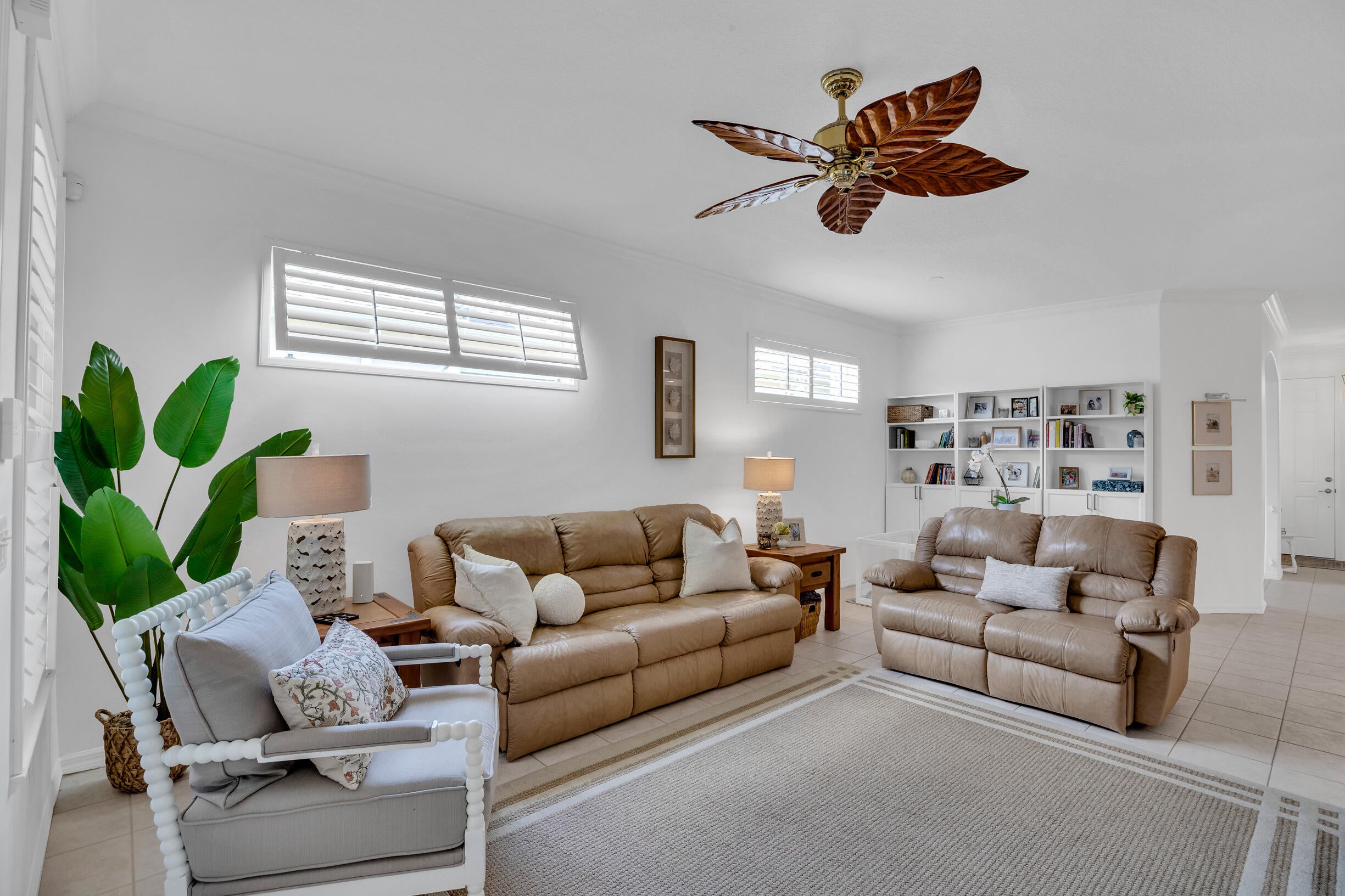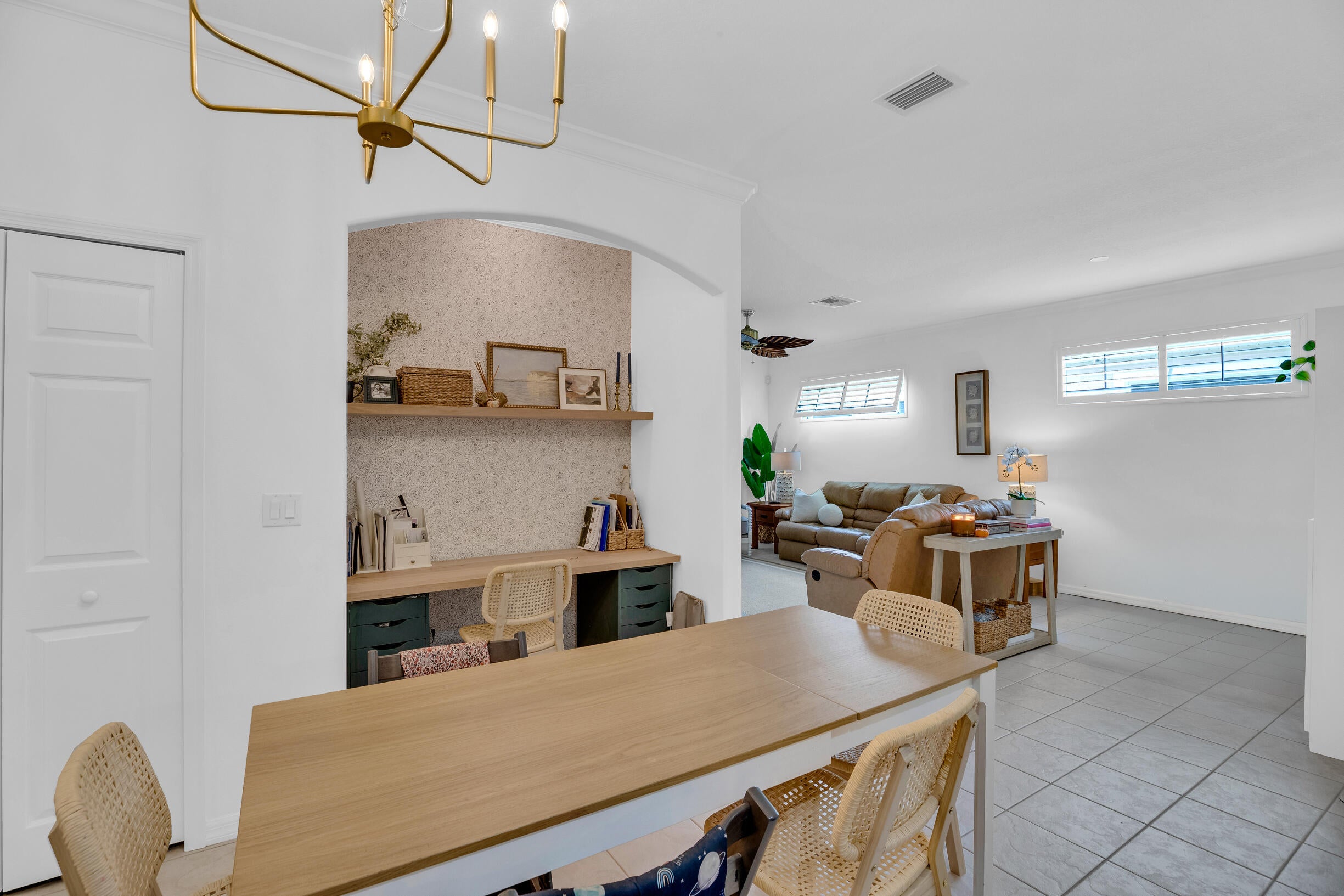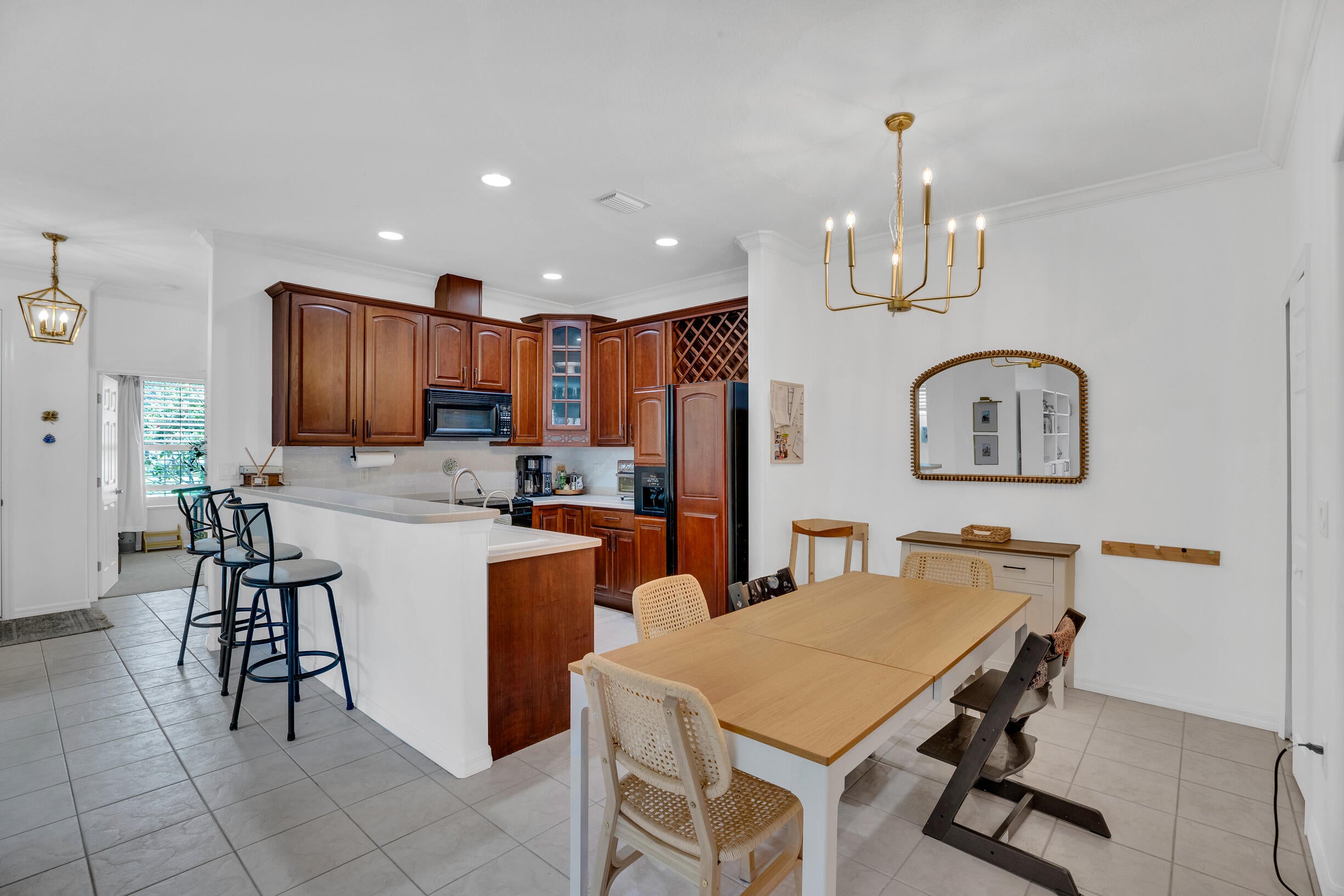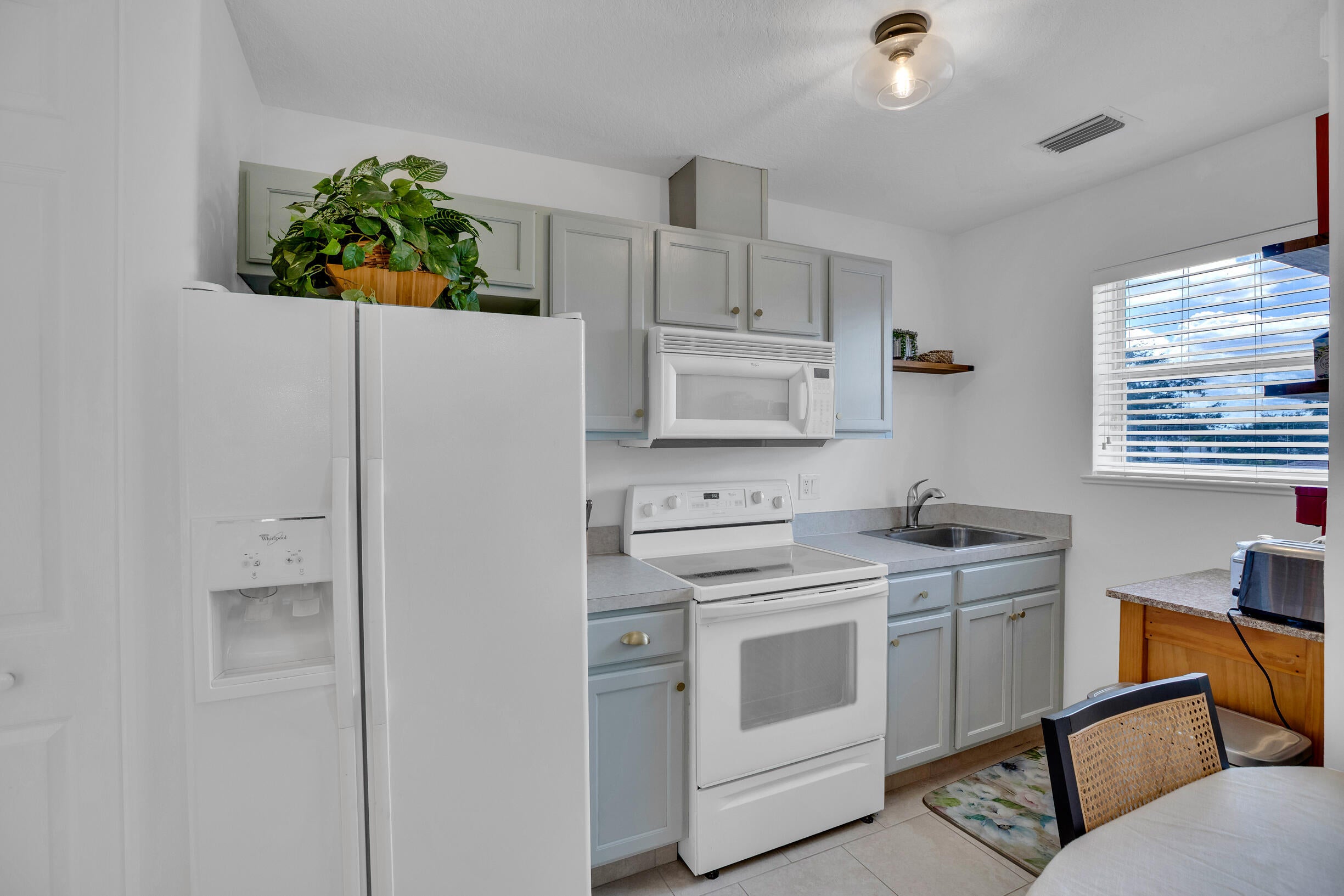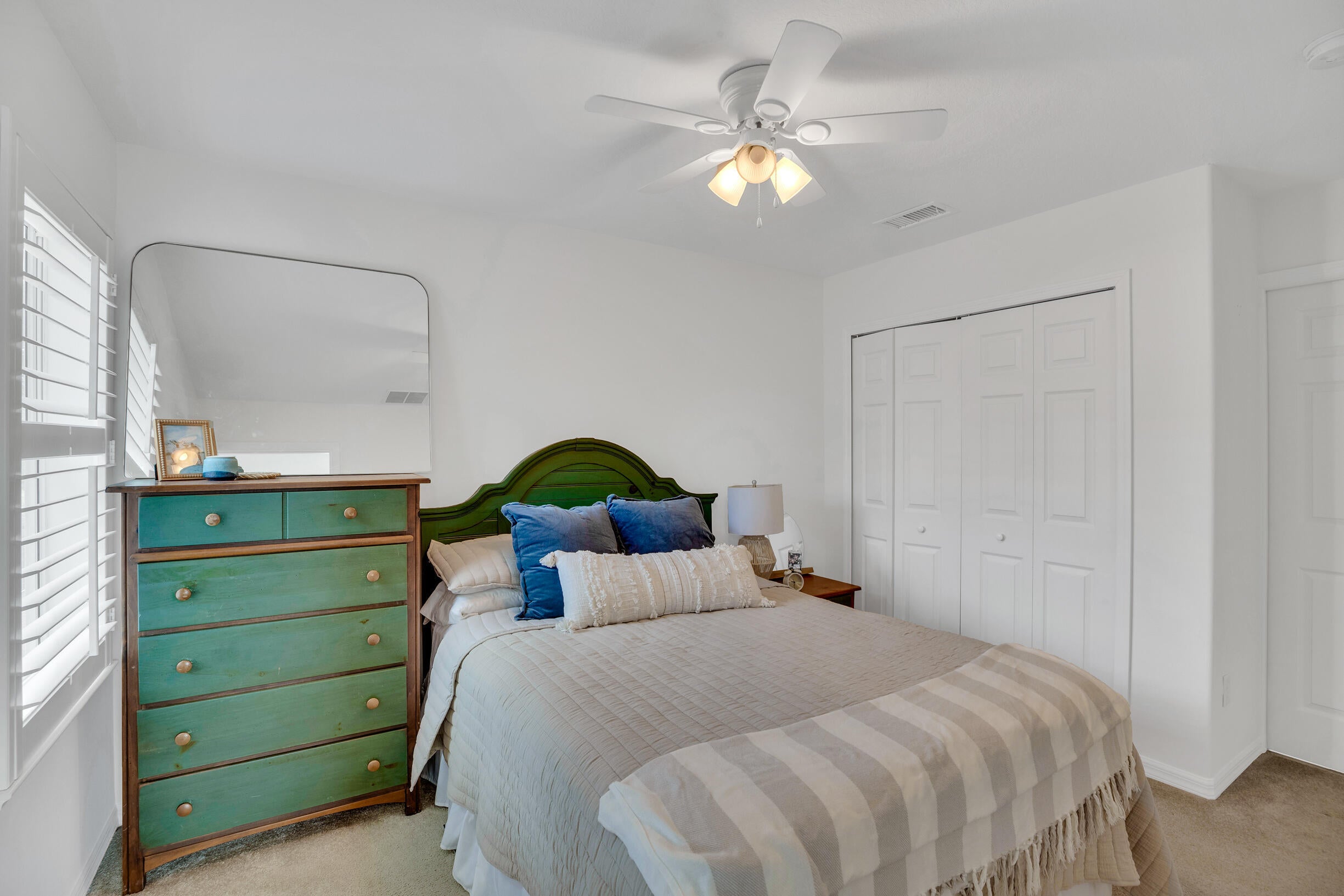 This extremely rare 2/2/2.5 + den Plus a detached 1/1 Apartment with separate entrance is 1 of only 10 in the community! Located less than 1 block from the community pool, park and playground. This spectacular unit has a 23' roof and HWH. Main house features crown molding, upgraded 42'' kitchen cabinets, granite counter tops, plantation shutters and so much more! Tiled common areas with carpeted bedrooms and open Den/office space. Primary bathroom remodel features make-up area, vanity with new faucets & mirrors. Separate full apartment with spacious balcony and street parking allowed for guests