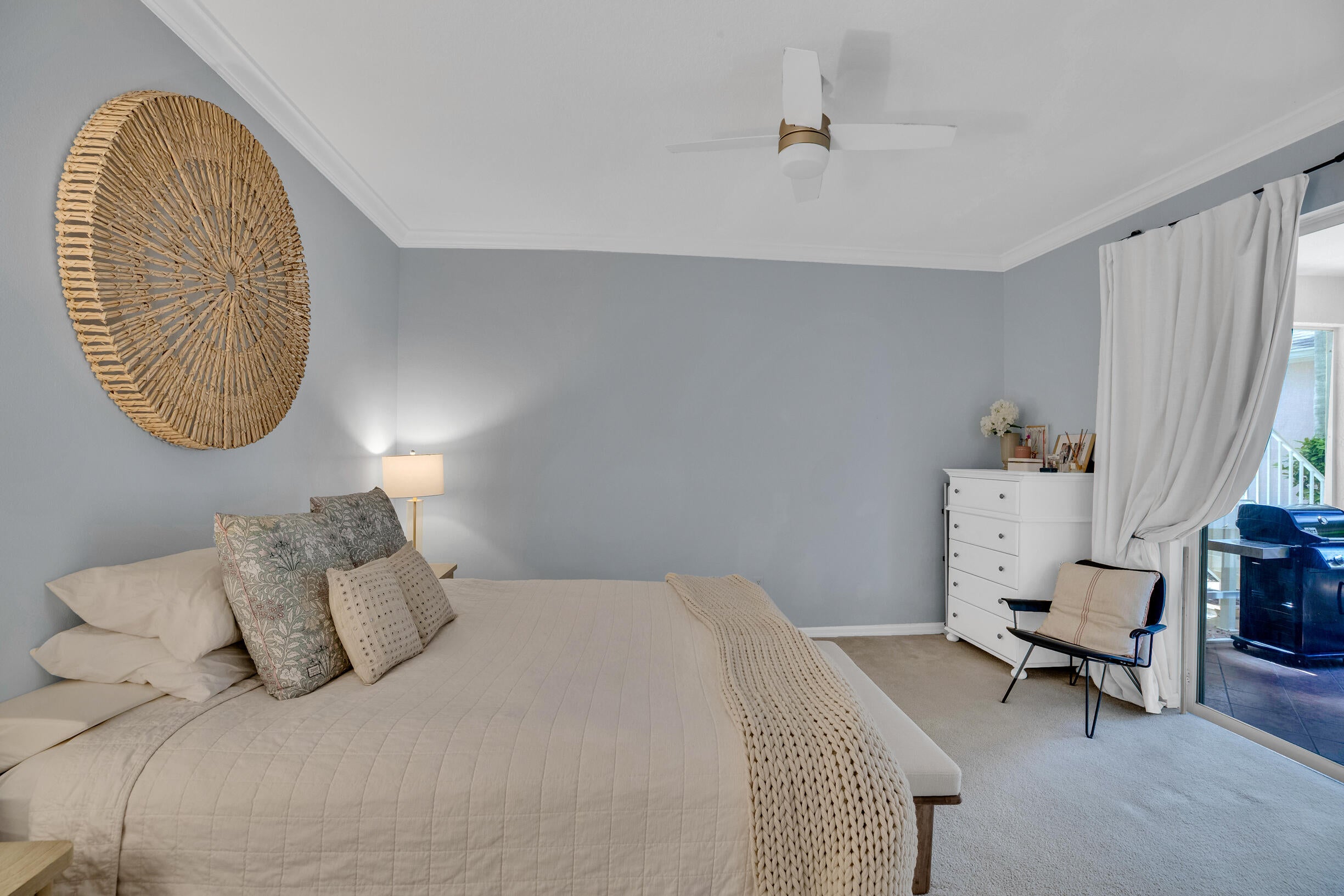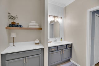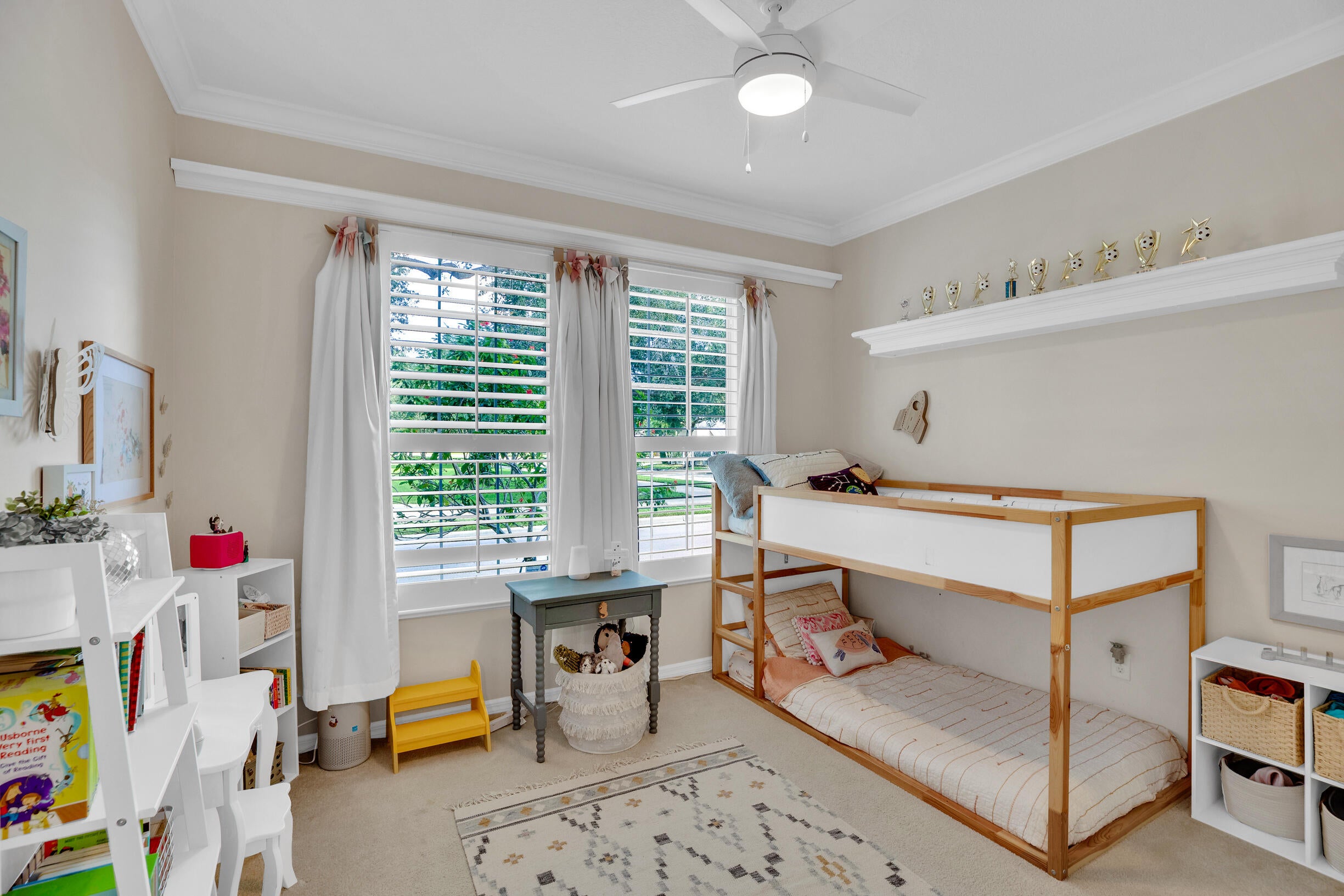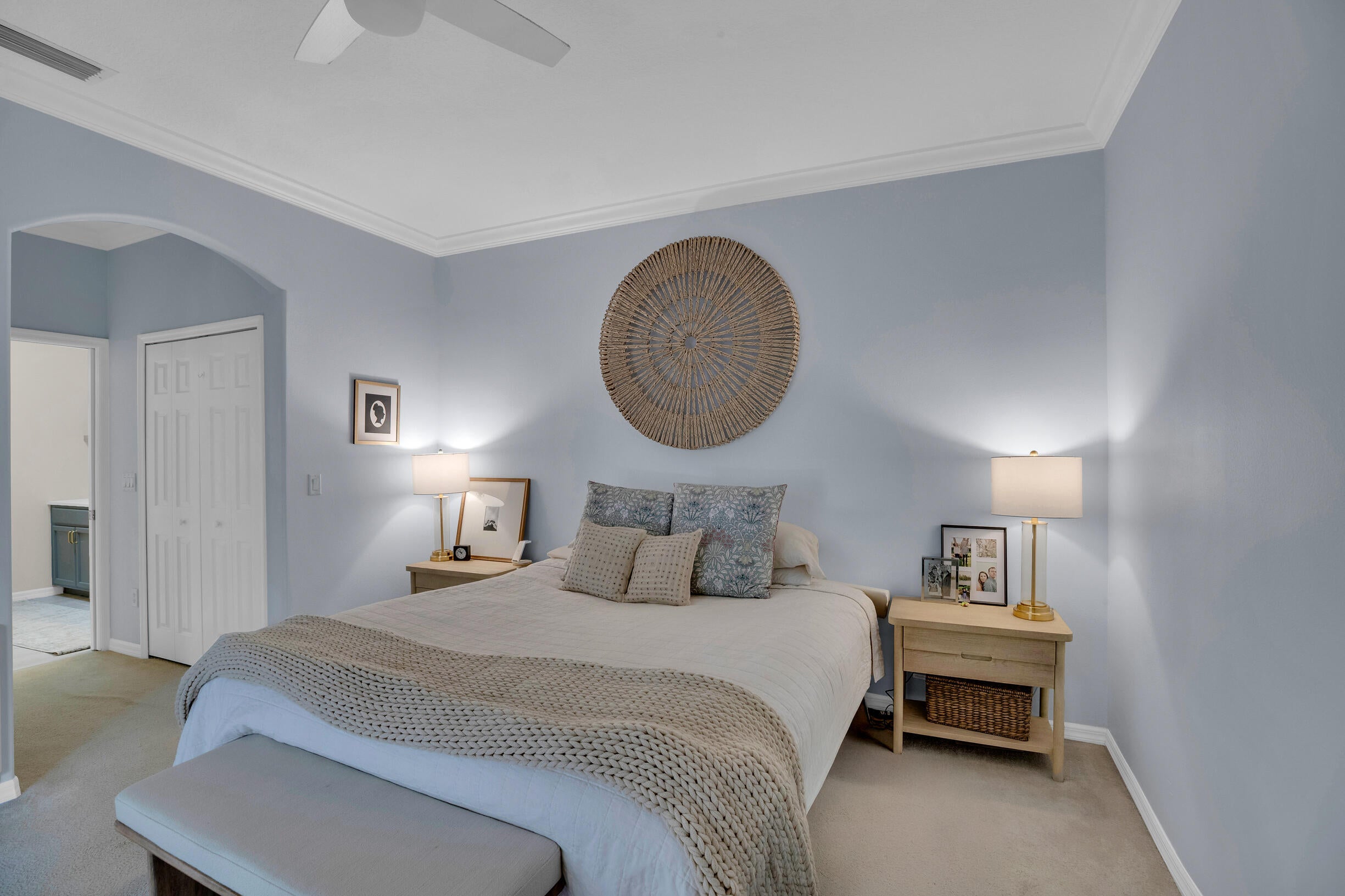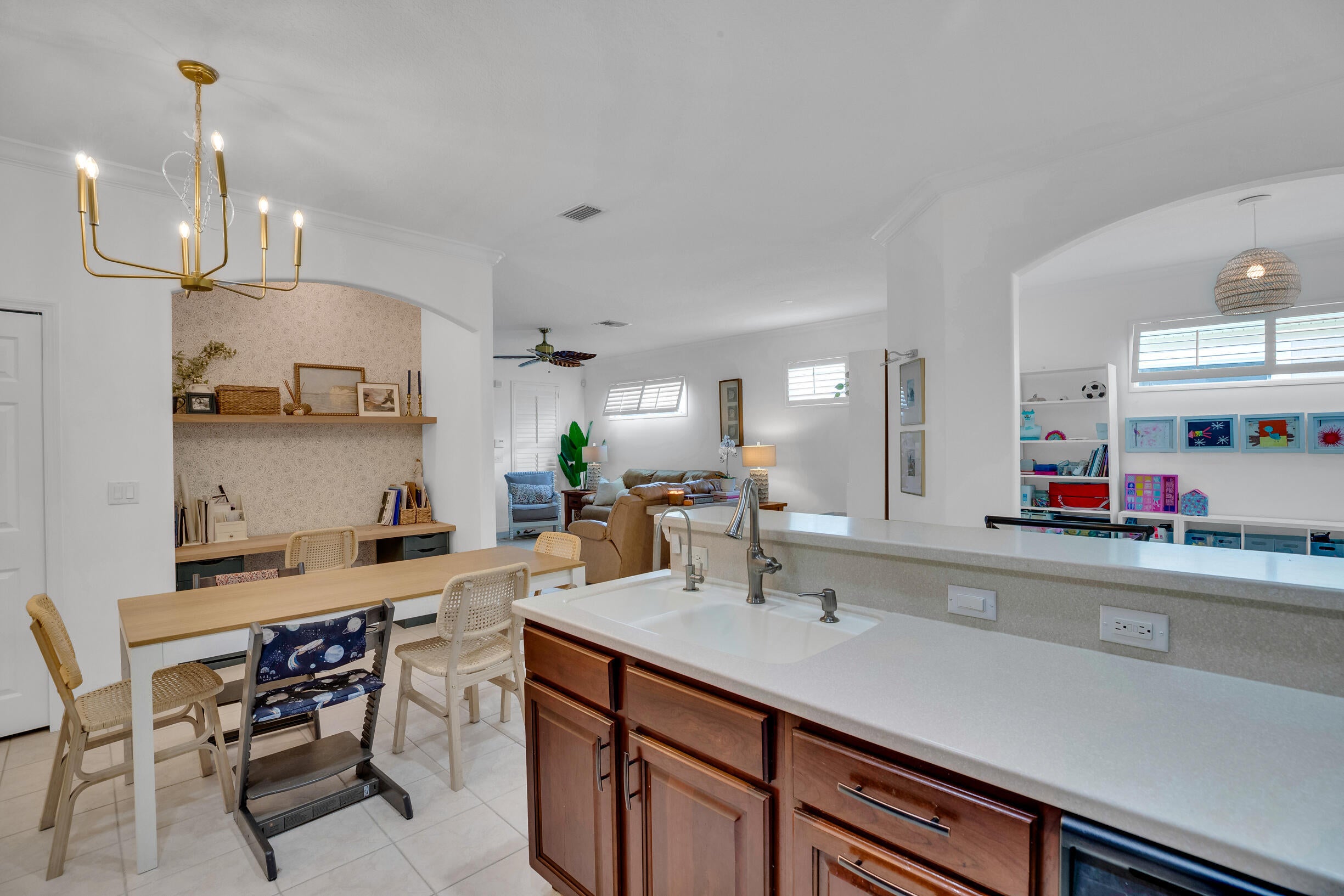 This extremely rare 2/2/2.5 + den Plus a detached 1/1 Apartment with separate entrance is 1 of only 10 in the community! Located less than 1 block from the community pool, park and playground. This spectacular unit has a 23' roof and HWH. Main house features crown molding, upgraded 42'' kitchen cabinets, granite counter tops, plantation shutters and so much more! Tiled common areas with carpeted bedrooms and open Den/office space. Primary bathroom remodel features make-up area, vanity with new faucets & mirrors. Separate full apartment with spacious balcony and street parking allowed for guests