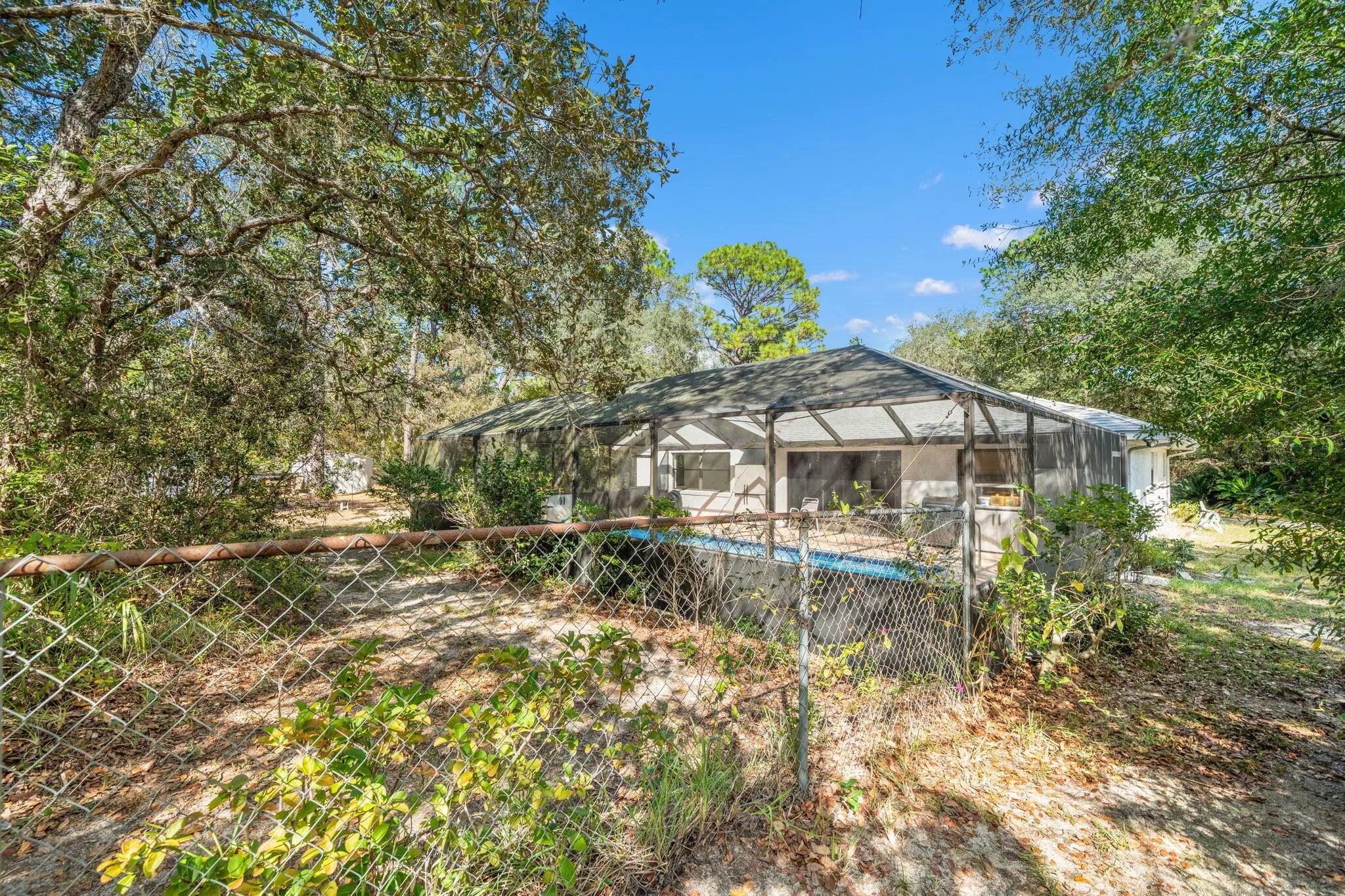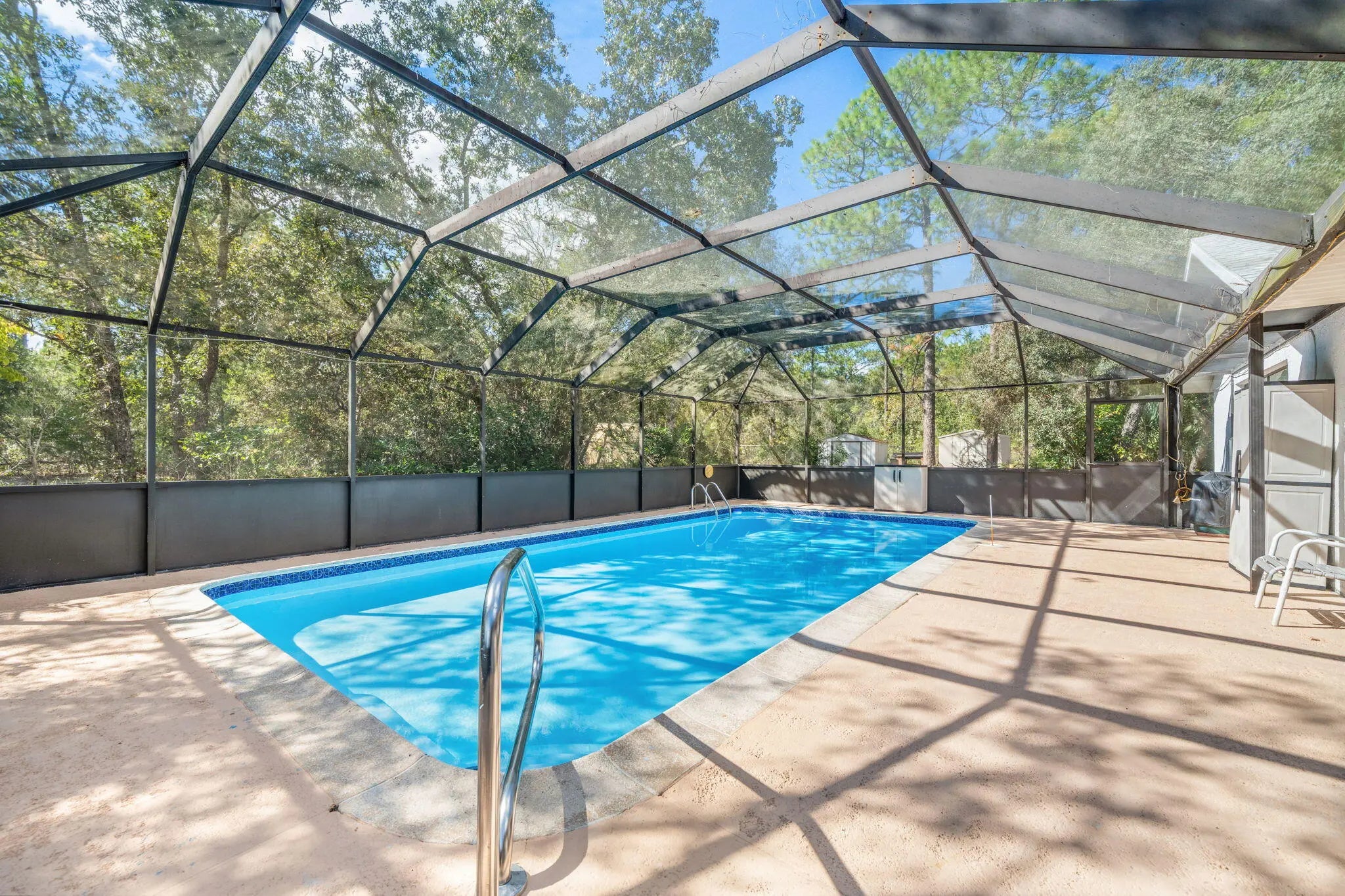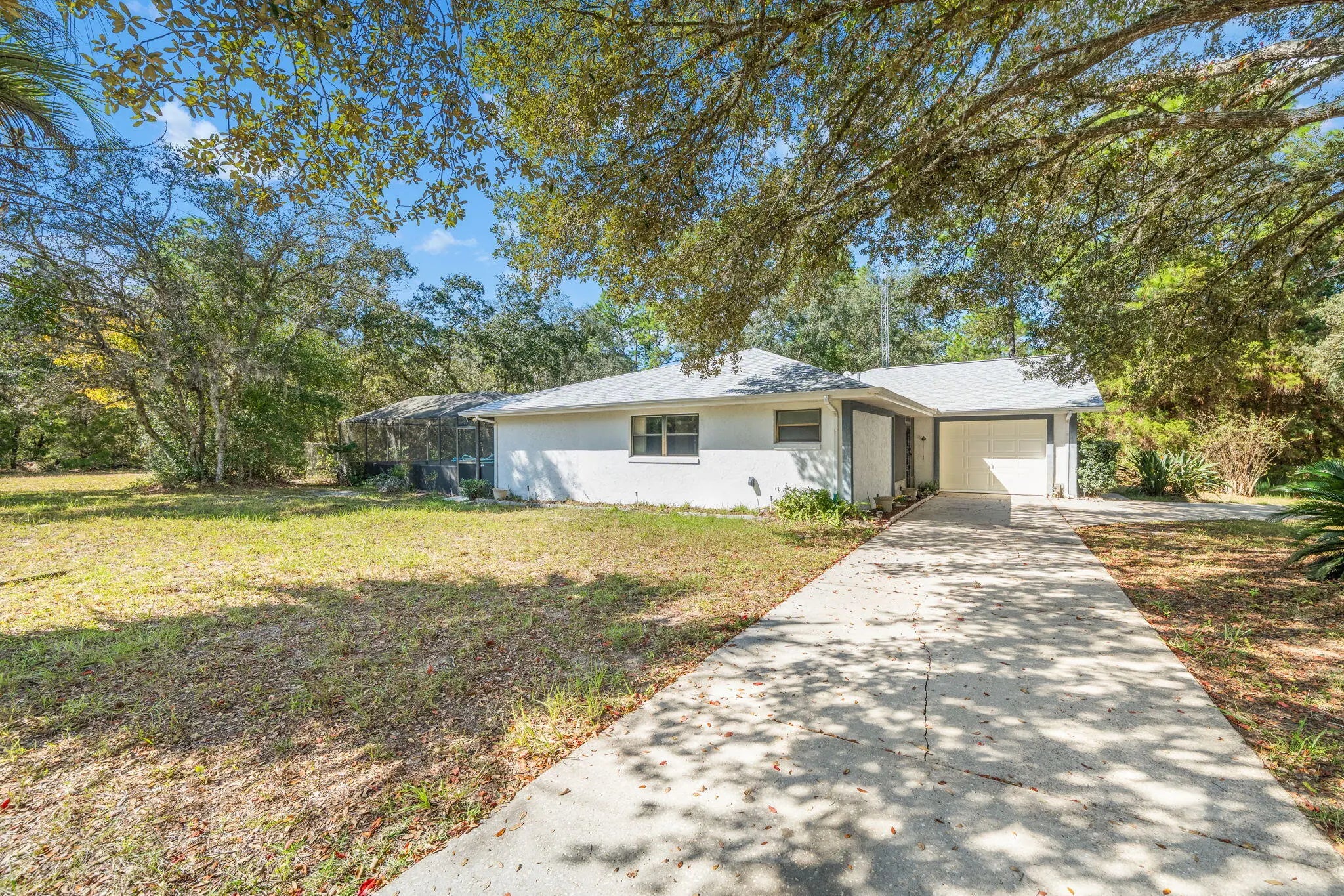 Welcome to 7418 N Firwood Circle, a well-maintained 4-bedroom, 2-bath concrete block home on over an acre in peaceful Citrus Springs. Surrounded by forest on three sides, this private retreat offers an in-ground pool, fenced yard, two sheds, and a greenhouse. Updates include a new roof (2024), water heater (2025), HVAC (2021), fresh paint, new screens, upgraded lighting, and refinished pool surfaces. Inside, enjoy a bright kitchen, open living and dining areas, tile floors, and two enclosed bonus rooms. Lush landscaping with azaleas, camellias, magnolias, and a Meyer lemon tree creates a vibrant outdoor oasis. No HOA, minimal traffic, and clear skies for Cape Canaveral views!