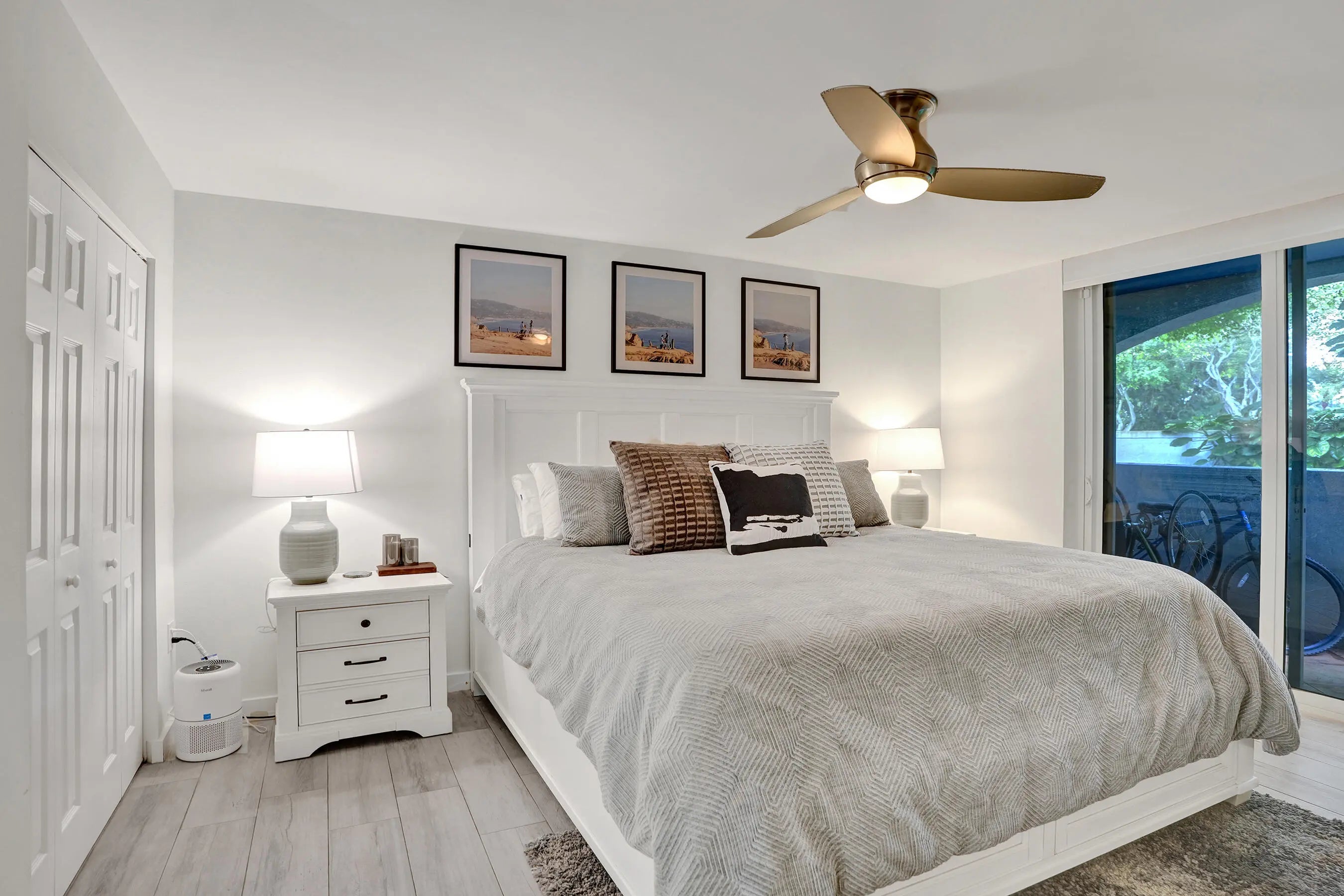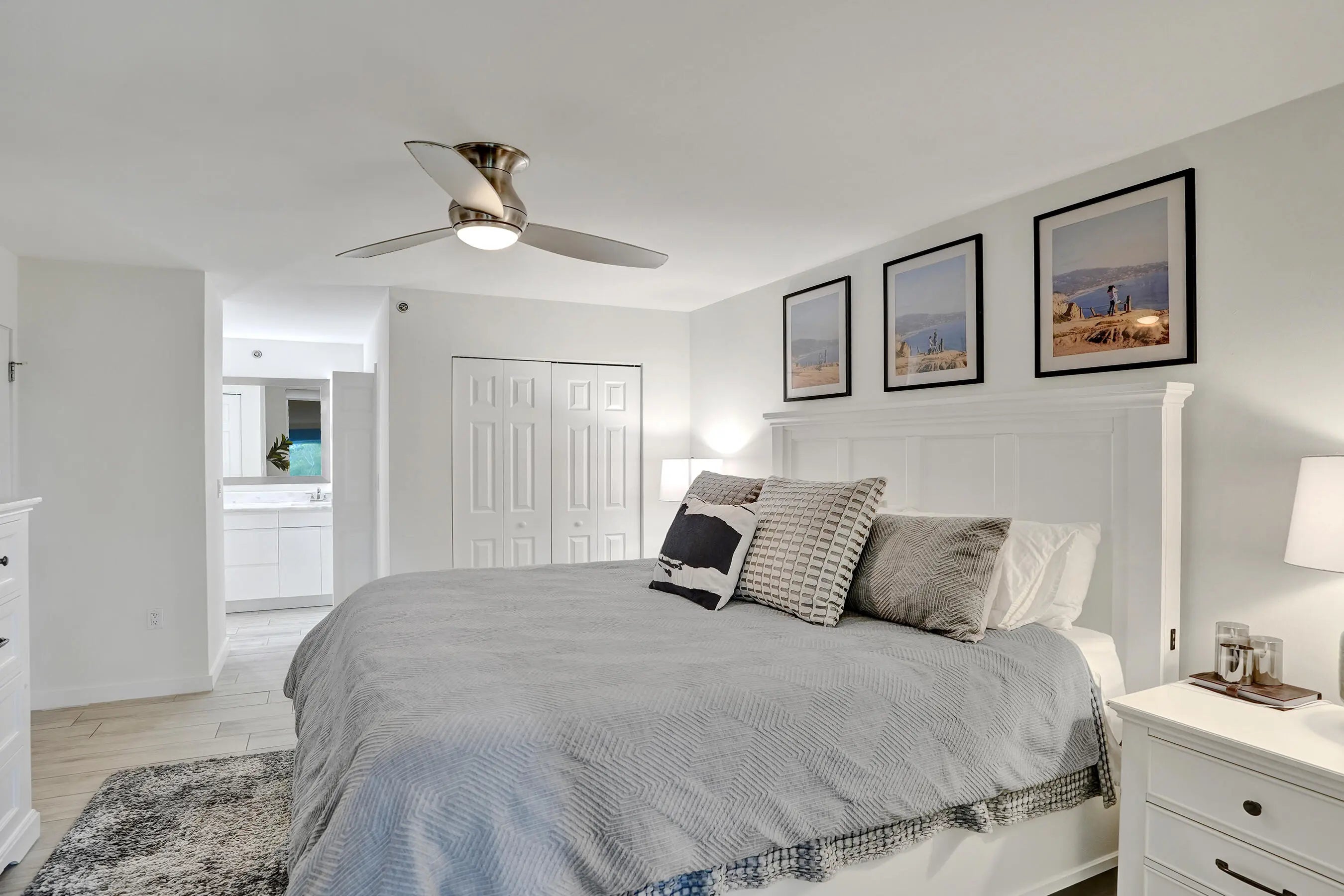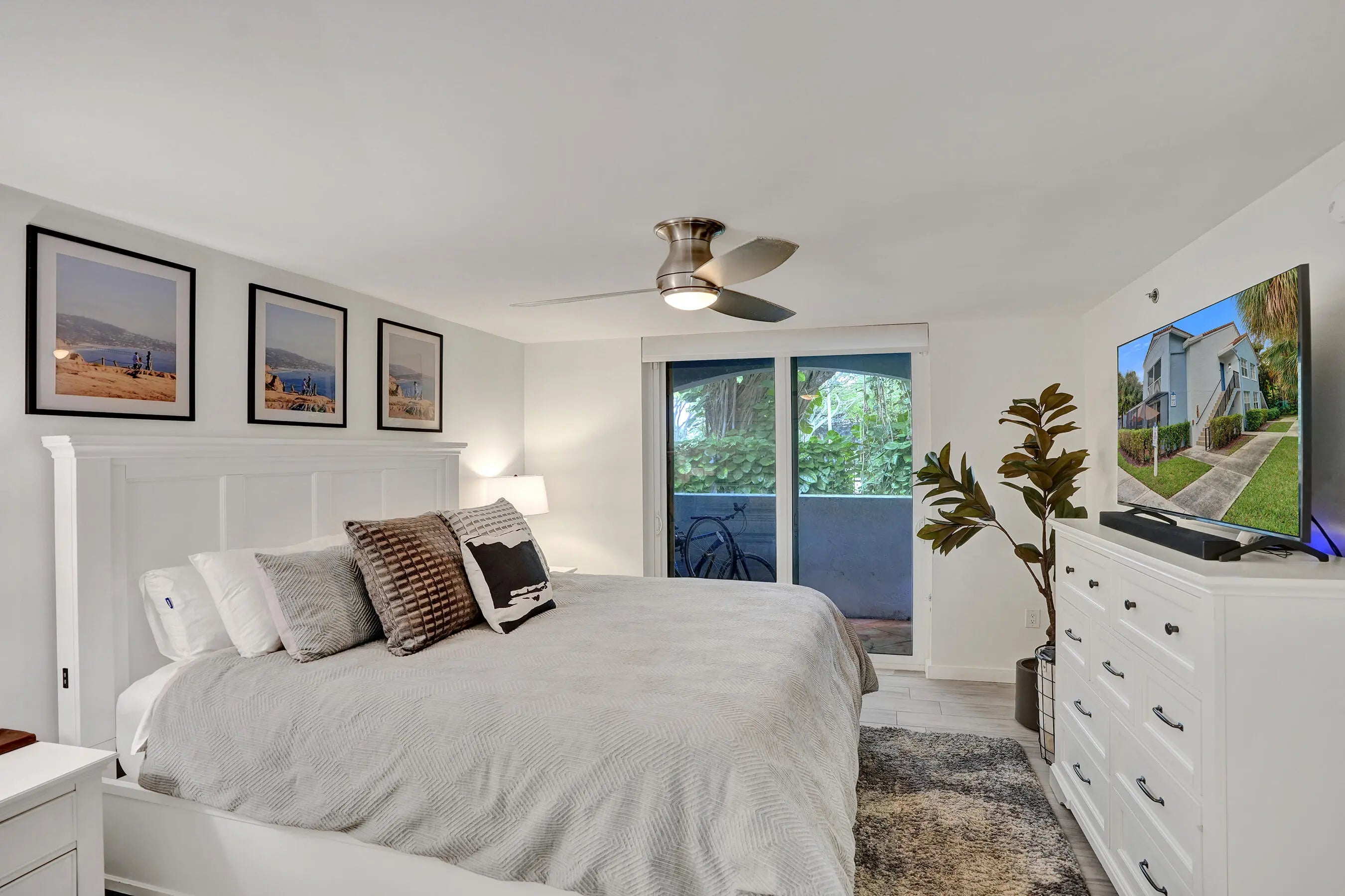 Only updated unit on the market w/ hurricane impact windows + doors! Completely renovated 1st-floor corner condo in gated Bocar w/ pool, tennis & pickleball. Can lease right away! No expense spared! Marble floors, stunning modern kitchen with sleek custom high-end cabinetry, real beautiful white quartzite waterfall countertops and stainless steel appliances. Bathrooms have gorgeous matching quartzite counters + dual sinks in the primary suite. Bonus space off the living room. Additional highlights include 2 covered patios, spacious bedrooms, walk-in custom closets, full-size in-unit laundry, and a newer AC. Can be rented immediately! The community was recently renovated with freshly painted exteriors and offers resort-style amenities: pool & spa, clubhouse,
