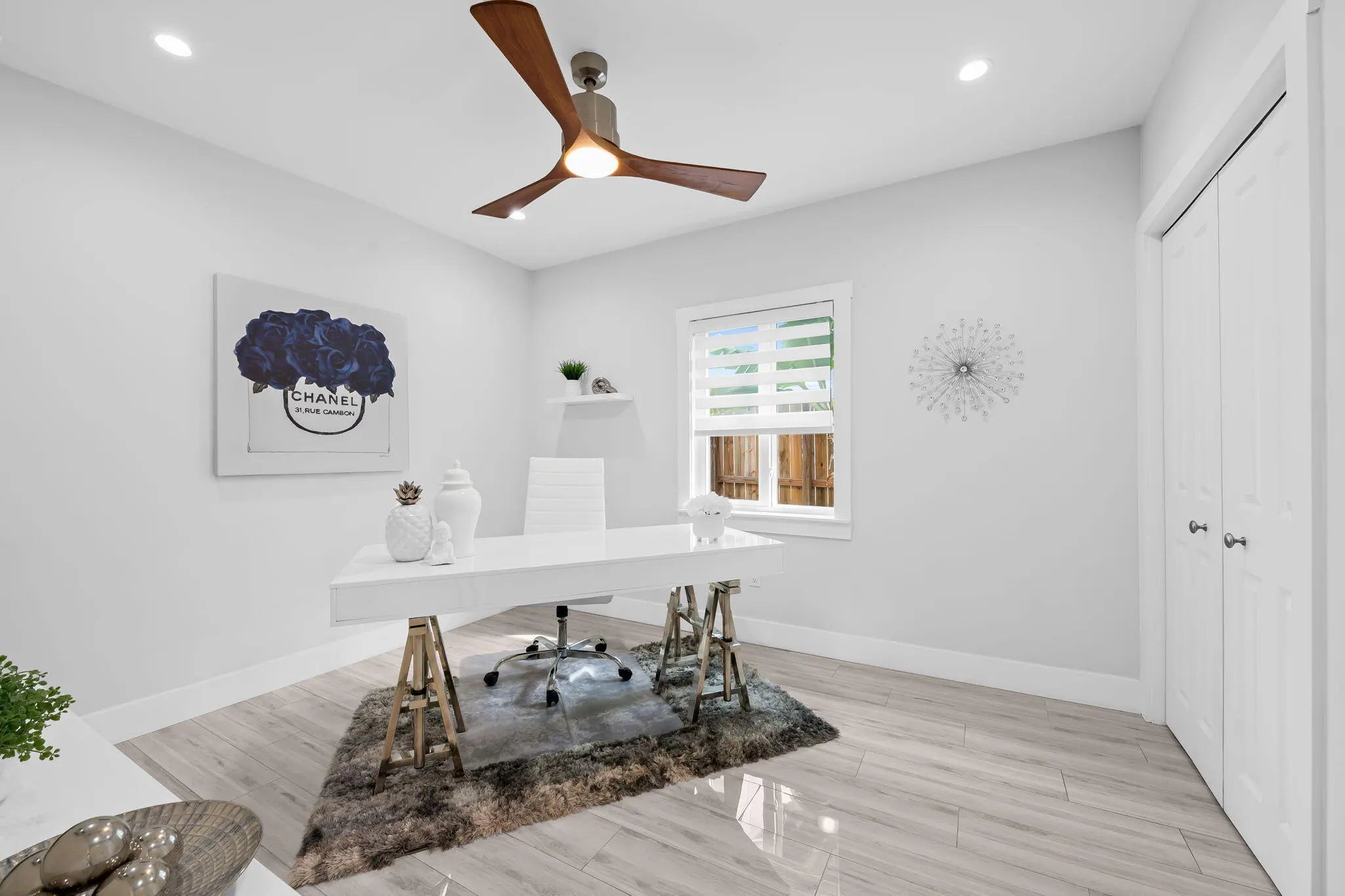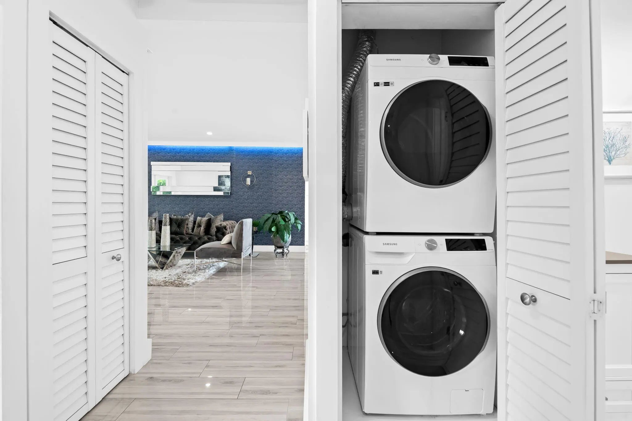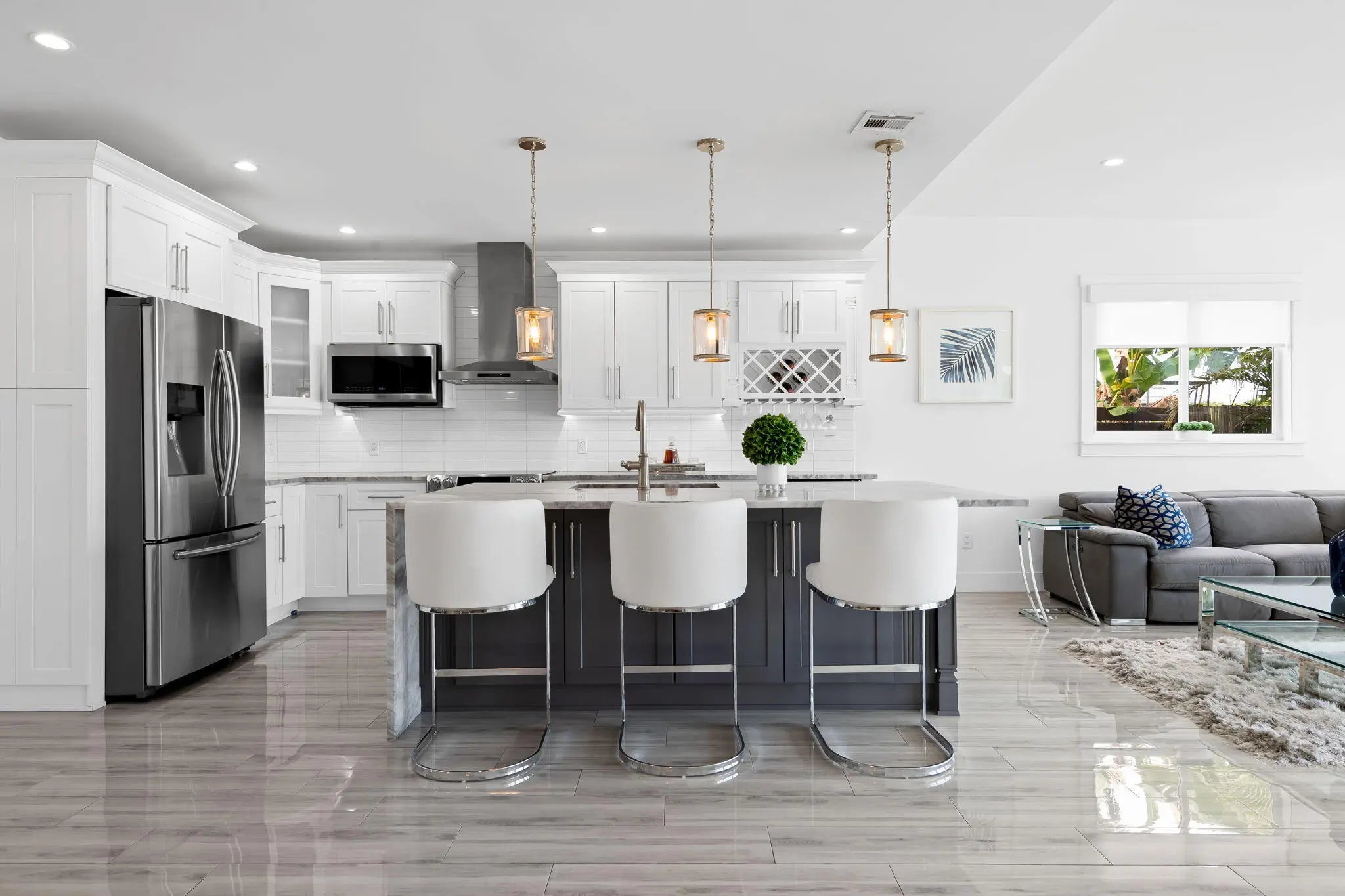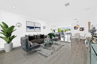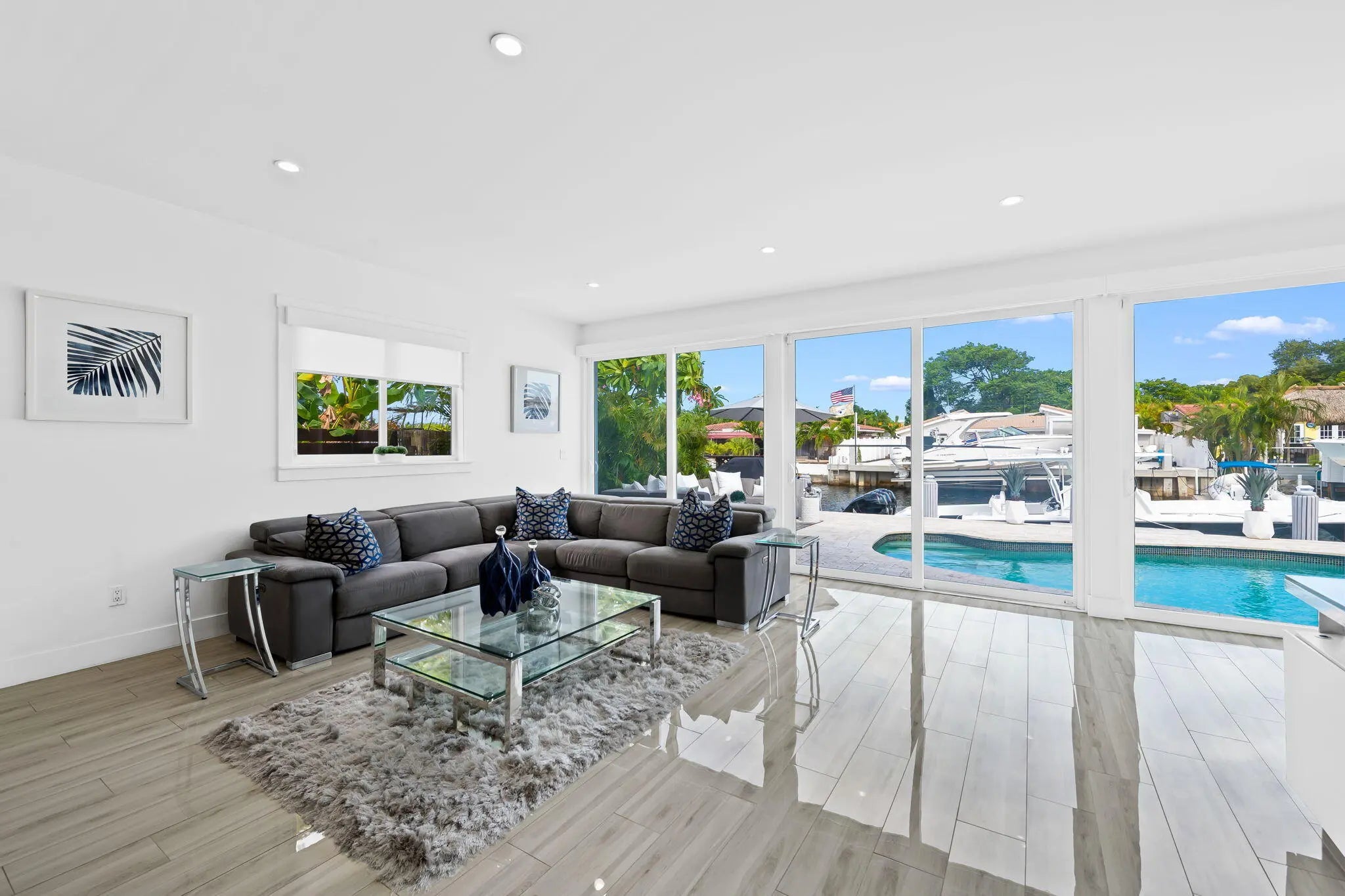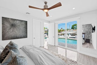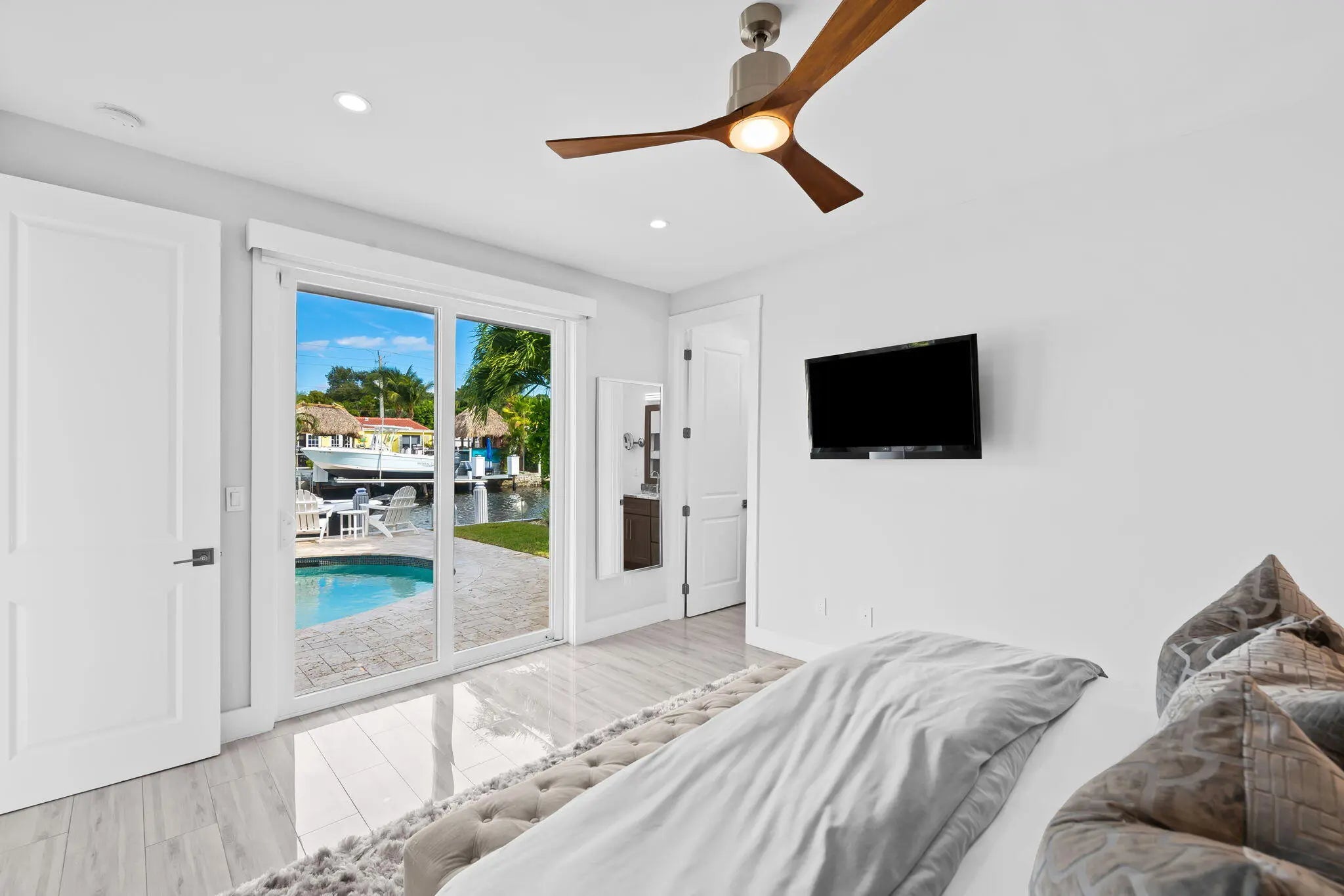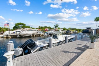 Welcome to this stunning waterfront retreat where modern design meets smart living. This fully furnished (unfurnished upon request) three-bedroom, two-bath home offers 60 feet of prime ocean-access waterfrontage with NO fixed bridges. Featuring a 50-foot dock with Hatteras brand duel light power pedestal 50/30 amps, water and solar dock lights and a sparkling resort-style pool surrounded by a travertine patio and lush tropical landscaping. Every detail has been thoughtfully curated for comfort and style, from the impact-rated windows and doors to the elegant half-circle driveway and fully fenced backyard that blend privacy with sophistication. Inside, a bright open layout features glossy polished white wood-plank ceramic tile, solid wood interior doors, and custom designer wall