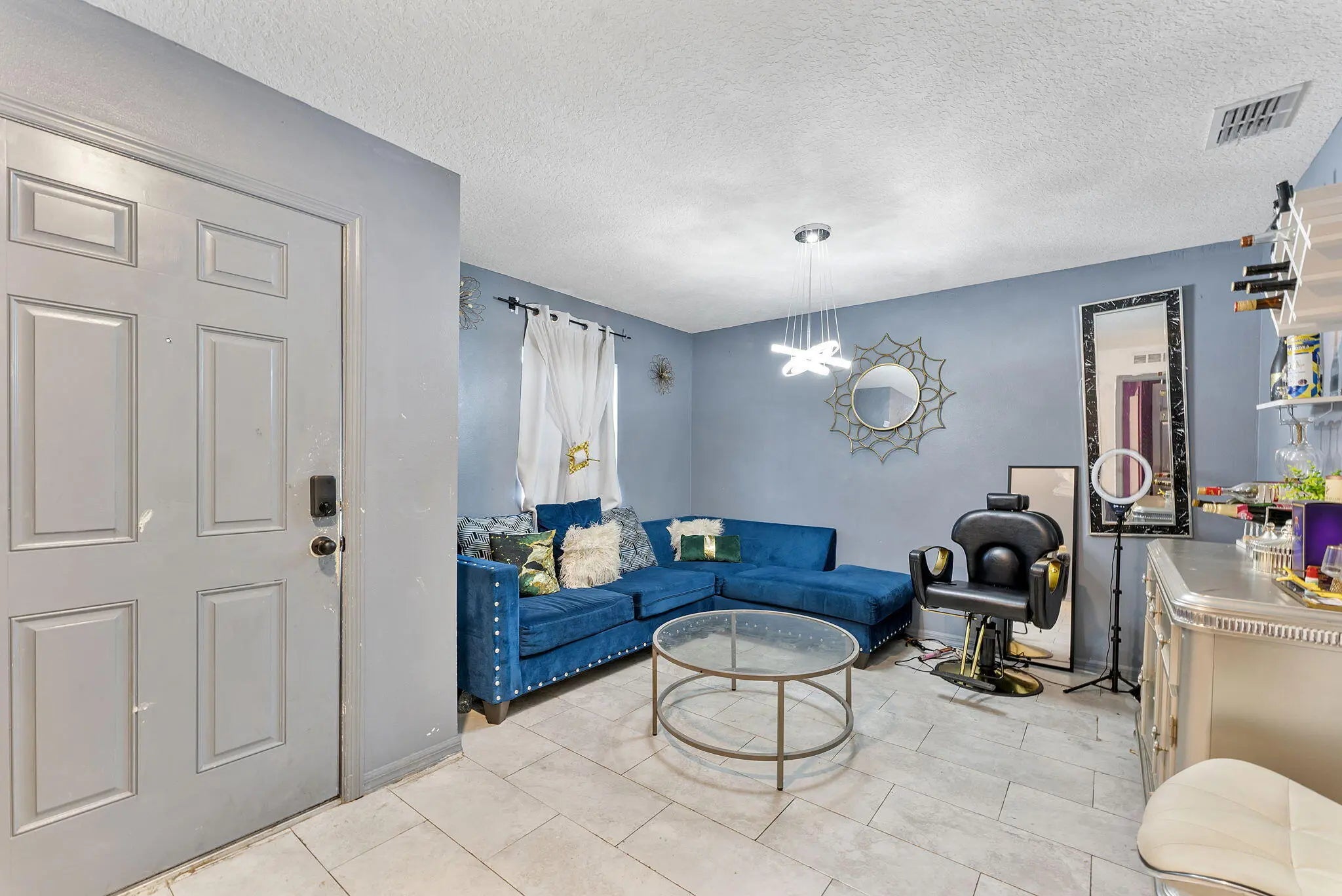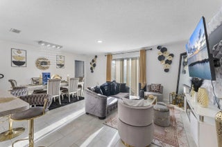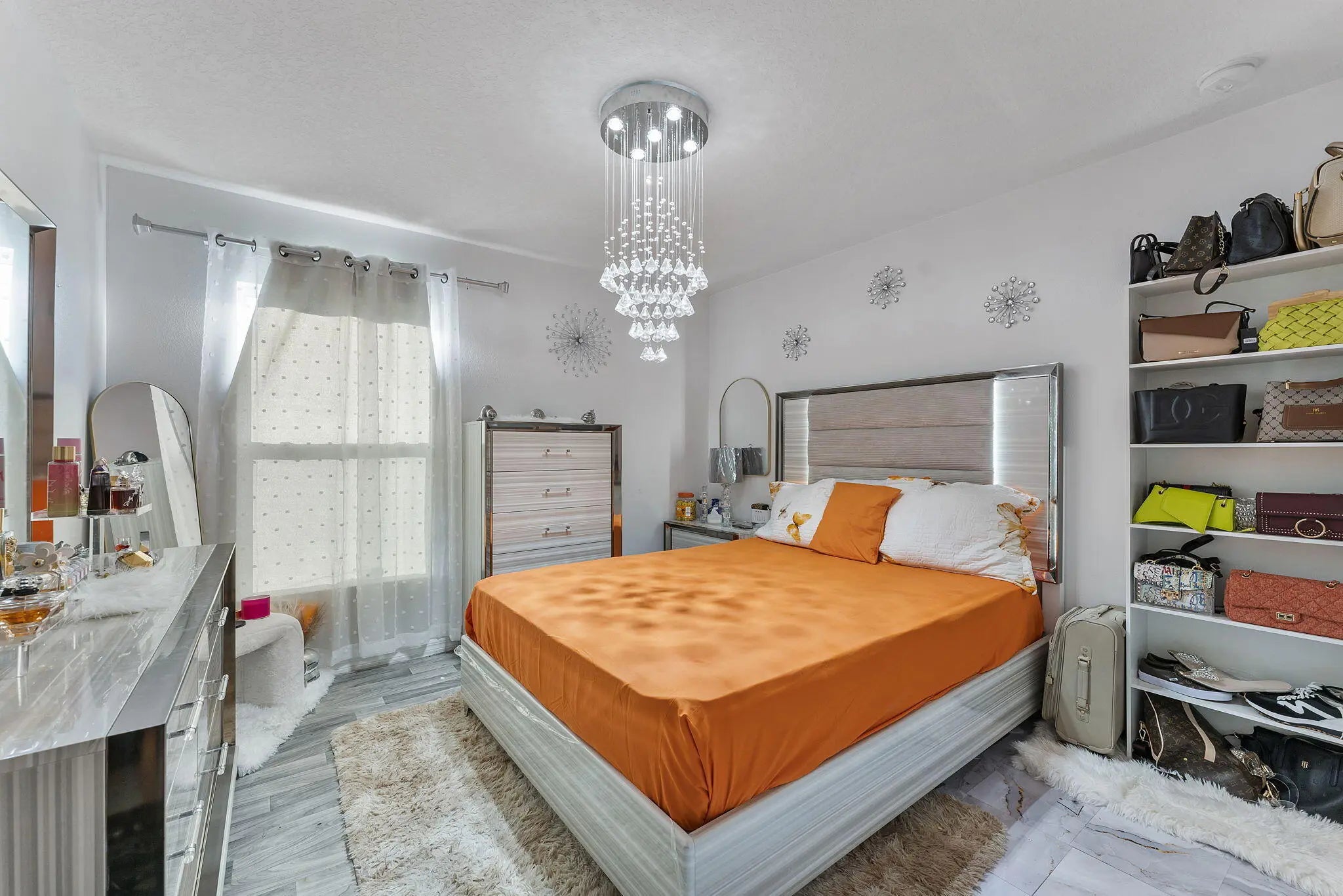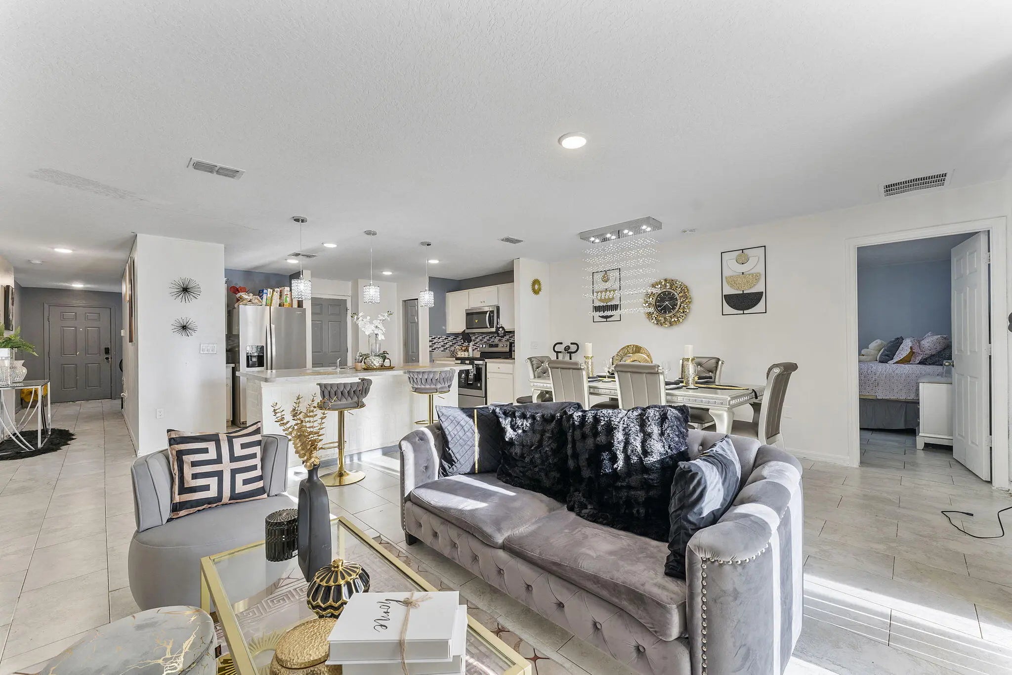 Prepare to be dazzled by this exceptional single family residence, a home where every detail is a statement of style and luxury. Designed for the homeowner who appreciates dramatic flair and spacious function, this 4 bed, 2 bath, and a 2 car garage. Step into an open concept living space. The heart of the home is a seamless great room designed for both grand entertaining and dazzling daily life. The living and dining areas are crowned with show-stopping crystal chandeliers and bespoke light fixtures that throw shimmering light across the space, instantly setting a luxurious mood. The designer kitchen is a bright centerpiece, boasting crisp white cabinetry, modern stainless steel appliances, and a unique mosaic tile backsplash that provides a striking visual contrast