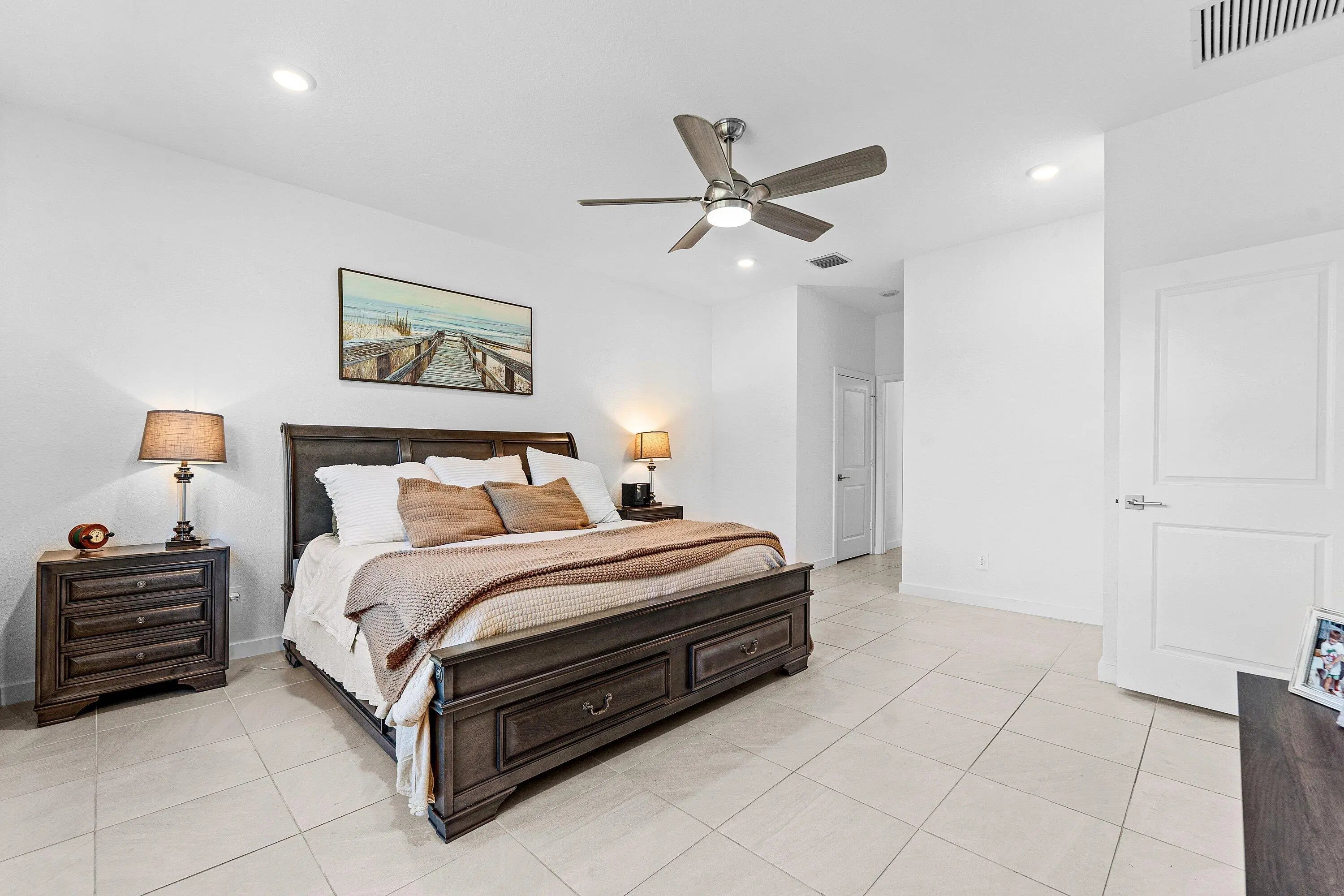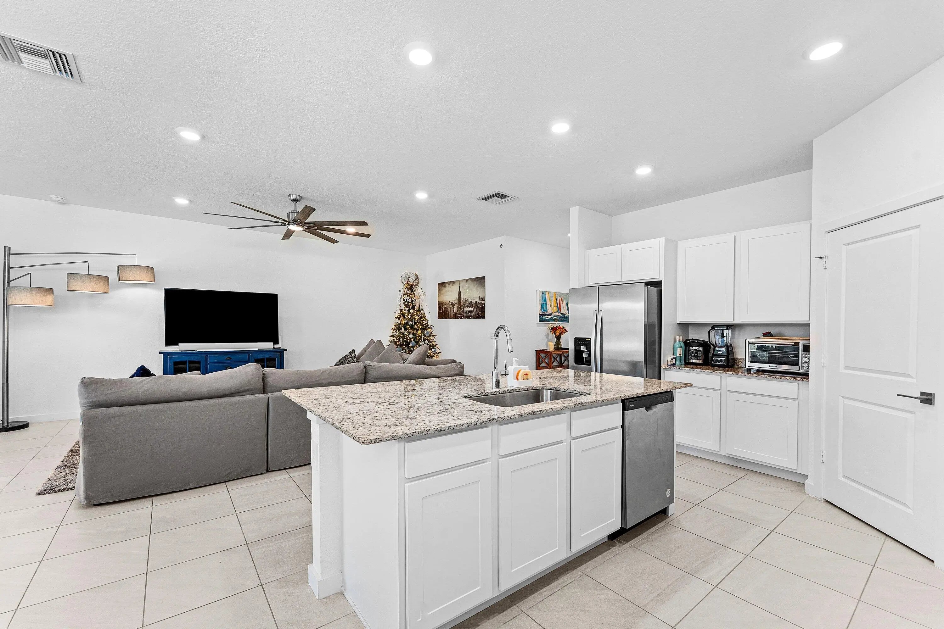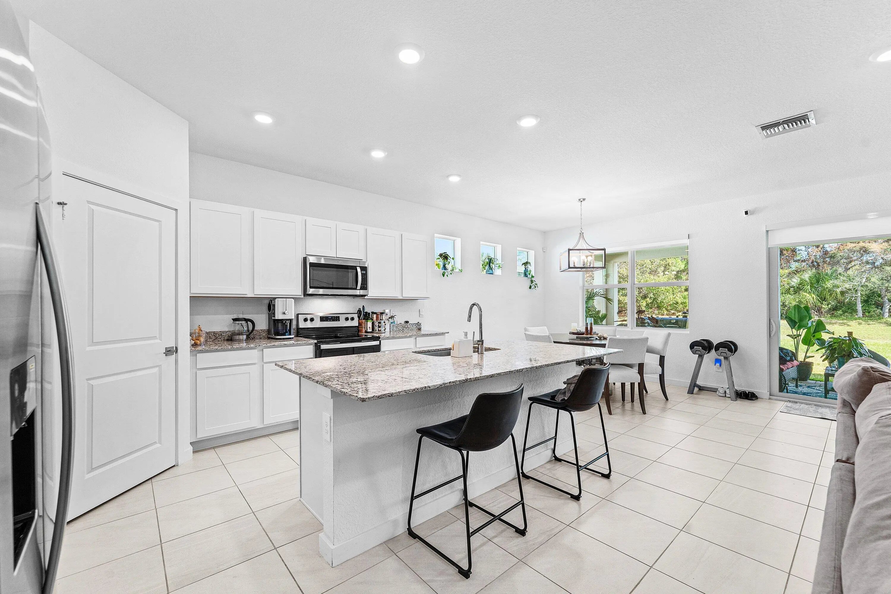 This DR Horton Delray model exemplifies the perfect blend of style, comfort, and coastal sophistication. Completed just one year ago, this single-level residence features four generously sized bedrooms and two beautifully appointed bathrooms. High-end finishes include granite countertops, an oversized pantry, a spacious kitchen island, elegant tile flooring, European-style light switches, and upgraded fans and light fixtures throughout.Constructed with durable CBS and outfitted with impact-resistant windows and doors, the home offers both aesthetic appeal and exceptional peace of mind. Inside, a thoughtfully designed split floorplan provides privacy and functionality, while the primary suite boasts dual walk-in closets and blackout roller shades enhance comfort in every room. The