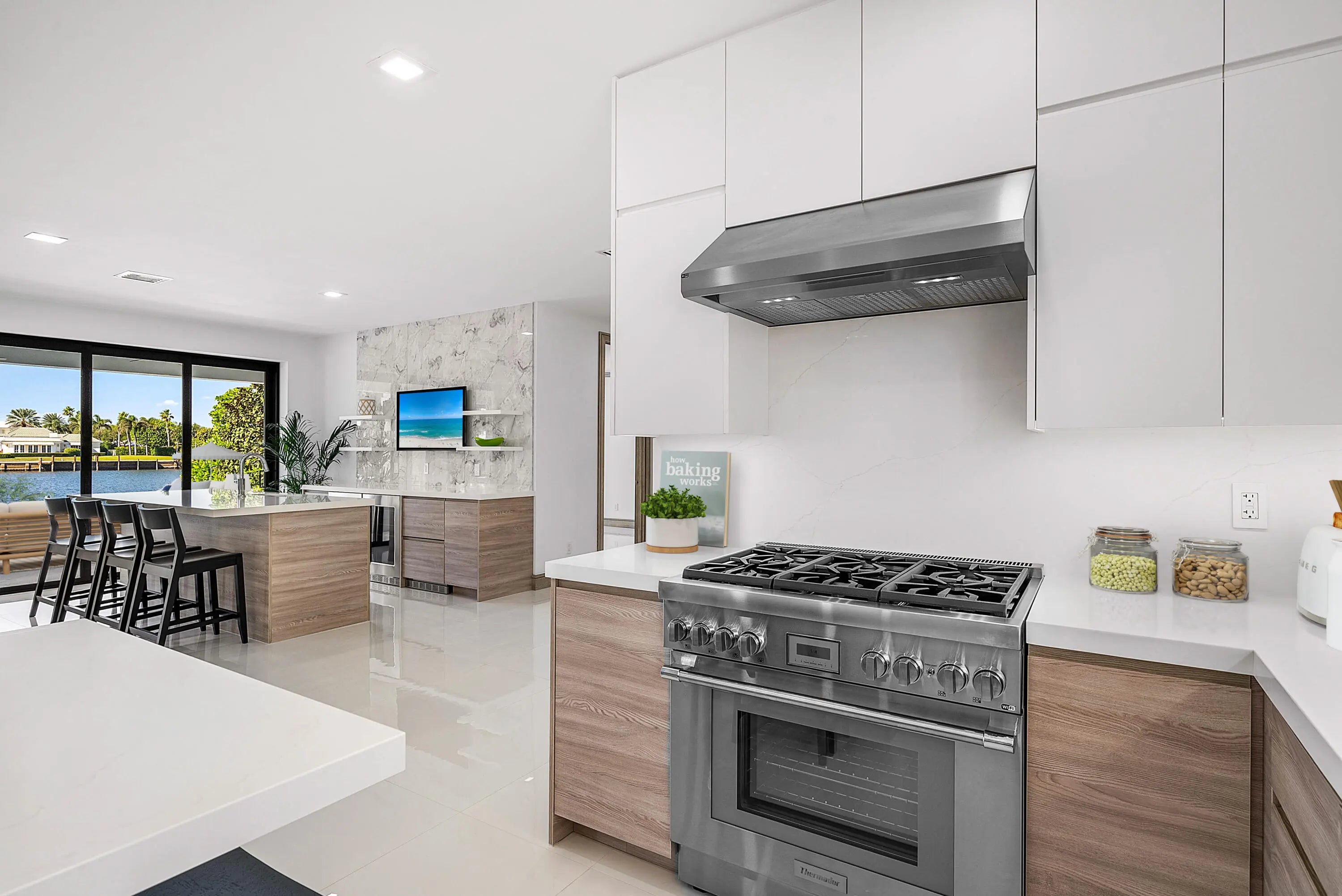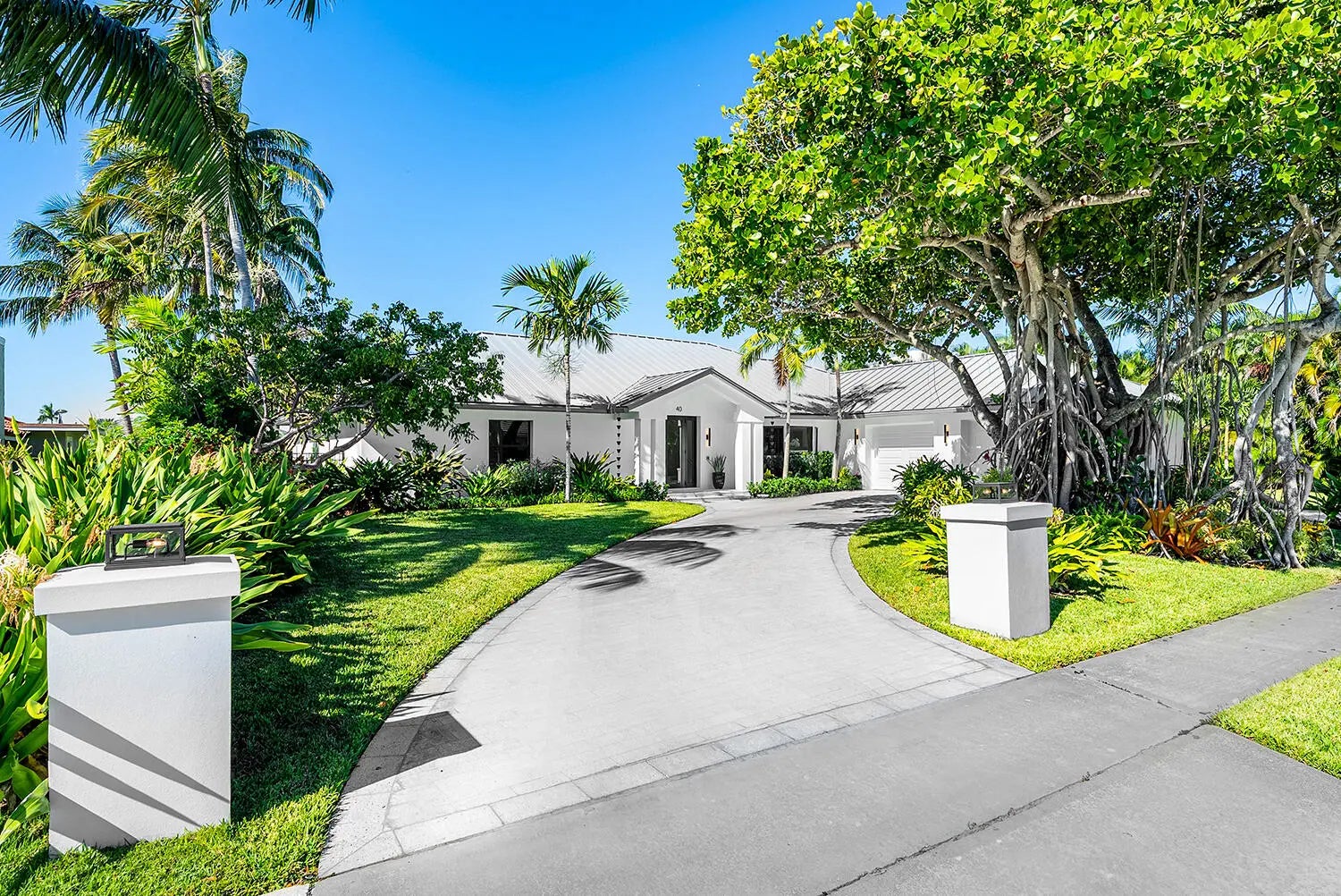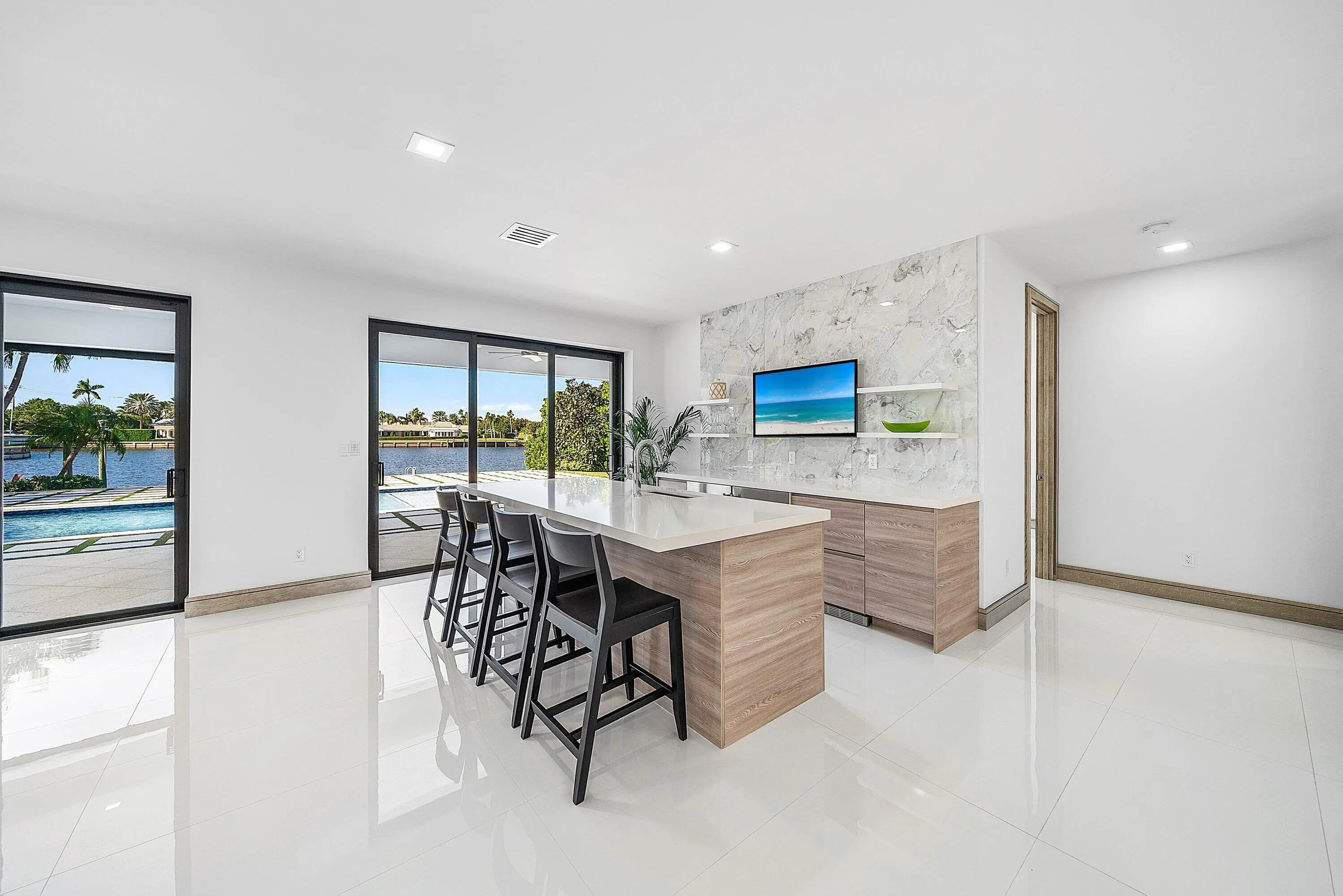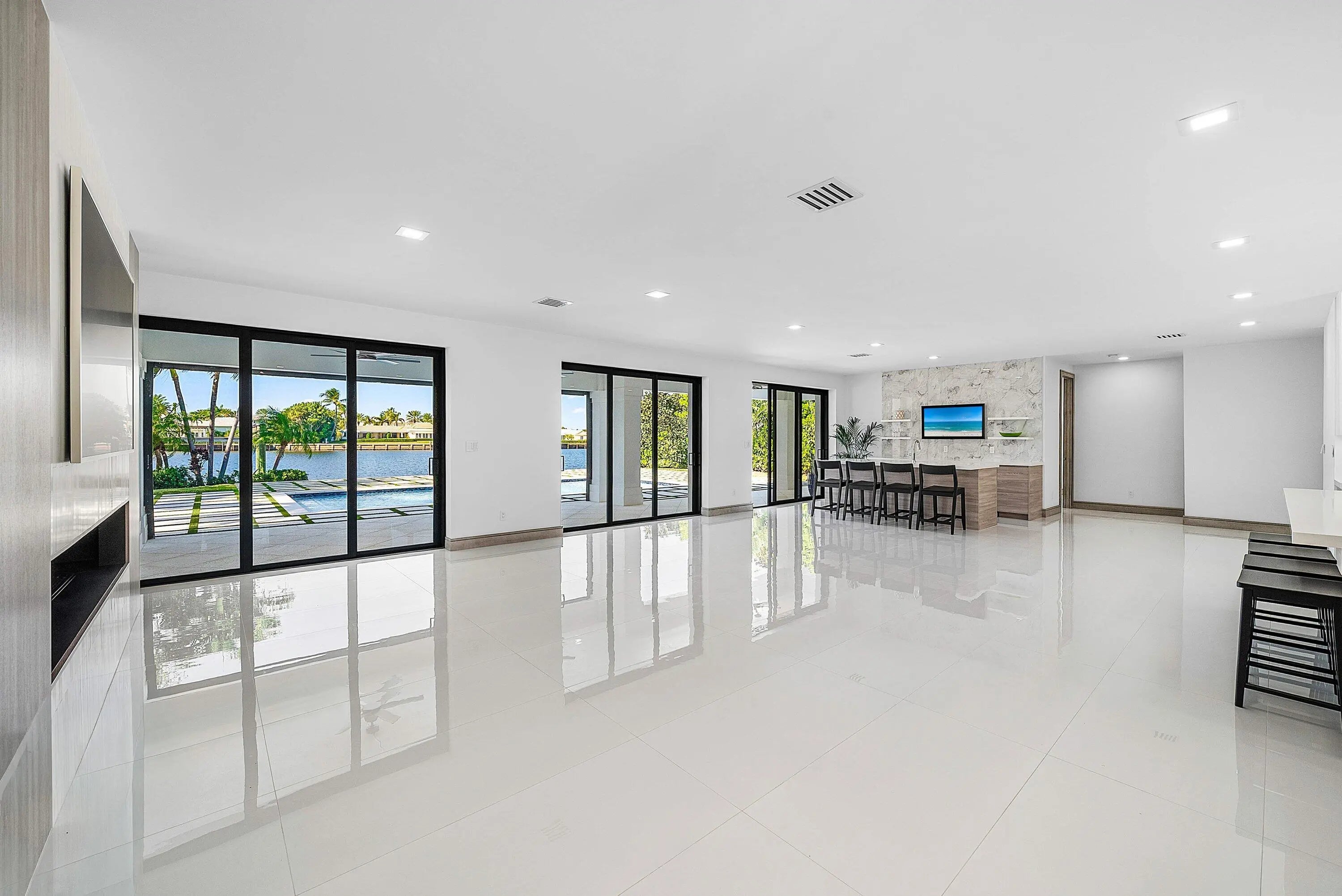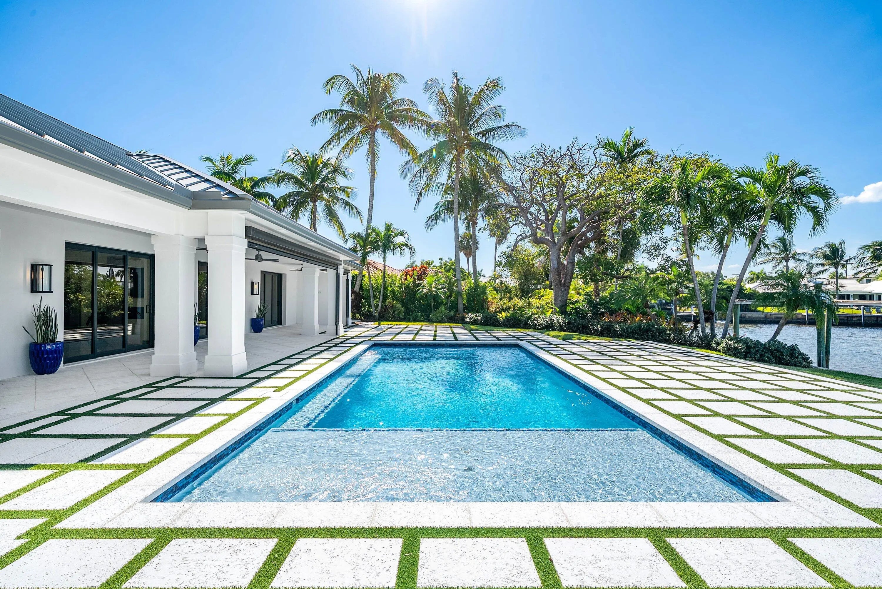 Just completed and rarely available is this exquisitely rebuilt waterfront residence in the coveted, guard-gated community of Point Manalapan. Known for its privacy, security, and upscale lifestyle, Manalapan offers an exclusive island setting unlike anywhere else. This transitional modern home has undergone a meticulous, multi-year, ground-up renovation, delivering the finest in turn-key luxury living. Everything about this extraordinary home is BRAND NEW! Including new high impact windows / doors, garage doors, roof, electrical, plumbing, appliances, HVAC, hot water, interiors/exteriors, pool, hardscape/landscape, dock, and more.With over 4,000 total square feet, the home features 4 bedrooms, 4.1 baths, a stunning heated saltwater pool overlooking the water