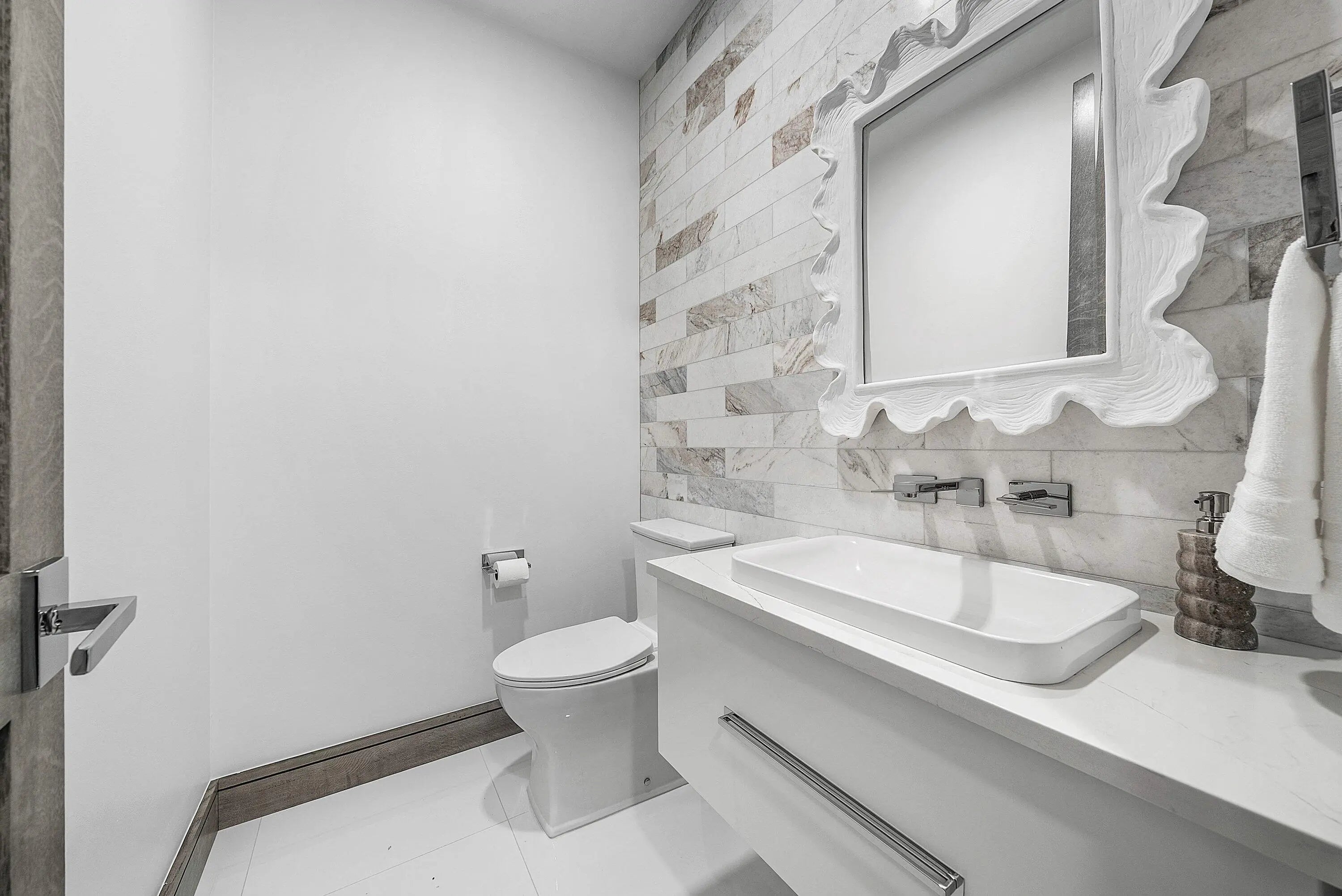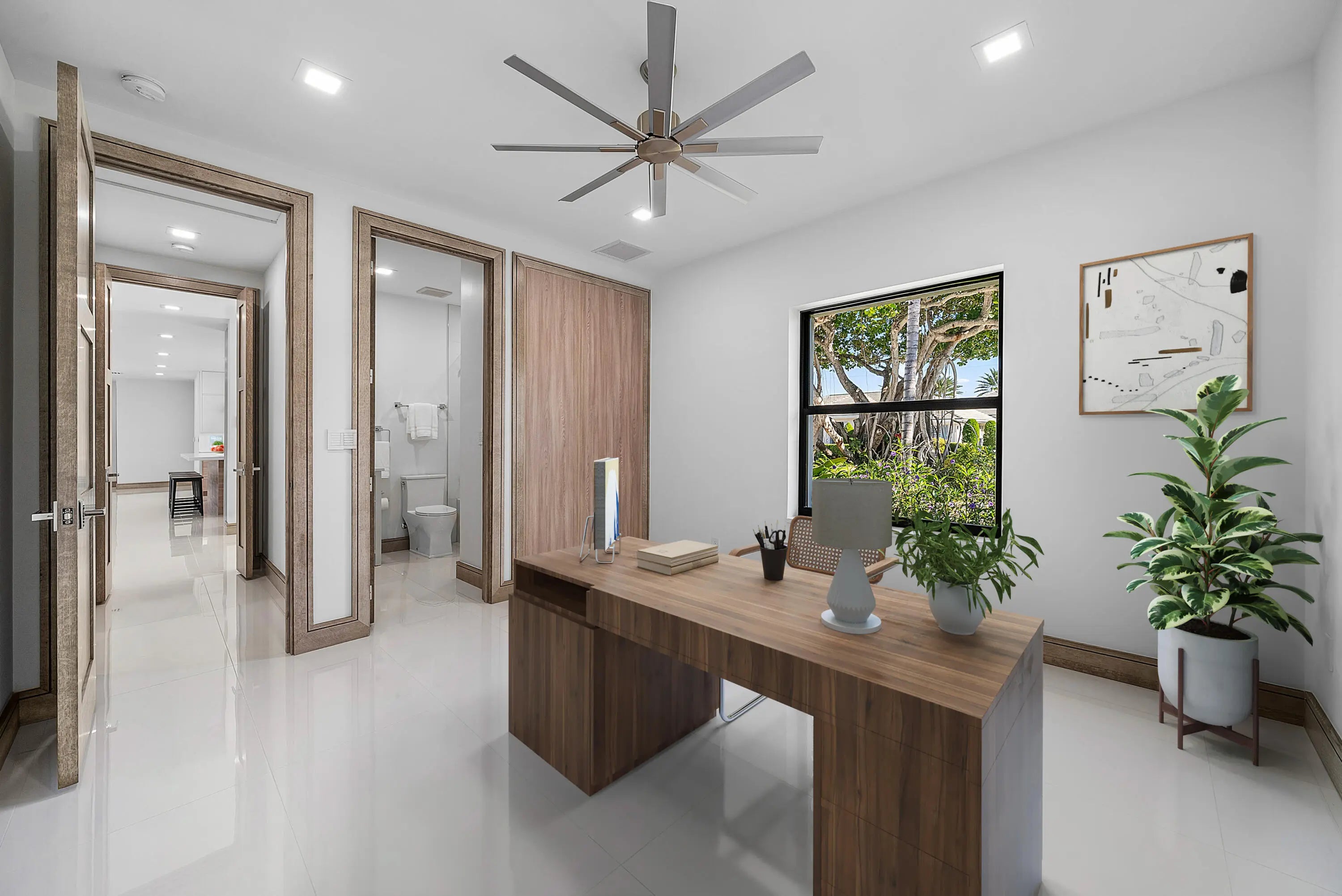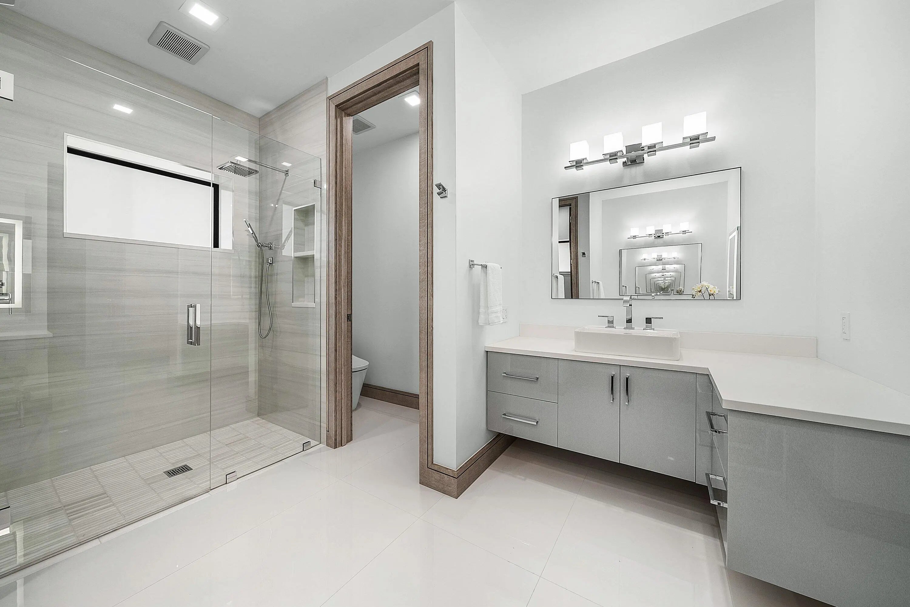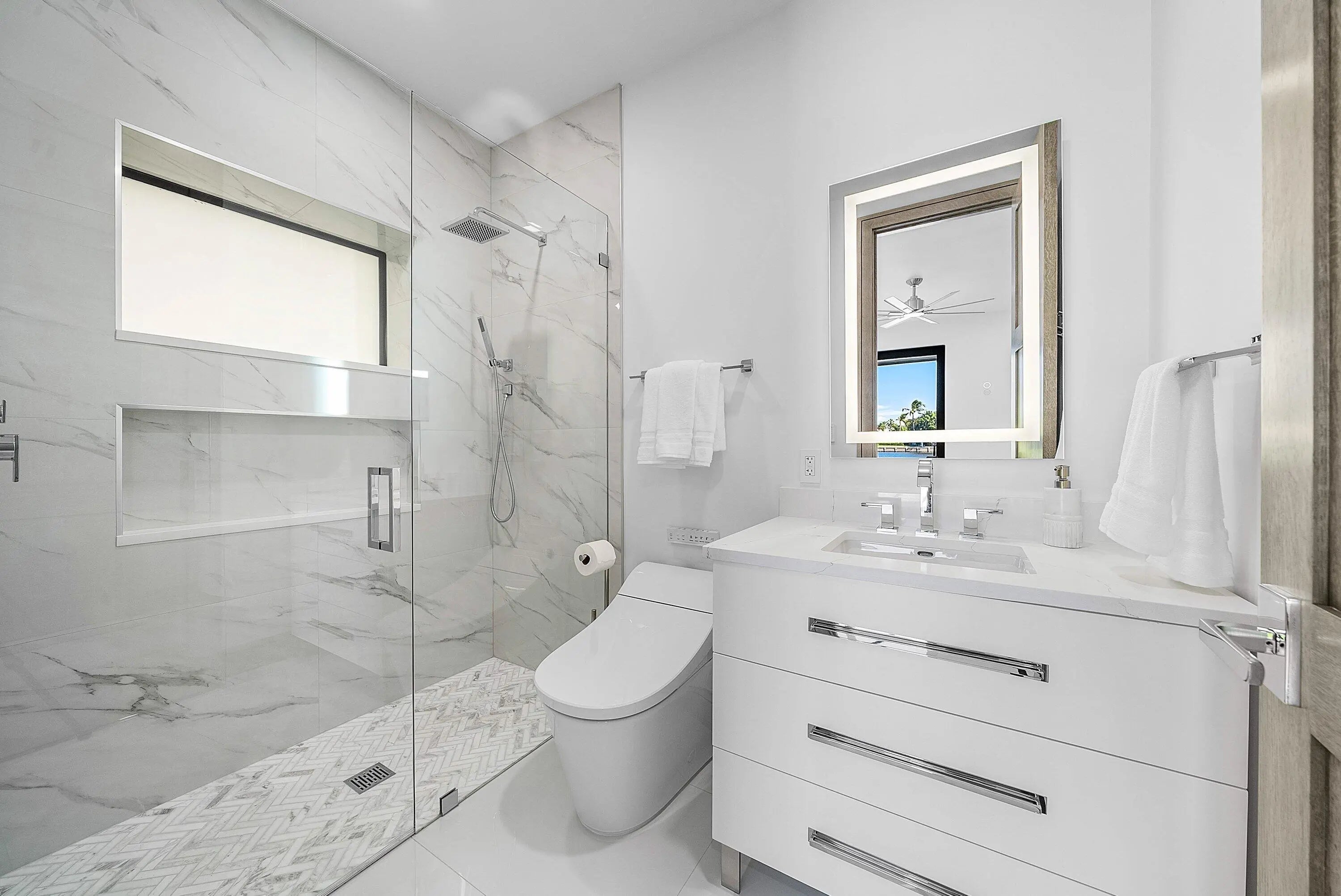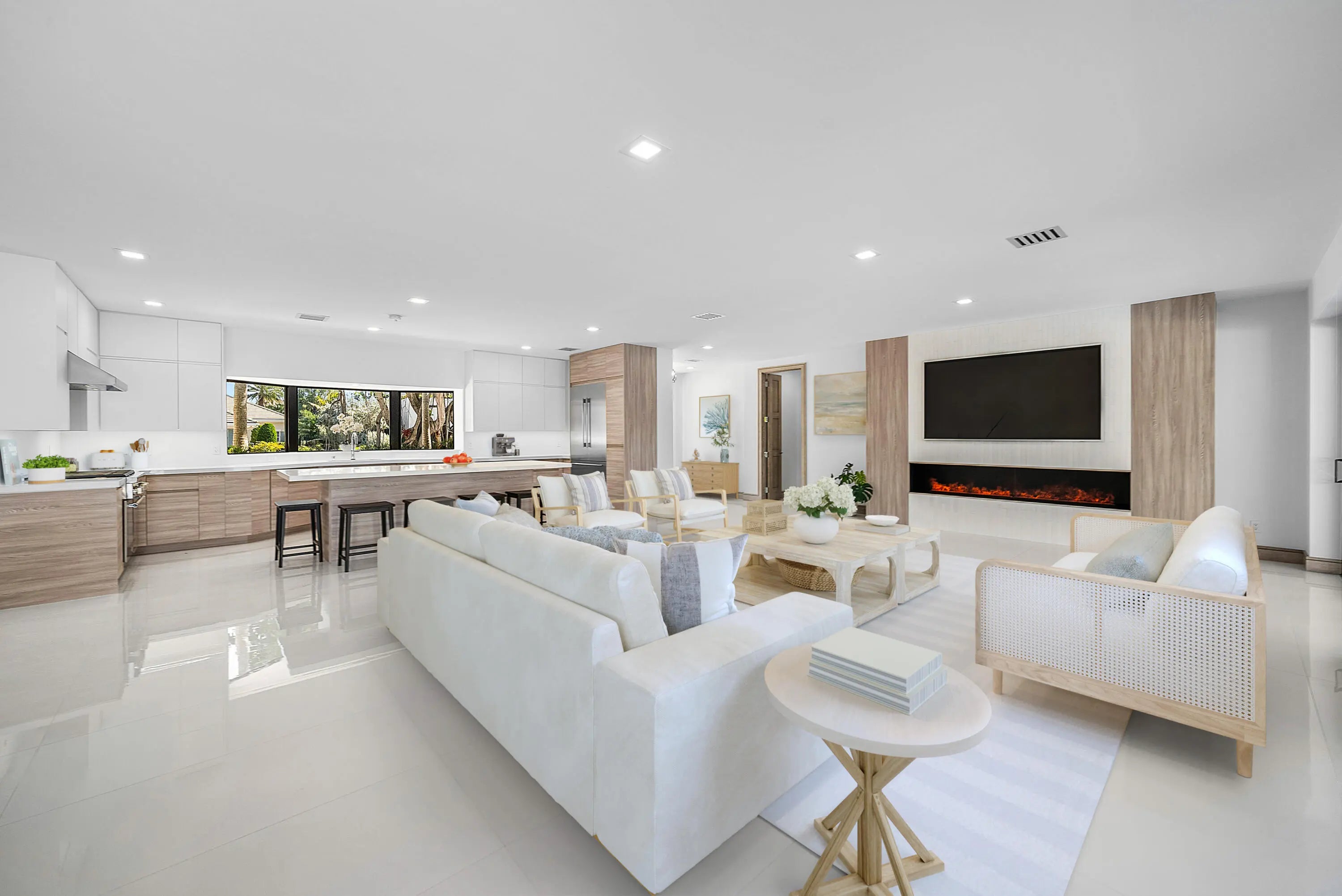 Just completed and rarely available is this exquisitely rebuilt waterfront residence in the coveted, guard-gated community of Point Manalapan. Known for its privacy, security, and upscale lifestyle, Manalapan offers an exclusive island setting unlike anywhere else. This transitional modern home has undergone a meticulous, multi-year, ground-up renovation, delivering the finest in turn-key luxury living. Everything about this extraordinary home is BRAND NEW! Including new high impact windows / doors, garage doors, roof, electrical, plumbing, appliances, HVAC, hot water, interiors/exteriors, pool, hardscape/landscape, dock, and more.With over 4,000 total square feet, the home features 4 bedrooms, 4.1 baths, a stunning heated saltwater pool overlooking the water