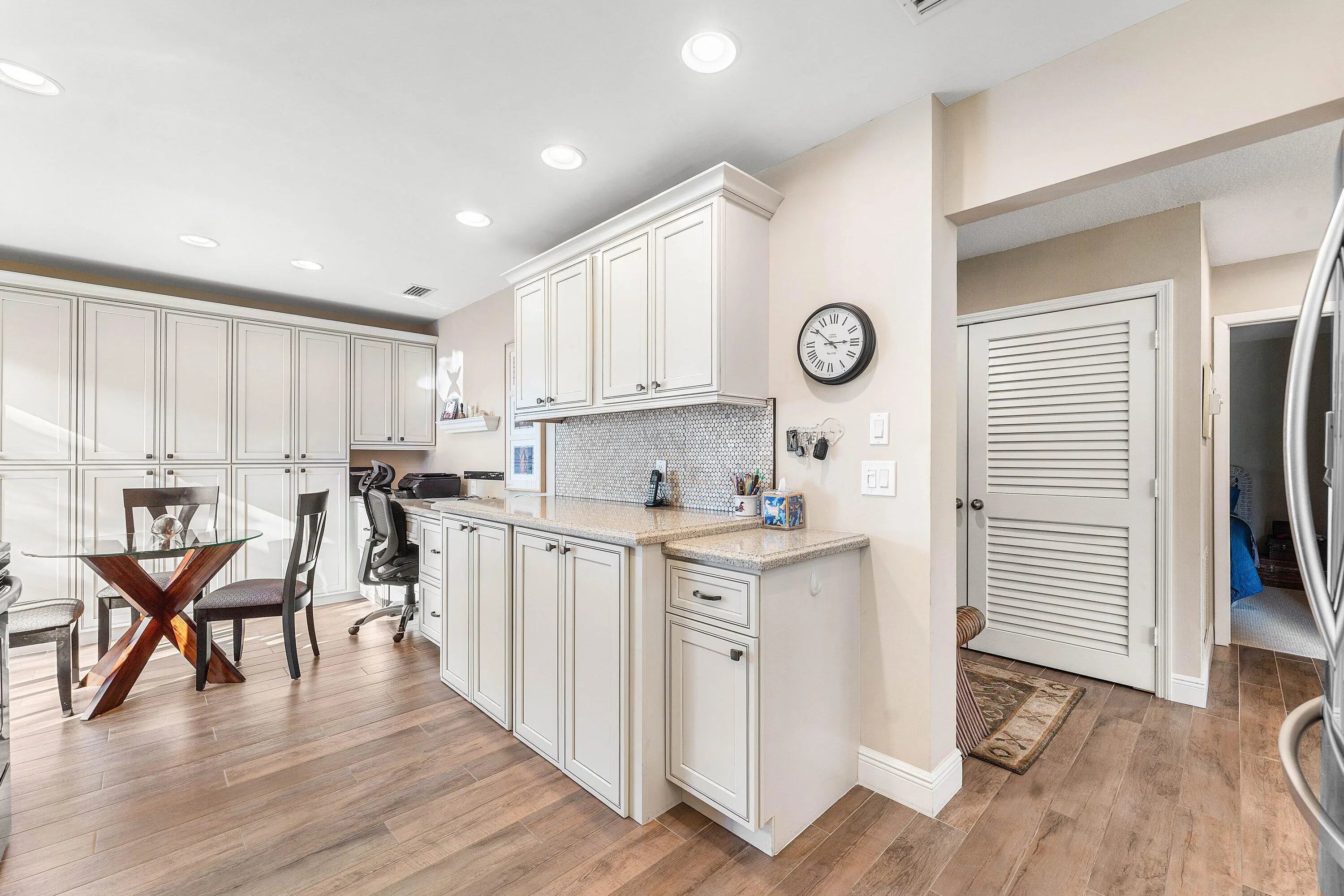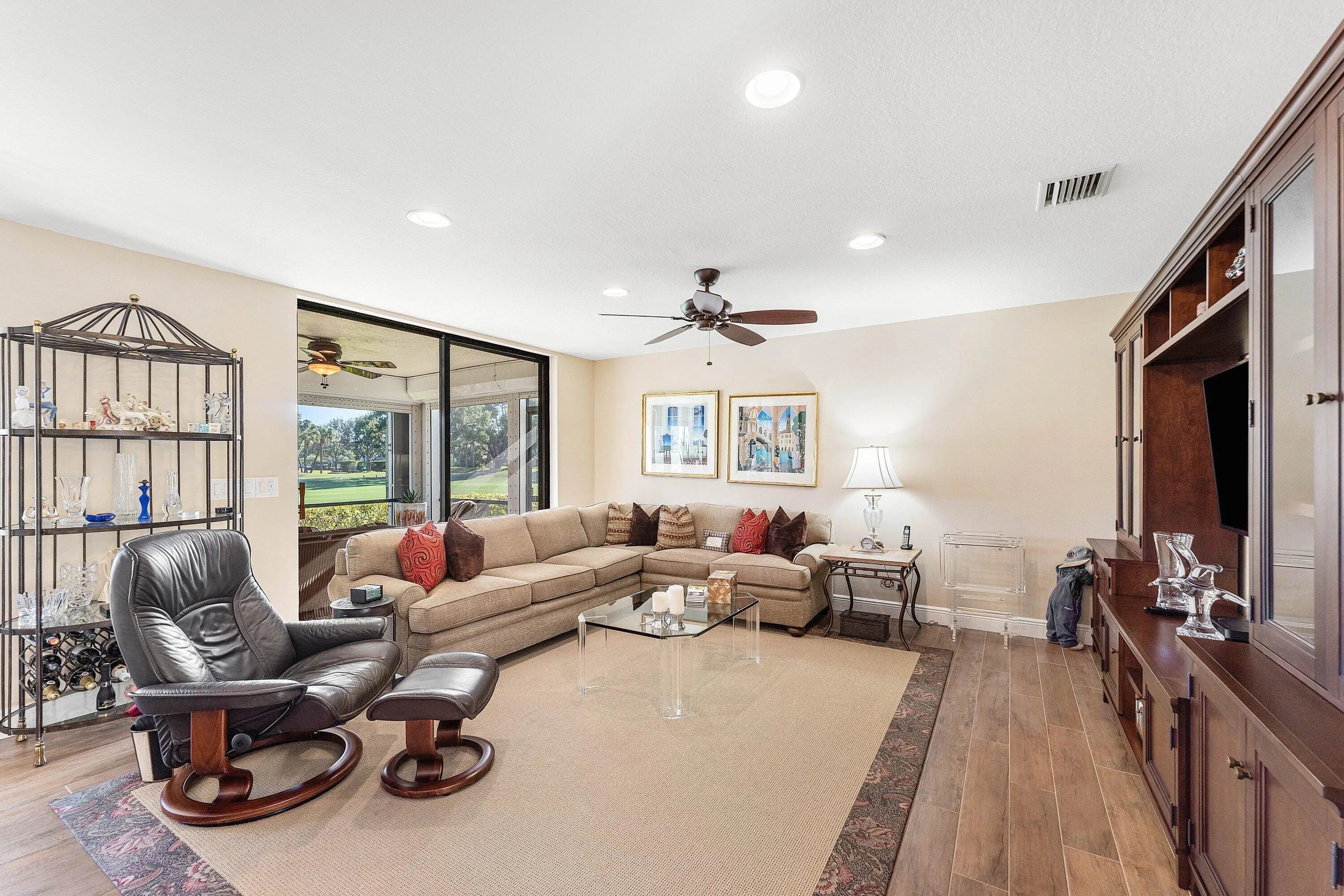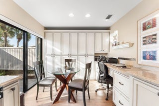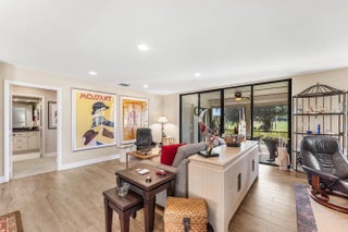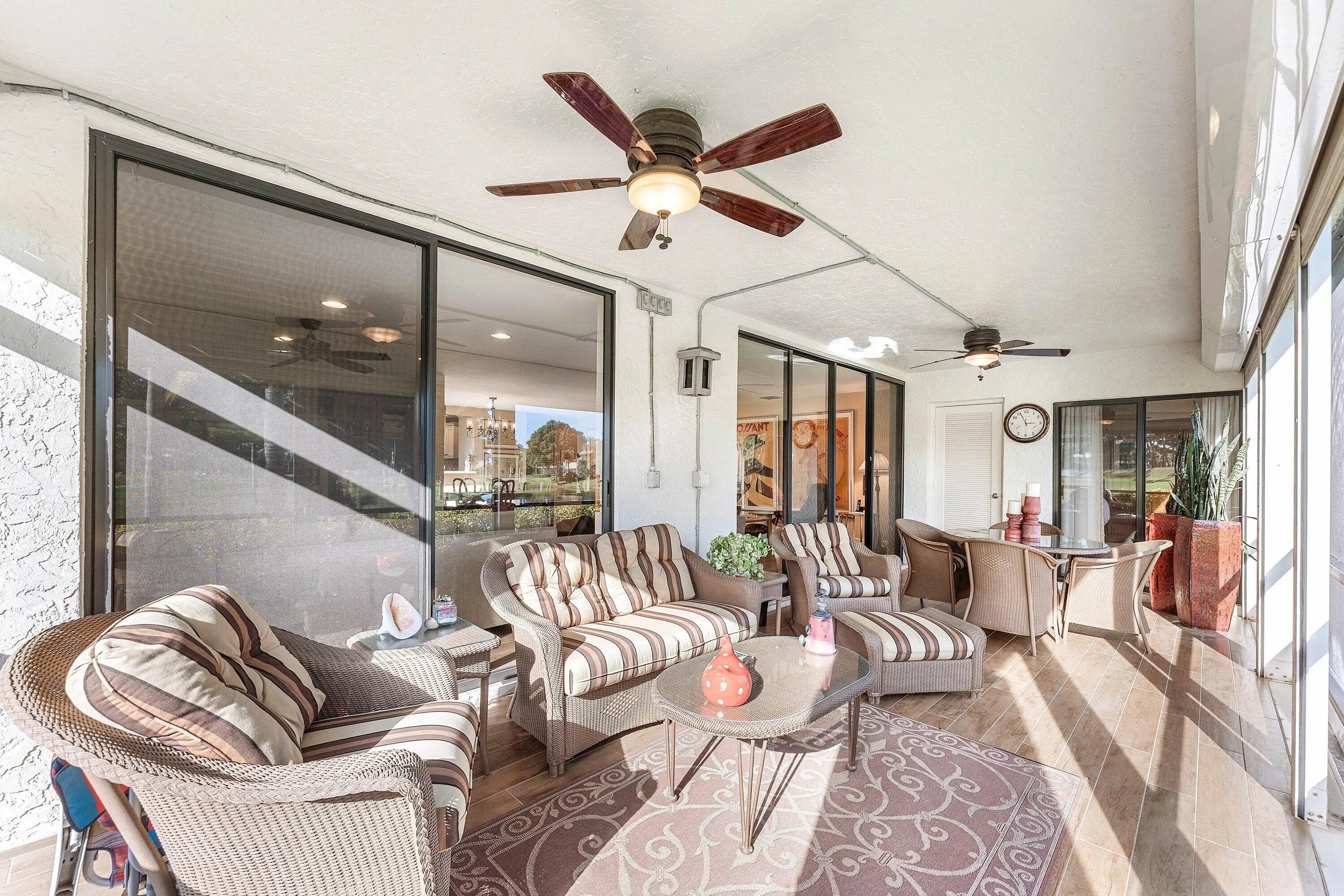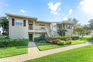Move-in ready luxury in Hunters Run Country Club! This remodeled first-floor corner condo in Eastgate offers stunning panoramic views of golf and water from nearly every room. Porcelain wood-look tile flows through the main living areas, complemented by plush, premium carpeting in both bedrooms. The updated eat-in kitchen boasts custom cabinetry, granite countertops, stainless steel appliances and front-loading washer and dryer. The sun-filled living and dining areas open to a flexible den, easily converted to a third bedroom or private office. Enjoy indoor-outdoor living on the extended screened lanai overlooking the water and golf course, plus an open-air side patio perfect for outdoor dining or parking your golf cart. The Eastgate pool and clubhouse are just steps from your front door!