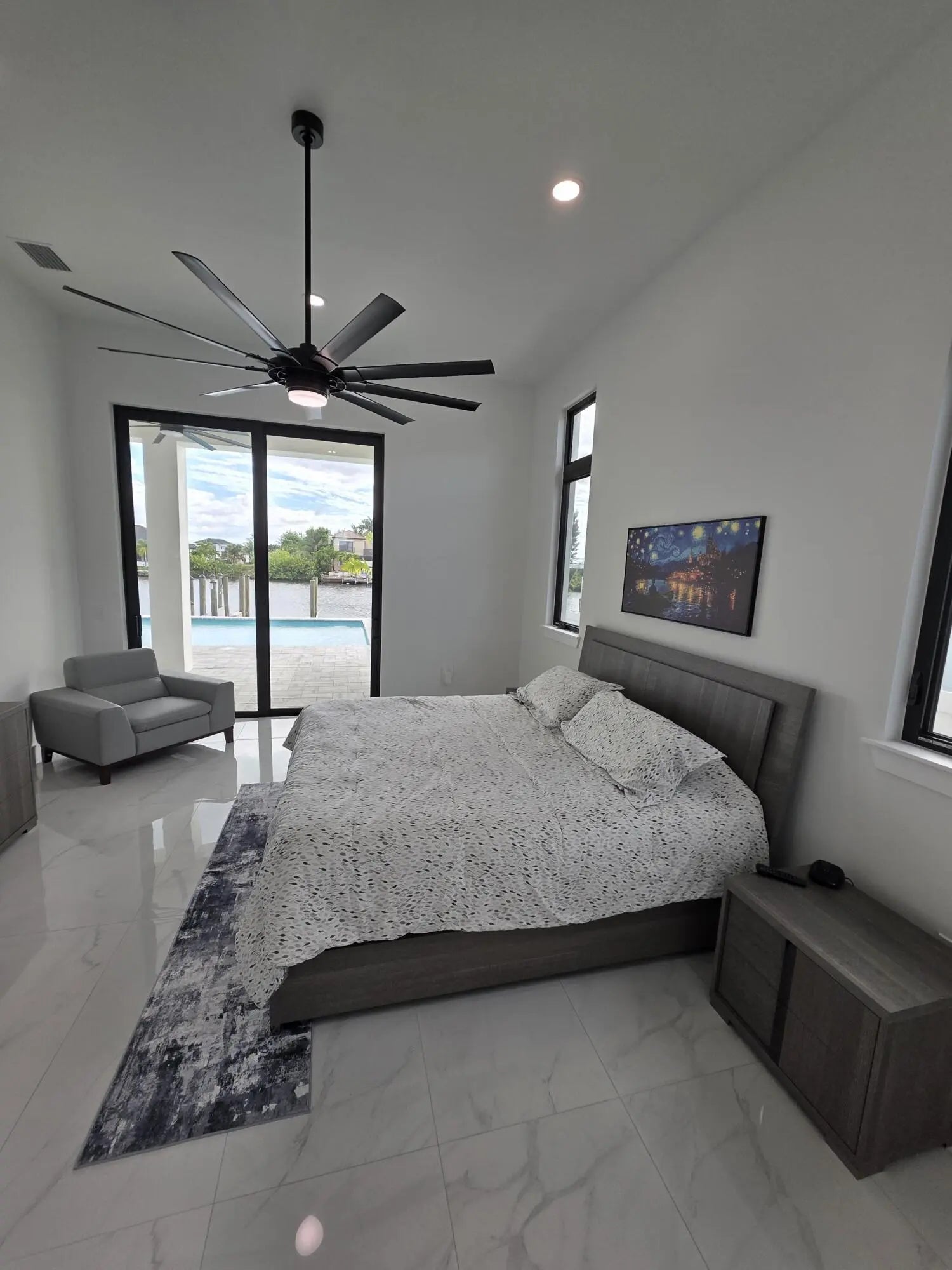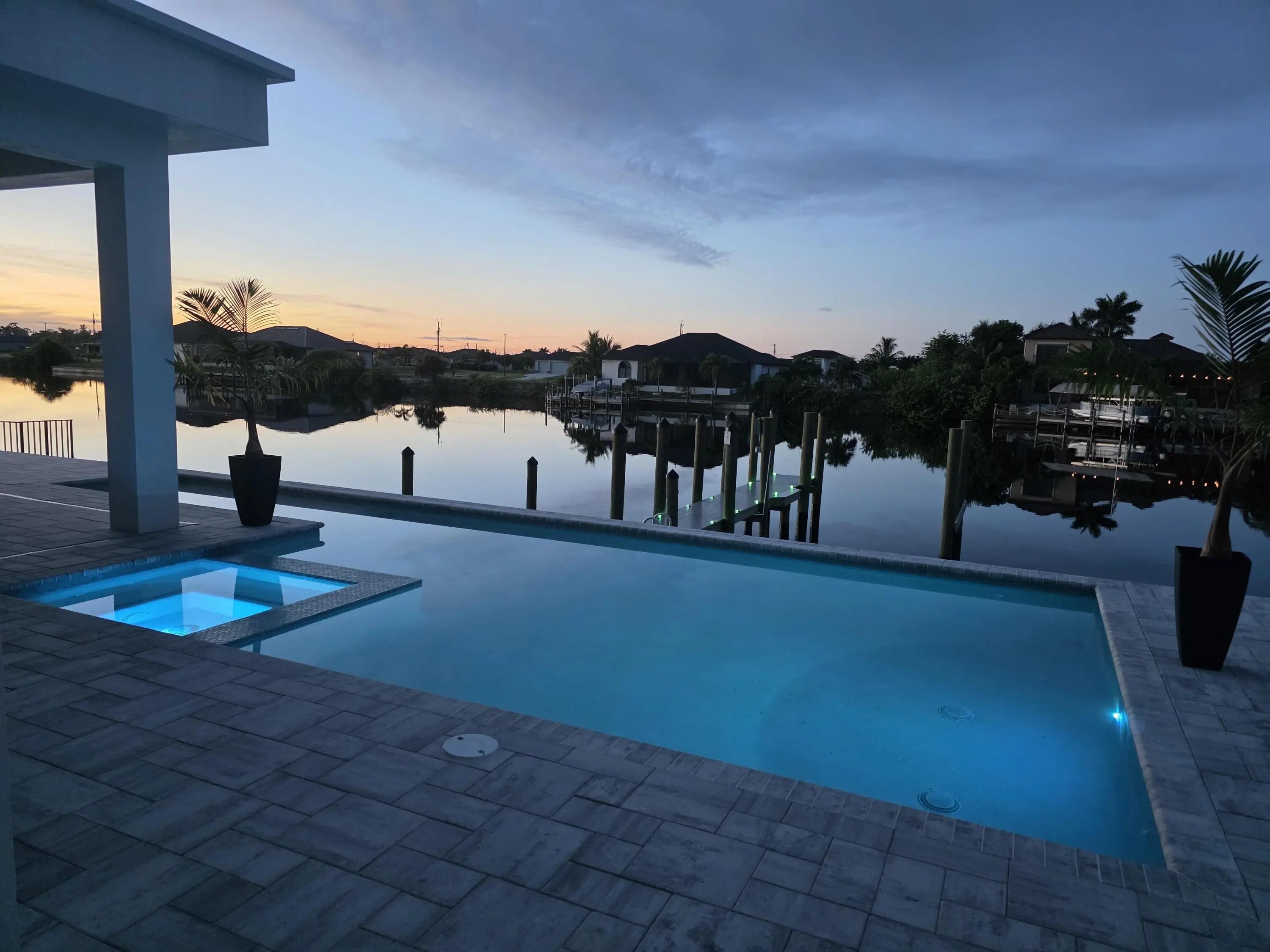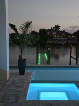 NEW CONSTRUCTION one-of-a-kind custom-designed home, not a builder's model. Featuring 3 bedrooms, 3 bathrooms, and a versatile den or office that can be used as a permitted fourth bedroom. The home overlooks a 260-foot-wide south-facing canal with no bridges to the Gulf. Dock with 2 slips. Inside, the home offers 2,653 sf of A/C space with a total of 4165sf under roof. 14ft. soaring ceilings and 10-foot impact sliders that lead to a nearly 800 square foot covered lanai. The outdoor space includes a summer kitchen, bar, and a large fully automated saltwater pool with custom spa and sun shelf, all controllable from your phone.The primary suite features a spa-inspired bath with dual vanities, seven-foot LED backlit mirrors, a soaking tub, and a double-entry his and her shower. Throughout