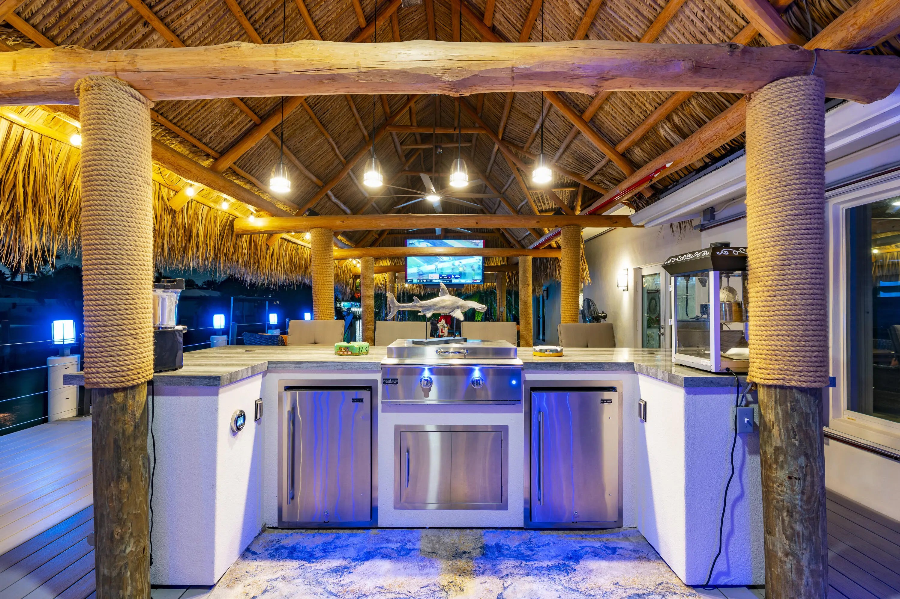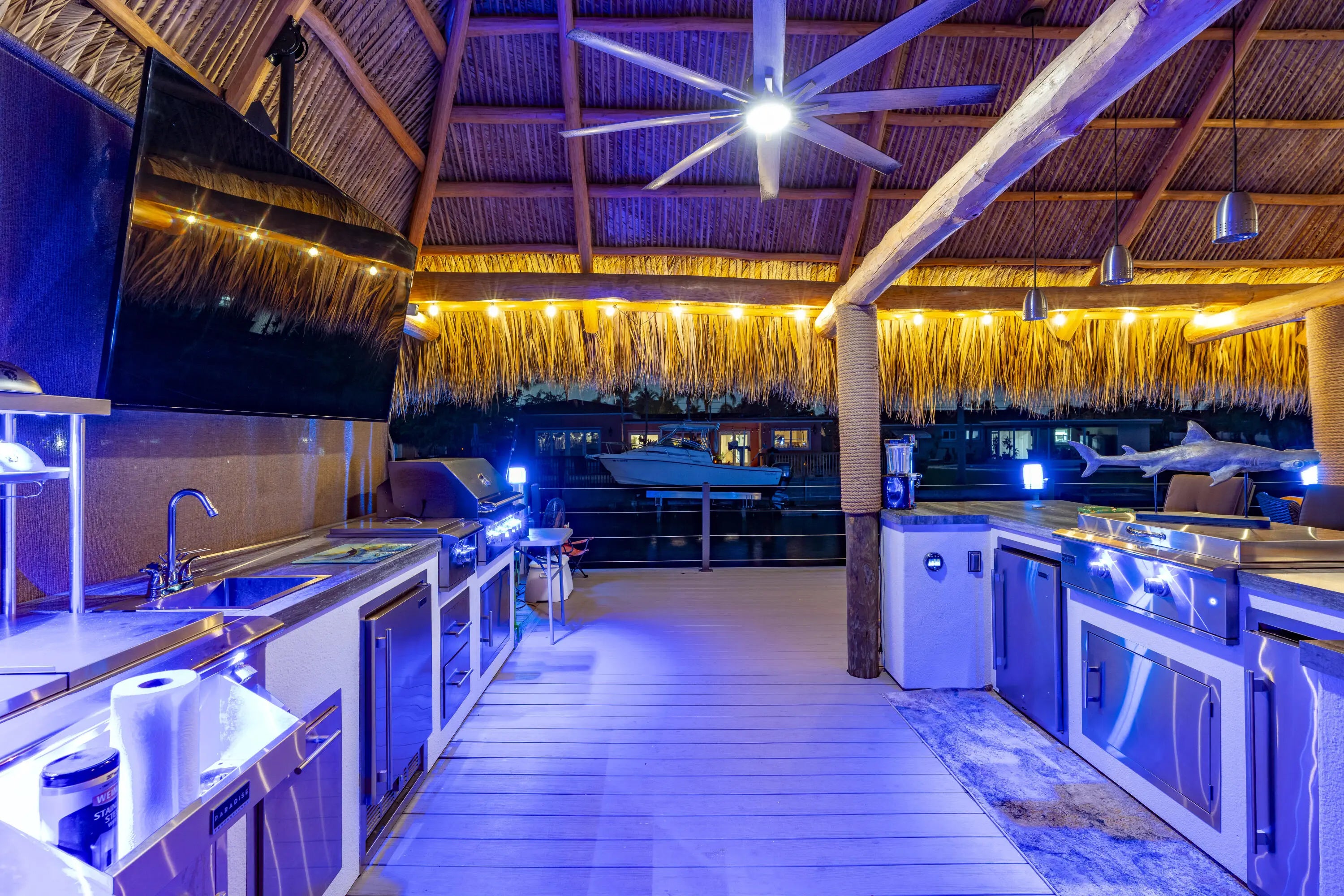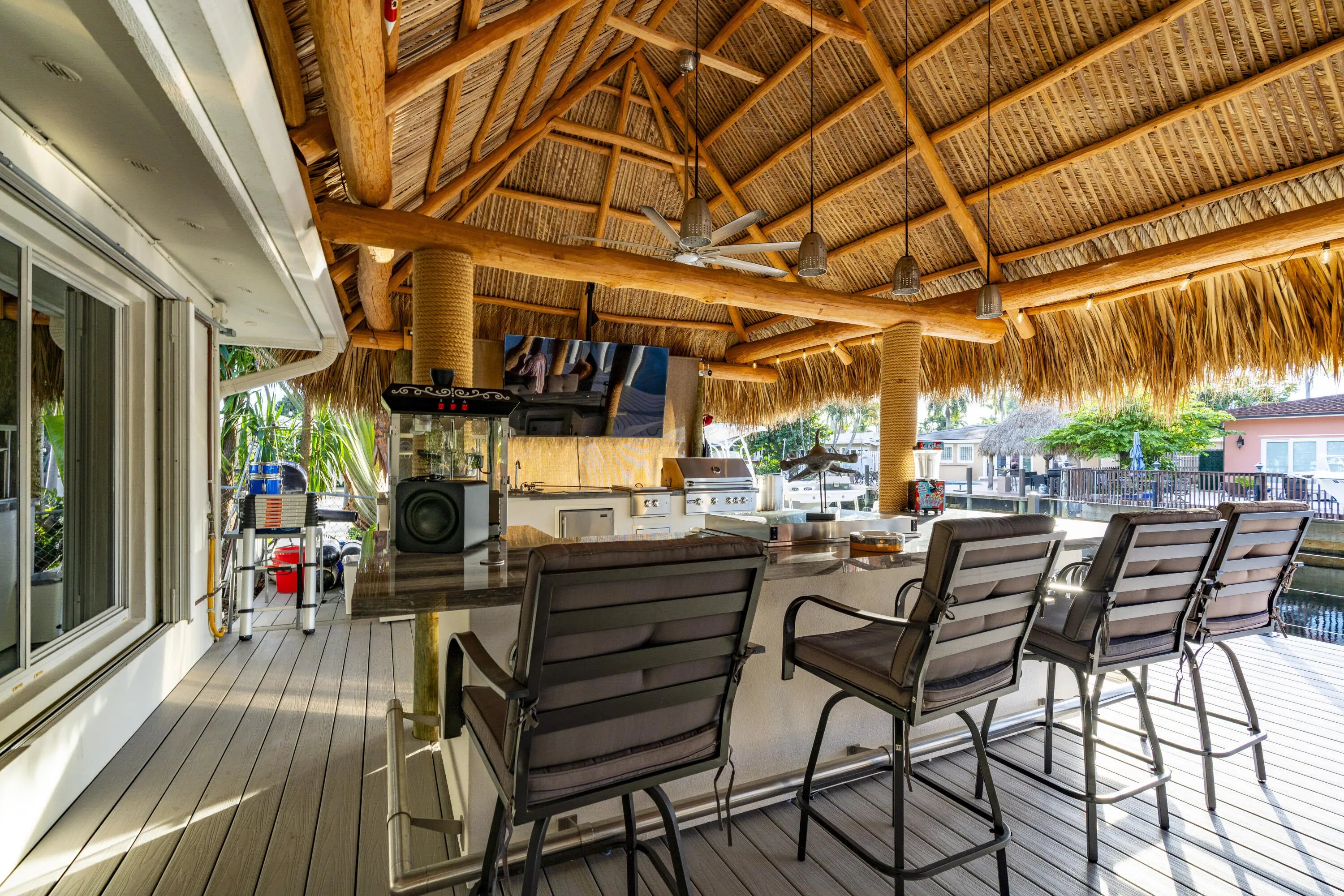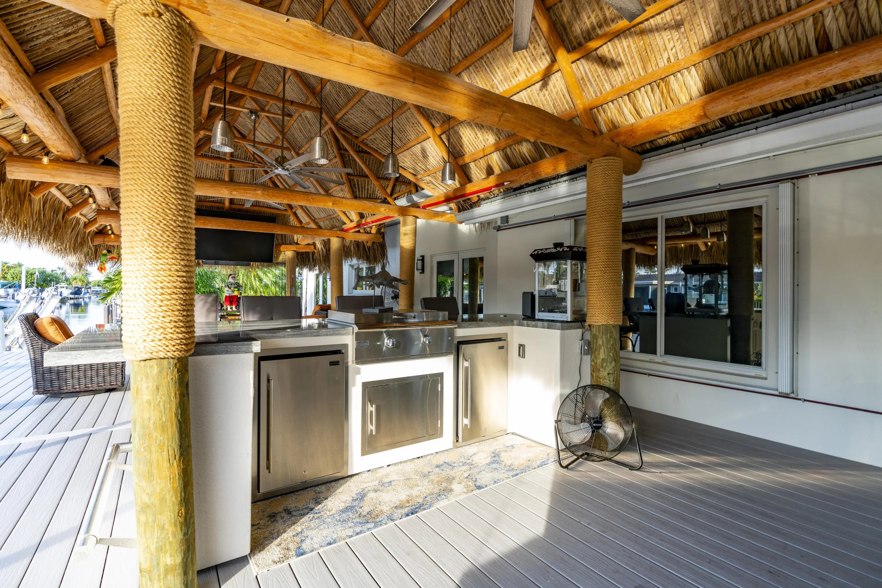 Built-in Grill, Covered Patio, Custom Lighting, Deck, Open Patio, Shutters, Summer Kitchen