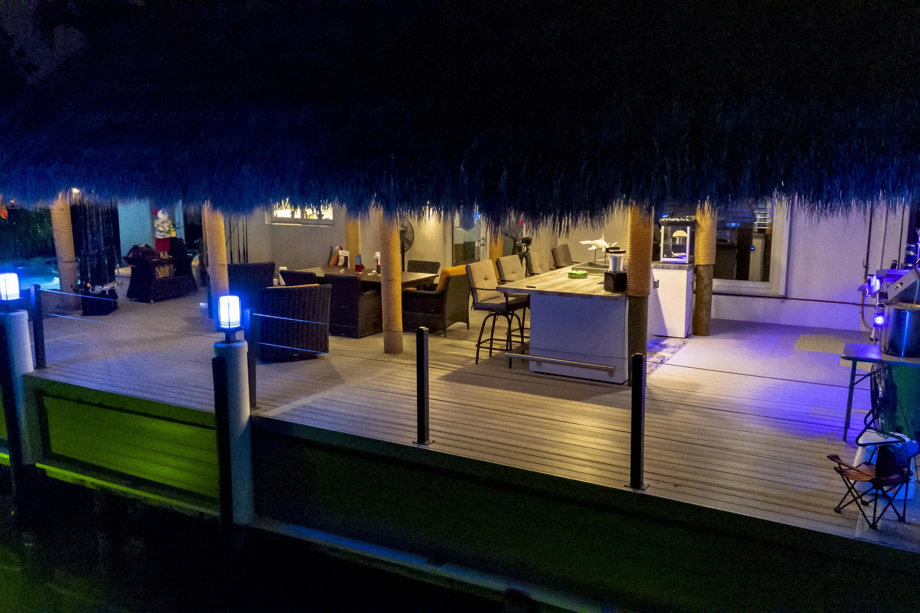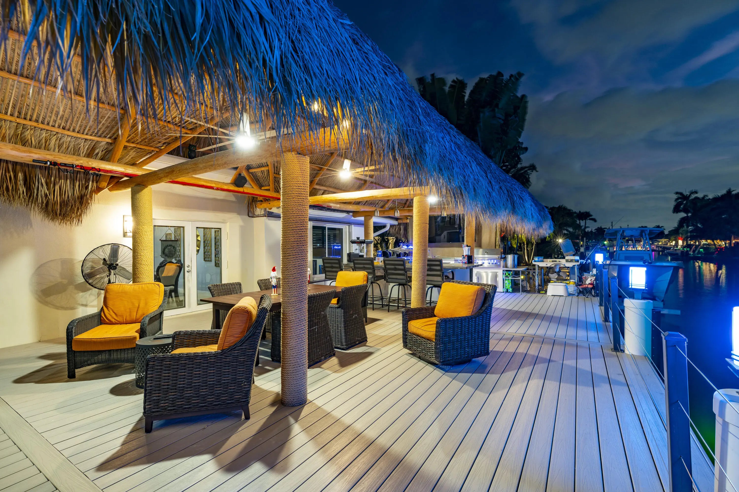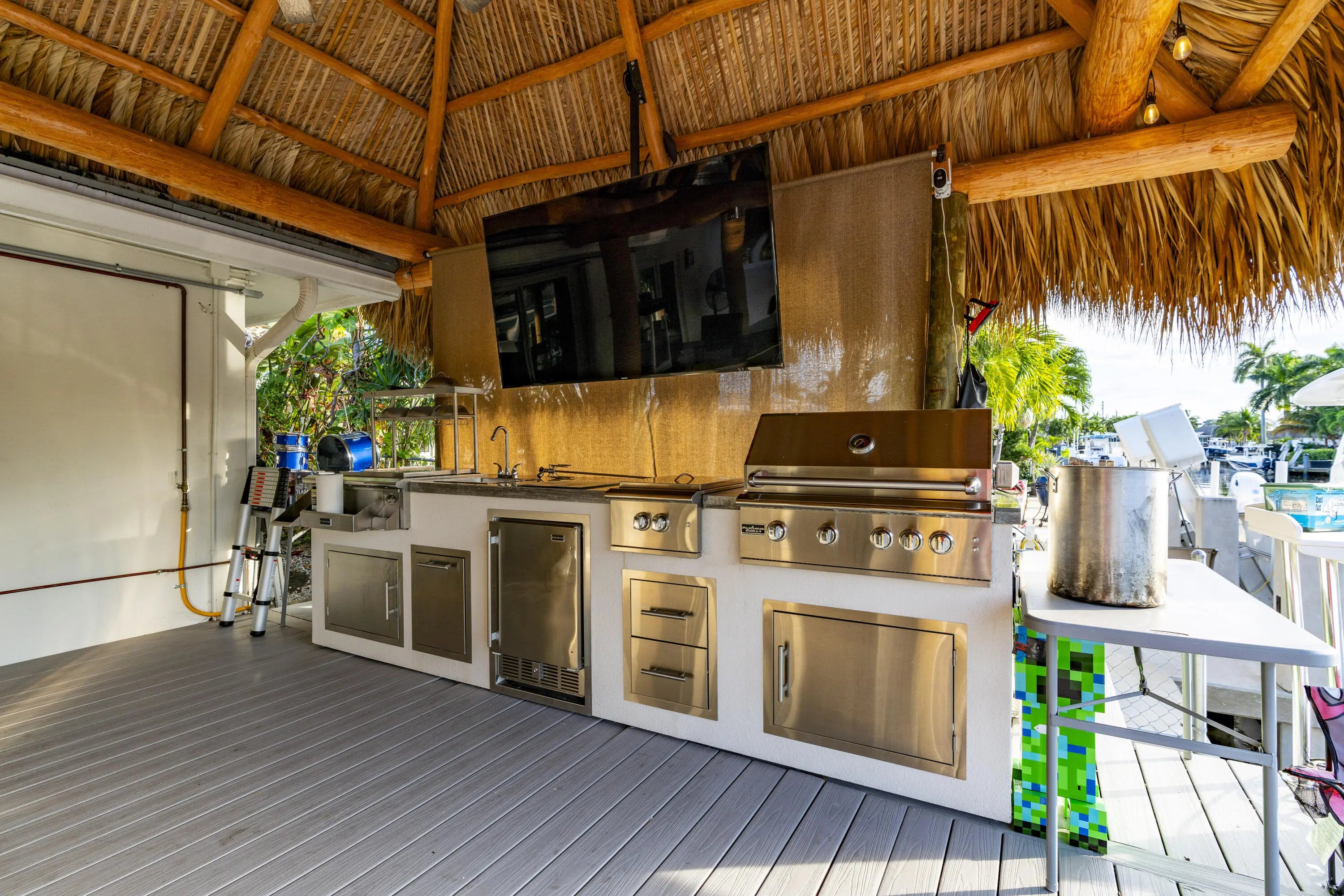 Built-in Grill, Covered Patio, Custom Lighting, Deck, Open Patio, Shutters, Summer Kitchen
