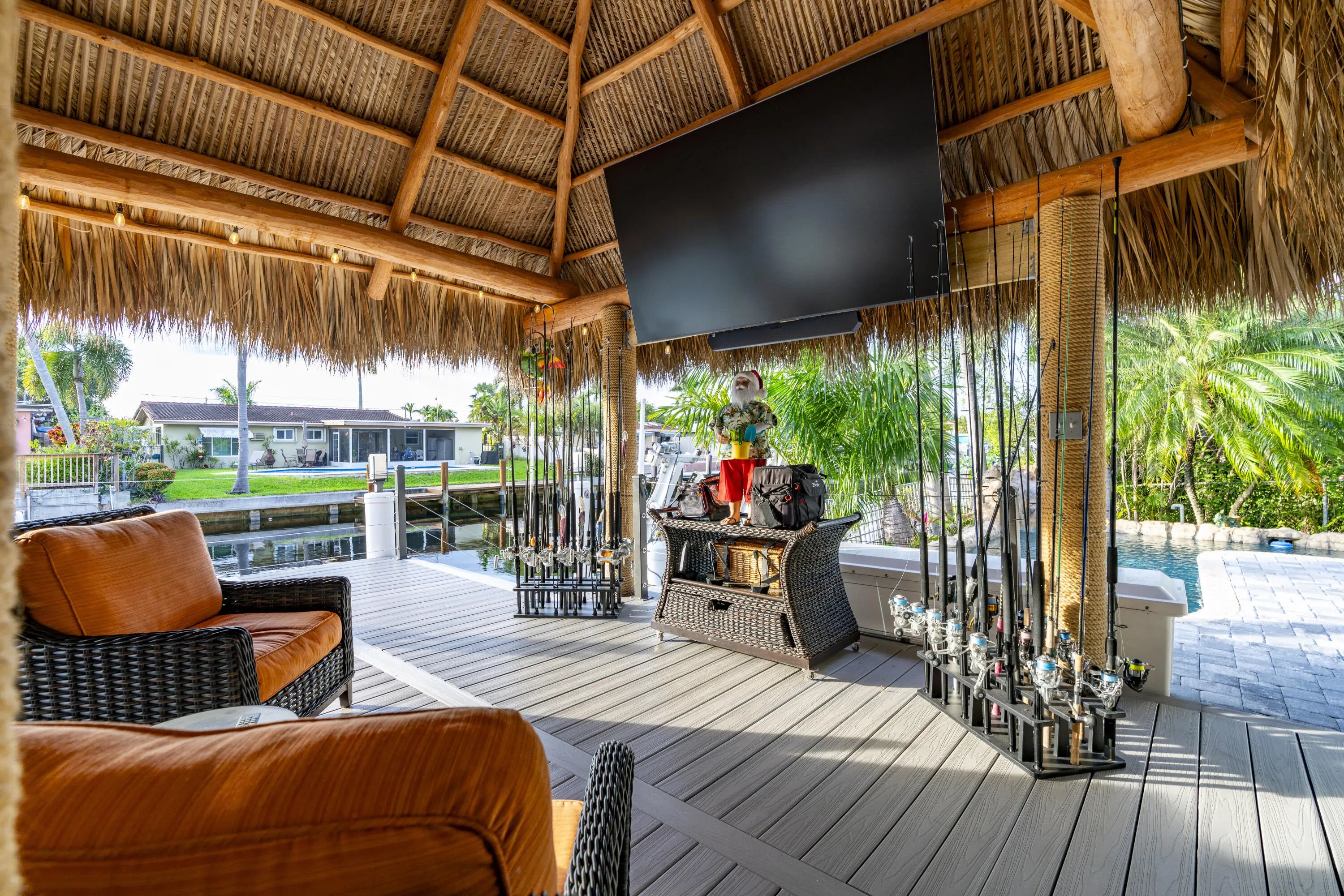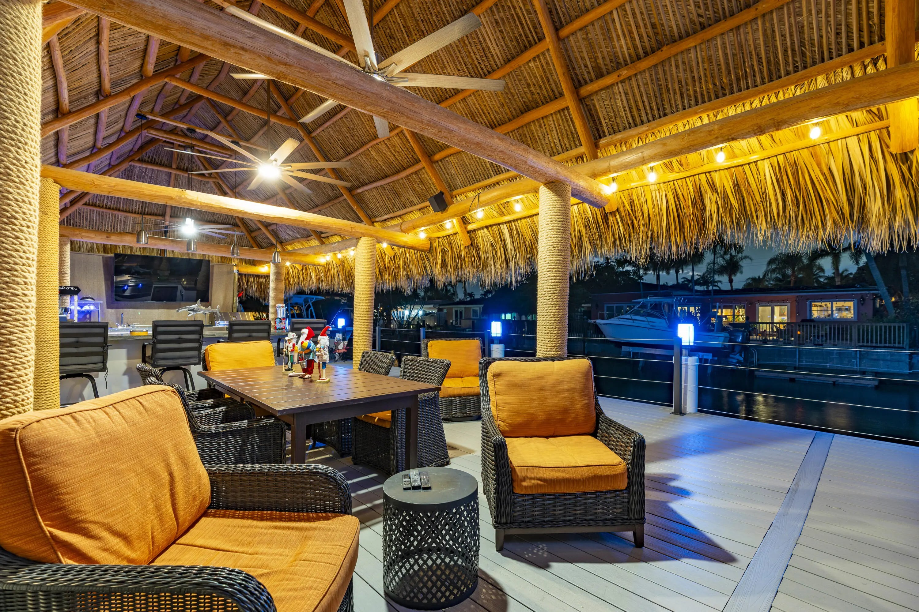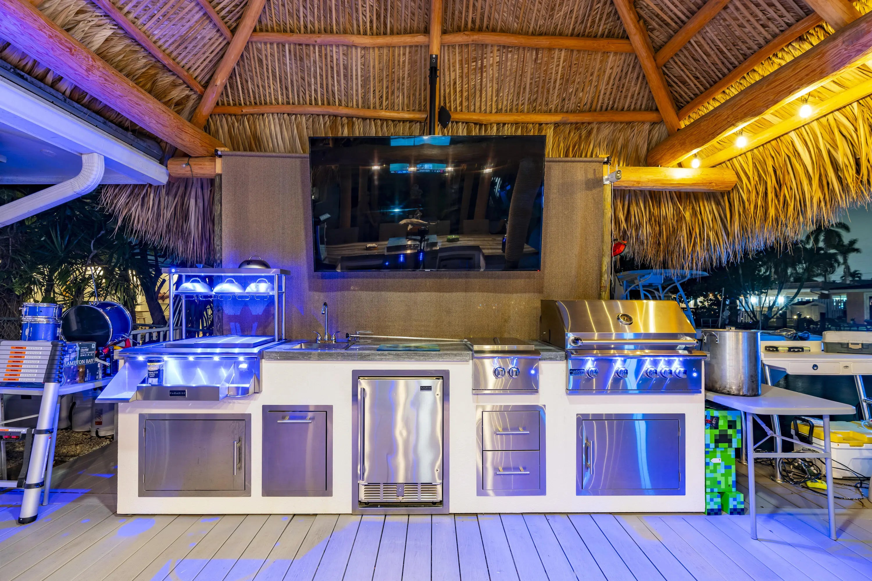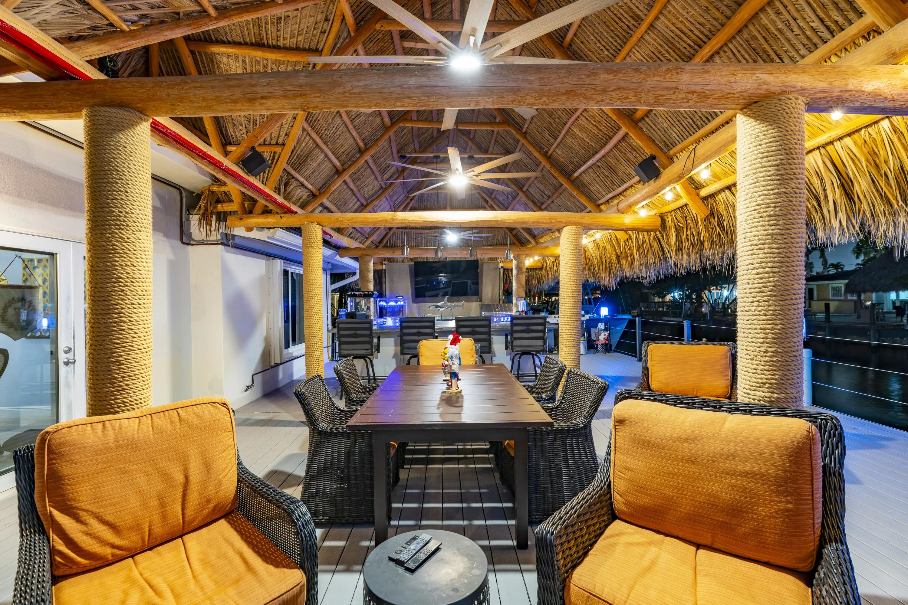 Built-in Grill, Covered Patio, Custom Lighting, Deck, Open Patio, Shutters, Summer Kitchen