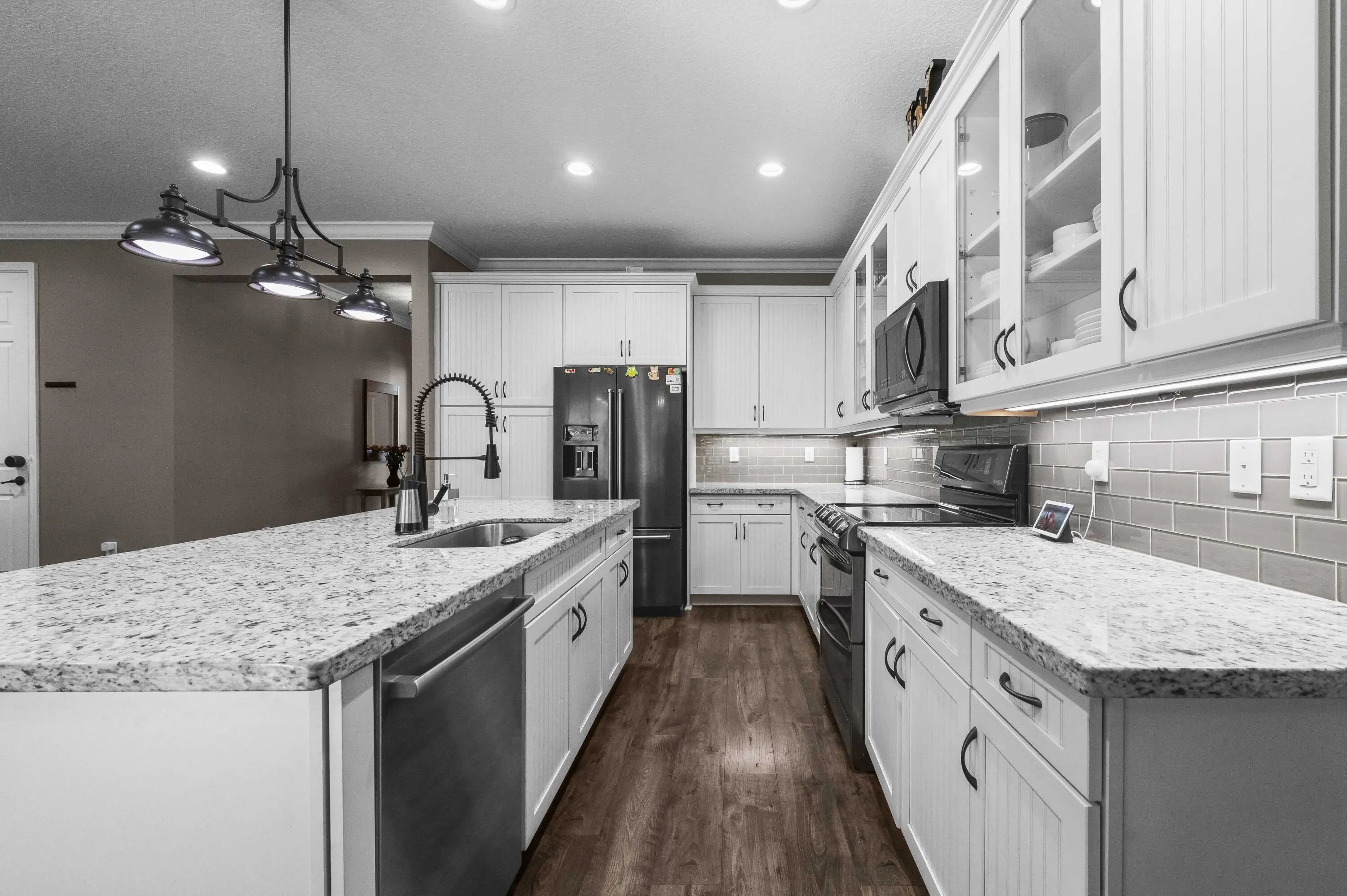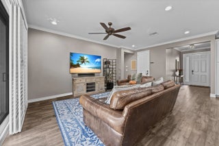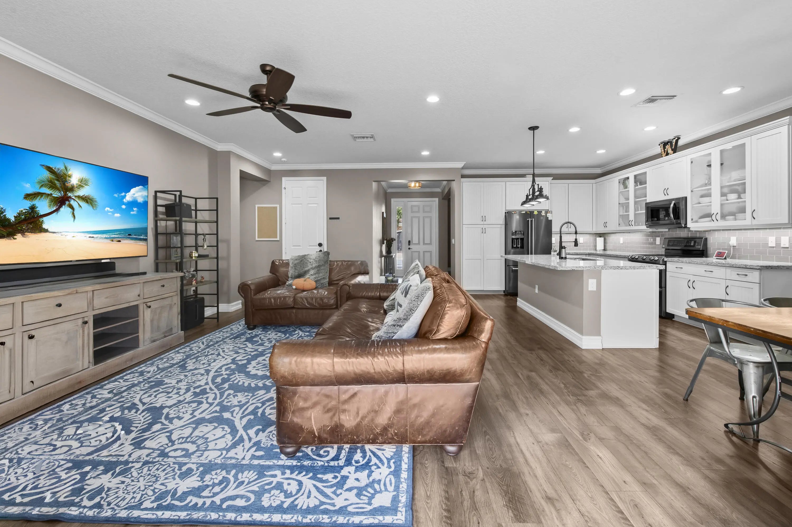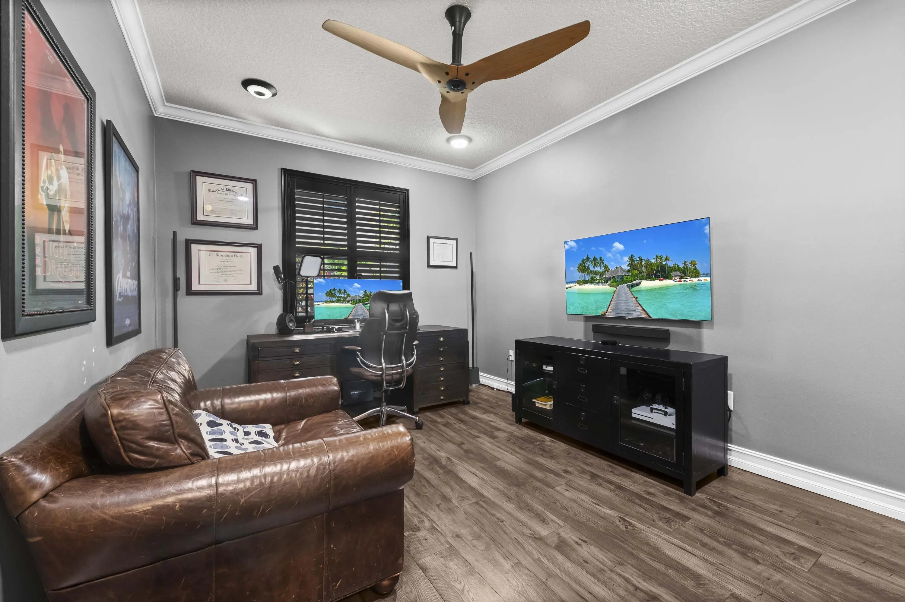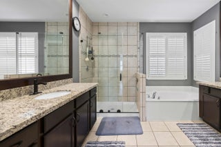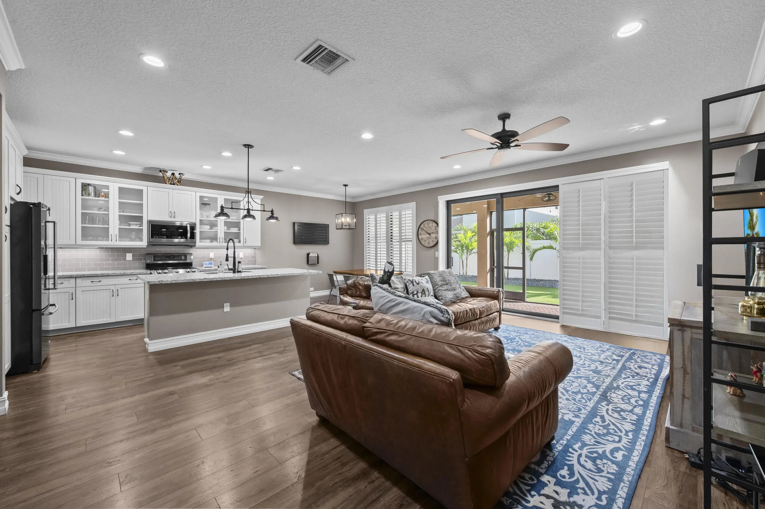 Experience the perfect convergence of luxury and sustainability in this stunning two-story residence, with 4 bedrooms, den/office, second story loft and 4 full bathrooms and a garage fully equipped with a Tesla wall charger. Fully paid off solar panels too! Step through the door to discover a meticulously designed interior featuring handsome wood-look flooring, elegant crown molding, and plantation shutters that filter natural light throughout the open-concept floor plan. The heart of the home is the gourmet kitchen, a culinary masterpiece equipped with crisp white cabinetry with glass-front uppers, gleaming granite countertops, a grey subway tile backsplash, and a massive center island that overlooks the spacious family room--perfect for effortless entertaining.