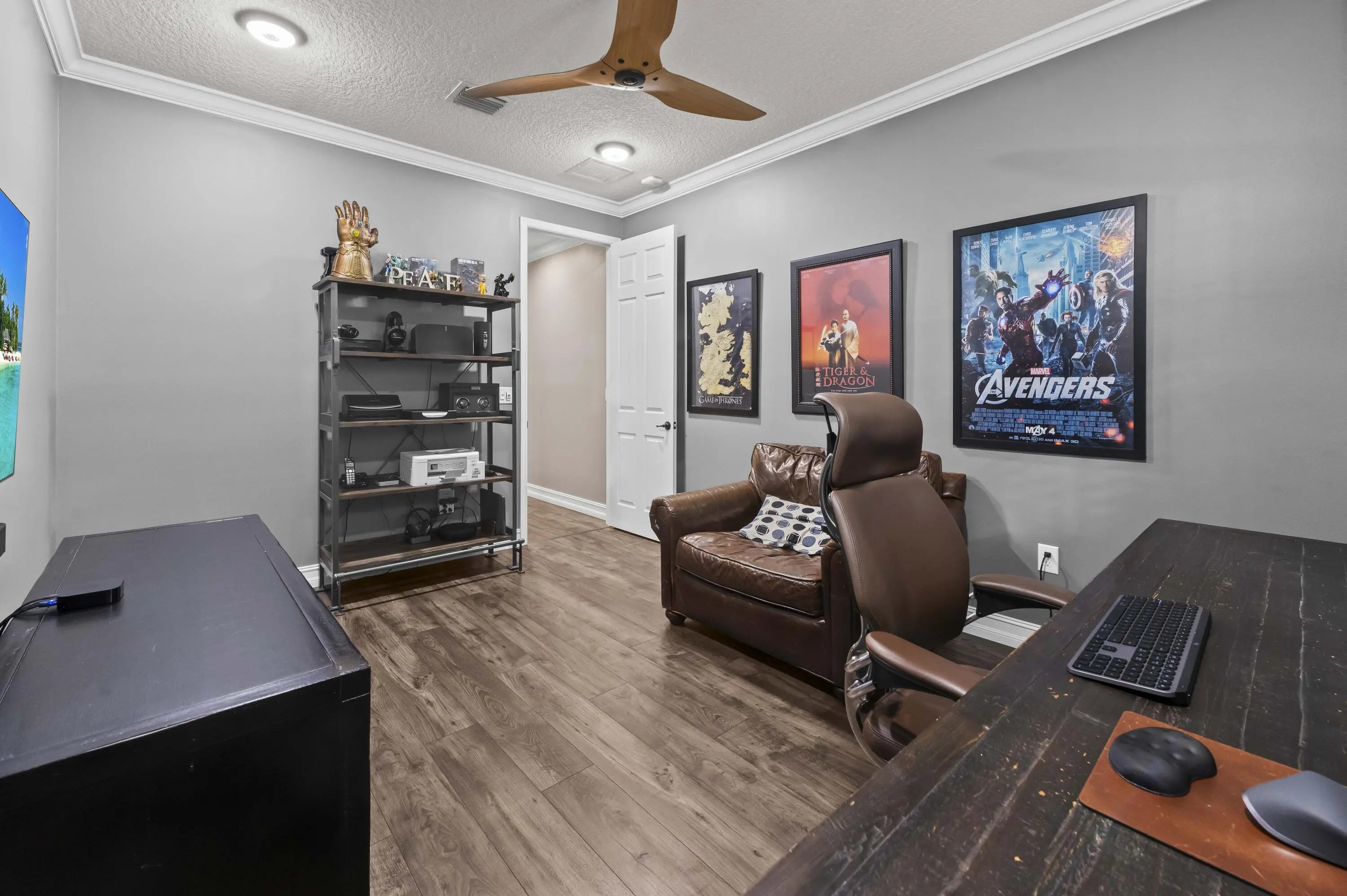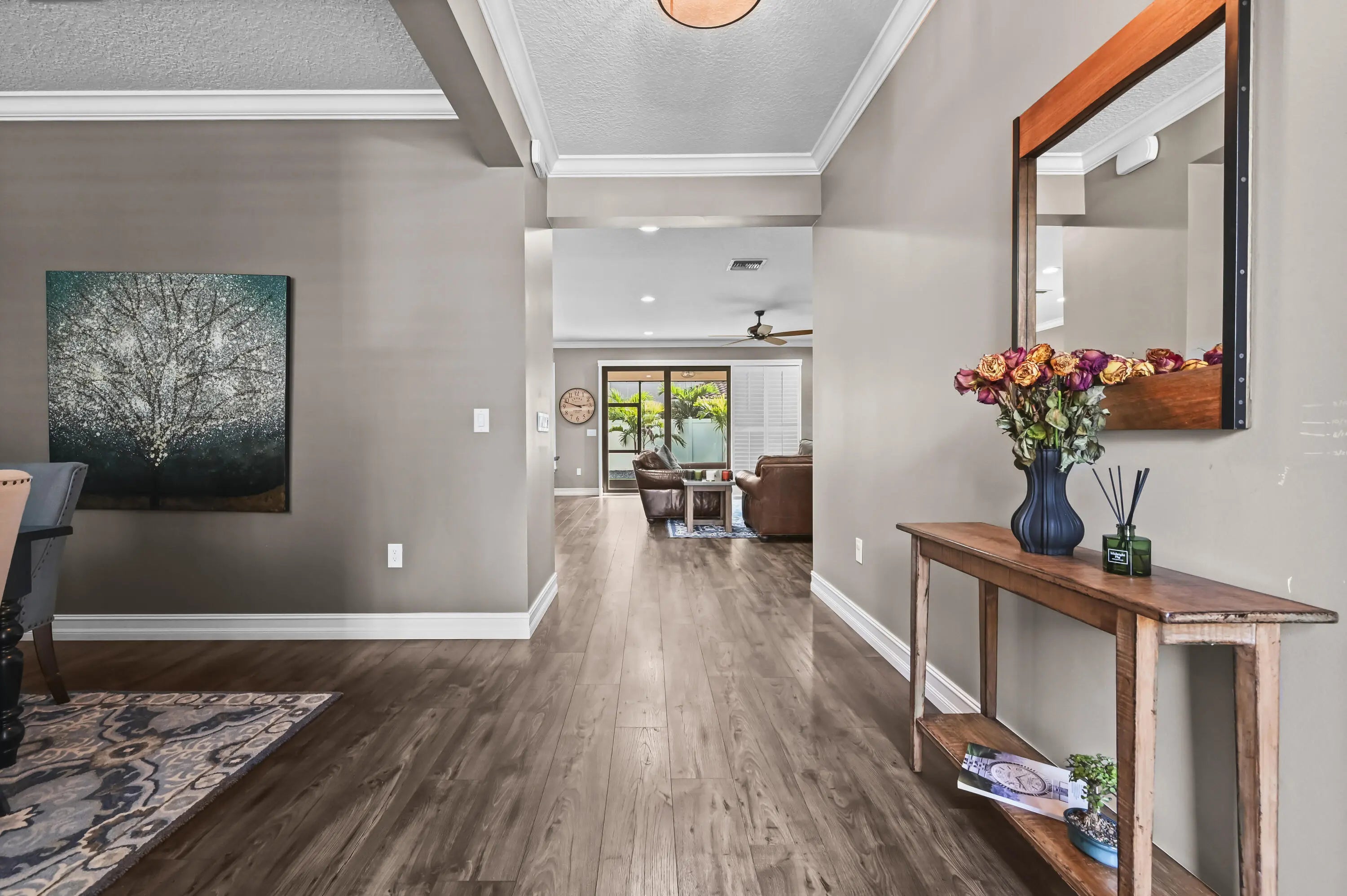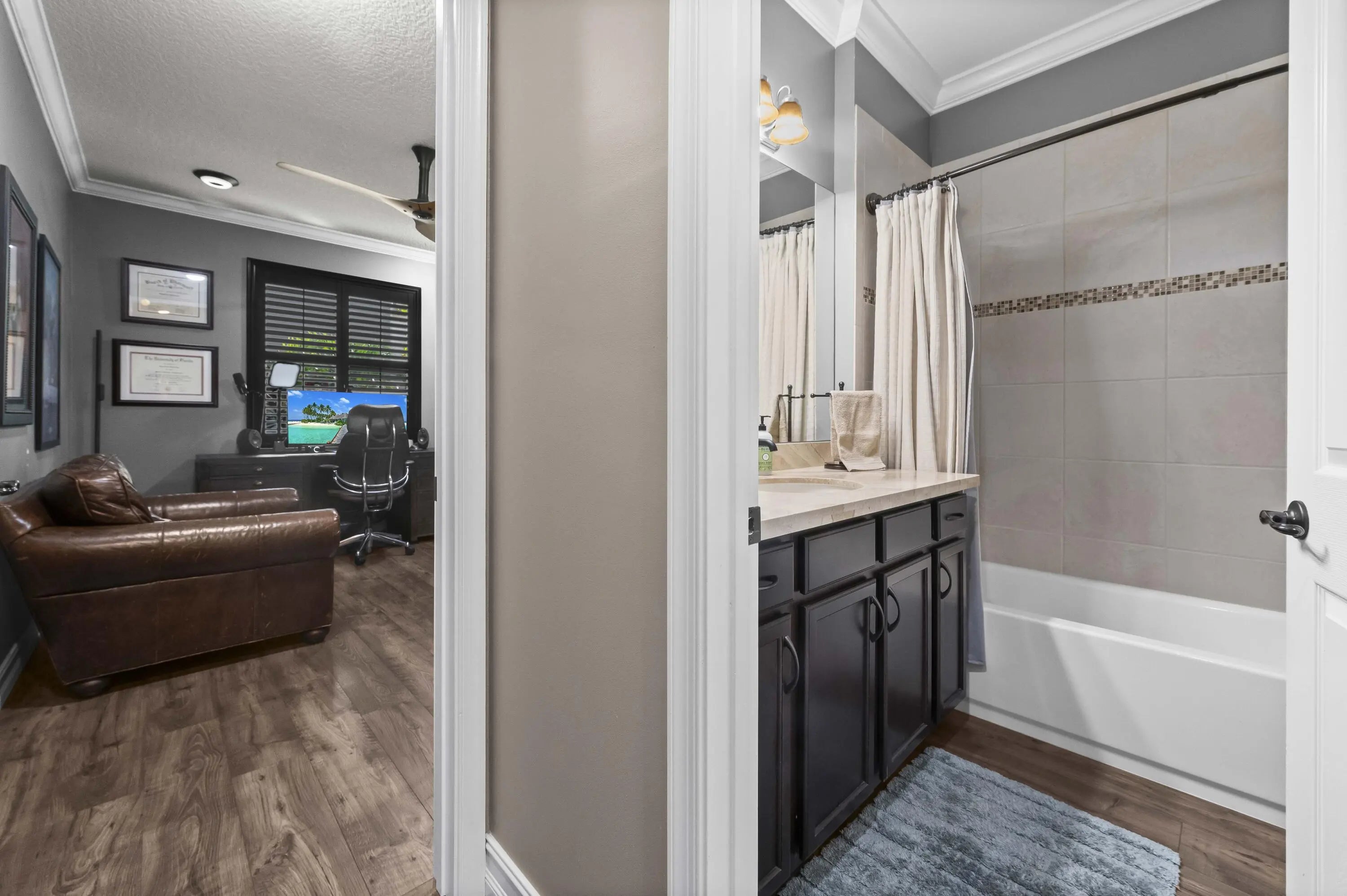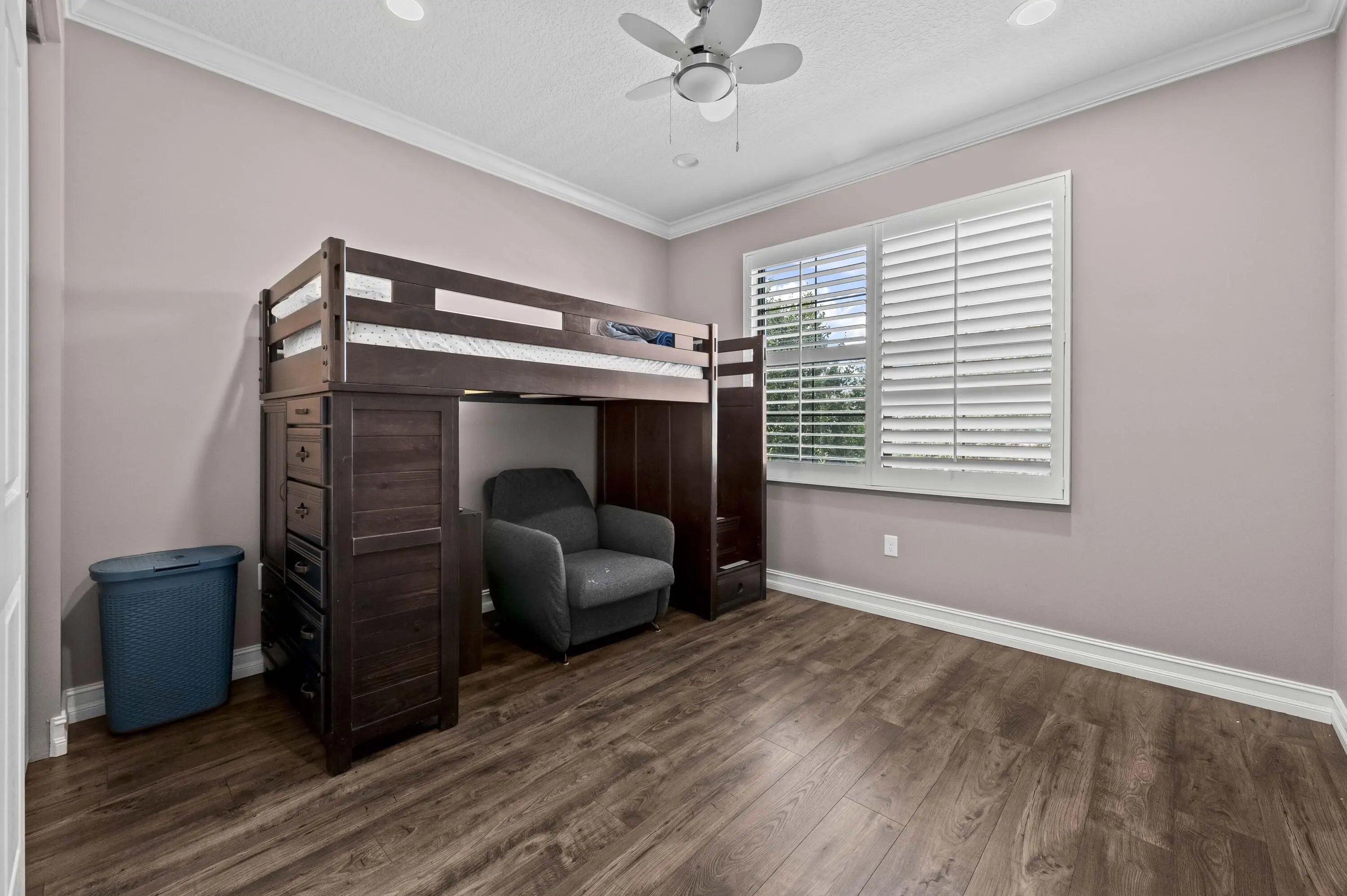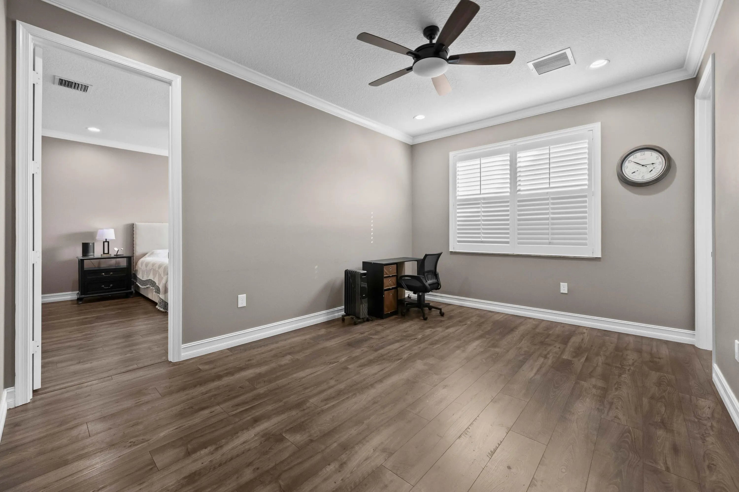 Experience the perfect convergence of luxury and sustainability in this stunning two-story residence, with 4 bedrooms, den/office, second story loft and 4 full bathrooms and a garage fully equipped with a Tesla wall charger. Fully paid off solar panels too! Step through the door to discover a meticulously designed interior featuring handsome wood-look flooring, elegant crown molding, and plantation shutters that filter natural light throughout the open-concept floor plan. The heart of the home is the gourmet kitchen, a culinary masterpiece equipped with crisp white cabinetry with glass-front uppers, gleaming granite countertops, a grey subway tile backsplash, and a massive center island that overlooks the spacious family room--perfect for effortless entertaining.