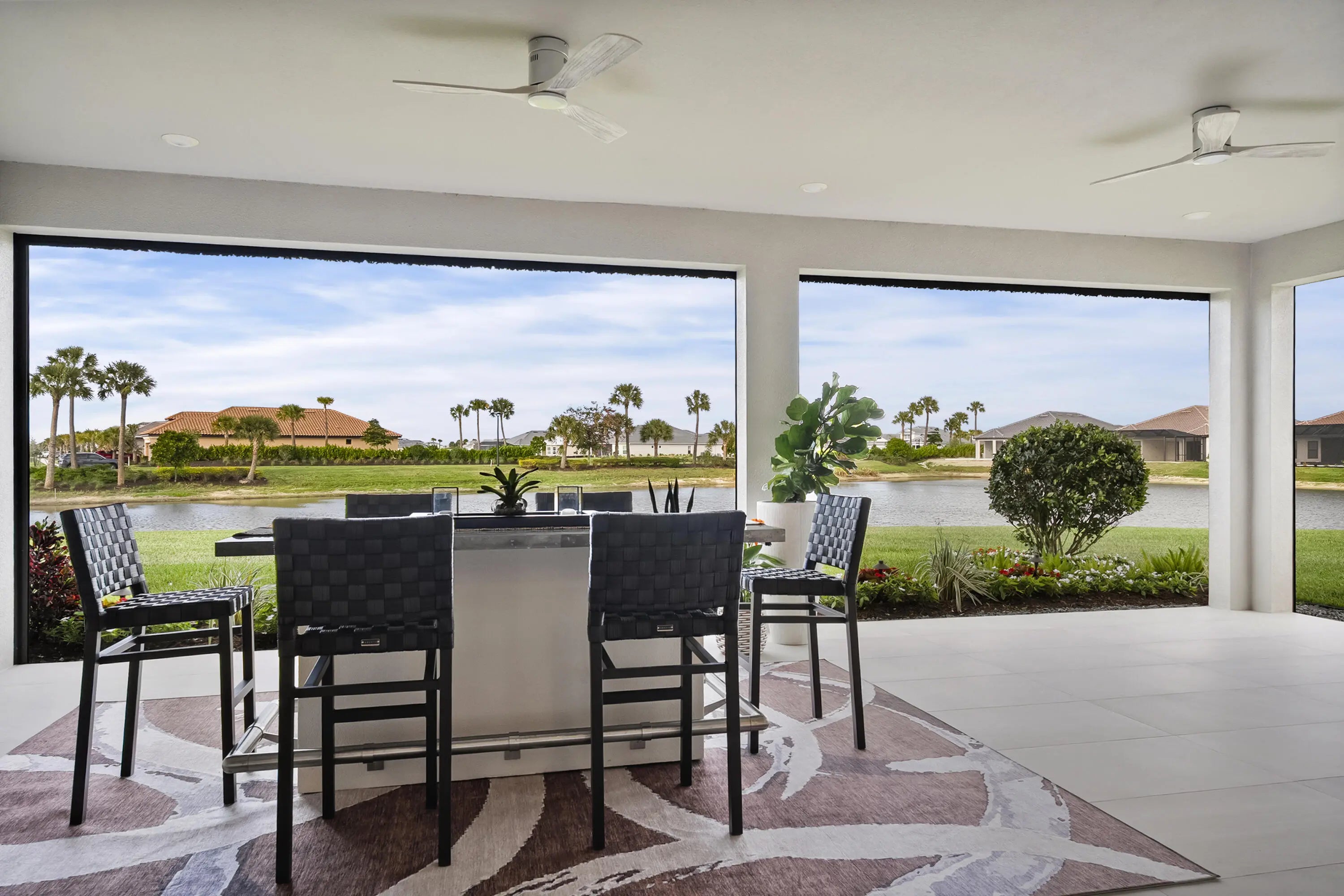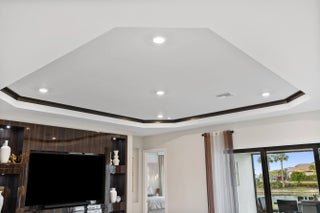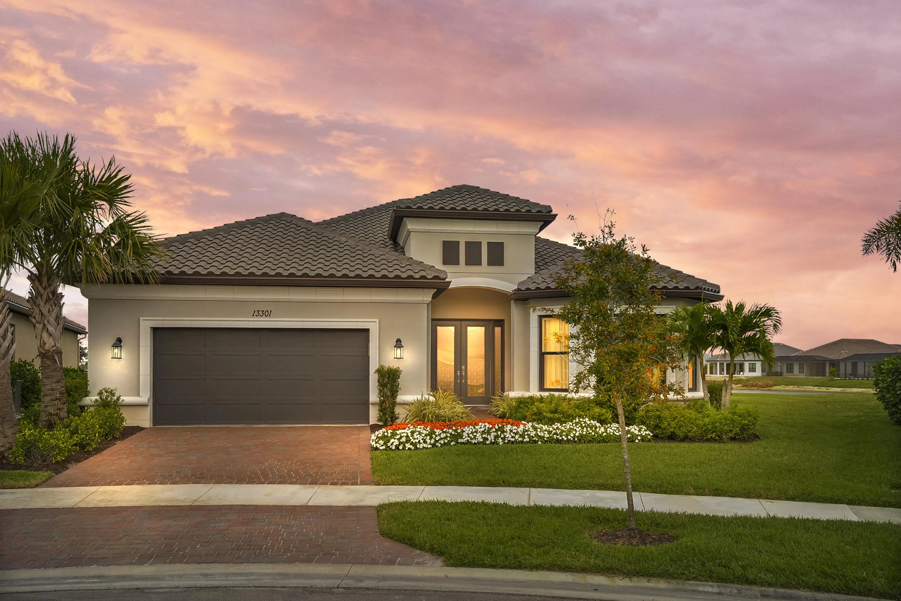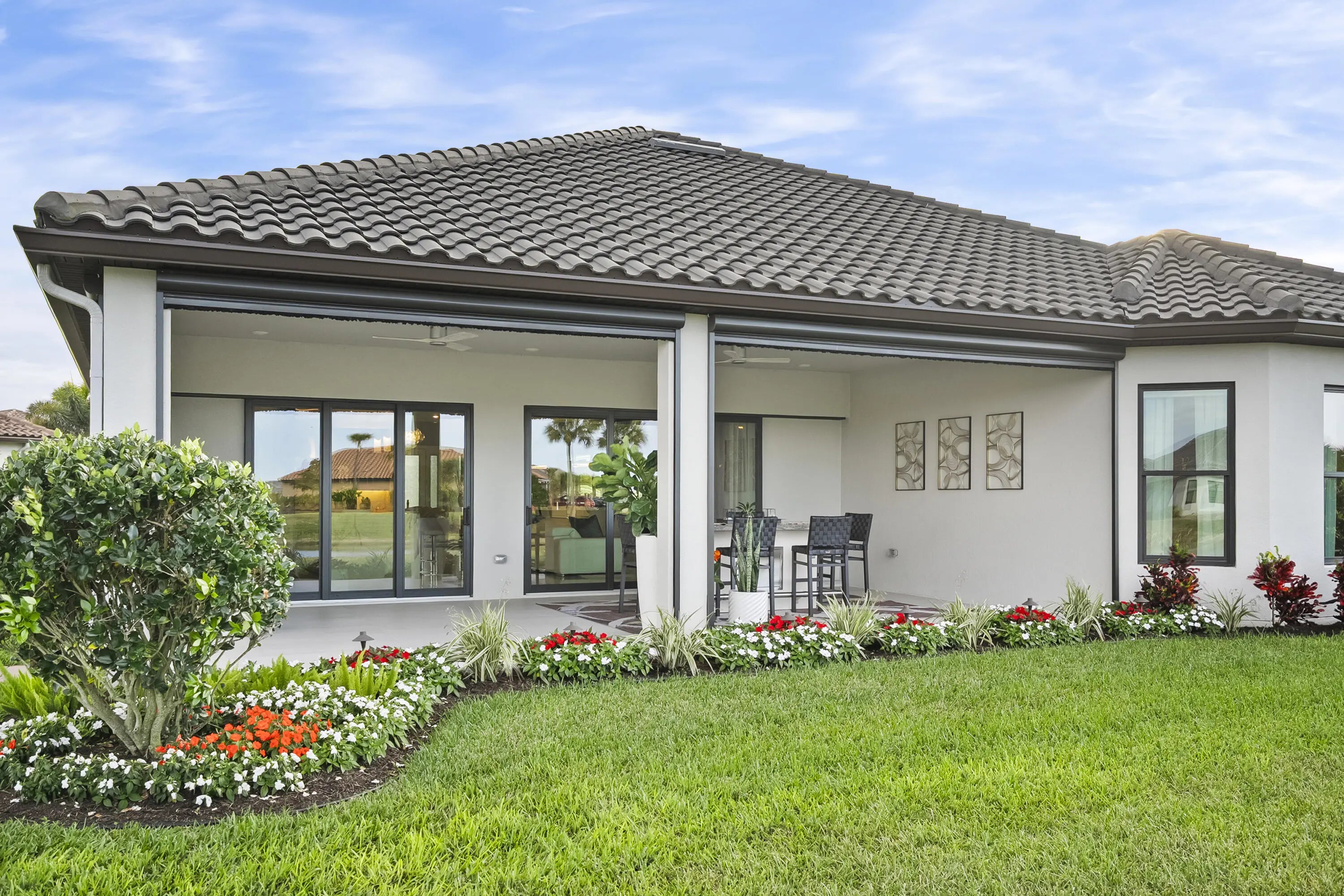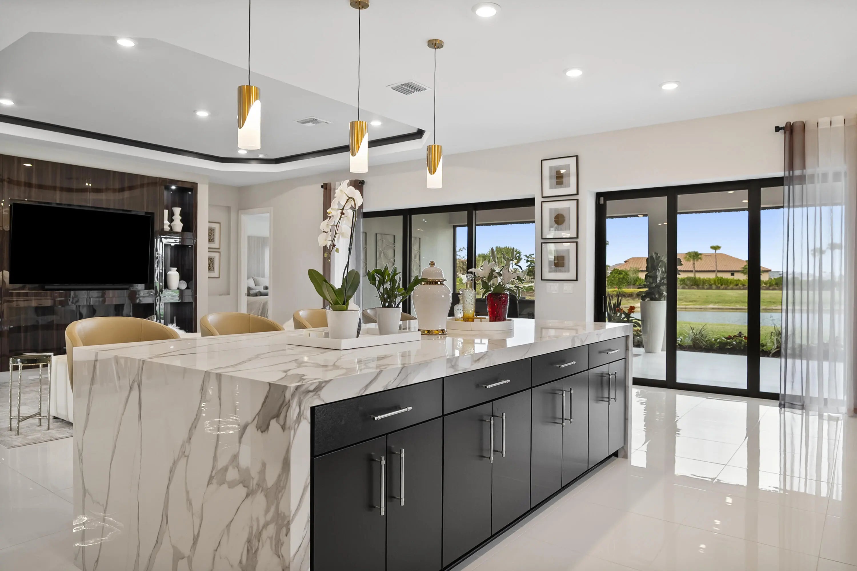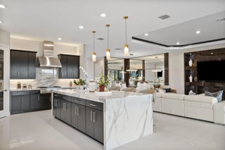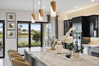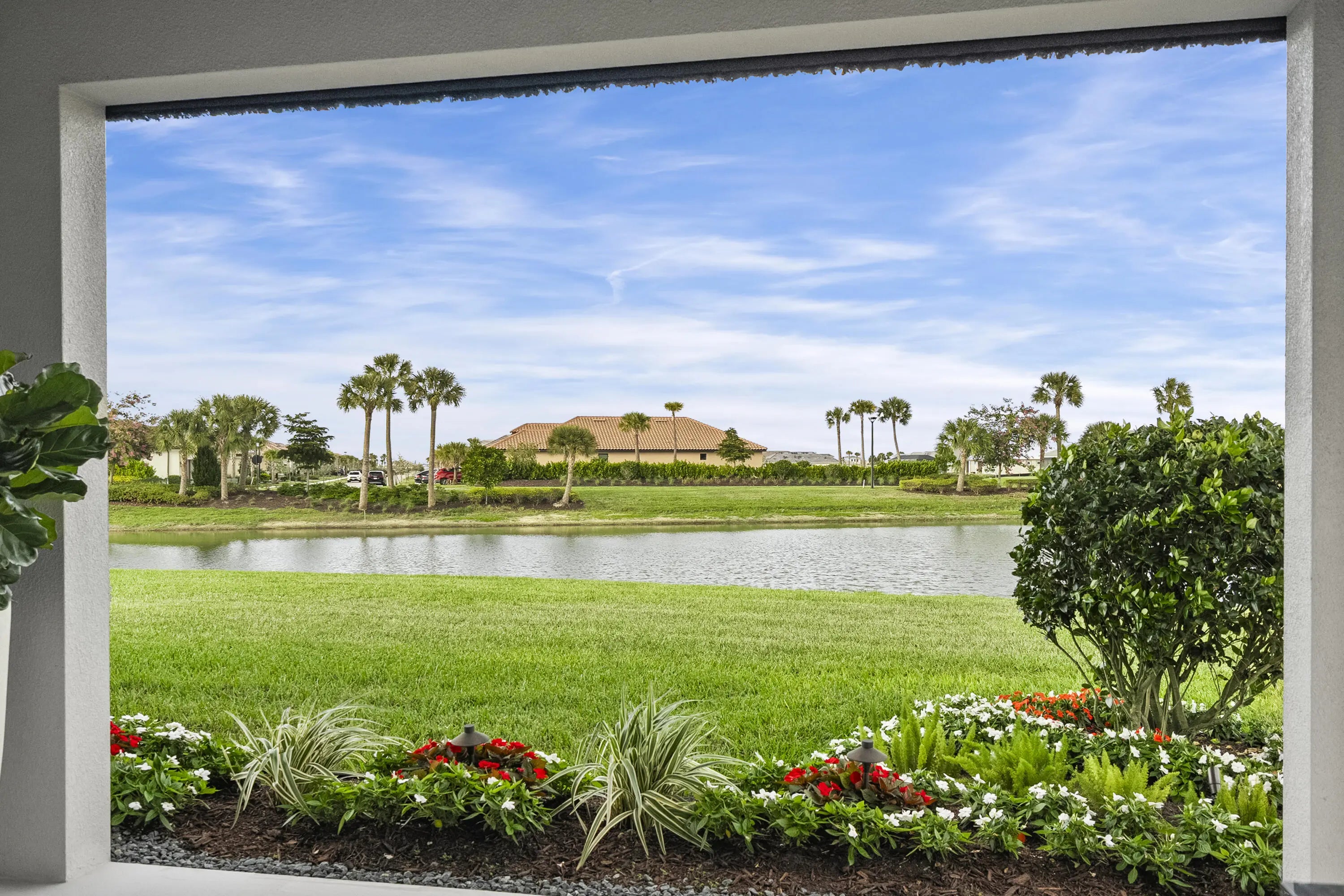 This Pallazio floor plan features extensive post-construction upgrades that go far beyond builder offerings. Offering 3 bedrooms, 3 bathrooms, plus a study/flex space, this exceptional home is situated on a quiet cul-de-sac on an oversized .36-acre pie-shaped lot that widens at the rear and overlooks a serene lake. Structural enhancements include an extended covered lanai, extended gourmet kitchen, outdoor kitchen gas and plumbing rough-ins, and extended bay windows in the primary suite. All impact windows and doors, paired with a brand-new barrel tile roof (2023), provide peace of mind and contribute to lower homeowners insurance rates. Inside, oversized porcelain tile flooring throughout (no carpet) creates a light, airy, and cohesive aesthetic. Professionally designed interiors take