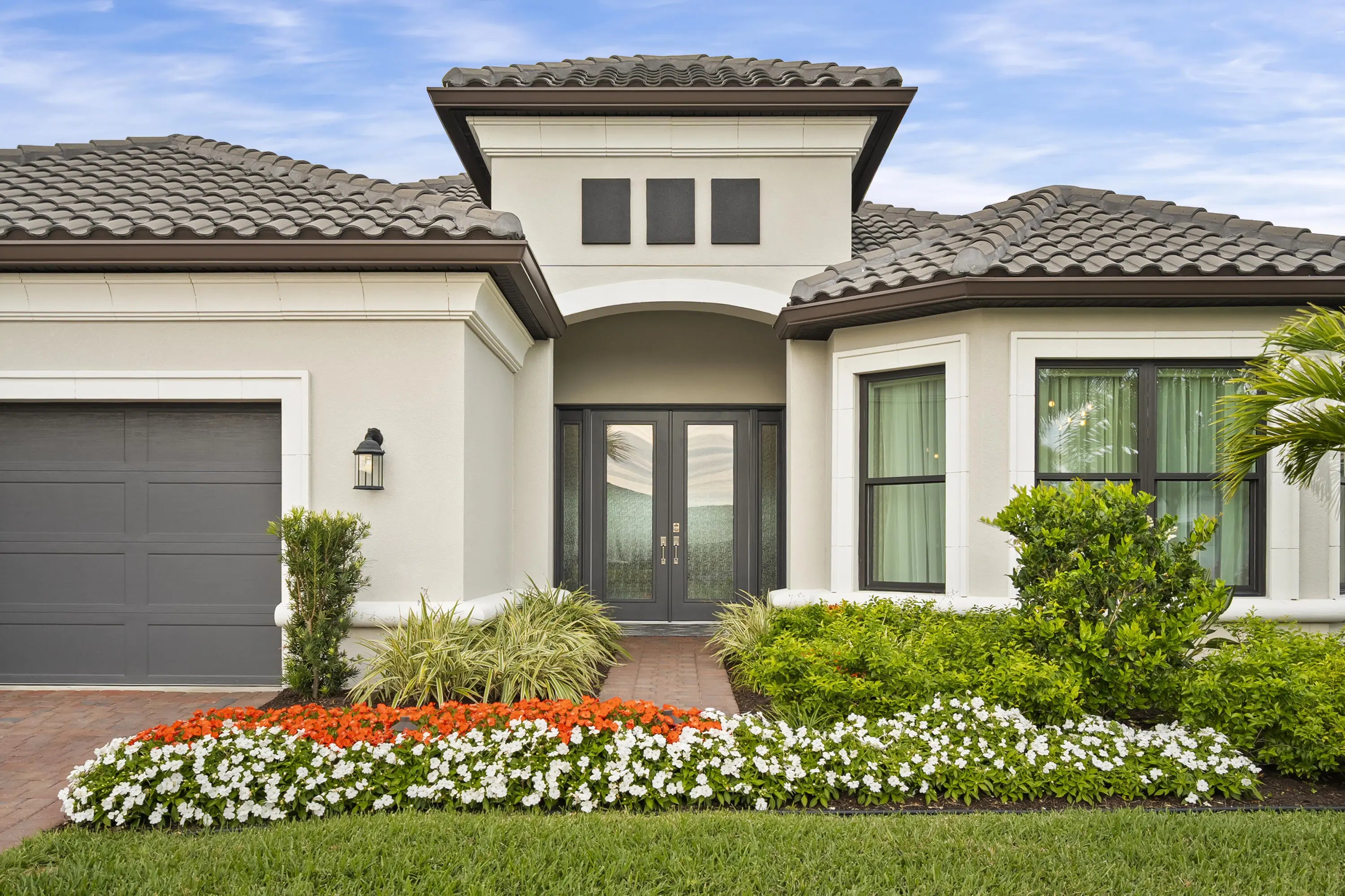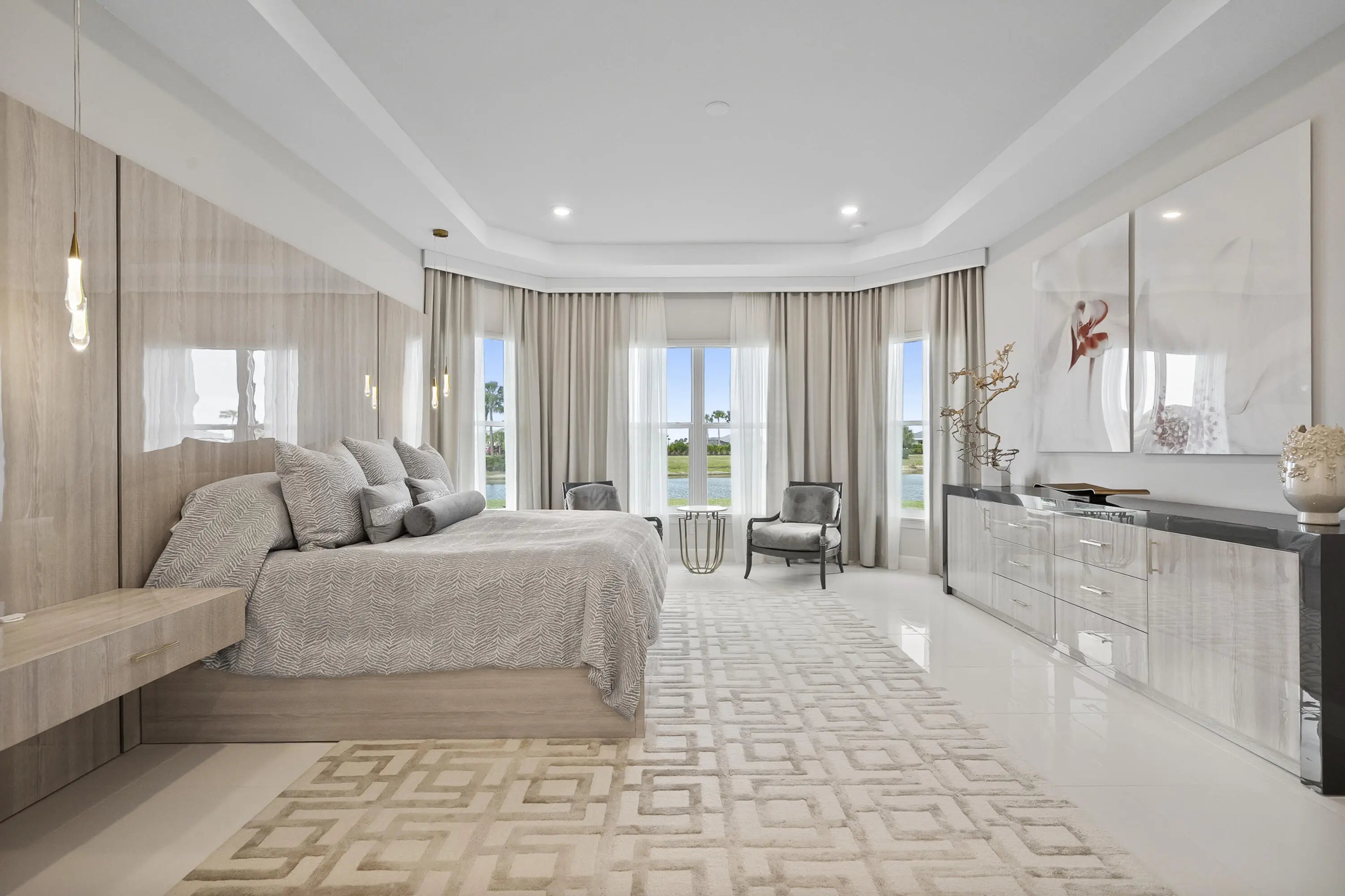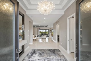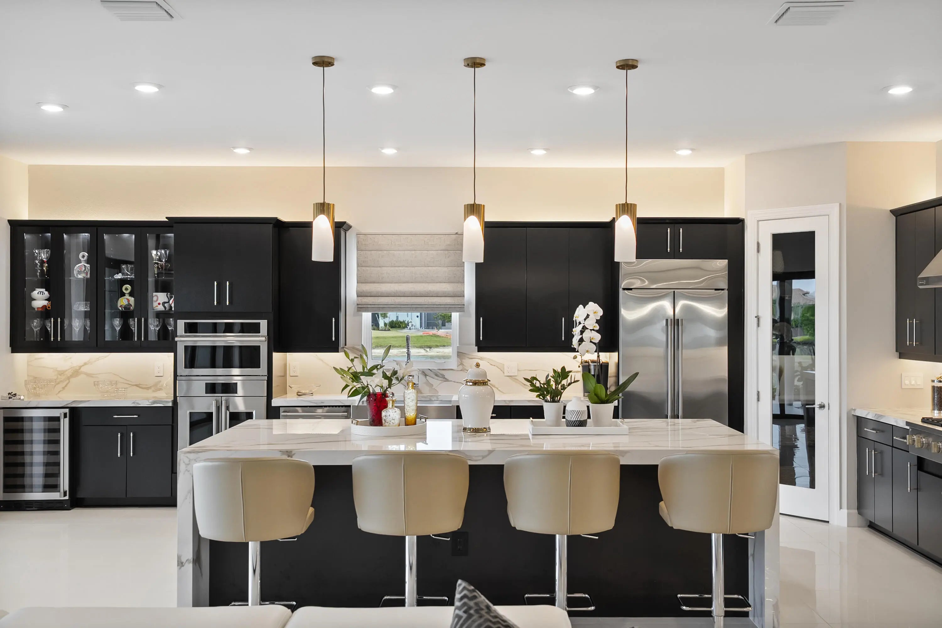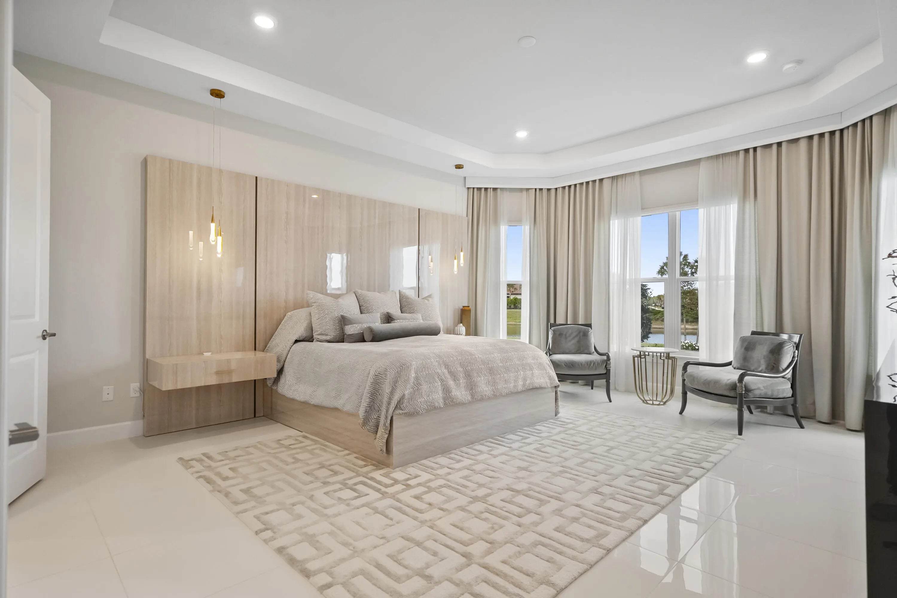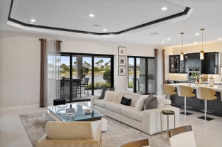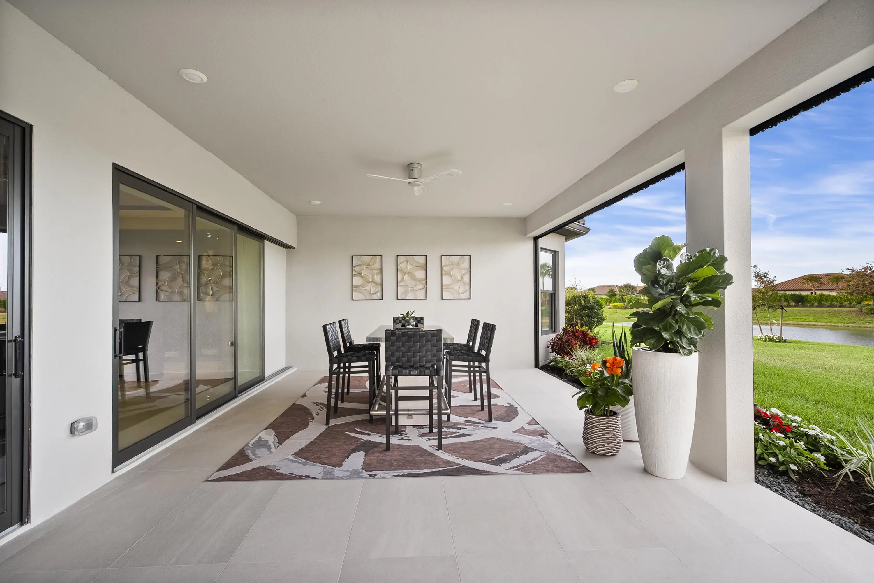 This Pallazio floor plan features extensive post-construction upgrades that go far beyond builder offerings. Offering 3 bedrooms, 3 bathrooms, plus a study/flex space, this exceptional home is situated on a quiet cul-de-sac on an oversized .36-acre pie-shaped lot that widens at the rear and overlooks a serene lake. Structural enhancements include an extended covered lanai, extended gourmet kitchen, outdoor kitchen gas and plumbing rough-ins, and extended bay windows in the primary suite. All impact windows and doors, paired with a brand-new barrel tile roof (2023), provide peace of mind and contribute to lower homeowners insurance rates. Inside, oversized porcelain tile flooring throughout (no carpet) creates a light, airy, and cohesive aesthetic. Professionally designed interiors take