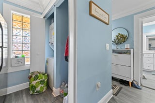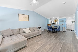 Step into this stunning first-floor corner residence, where modern updates meet architectural elegance. The interior is defined by sleek grey wood-look flooring that flows seamlessly throughout the entire home--ensuring a carpet-free, low-maintenance lifestyle. Your eyes are immediately drawn upward to the tray ceilings detailed with heavy, sophisticated crown molding, adding a touch of grandeur to the open-concept living and dining areas. The heart of the home is the stylish kitchen, featuring crisp white cabinetry that contrasts beautifully with warm butcher block countertops, all illuminated by recessed lighting and equipped with modern appliances.The split-bedroom layout offers privacy and comfort, with spacious rooms bathed in natural light through large windows with access to patio. The bathrooms have contemporary white vanities and updated fixtures, maintaining the home's bright, clean aesthetic. Practicality is maximized with a cleverly designed laundry niche featuring a stackable washer and dryer alongside built-in pantry shelving for extra storage. Unique glass block accents at the entry and kitchen add character and light to this move-in-ready coastal retreat.