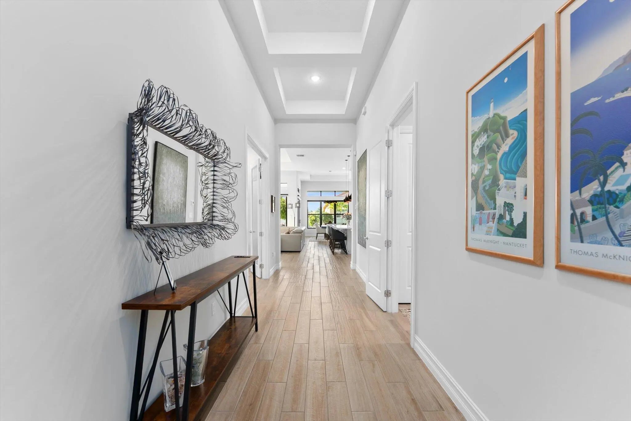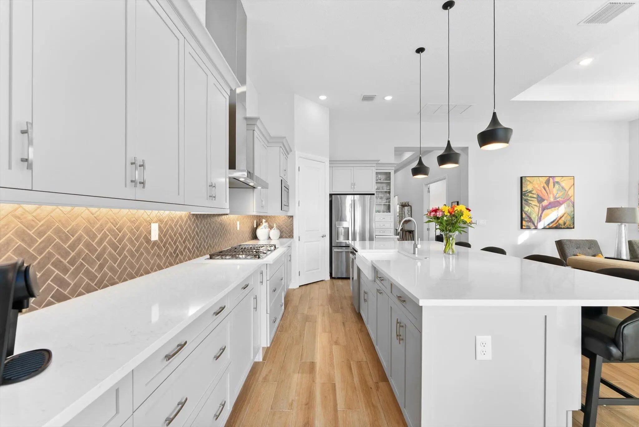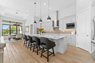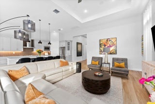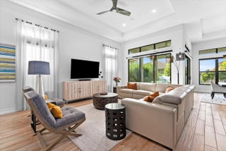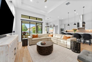Explore this thoughtfully designed home in like-new condition. Featuring a 2023 Cerelia model with stylish upgrades, it is located in a vibrant 55+ community. Highlights include soaring 13' tray ceilings, porcelain tile flooring throughout, motorized shades, and an open-concept layout filled with natural light from abundant windows and sliders.The chef's kitchen offers upgraded appliances, ample cabinetry, quartz countertops, an oversized island, and a vented hood. Step out to the lanai with a gas bib ready for your grill, overlooking a fenced yard ideal for pets or visiting grandkids. The spacious garage accommodates two cars plus a golf cart. Enjoy resort-style living with a luxurious clubhouse, fitness center, cafe, tennis and pickleball courts, two pools, game rooms