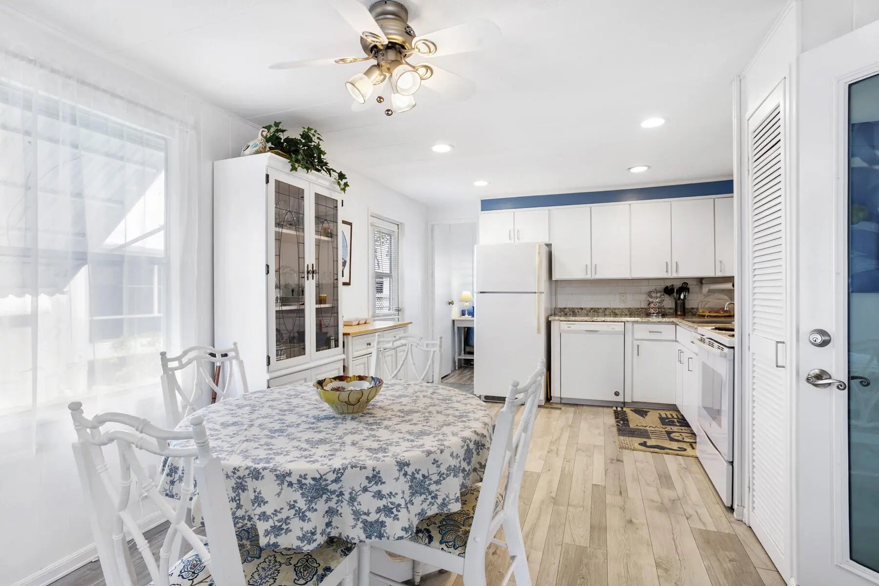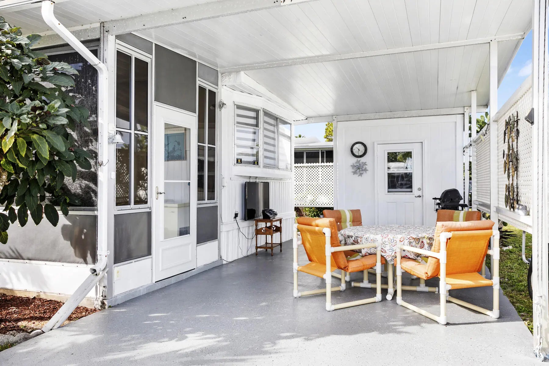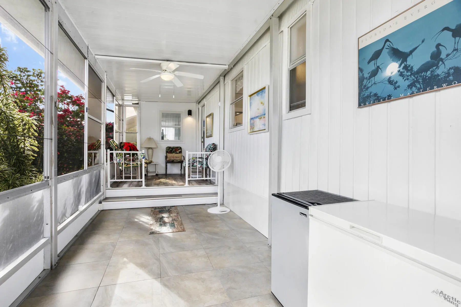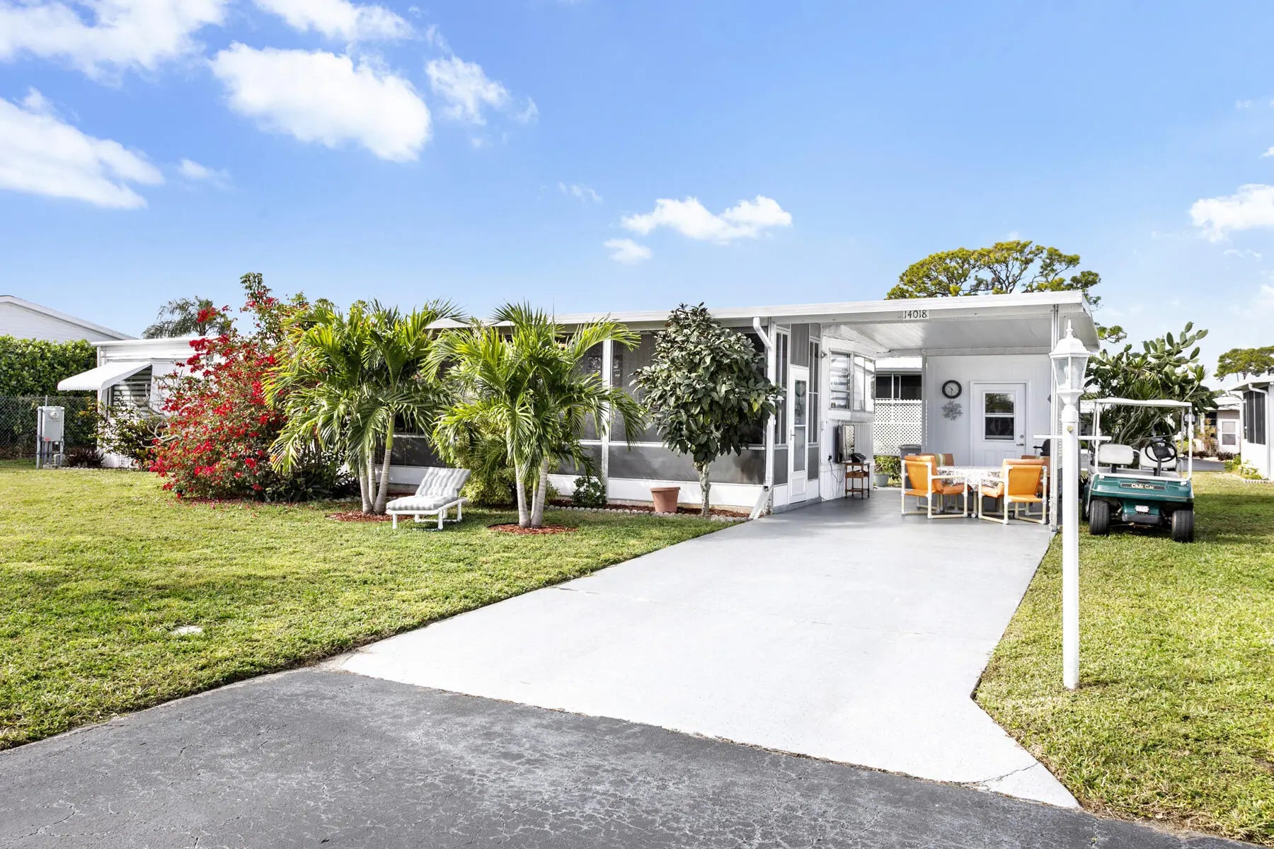 Welcome to your perfect winter retreat. Nestled at the end of a quiet cul-de-sac, this charming 2-bedroom, 2-bath completely furnished home sits on a private lot surrounded by plenty of peaceful green space. Secluded and serene, it's an ideal escape for relaxing. Enter through the oversized screened-in patio, perfect for morning coffee or evening breezes, and step through the glass front door into a light-filled, open living space. The spacious living room, dining area, and kitchen flow together beautifully, creating an airy and welcoming atmosphere. The split bedroom layout offers privacy, with one bedroom and full bath just off the kitchen, and a generously sized primary bedroom off the living room featuring bay windows and ample closet space. The remodeled bathroom includes a