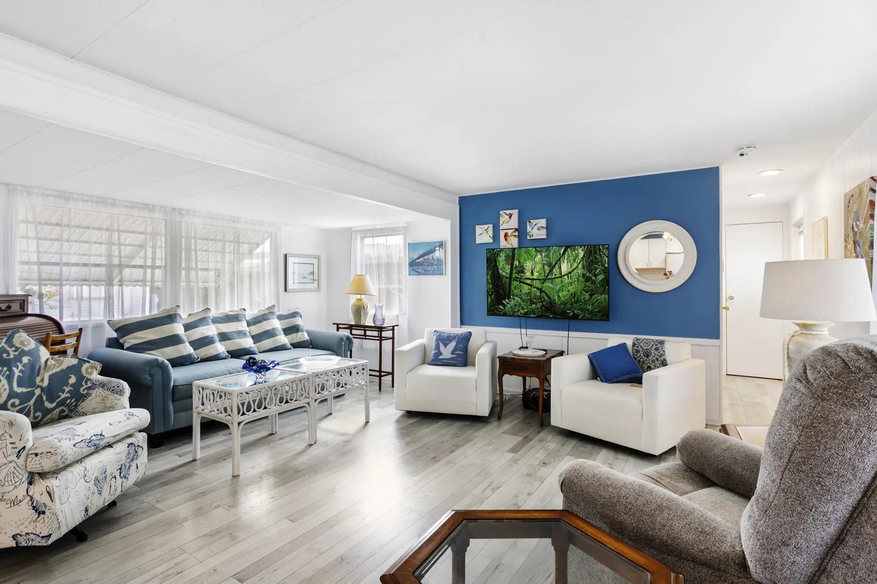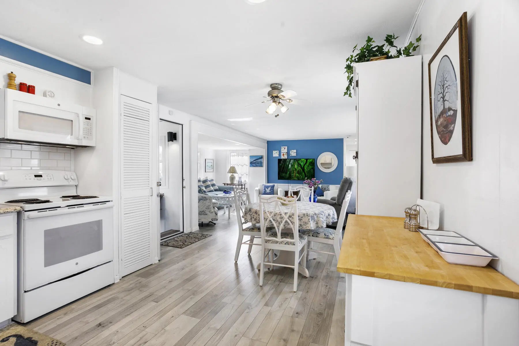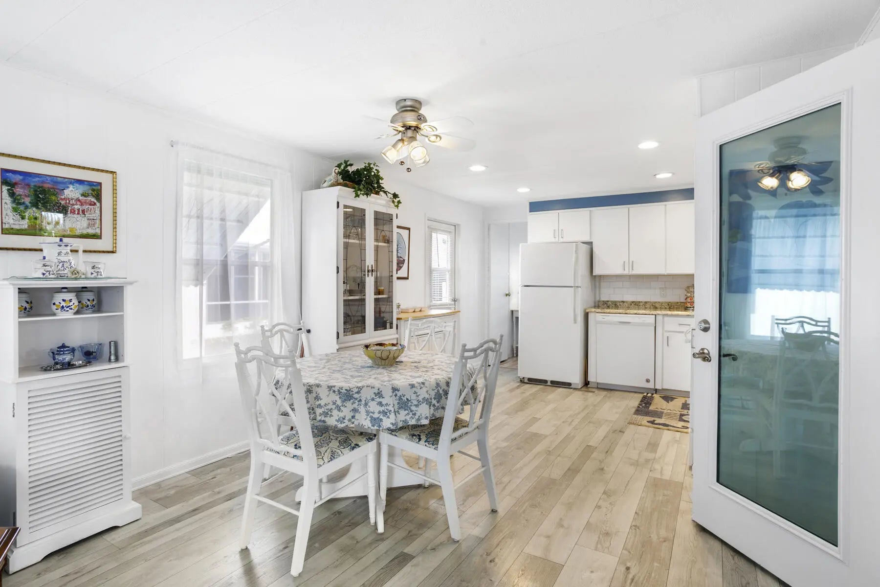 Welcome to your perfect winter retreat. Nestled at the end of a quiet cul-de-sac, this charming 2-bedroom, 2-bath completely furnished home sits on a private lot surrounded by plenty of peaceful green space. Secluded and serene, it's an ideal escape for relaxing. Enter through the oversized screened-in patio, perfect for morning coffee or evening breezes, and step through the glass front door into a light-filled, open living space. The spacious living room, dining area, and kitchen flow together beautifully, creating an airy and welcoming atmosphere. The split bedroom layout offers privacy, with one bedroom and full bath just off the kitchen, and a generously sized primary bedroom off the living room featuring bay windows and ample closet space. The remodeled bathroom includes a