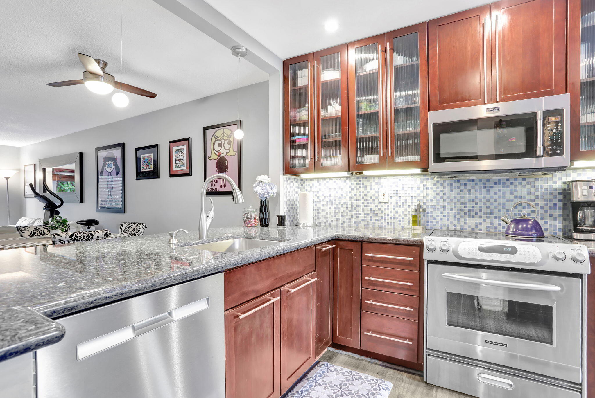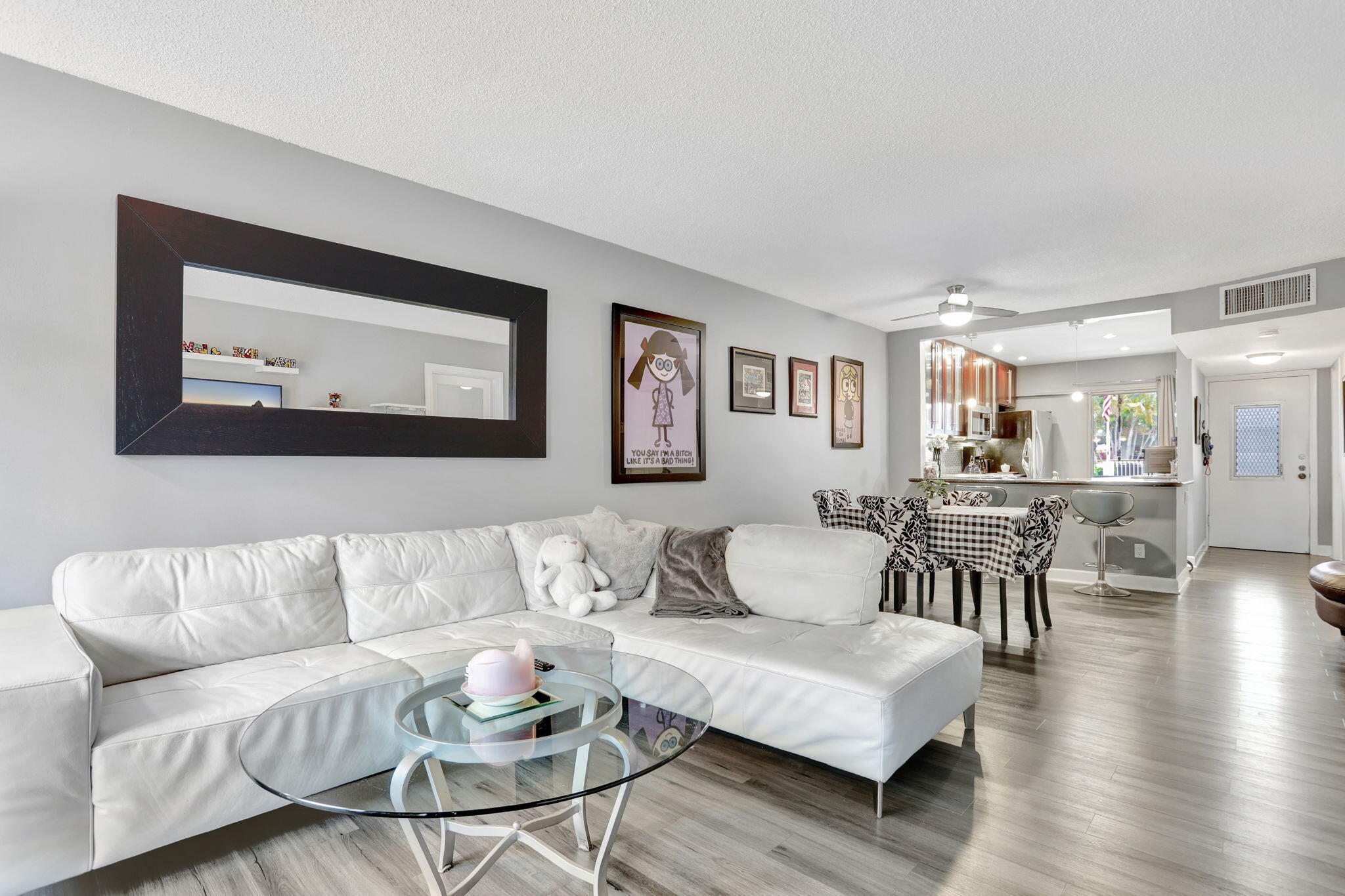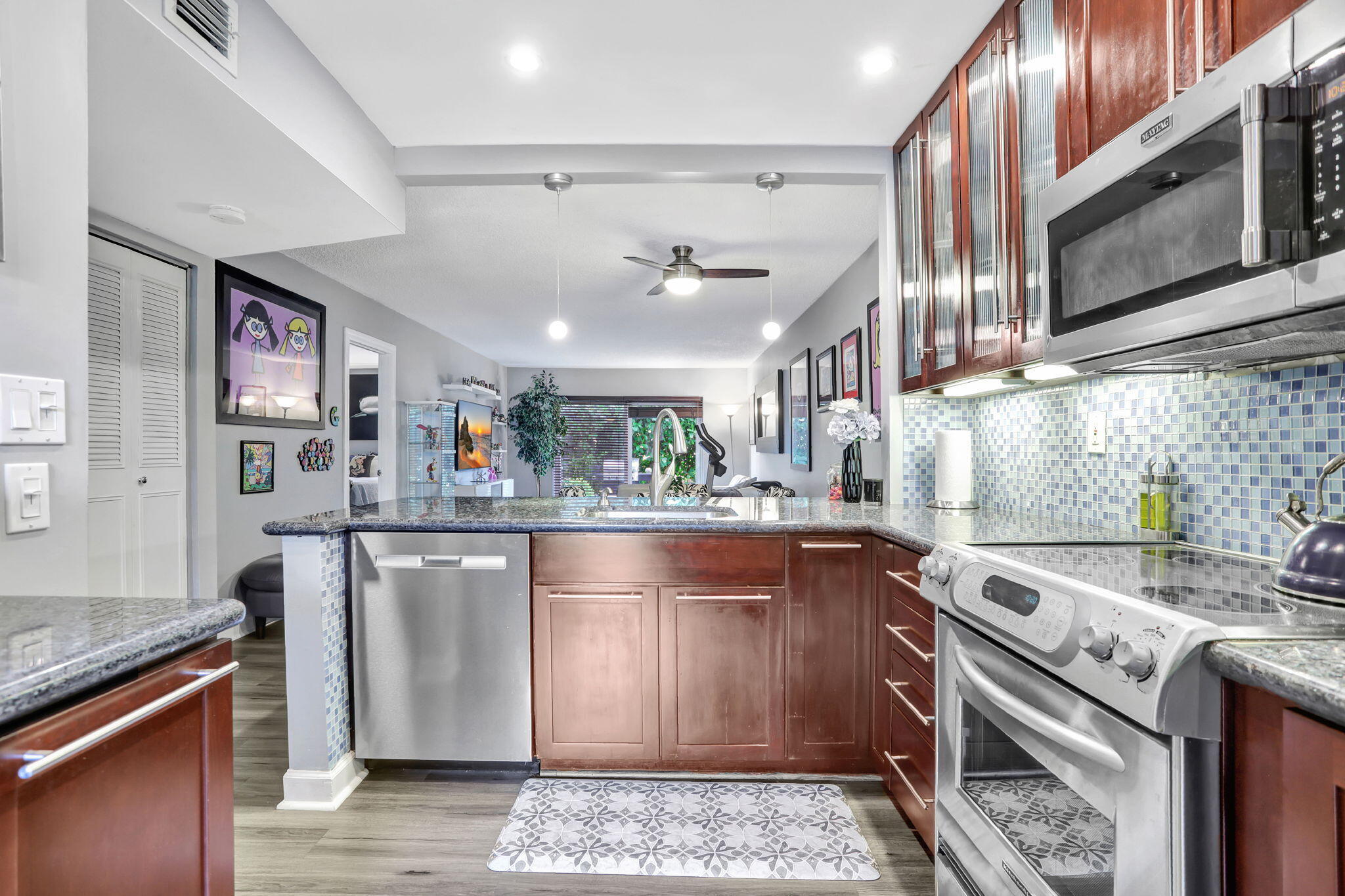 Move-in ready and thoughtfully updated, this charming 2-bed, 2-bath first-floor condo is located in a well-maintained boutique building in a prime location with the beach just minutes away. The home features impact windows and doors, newer flooring throughout, and an updated kitchen with granite countertops and stainless steel appliances. Both bedrooms offer private en-suite baths, with the primary suite featuring a walk-in closet, while the second bedroom's bathroom includes space for a washer and dryer. Additional highlights include a newly upgraded electrical panel, a screened front porch, private back patio, dedicated storage unit, and covered parking. Residents enjoy access to a community pool and clubhouse, all conveniently close to shopping and dining.