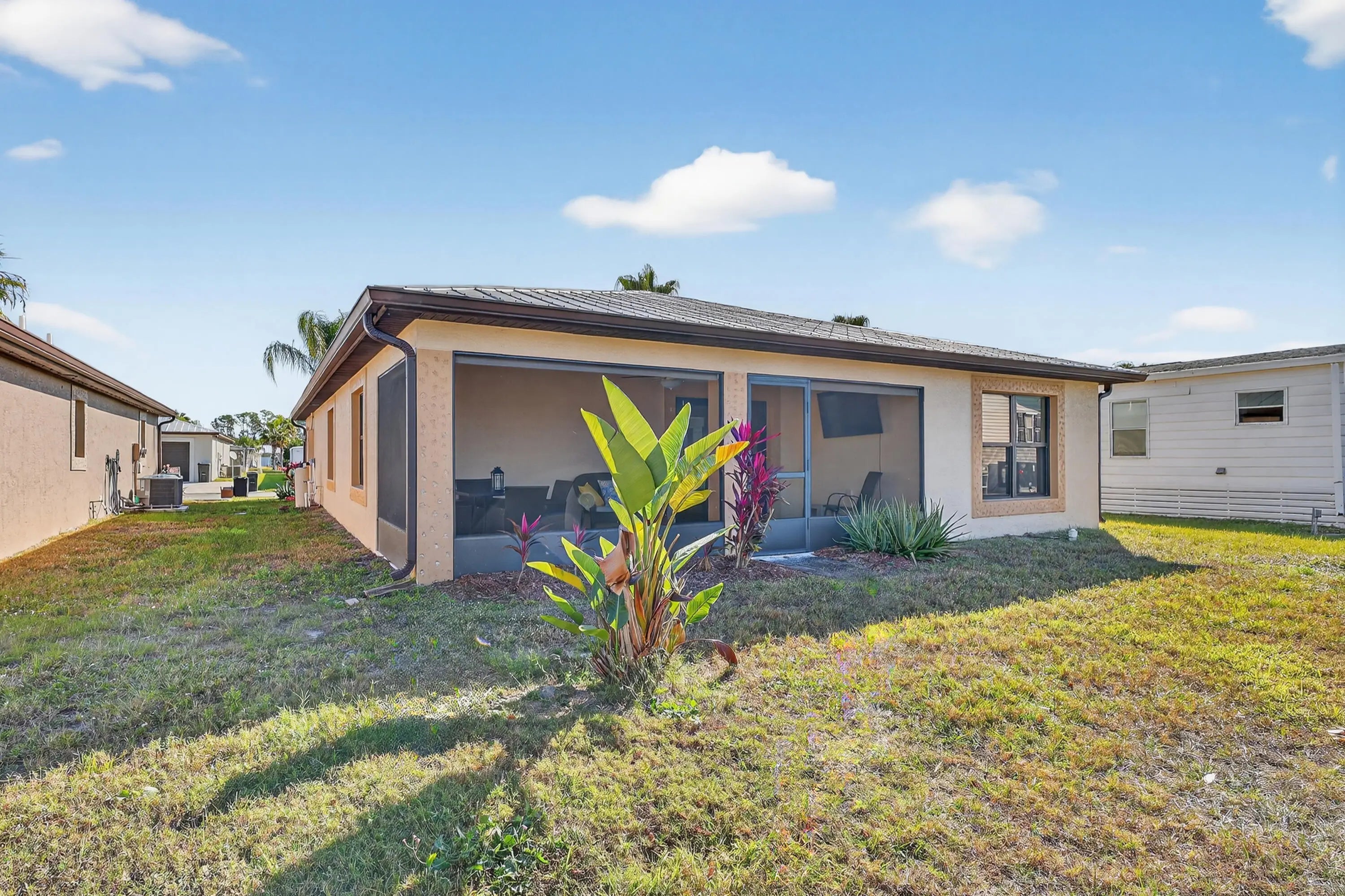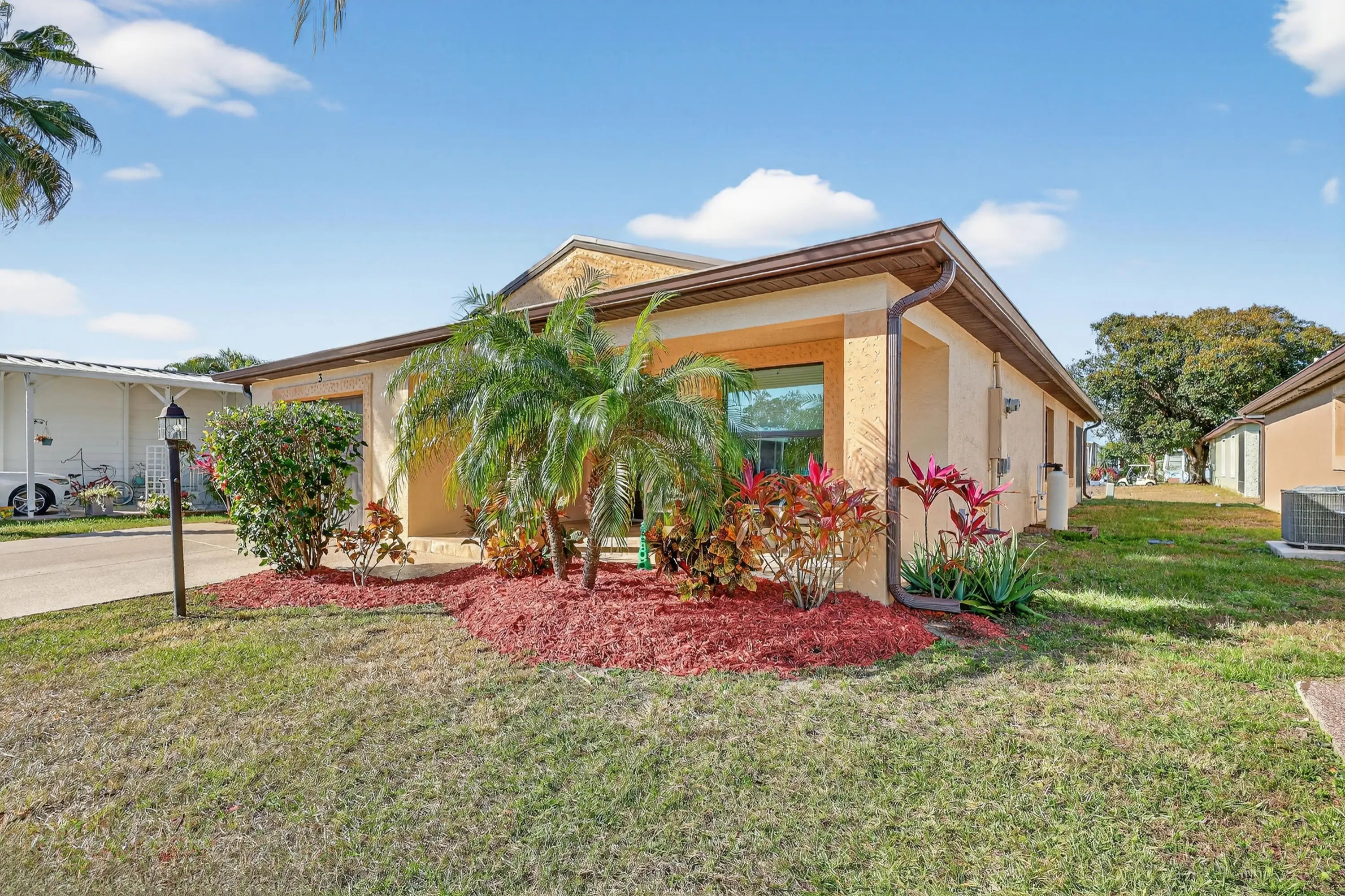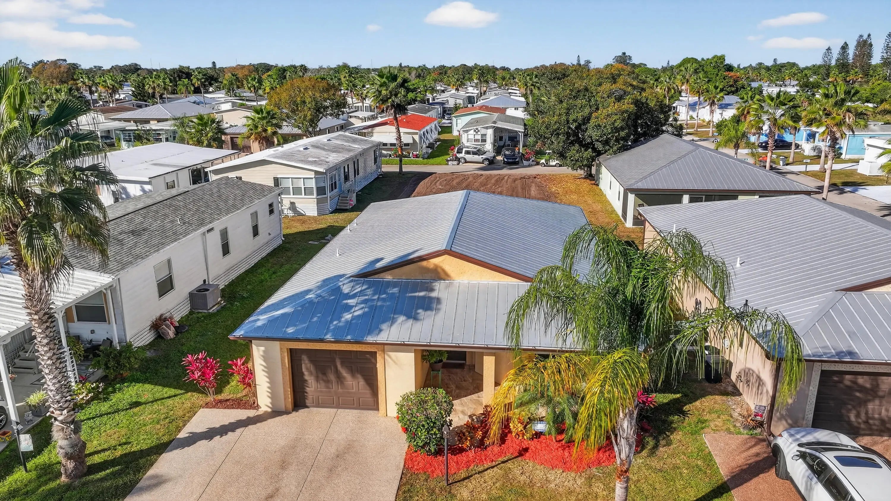 ELEGANT, DURABLE, SAFE & AFFORDABLE this 2018 2bed/2bath home w/ Only 1 owner is BUILT to LAST w/ Concrete Block Construction, IMPACT WINDOWS & a Metal Roof built over 5/8'' Plywood for maxstrength. KeyPadEntry, OpenConcept, Vaulted Ceilings,H20 Purify System throughout,LED Recessed Lights,Ceiling Fans,GRANITE Counters,Custom Window Treatmnts, StainlessSteel, Appl, 2024 Wash/Dryer, Master w/ walk-in closet & en-suite.Tiled & Shaded Front Porch & Lrg Screened, Tiled Lanai w/ Privacy Shades. Driveway coated w/ 24hour floor. PRIME LOCATION; beach, shopping,mall,grocery, bank,hospital,postal & more! Lot lease 646.36 includes trash, lawn care, Clubhouse w/Activities, Private FREE Golf,Heated Pool,Spa,Fitness,Pickleball,Tennis, Shuffleboard,Bocce,Library, Bingo,Parades, MahJong,Workshop & more!