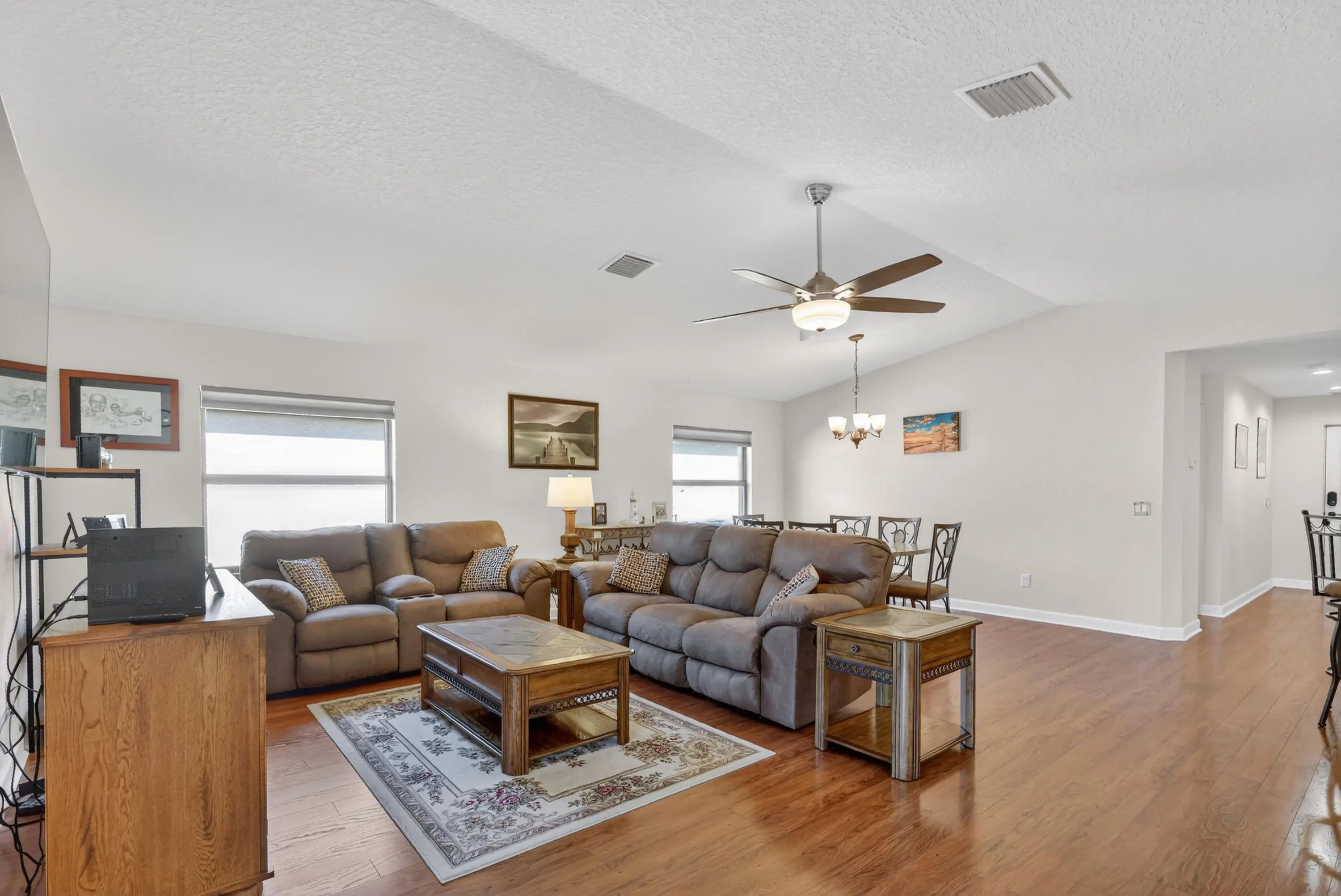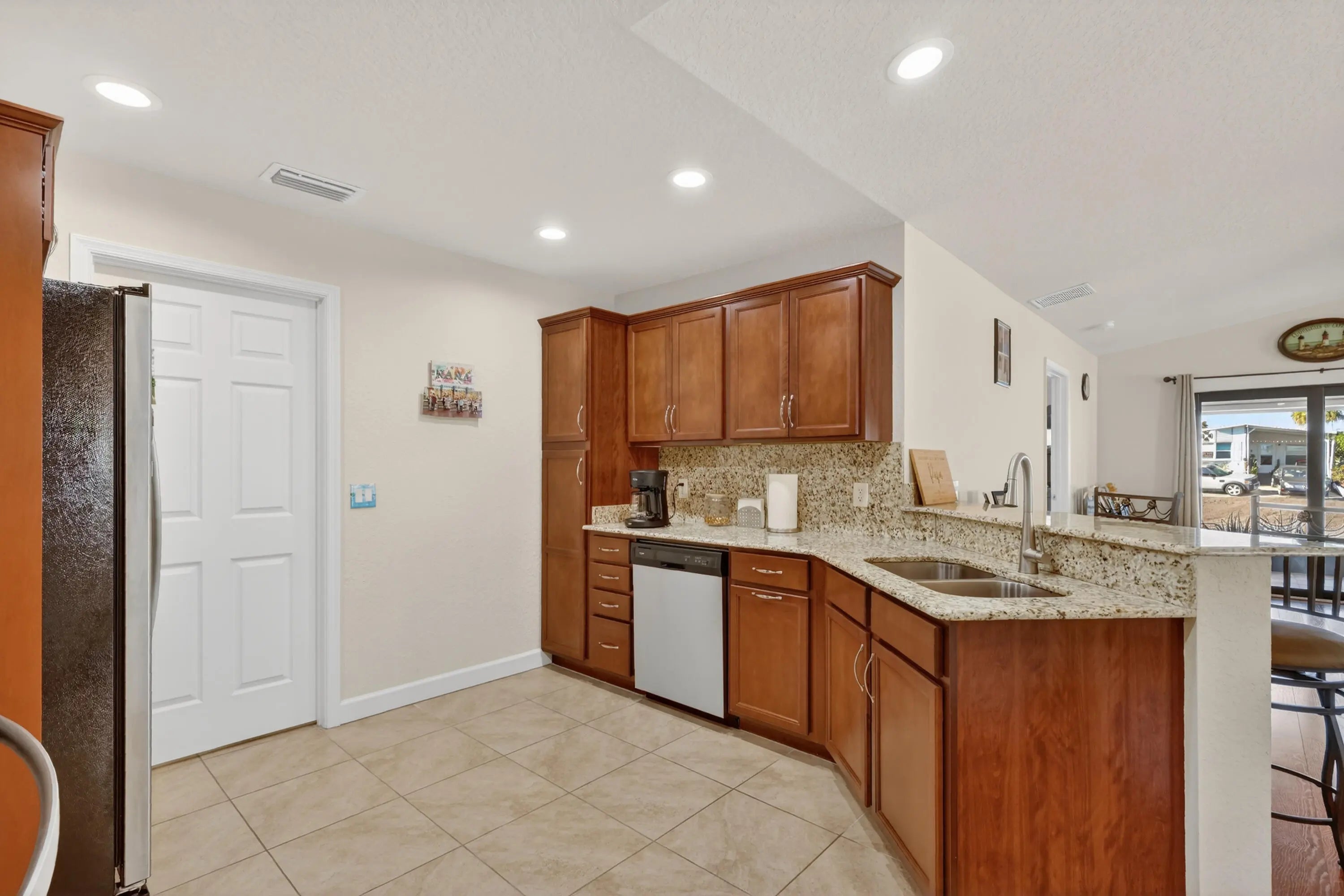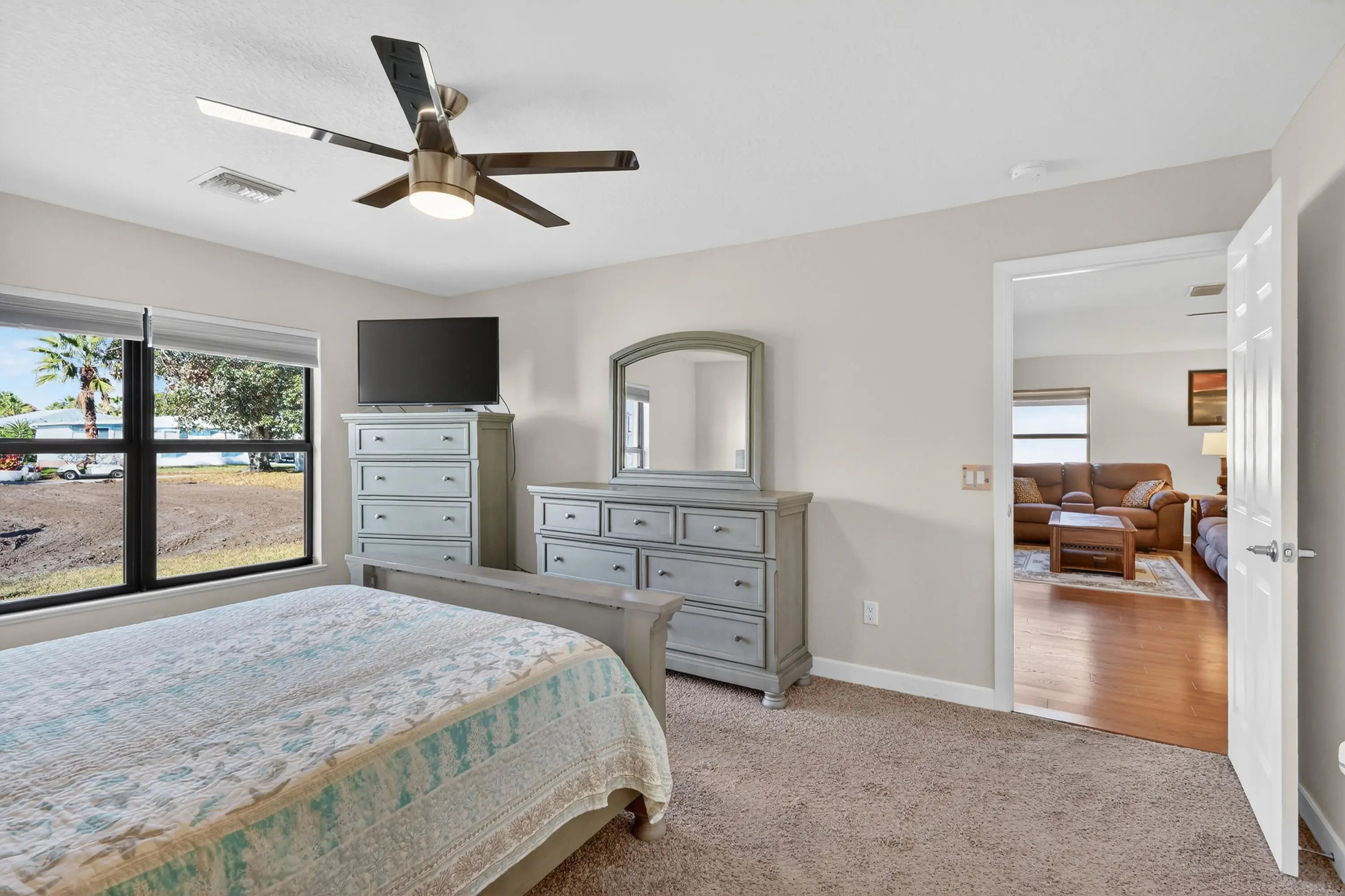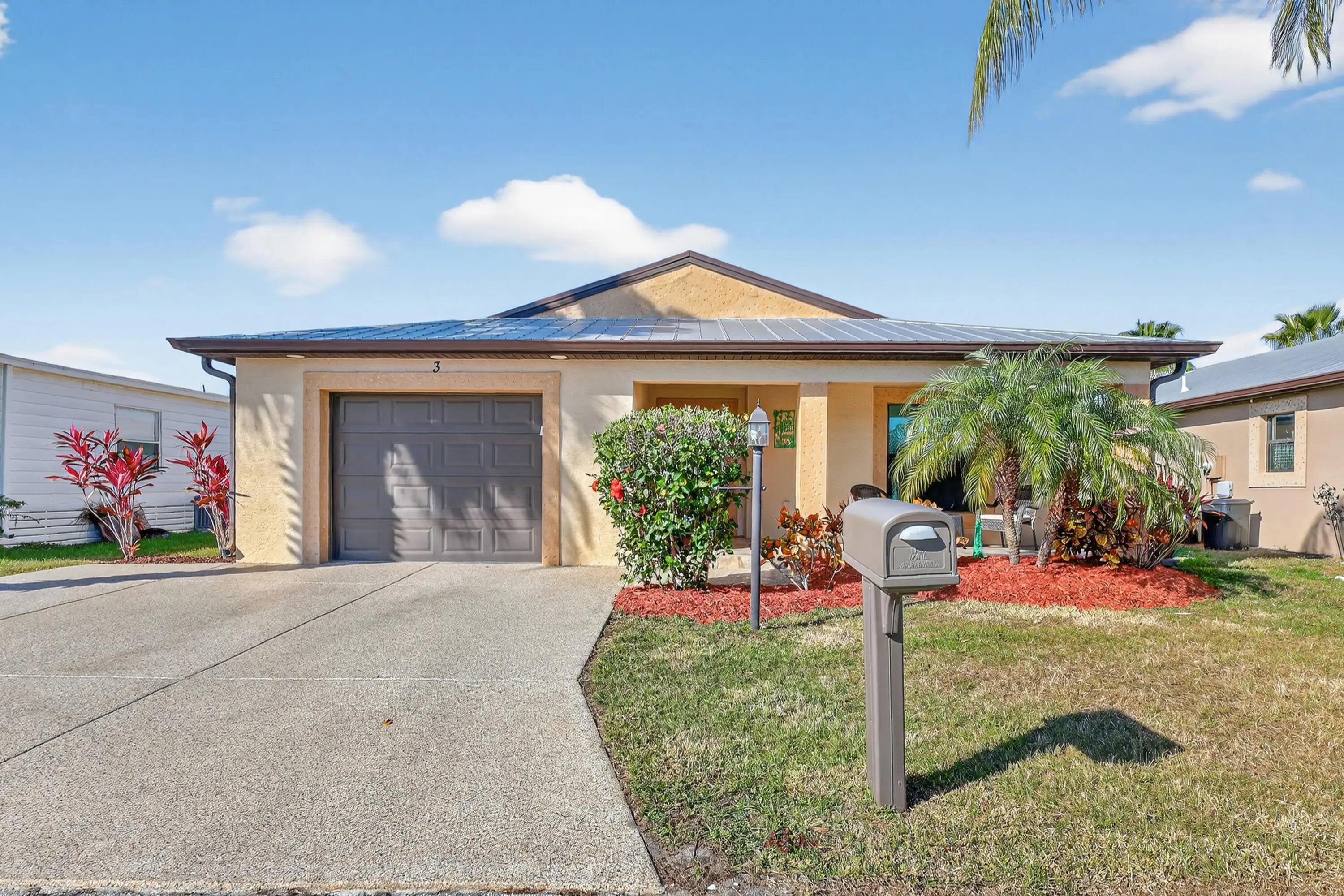 ELEGANT, DURABLE, SAFE & AFFORDABLE this 2018 2bed/2bath home w/ Only 1 owner is BUILT to LAST w/ Concrete Block Construction, IMPACT WINDOWS & a Metal Roof built over 5/8'' Plywood for maxstrength. KeyPadEntry, OpenConcept, Vaulted Ceilings,H20 Purify System throughout,LED Recessed Lights,Ceiling Fans,GRANITE Counters,Custom Window Treatmnts, StainlessSteel, Appl, 2024 Wash/Dryer, Master w/ walk-in closet & en-suite.Tiled & Shaded Front Porch & Lrg Screened, Tiled Lanai w/ Privacy Shades. Driveway coated w/ 24hour floor. PRIME LOCATION; beach, shopping,mall,grocery, bank,hospital,postal & more! Lot lease 646.36 includes trash, lawn care, Clubhouse w/Activities, Private FREE Golf,Heated Pool,Spa,Fitness,Pickleball,Tennis, Shuffleboard,Bocce,Library, Bingo,Parades, MahJong,Workshop & more!