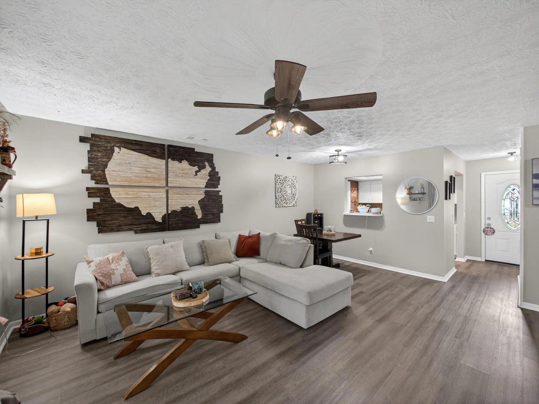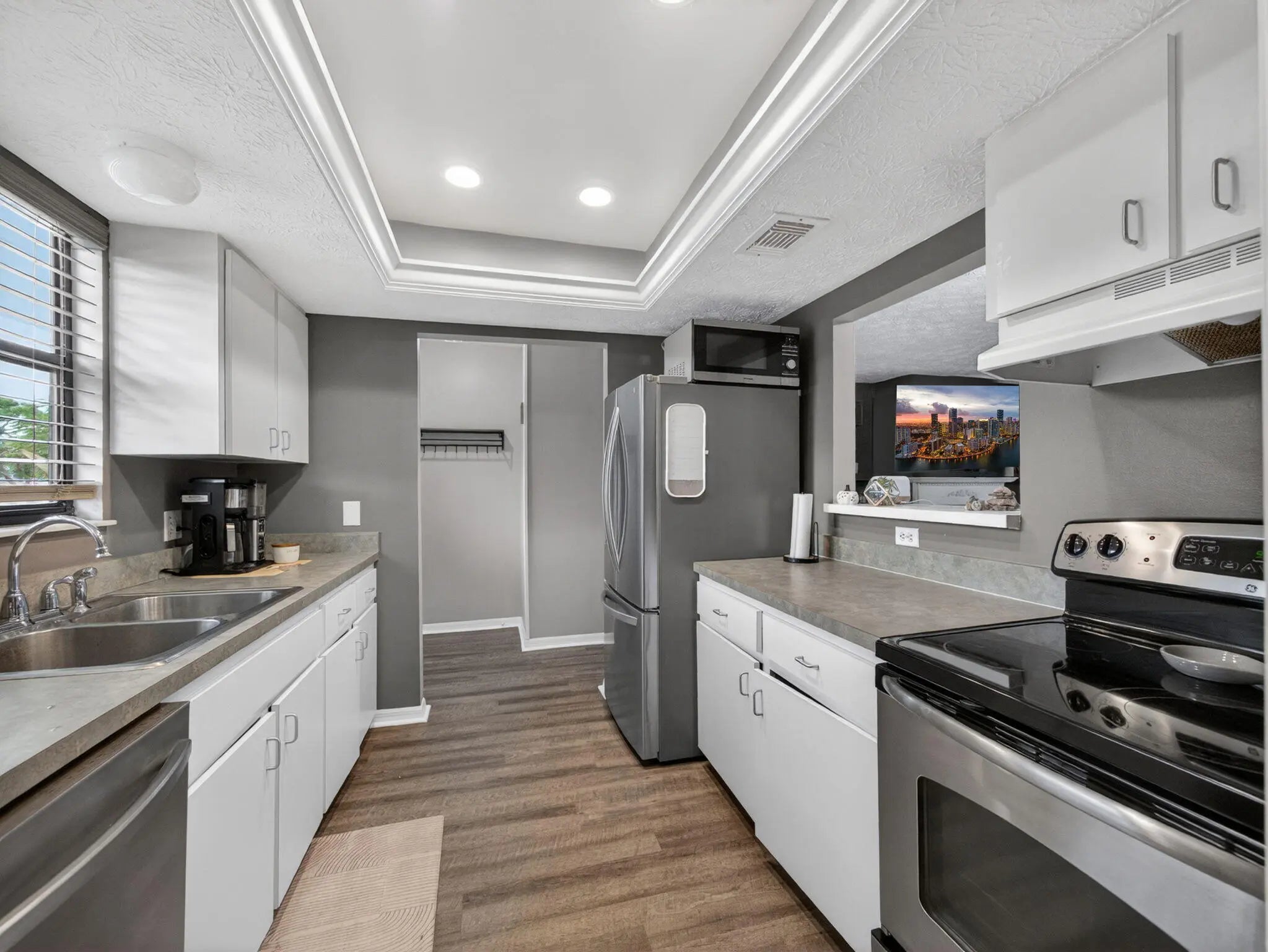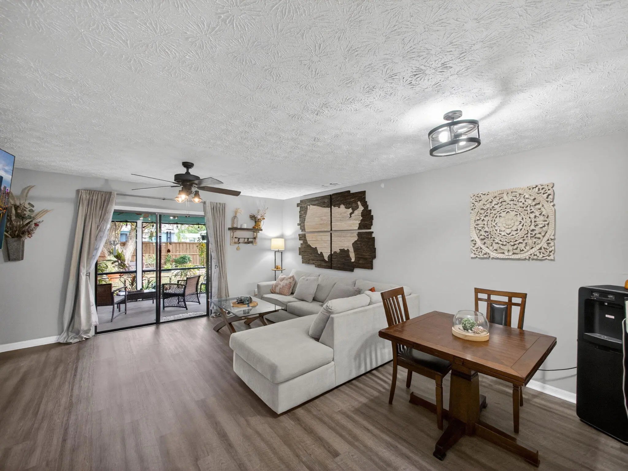 Welcome to the perfect blend of charm, comfort, and coastal convenience.This 2-bedroom, 2-bath home with a one-car garage sits on an extra-large fenced yard offering abundant space for a pool, boat, RV, or all three. The exterior has been beautifully updated with durable Hardie Plank siding, and a brand-new roof is scheduled for installation in February 2026 for added peace of mind.Step inside to a bright, open layout featuring luxury vinyl plank flooring, a cozy fireplace, and a coffered kitchen ceiling that adds architectural character. The kitchen offers stainless steel appliances, a convenient pass-through to the great room, and easy flow for everyday living or entertaining. The spacious primary bedroom includes stylish barn doors and an ensuite bath. Relax outdoors on the screen