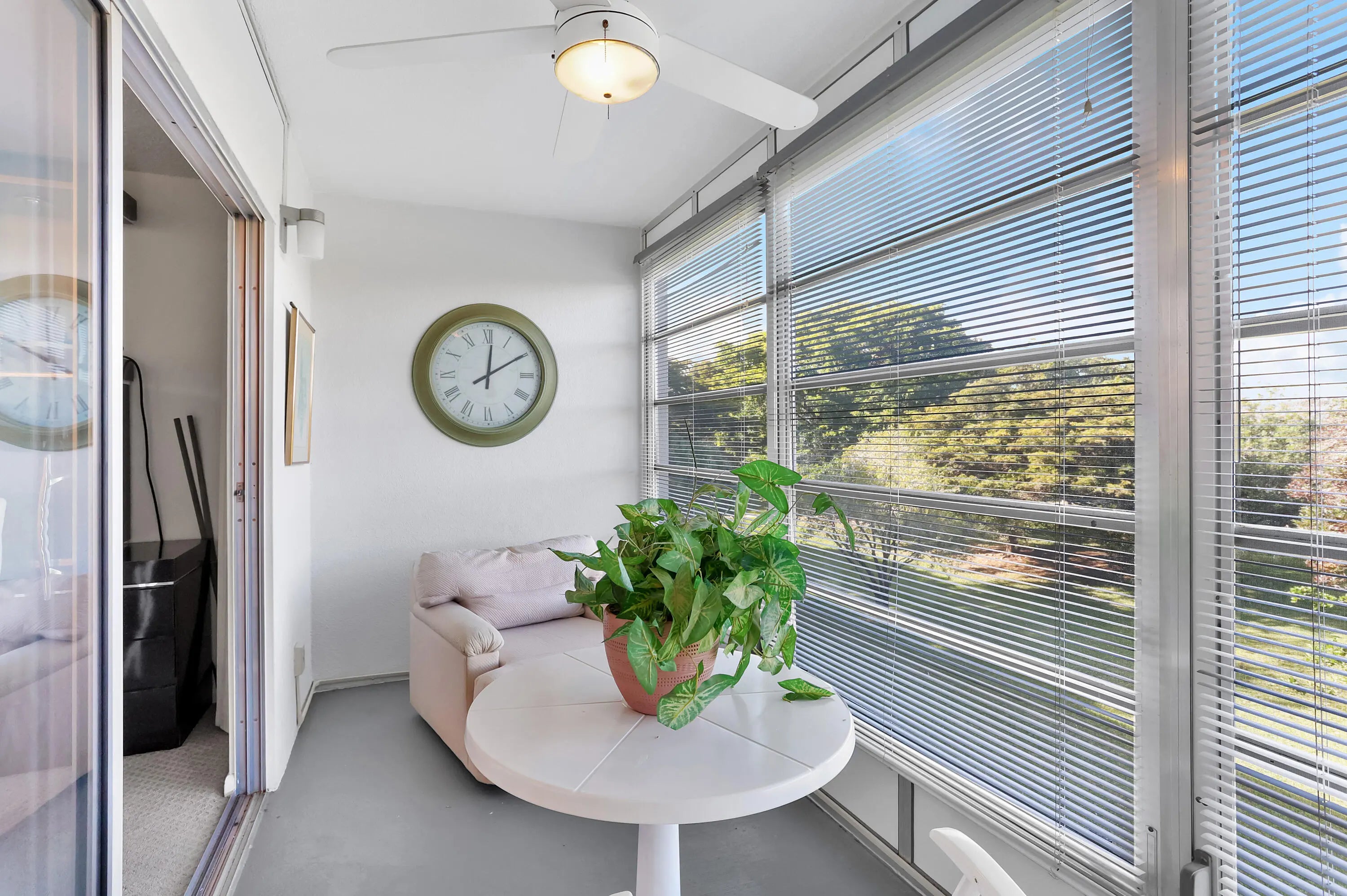 Spacious 2-bedroom, 2-bath condo in Wynmoor Village, featuring a bright Florida room with peaceful park and treetop views, perfect for morning coffee or a serene reading experience. Enjoy an open living/dining area, a well-appointed kitchen, and two private bedrooms, each with a walk-in closet. Conveniences include an in-unit washer & dryer, extra storage for decor or beach gear, assigned parking, and manned security. Resort amenities: pickleball, multiple pools, golf, gym, shuffleboard, tennis, billiards, and a library. Convenient location near shopping, dining, medical services, beaches, and major roadways.