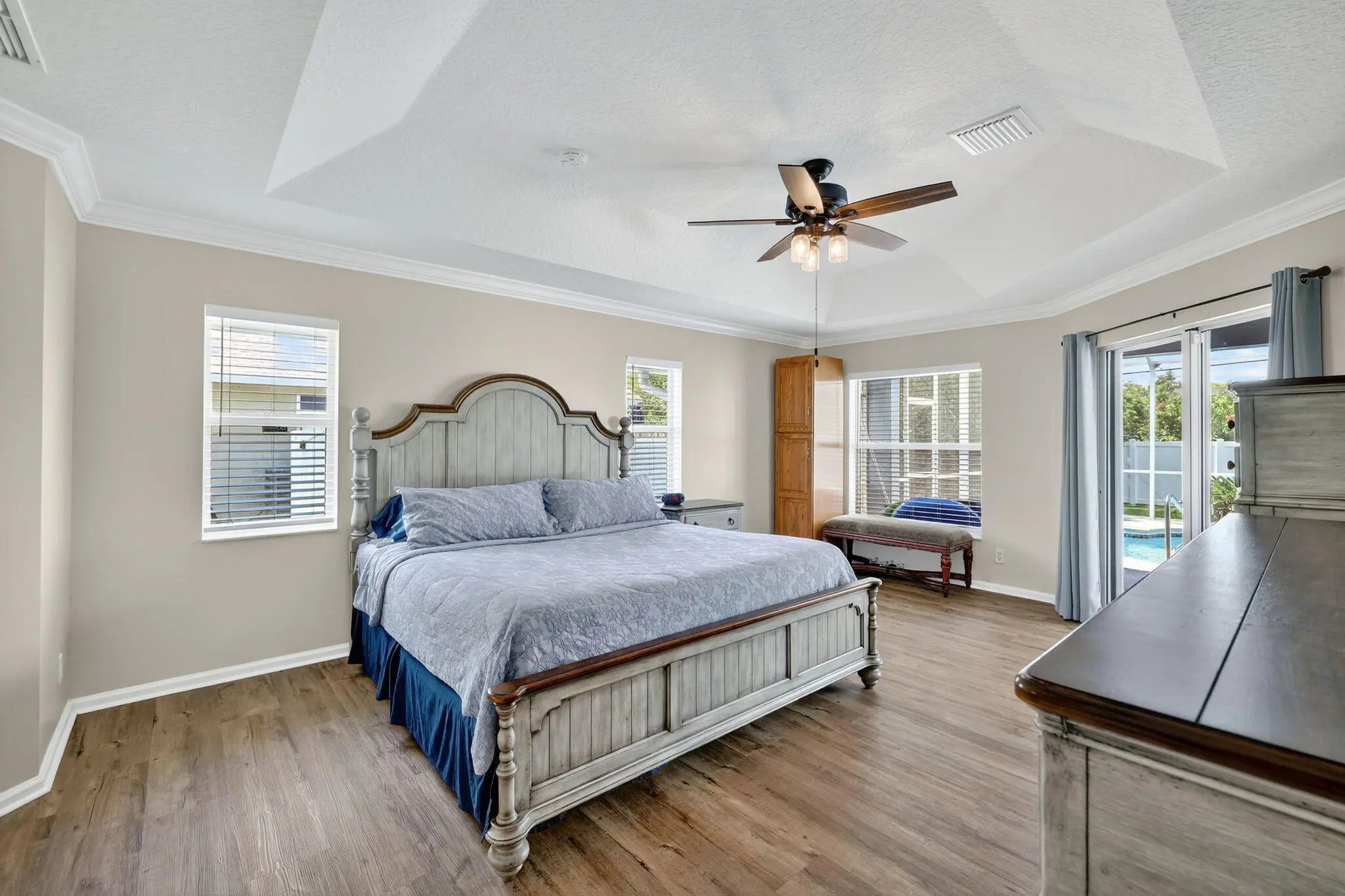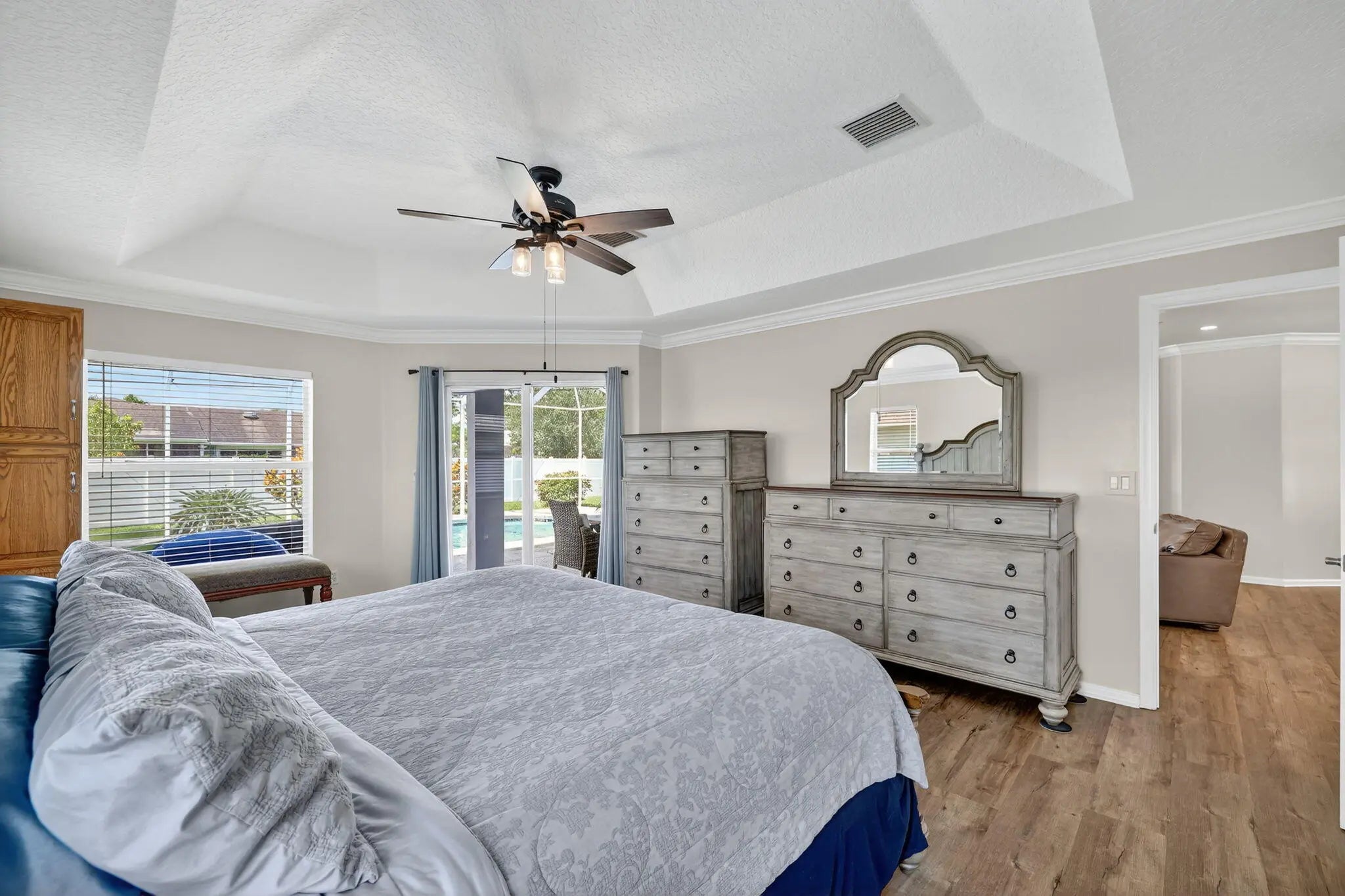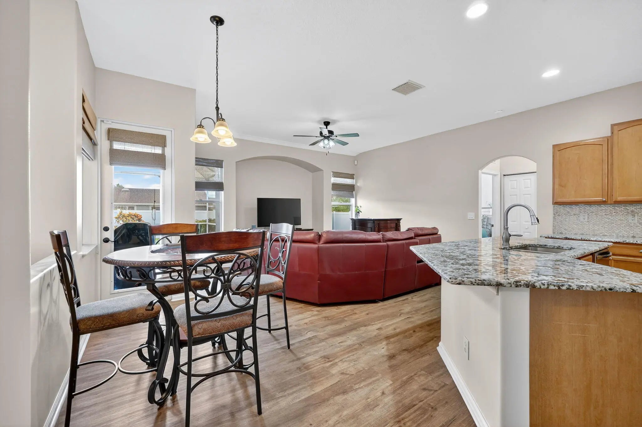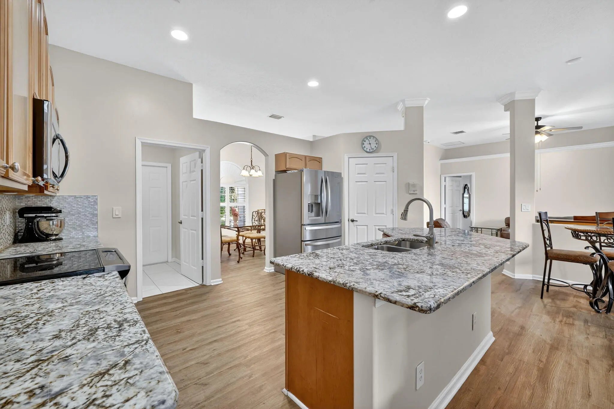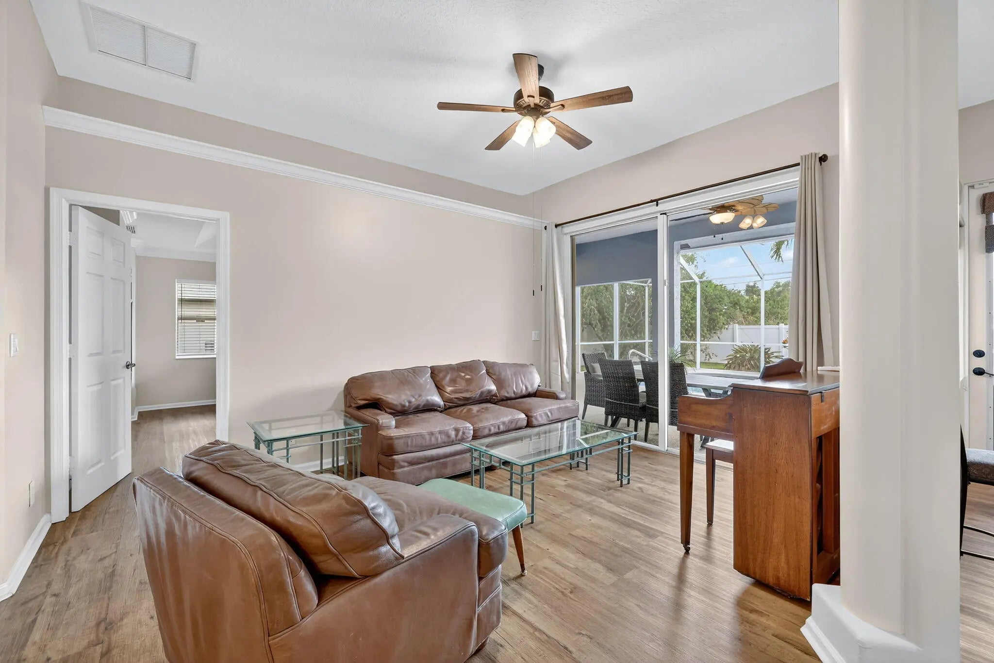 Immaculate Pool Home: 3 BR + Den/Office, 2 BA, 2 car garage & big ticket upgrades: 2022 new metal roof & new HVAC, 2021 water heater, new flooring & large updated kitchen. Double front doors lead to sun filled formal living & dining rooms, all laid with LVP floors through every room. The spacious primary suite opens directly onto the covered pool lanai, while its spa like bath with walk in shower & soaking tub. The heart of the home, the open kitchen showcases granite counters, custom backsplash, SS appliances, plenty of prep space & cabinets & is open to the family room & breakfast nook. For entertaining Family & Friends, this flows to the screened pool & fenced, tropical backyard creating entertainer's paradise with room to grill, play and unwind. Come enjoy the Florida lifestyle today!