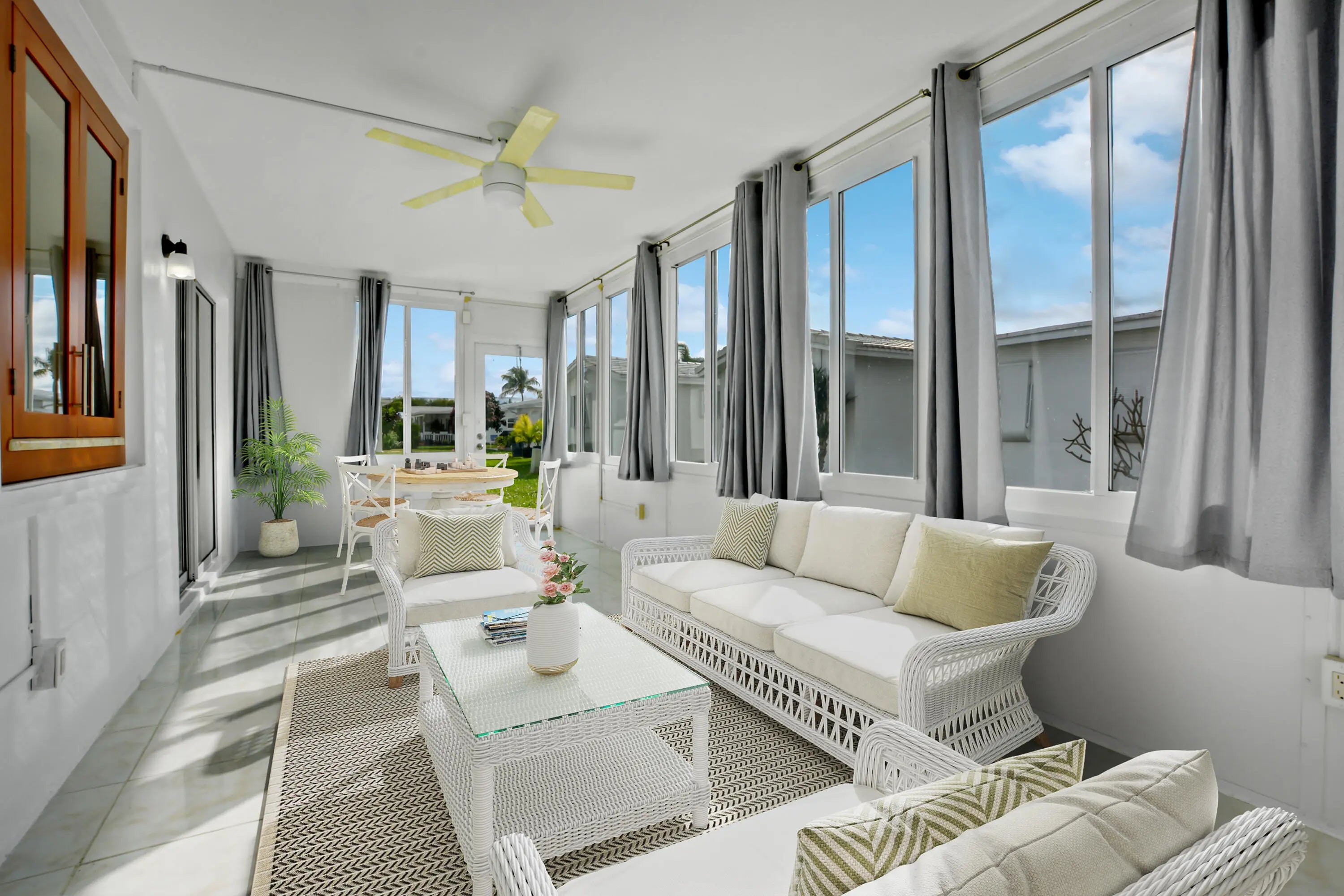 Beautiful 2Br/2Ba Regis Model. Paid uprecreation lease pd in full. Roof replaced 2015. Remodeled Kitchen with wood cabinetry, tiled backsplash, granite countertops plus all appliances replaced. Extra cabinetry plus recessed lighting. Neutral tile thru out. Interior and Exterior ''Square D'' electrical panel. Both Baths renovated with tiled showers, glass enclosures, new vanities, commodes and electrical fixtures. Flat white ceiling, all popcorn removed. All windows replaced with accordion shutters. Enclosed glass porch with impact windows plus sep. a/c unit. Front Door hurricane rated. A/C replaced plus digital thermostat and humidistat. Double Concrete drive and front porch. Mint Condition. A Must see..FREE PAR 3 GOLF, 3 HEATED POOLS, 3 ACTIVE CLBHSES.. Virtually staged. A