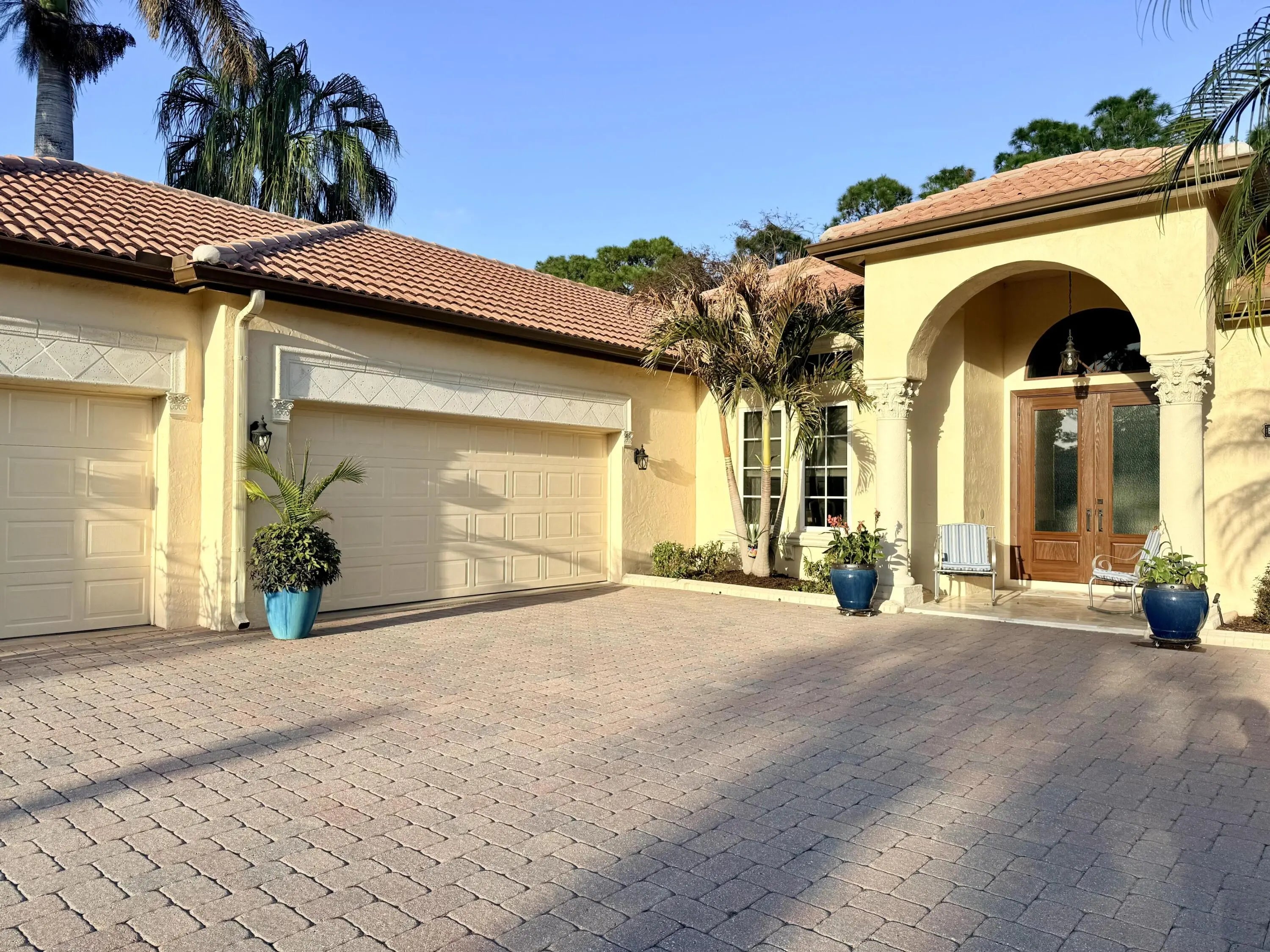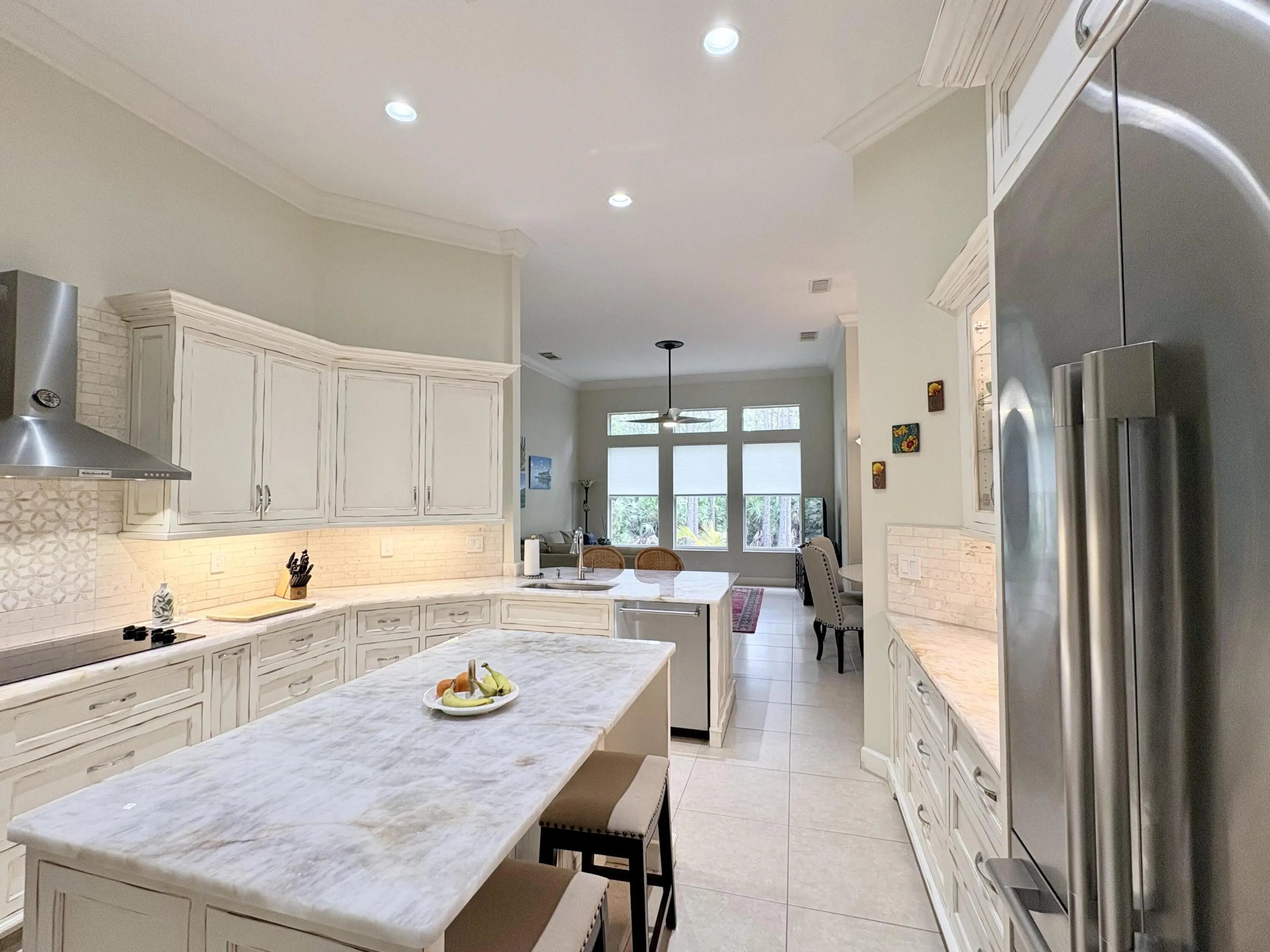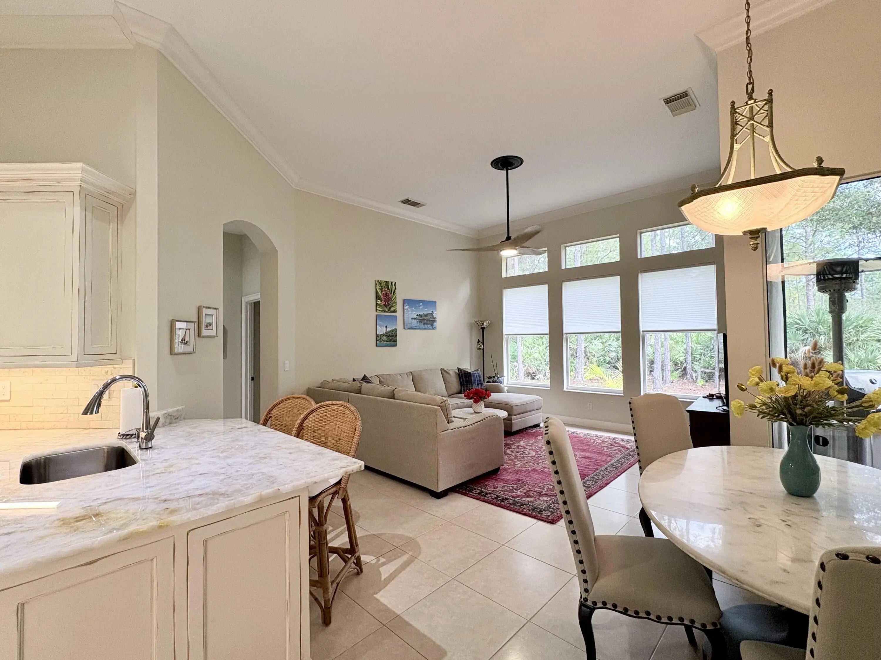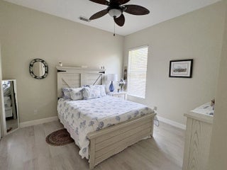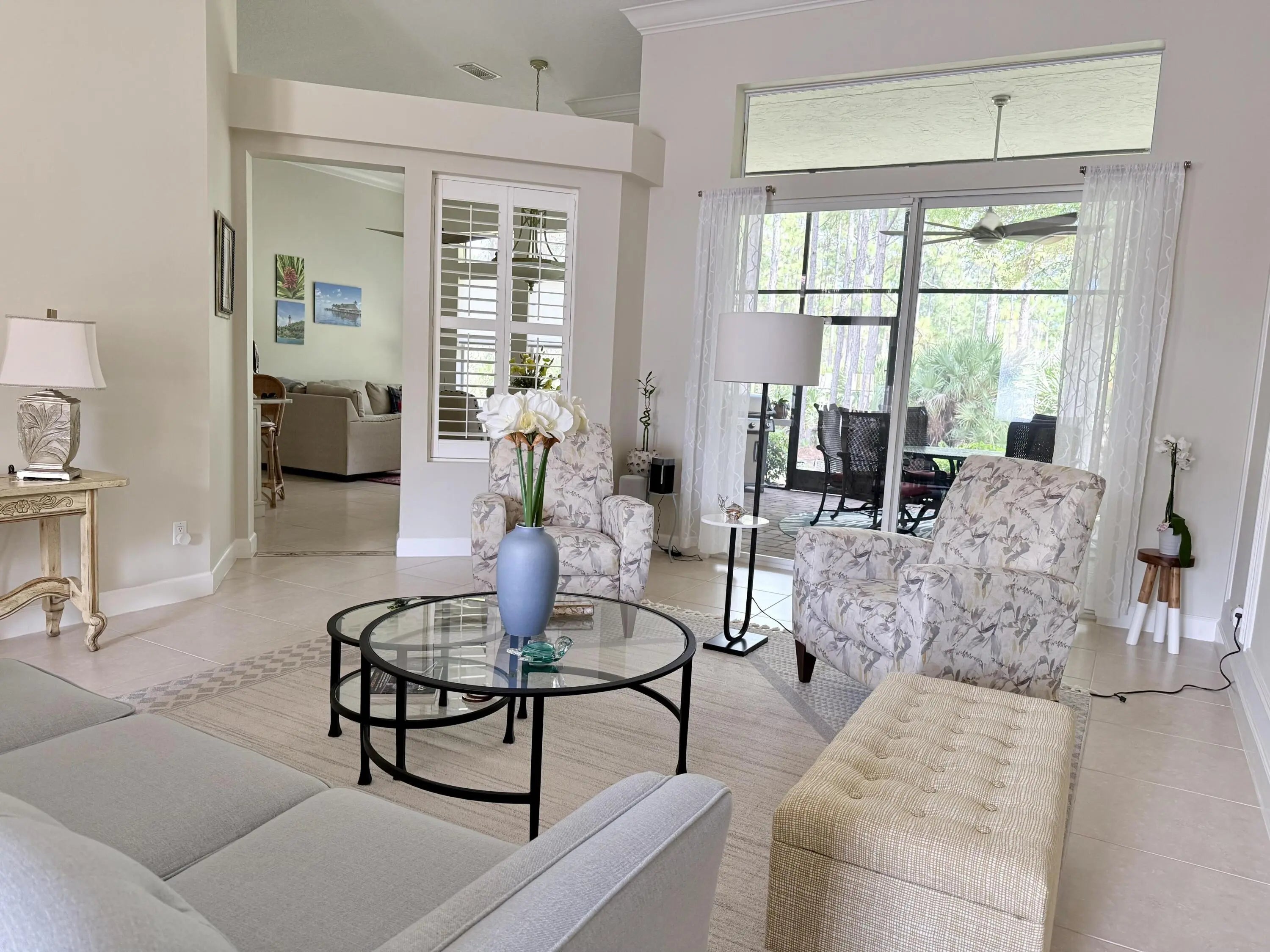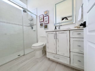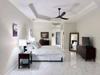 Beautifully renovated 4BR/3BA home in the gated community of The Vineyards in Port Saint Lucie, set on a quiet cul-de-sac with serene preserve views. A travertine-tiled entry and double impact-rated glass doors create a striking first impression. Inside, formal living and dining areas give an elegant welcome and flow to sliding glass doors opening to the outdoor living space. The remodeled kitchen features custom cabinetry, quartzite countertops, new appliances, and a Signature 36-inch counter-depth refrigerator. A separate bar area includes matching cabinetry and quartzite counters. Tile flooring throughout, including a spacious primary suite with 2'x4' porcelain tile, dual closets, and a fully redesigned bathroom. One guest bedroom has an en-suite bath, with two additional bedrooms