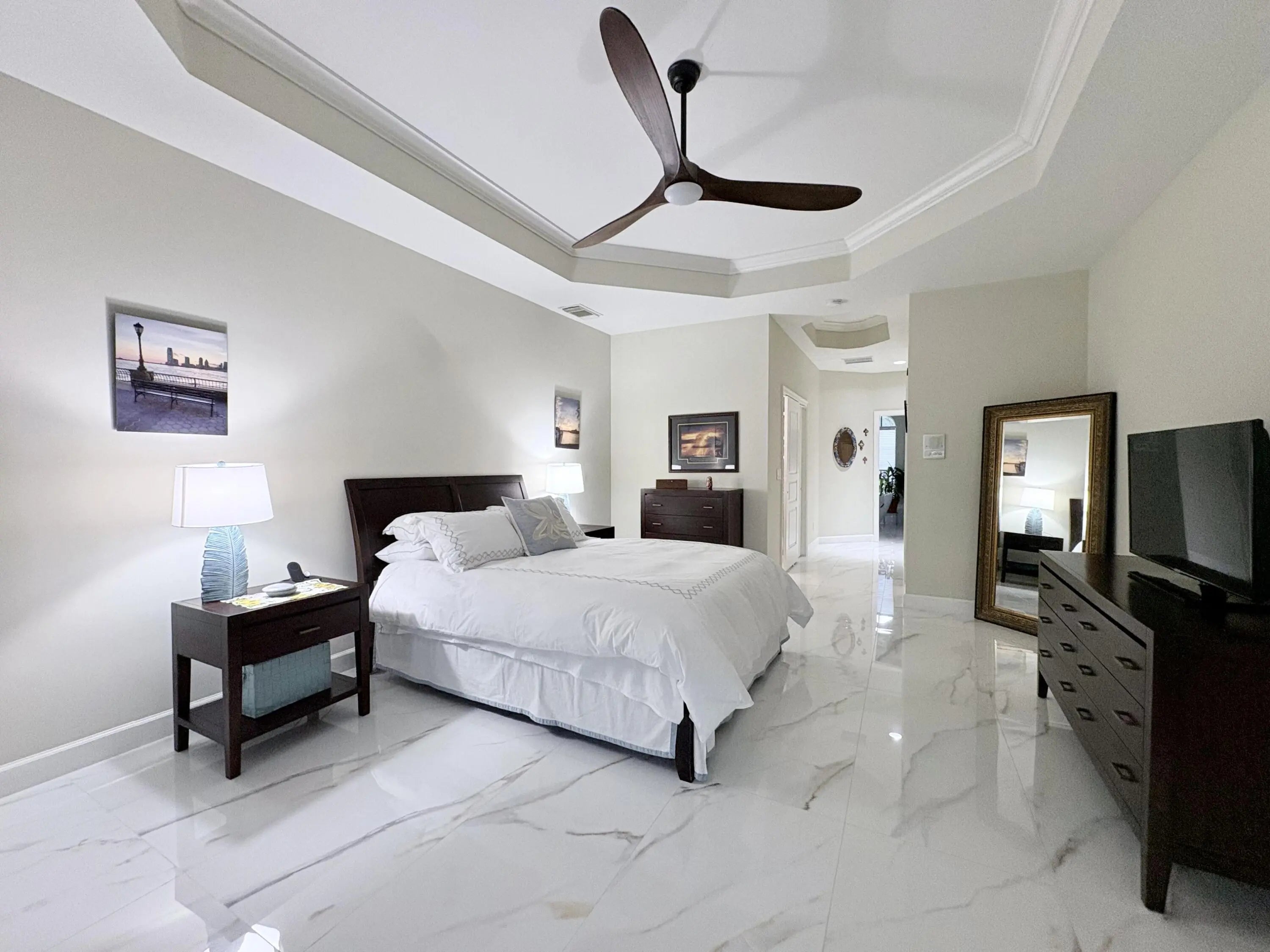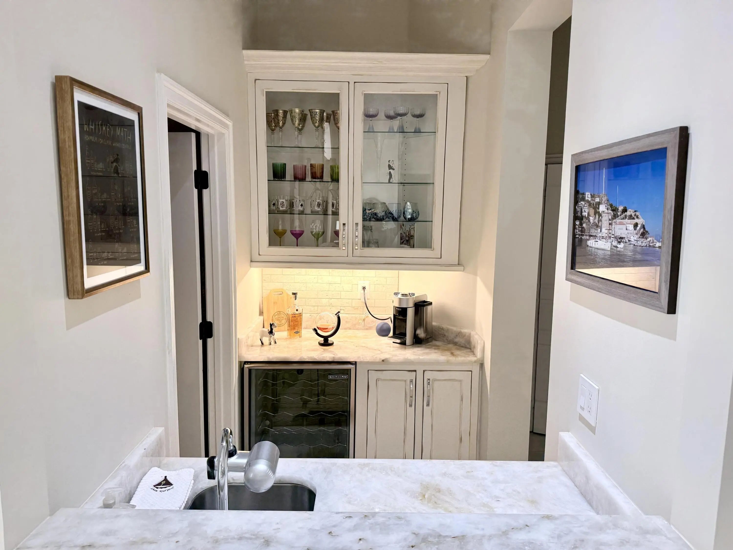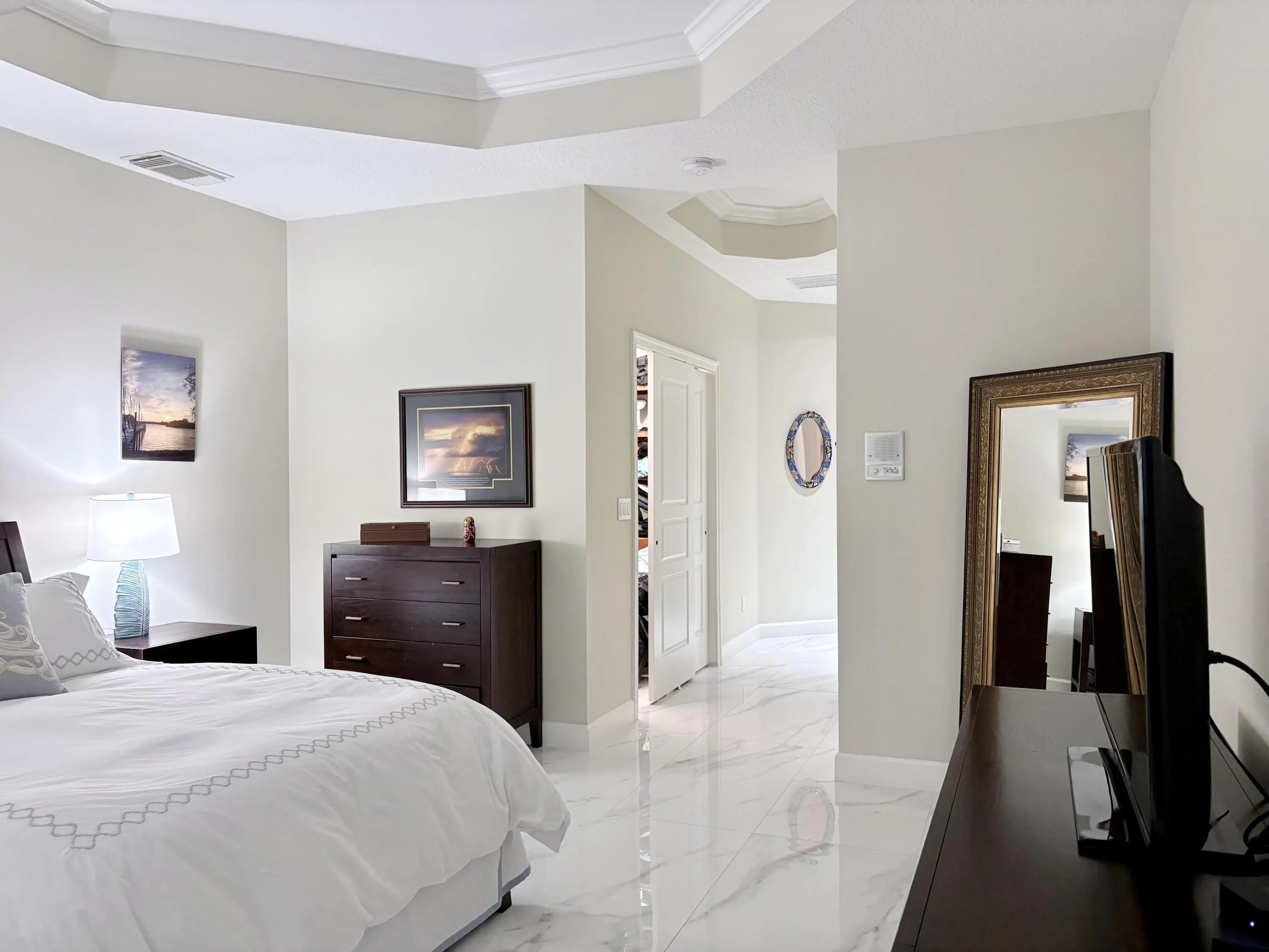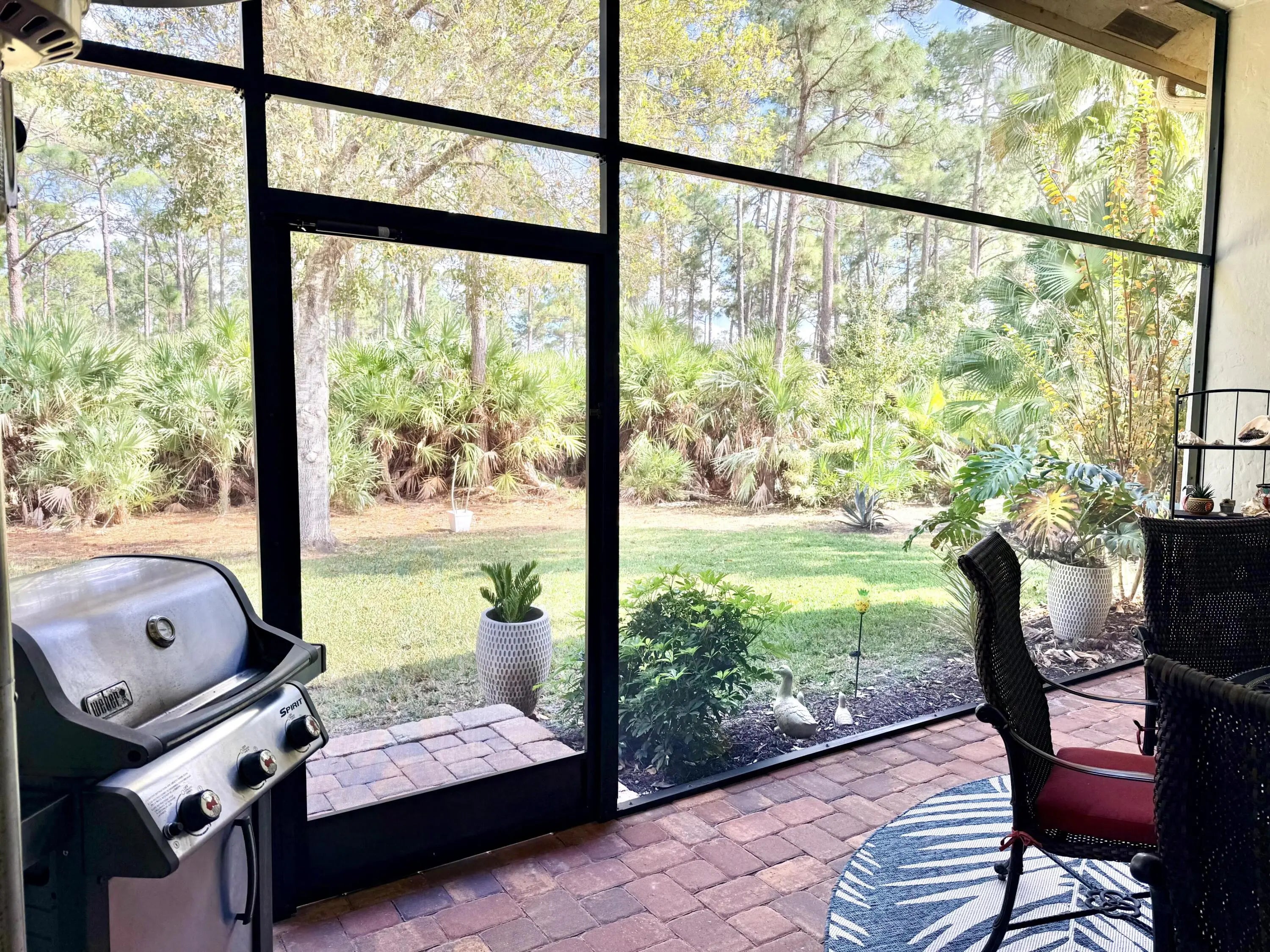 Beautifully renovated 4BR/3BA home in the gated community of The Vineyards in Port Saint Lucie, set on a quiet cul-de-sac with serene preserve views. A travertine-tiled entry and double impact-rated glass doors create a striking first impression. Inside, formal living and dining areas give an elegant welcome and flow to sliding glass doors opening to the outdoor living space. The remodeled kitchen features custom cabinetry, quartzite countertops, new appliances, and a Signature 36-inch counter-depth refrigerator. A separate bar area includes matching cabinetry and quartzite counters. Tile flooring throughout, including a spacious primary suite with 2'x4' porcelain tile, dual closets, and a fully redesigned bathroom. One guest bedroom has an en-suite bath, with two additional bedrooms