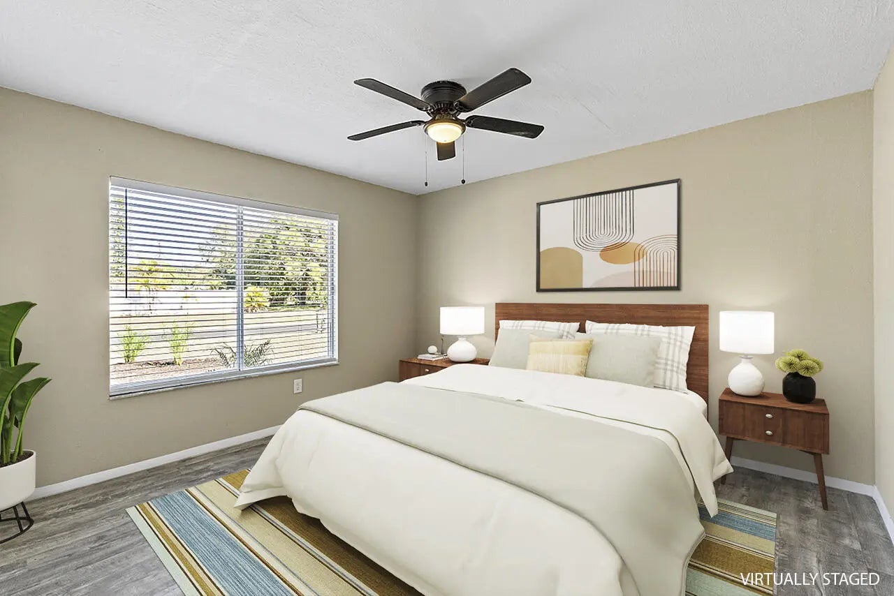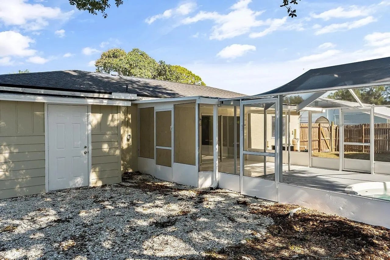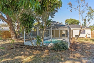 This beautiful pool home is all buttoned up & ready for you! As you enter you'll notice the oversized tile flooring, fresh paint, new ceiling fans & lighting. Next, your eyes will notice the gorgeous kitchen w/ exotic granite, white shaker cabinetry & SS appliances, including a vent hood. Off the dining area you'll find the covered & screened patio w/ tile flooring overlooking the screened private pool in the fully fenced backyard. Both bedrooms have fresh laminate flooring and new baseboards and the shared bathroom is complete with a tub/shower combo. 2024 Roof, 2021 Water Heater, 2019 AC.