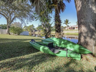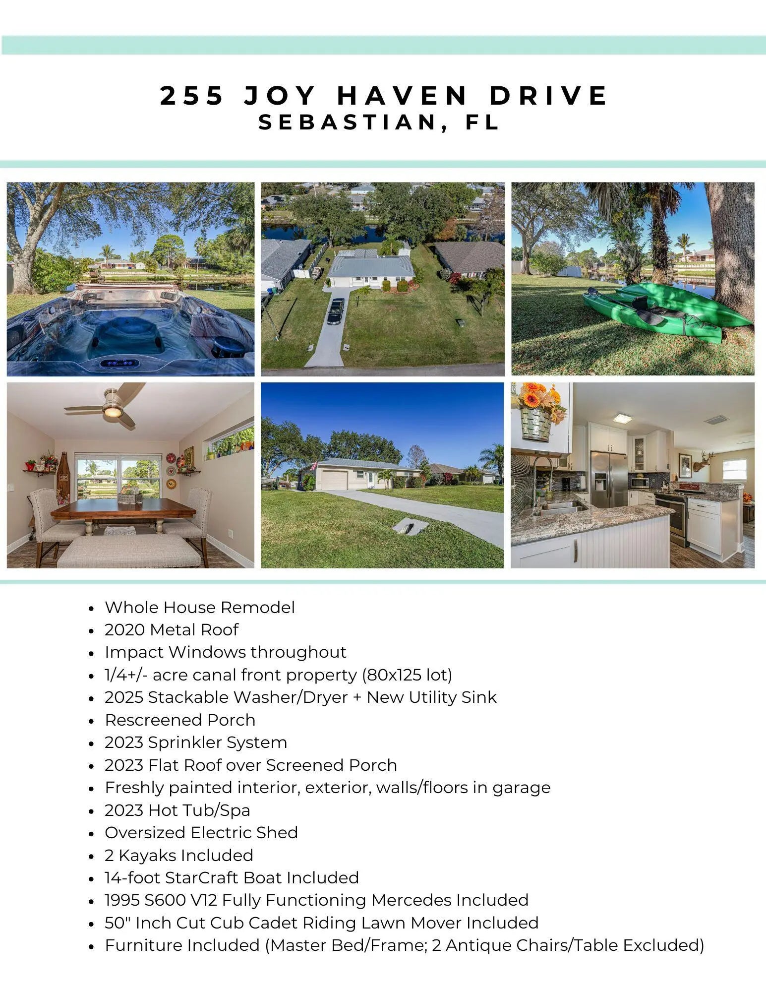 Now this is the total package! Waterfront + renovated 2/2 + Florida room/bonus space with rustic Western charm sits in the heart of Sebastian. It's cozy, practical + checks all the boxes. Located on ~1/4 acre + surrounded by gorgeous mature oak trees. Impact windows + newer metal roof (2020) for peace of mind. Spacious electric-powered shed, functional screened porch overlooking canal, a cosmic dream hot tub/spa + minutes to community boat launch. Magnificent property includes 1995 S600 Mercedes, 14 ft. StarCraft boat, 2 kayaks, 50'' cut Cub Cadet riding mower + is available furnished. No HOA!