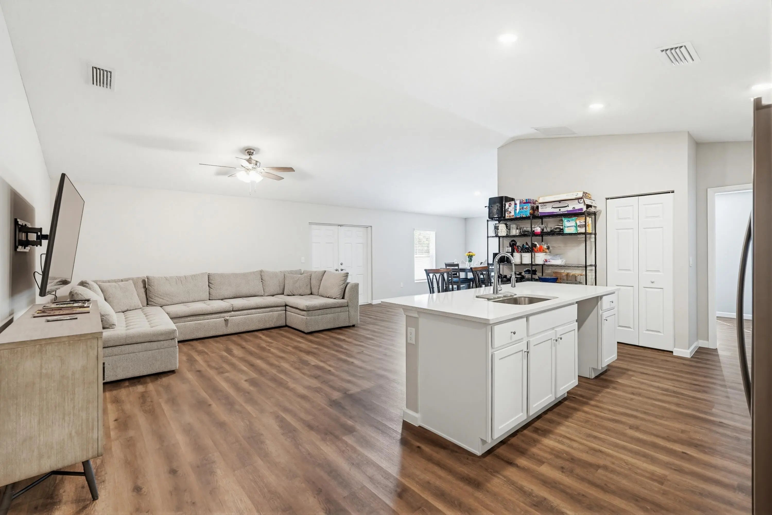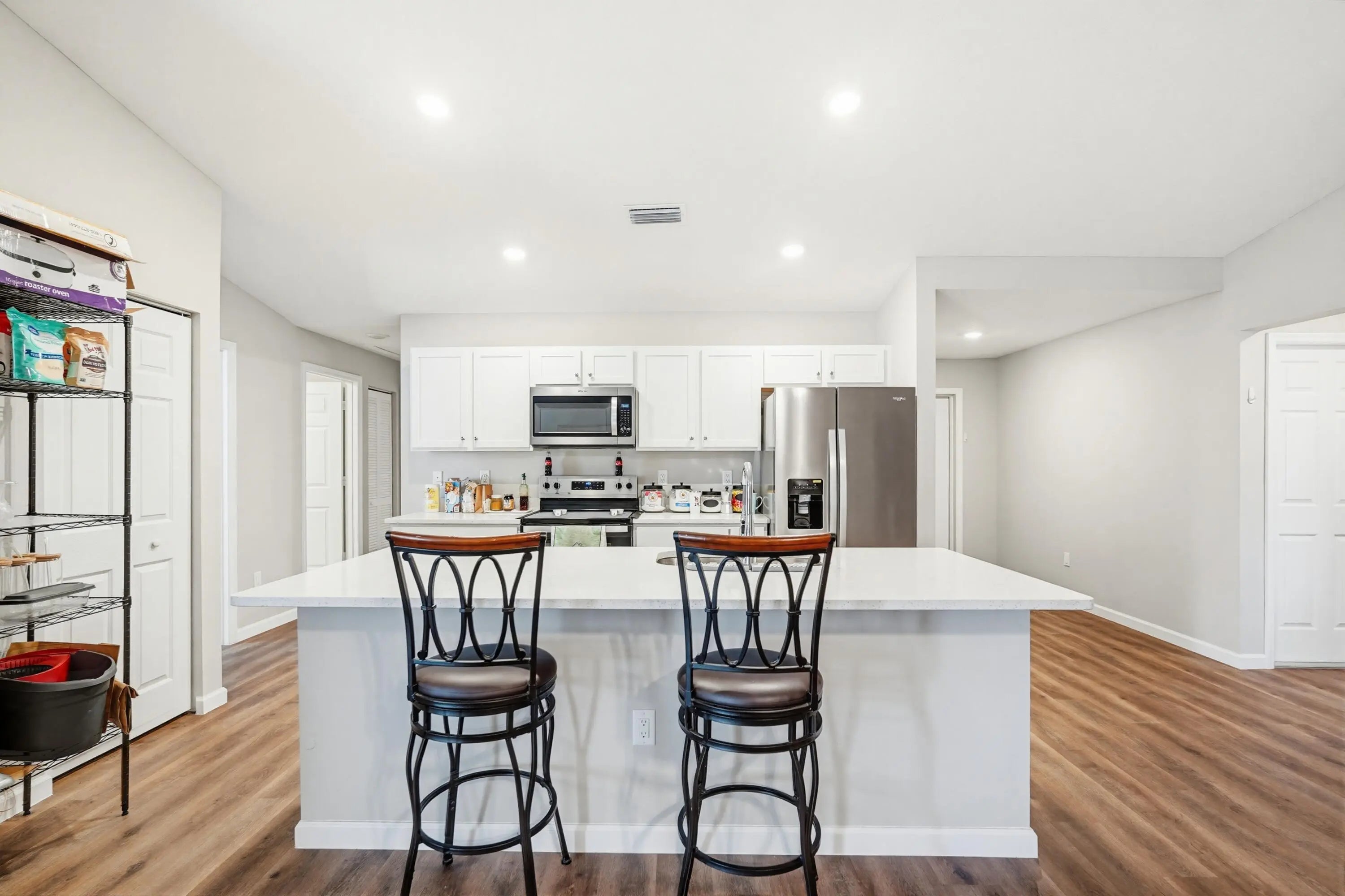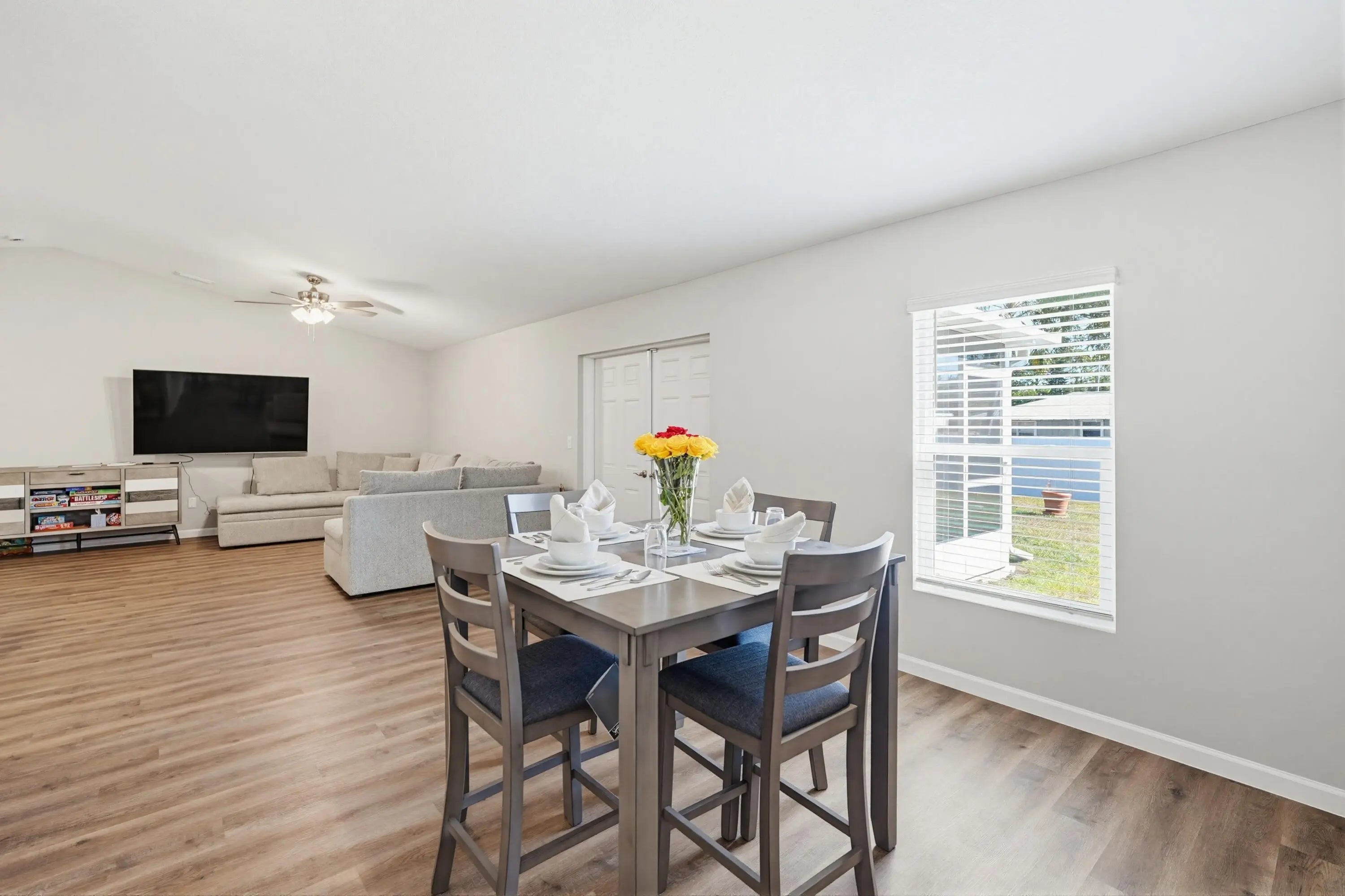You'll fall in love with this charming newly built 2025, 4 bedroom and 2 bathroom fenced in home! It features an oversized driveway. Inside, you'll find 4 bedrooms and 2 bathrooms, along with a spacious living room and a massive eat-in kitchen complete with a center island. The dining room is perfect for gatherings, and the expansive screened-in lanai offers an ideal space for entertaining. The 2-car garage provides extra storage. Additionally, this home comes with all the furniture you see you'll enjoy the convenience of supermarkets, commercial plazas, and highways just a 5-minute drive away. This home has it all!