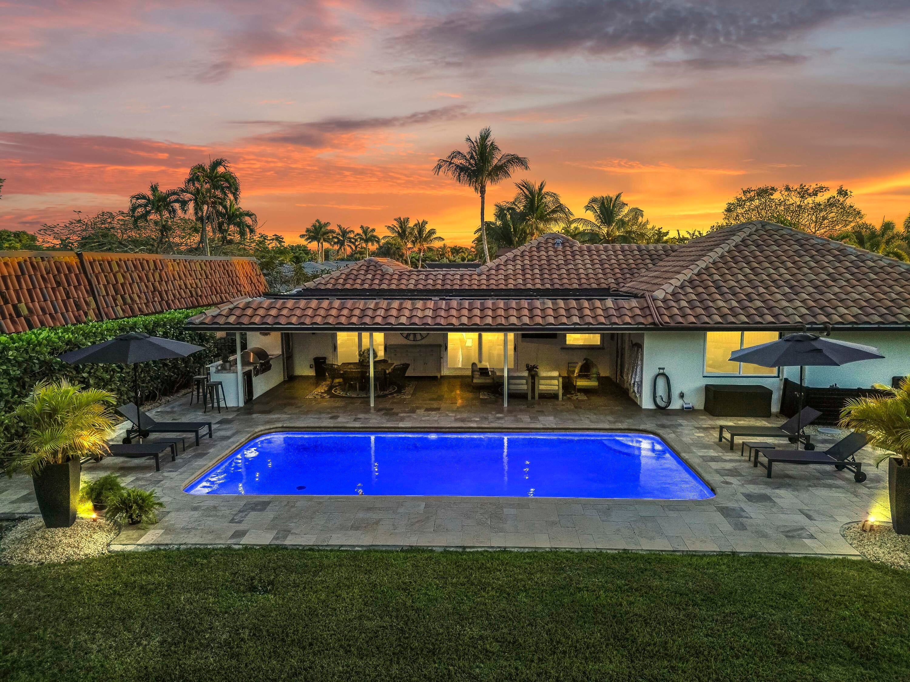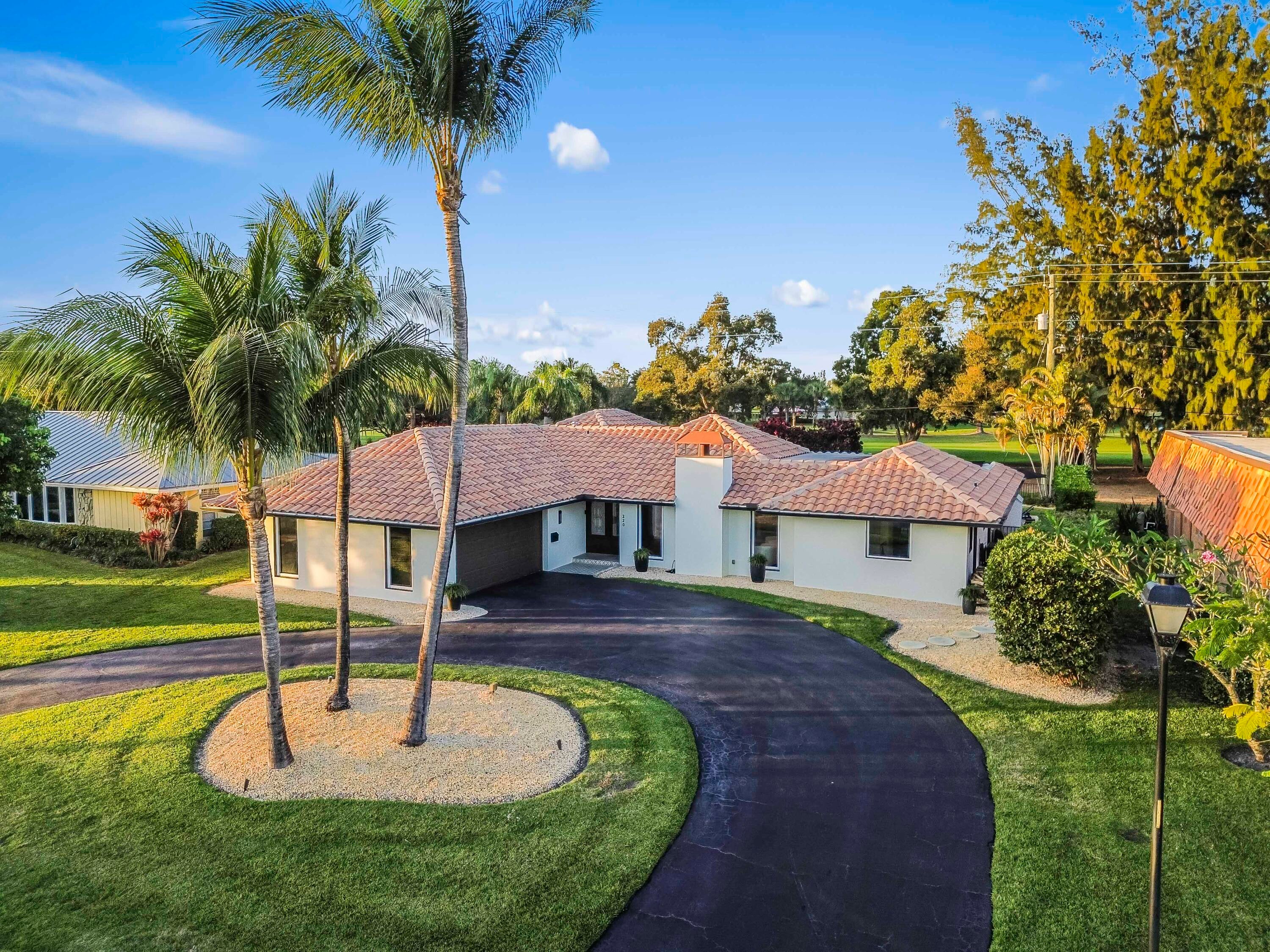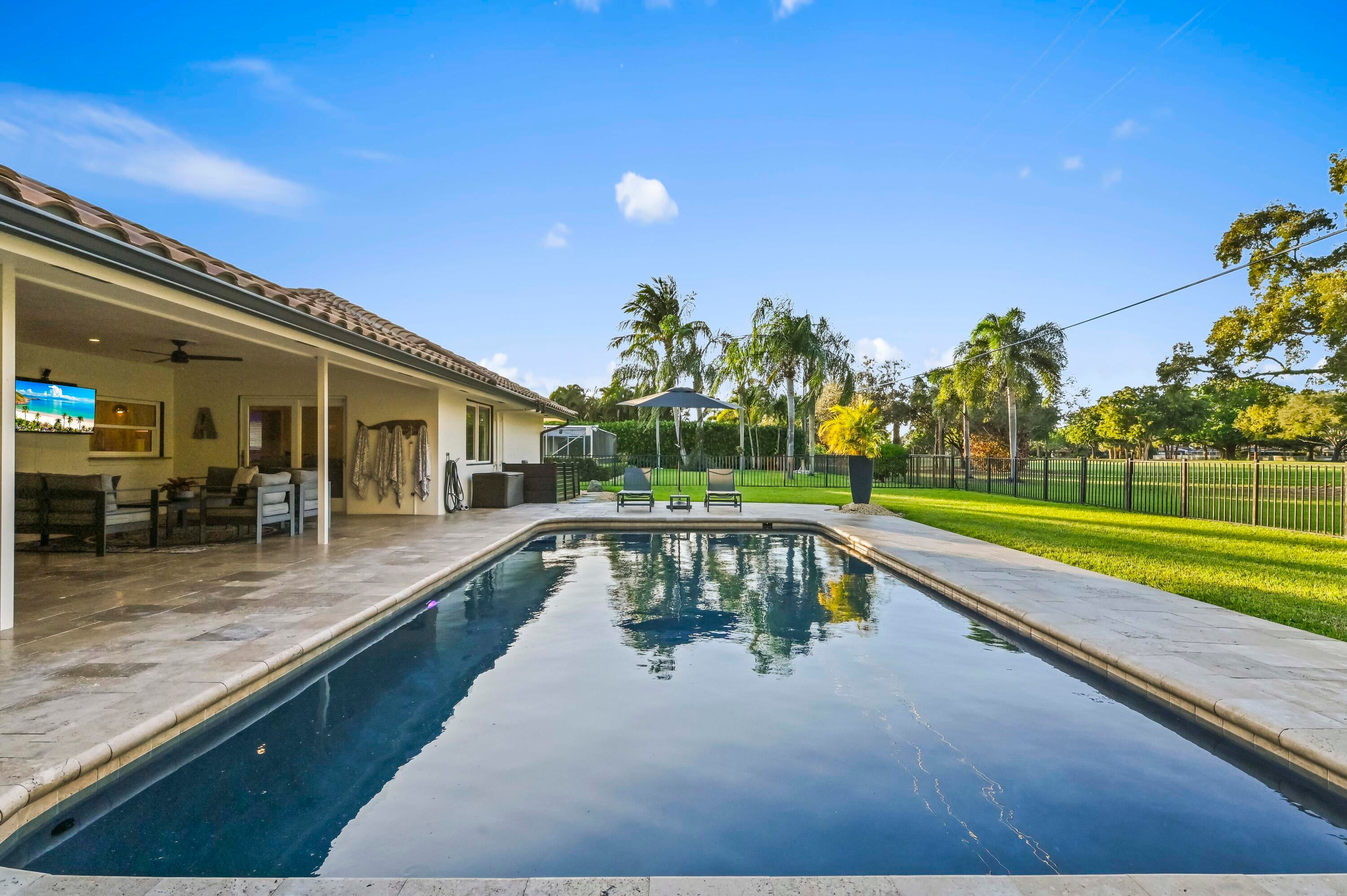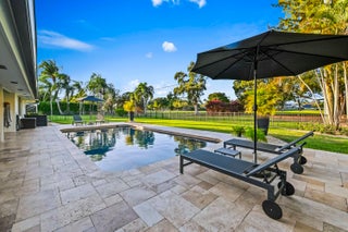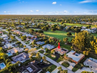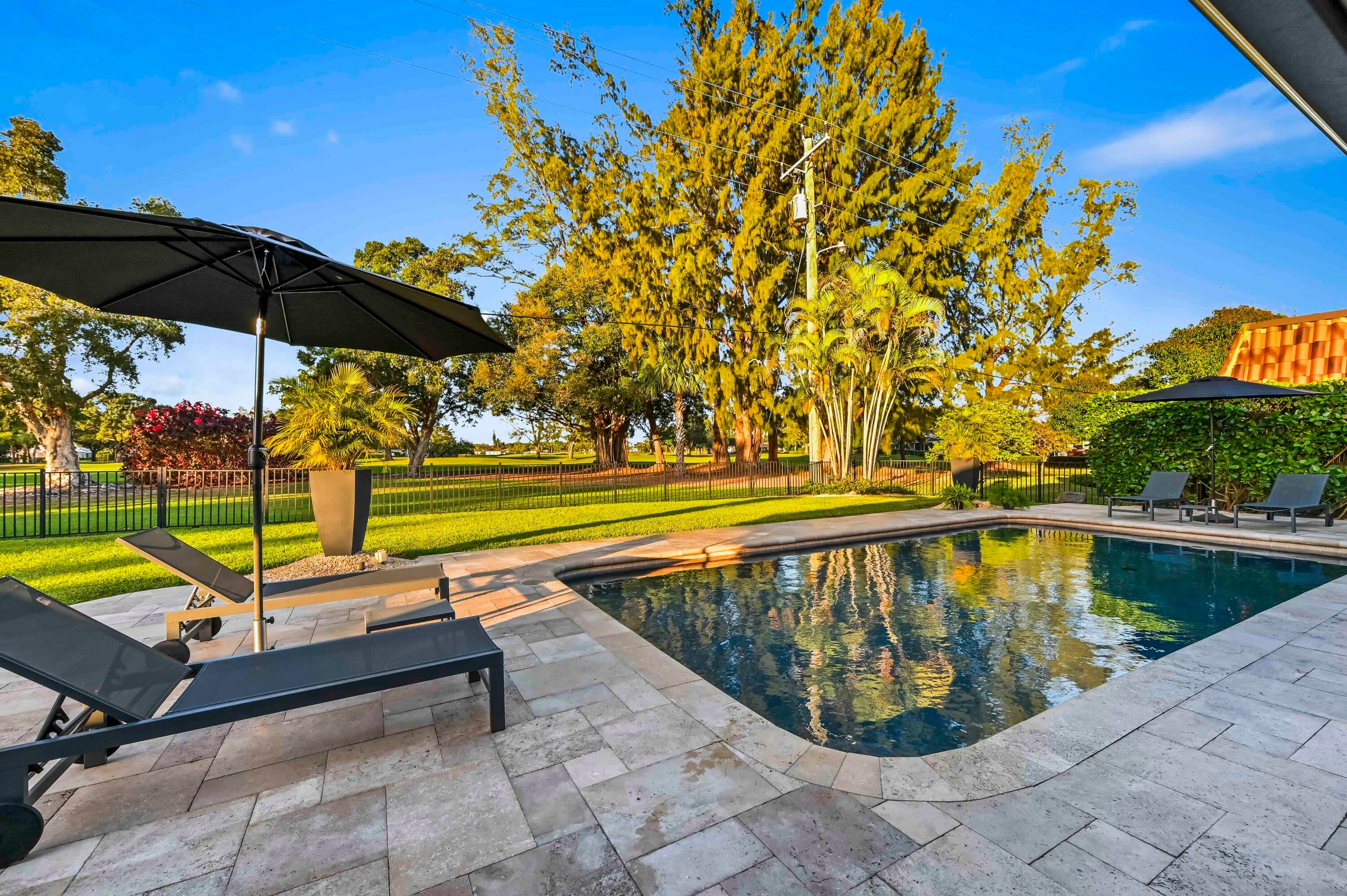 Welcome to your private sanctuary in the prestigious gated community of Atlantis, where modern luxury meets the timeless allure of golf course living. This stunning estate commands a premium position with expansive views across four holes of the championship golf course (holes 1, 9, 10, and 18), yet is perfectly situated to ensure no stray balls disturb your peace. A sweeping circular driveway and grand double-door entrance invite you into a meticulously updated interior, featuring Russian Oak 3/4-inch hand-scraped floors and LED recessed lighting throughout. The heart of the home is designed for entertaining, boasting a bright, open floor plan that flows seamlessly from the chic living spaces to the outdoors through impact windows and doors.Retreat to the luxurious primary suite, a haven of relaxation featuring his and her walk-in closets and a spa-inspired ensuite bathroom, remodeled in 2019 with high-end finishes, a soaking tub, walk in shower and 2 separate vanity sinks. The home offers comfort and peace of mind with significant recent upgrades, including a new roof (2014), new A/C (2021), gutters, and a natural gas water heater. A cozy wood-burning fireplace adds warmth to the living area, while a Tesla charging station in the garage ensures you are ready for the future. Step outside to discover the ultimate Florida lifestyle in your backyard oasis. The expansive travertine deck, redone in 2025, surrounds a sparkling solar-heated pool that was recently resurfaced, offering year-round enjoyment. Host unforgettable gatherings in the covered summer kitchen equipped with a refrigerator and built-in grill or simply unwind while taking in the expansive and serene golf views. With no HOA and access to two championship regulation golf courses without a membership requirement, this Atlantis gem offers an unparalleled blend of freedom, privacy, and resort-style living.