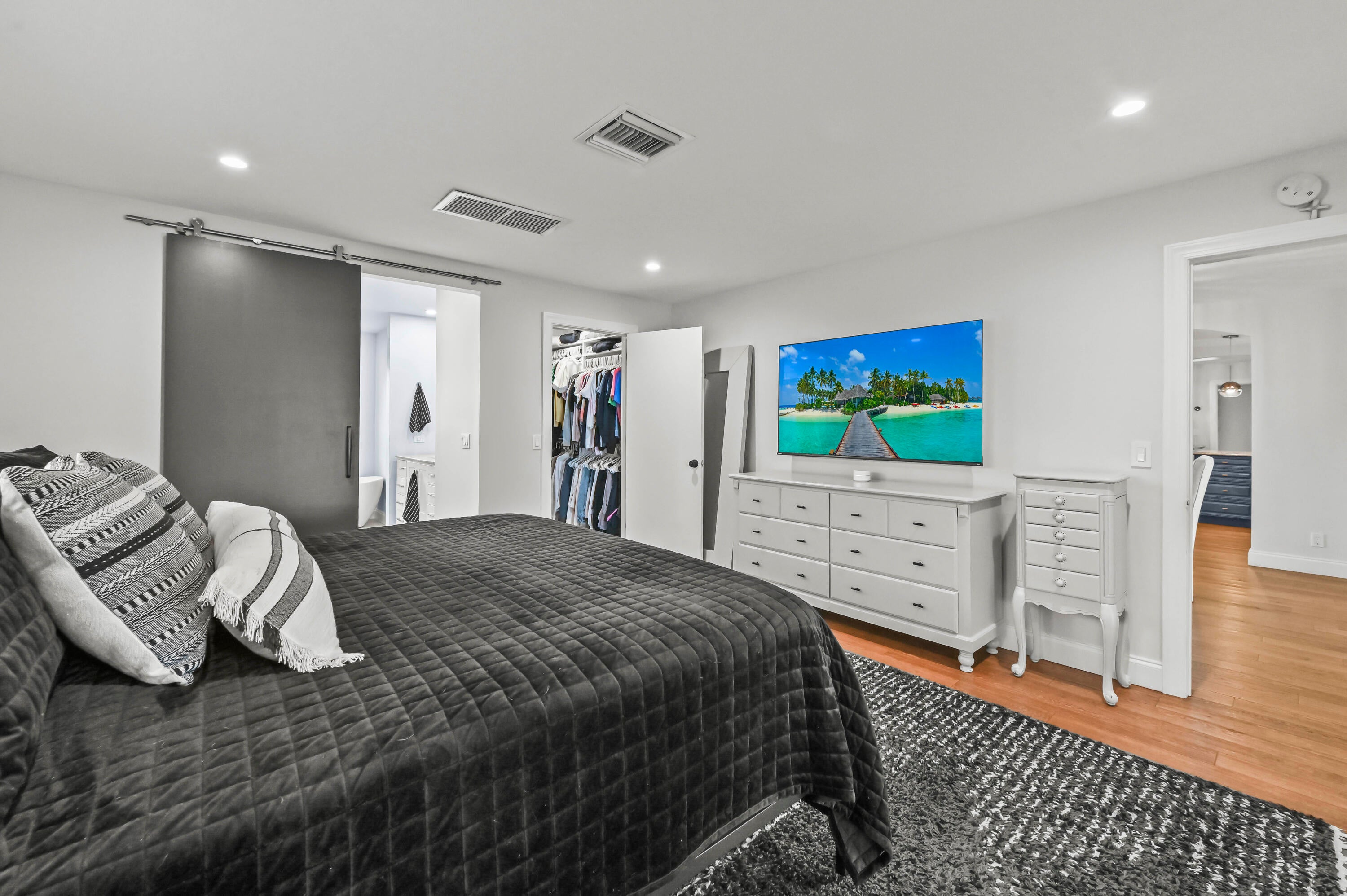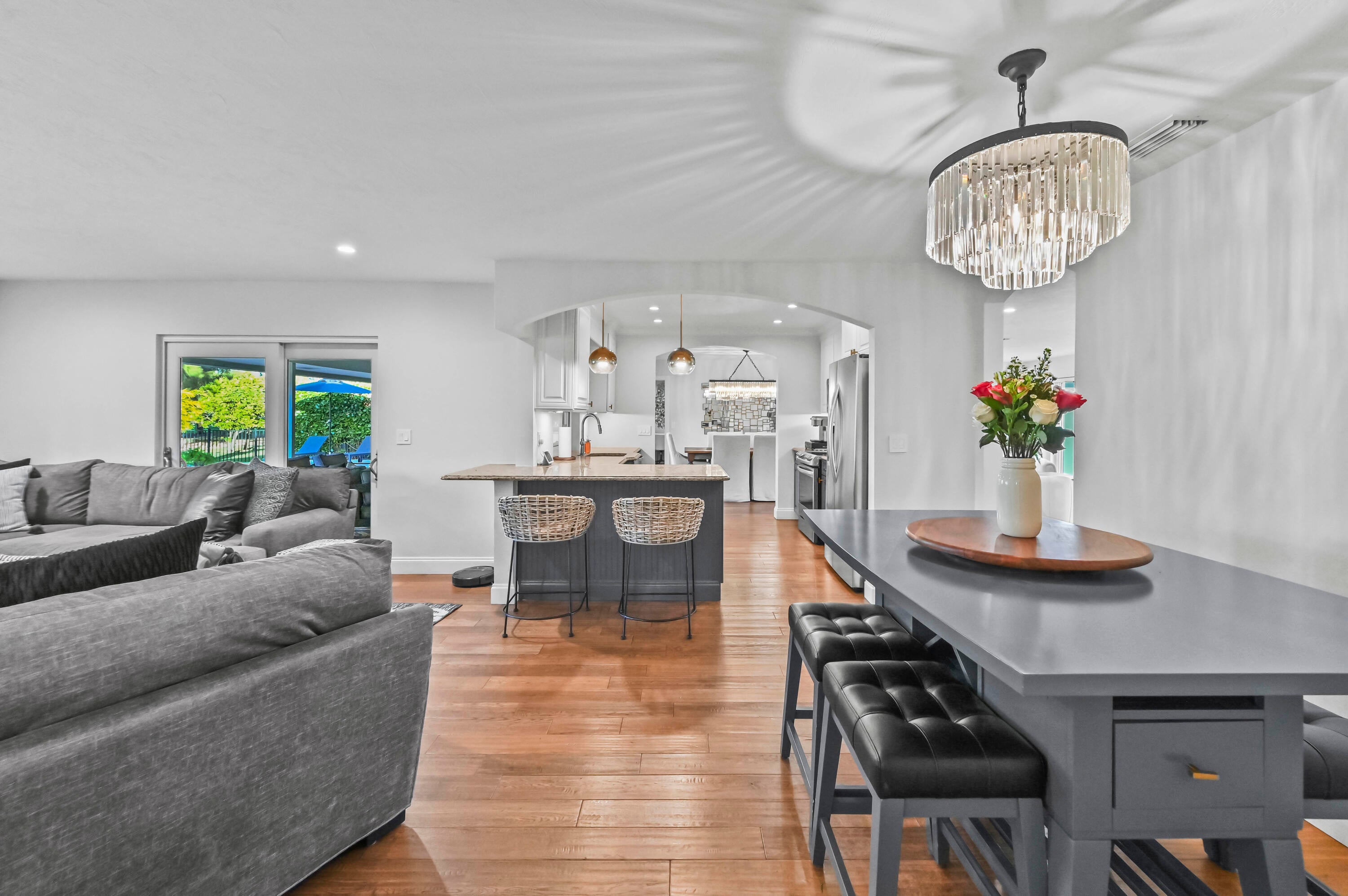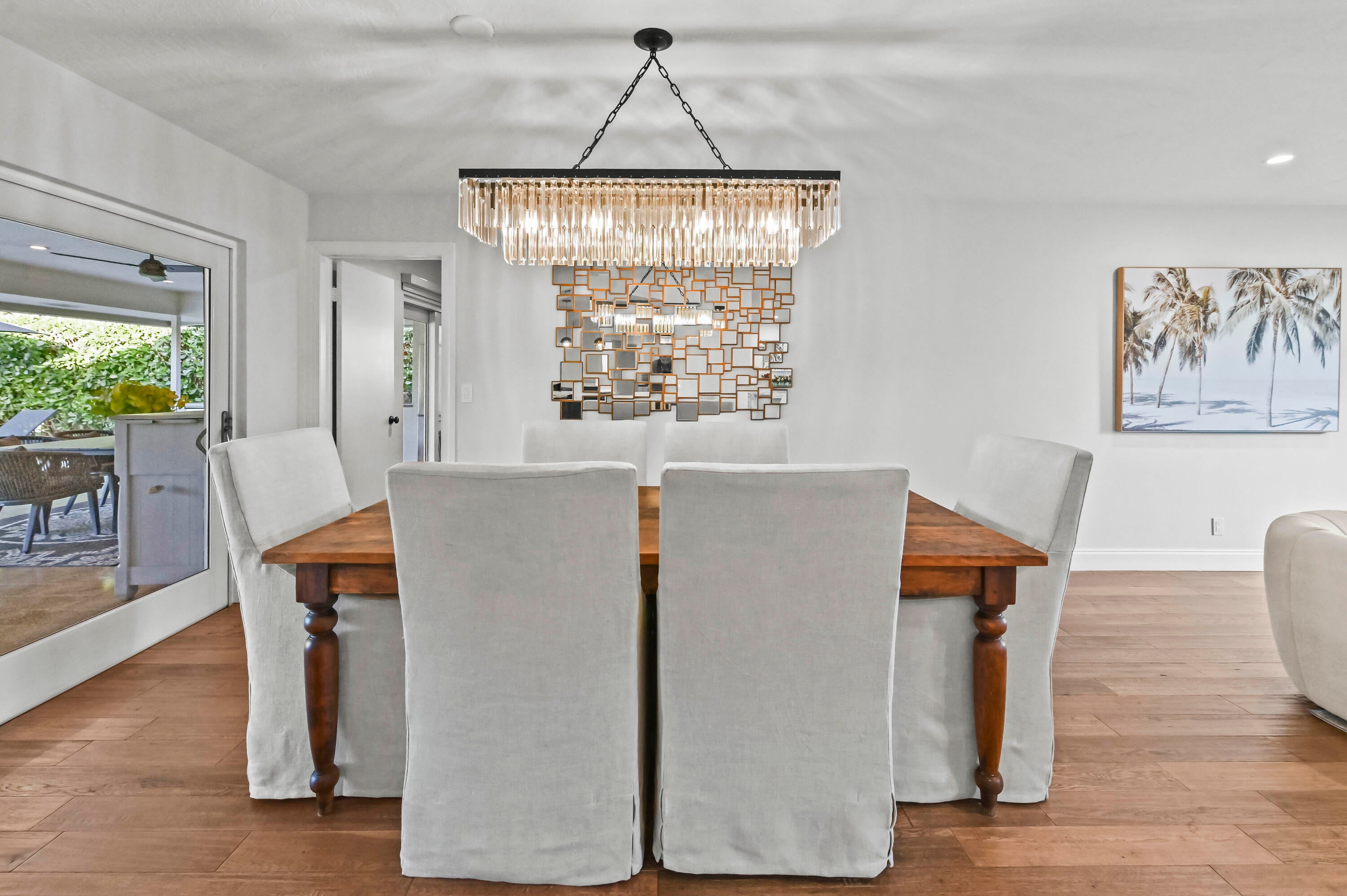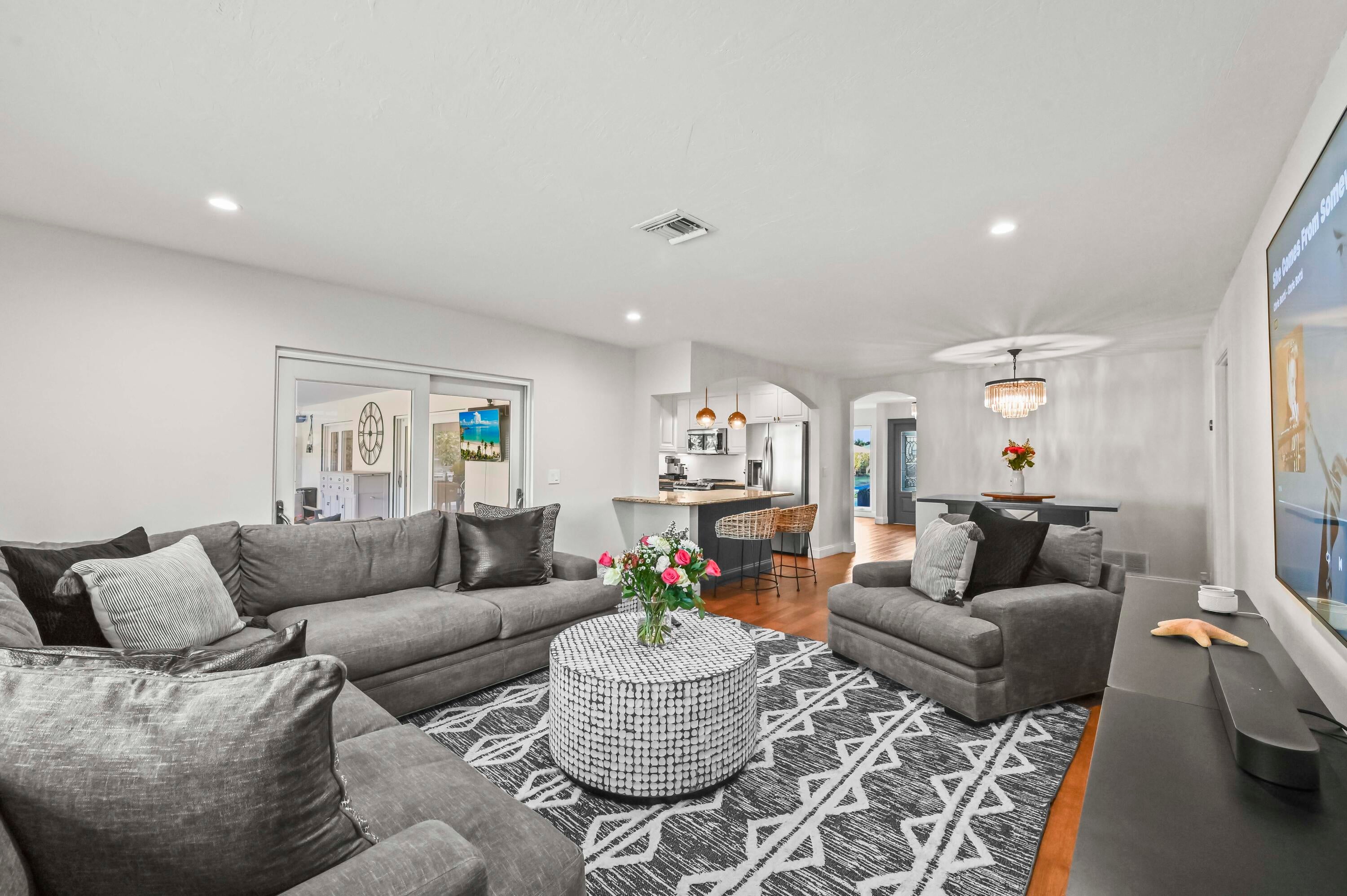 Welcome to your private sanctuary in the prestigious gated community of Atlantis, where modern luxury meets the timeless allure of golf course living. This stunning estate commands a premium position with expansive views across four holes of the championship golf course (holes 1, 9, 10, and 18), yet is perfectly situated to ensure no stray balls disturb your peace. A sweeping circular driveway and grand double-door entrance invite you into a meticulously updated interior, featuring Russian Oak 3/4-inch hand-scraped floors and LED recessed lighting throughout. The heart of the home is designed for entertaining, boasting a bright, open floor plan that flows seamlessly from the chic living spaces to the outdoors through impact windows and doors.Retreat to the luxurious primary suite, a haven of relaxation featuring his and her walk-in closets and a spa-inspired ensuite bathroom, remodeled in 2019 with high-end finishes, a soaking tub, walk in shower and 2 separate vanity sinks. The home offers comfort and peace of mind with significant recent upgrades, including a new roof (2014), new A/C (2021), gutters, and a natural gas water heater. A cozy wood-burning fireplace adds warmth to the living area, while a Tesla charging station in the garage ensures you are ready for the future. Step outside to discover the ultimate Florida lifestyle in your backyard oasis. The expansive travertine deck, redone in 2025, surrounds a sparkling solar-heated pool that was recently resurfaced, offering year-round enjoyment. Host unforgettable gatherings in the covered summer kitchen equipped with a refrigerator and built-in grill or simply unwind while taking in the expansive and serene golf views. With no HOA and access to two championship regulation golf courses without a membership requirement, this Atlantis gem offers an unparalleled blend of freedom, privacy, and resort-style living.