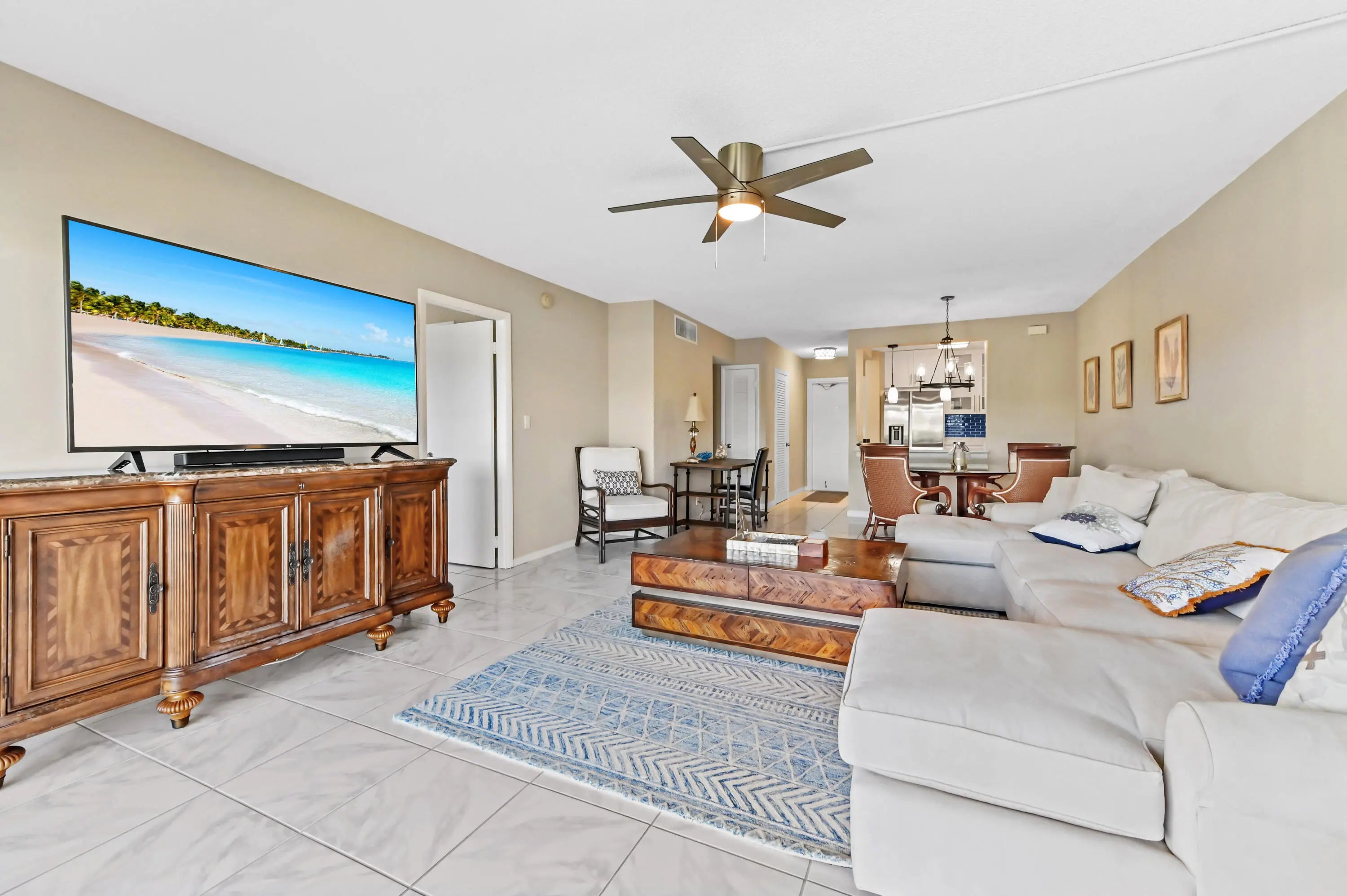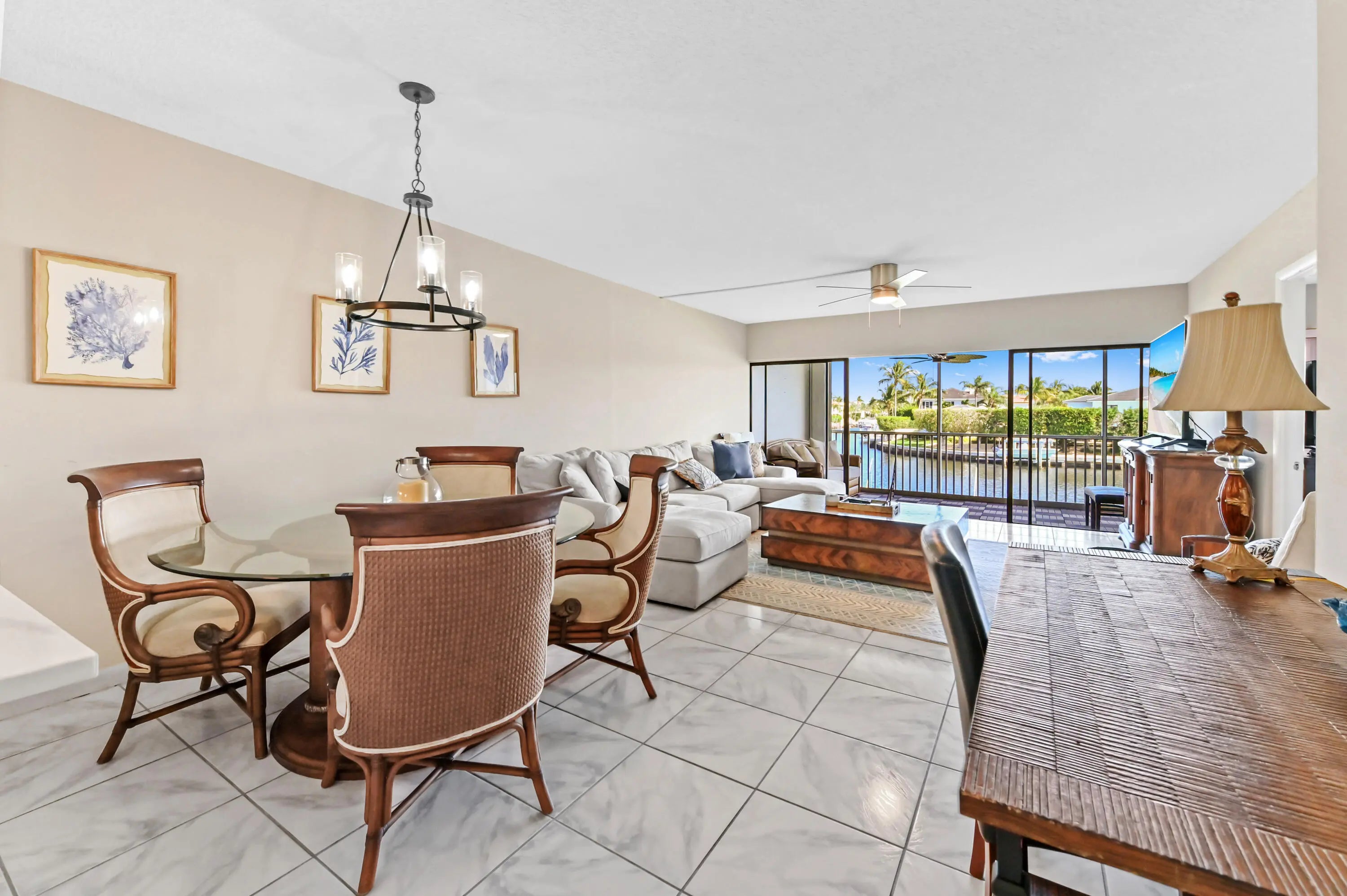 Welcome to your waterfront sanctuary at River House Towers, where panoramic views of the Intracoastal and mesmerizing sunsets set the stage for the ultimate Florida lifestyle. This stunning 2-bedroom, 2-bathroom residence features a bright, open-concept design that flows effortlessly onto a massive screened balcony--the perfect vantage point for watching boats glide by on the Intracoastal. The heart of the home is the kitchen, equipped with sleek quartz countertops, modern stainless steel appliances, and a convenient pass-through to the dining area that makes entertaining a breeze.