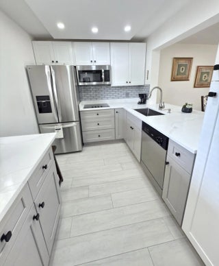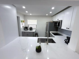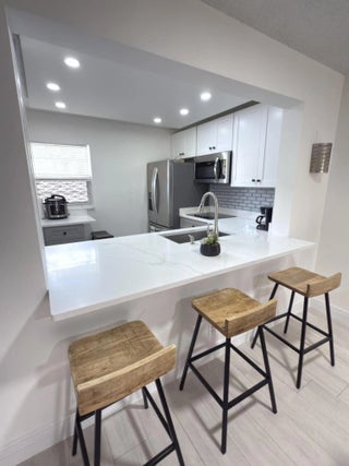 Remodeled, Move in ready beautiful 1 Bedroom 1.5 Bathrooms with convertible porch area, Great location!First Floor with Parking right on front.This home offers a bright and open floor plan with beautiful and serene garden views and BBQ Area. Beautiful brand new kitchen featuring shaker cabinets, sleek quartz countertops with extra space for barstools area, new SS appliances and LED lights. New neutral porcelain wood looking tile throughout the whole unit. Remodeled bathrooms, Fresh Paint. Concrete roof, New barn doors dividing Living room from Florida/Porch area. fantastic 55+ community with two clubhouses,two pools ,Spa, Theater, Gym, Tennis/Pickeball courts, HOA includes Cable, Water, Building insurance, Pest control, Elevator etc.